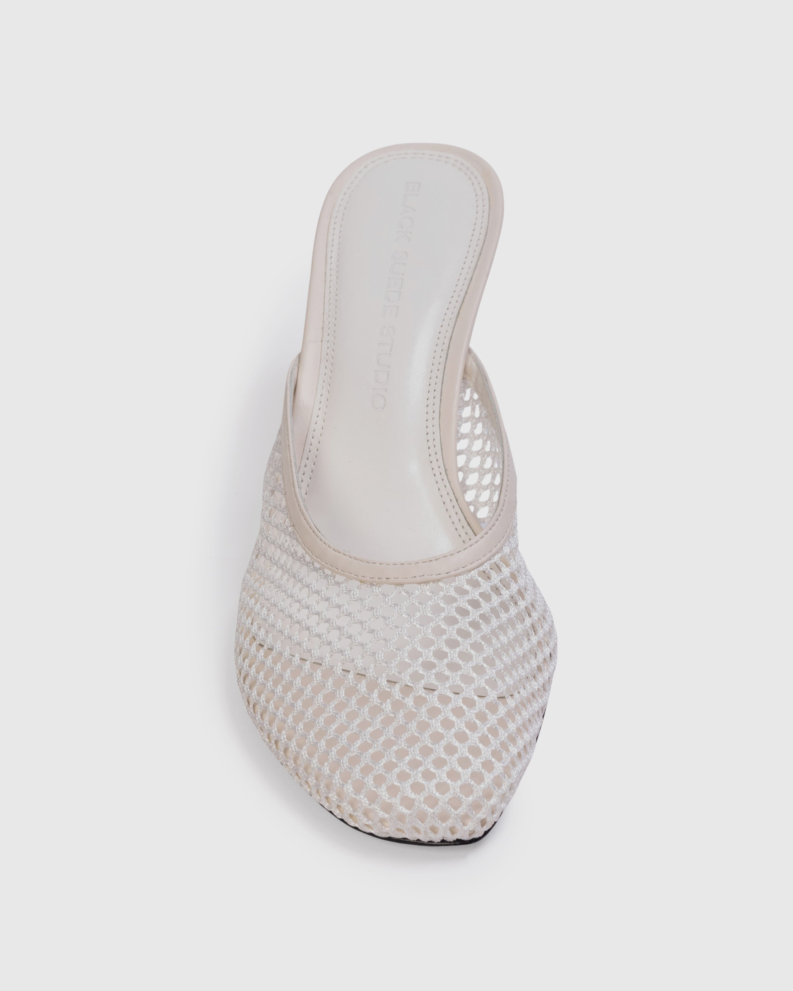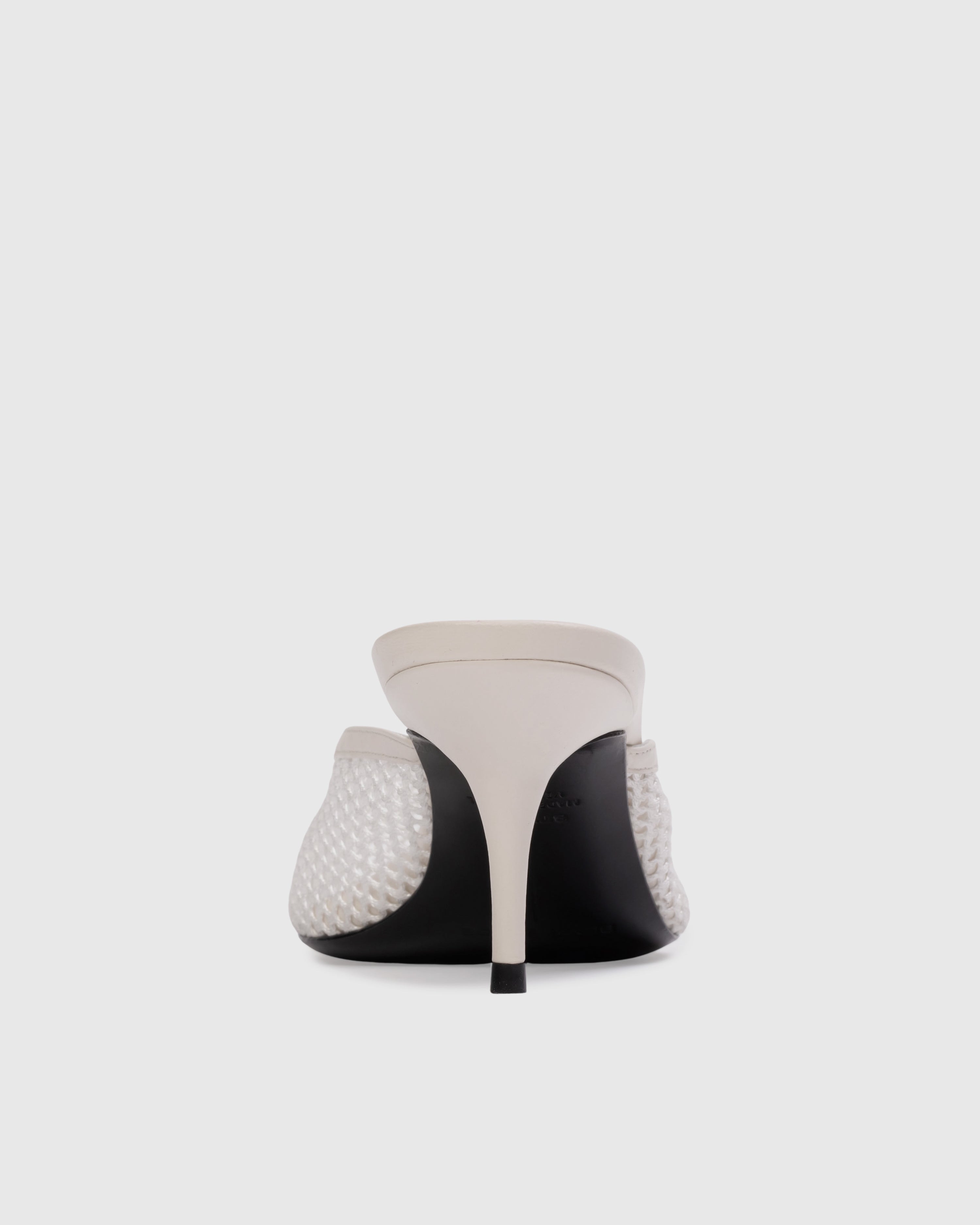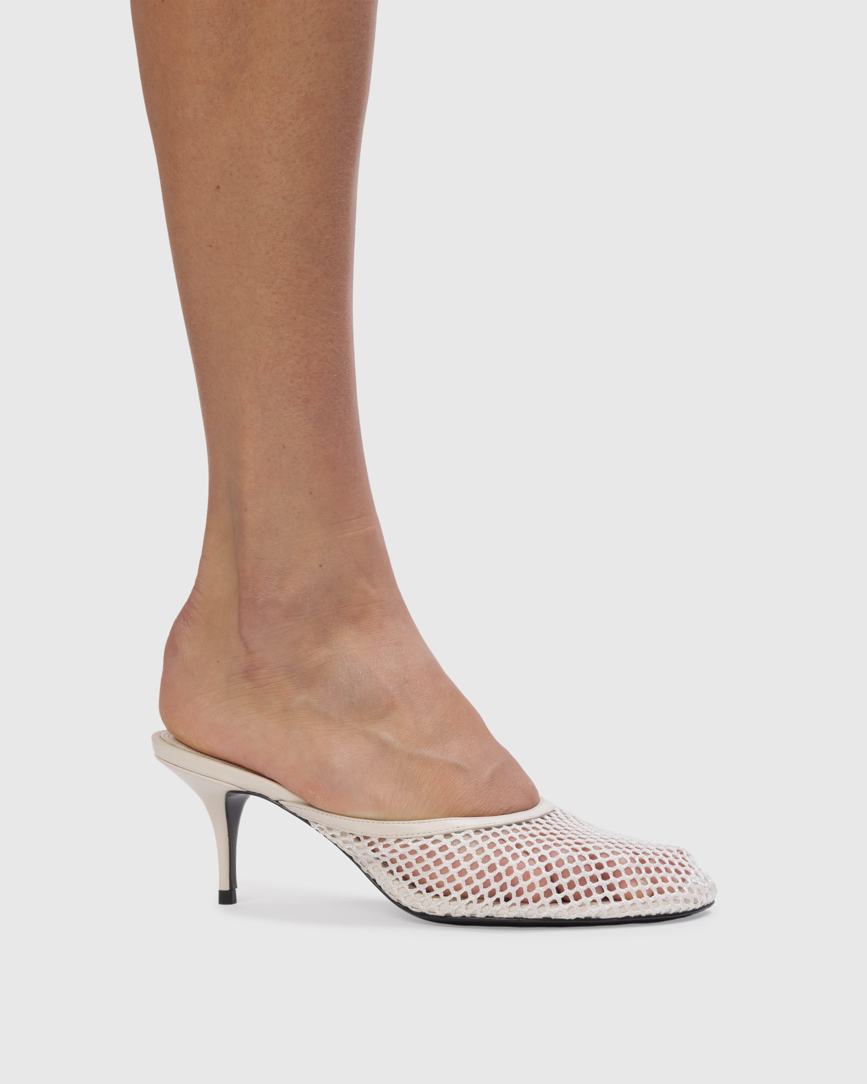 Angled round toe mesh mule, set on a curved mid heel. Made with smooth buffed leather and mesh.