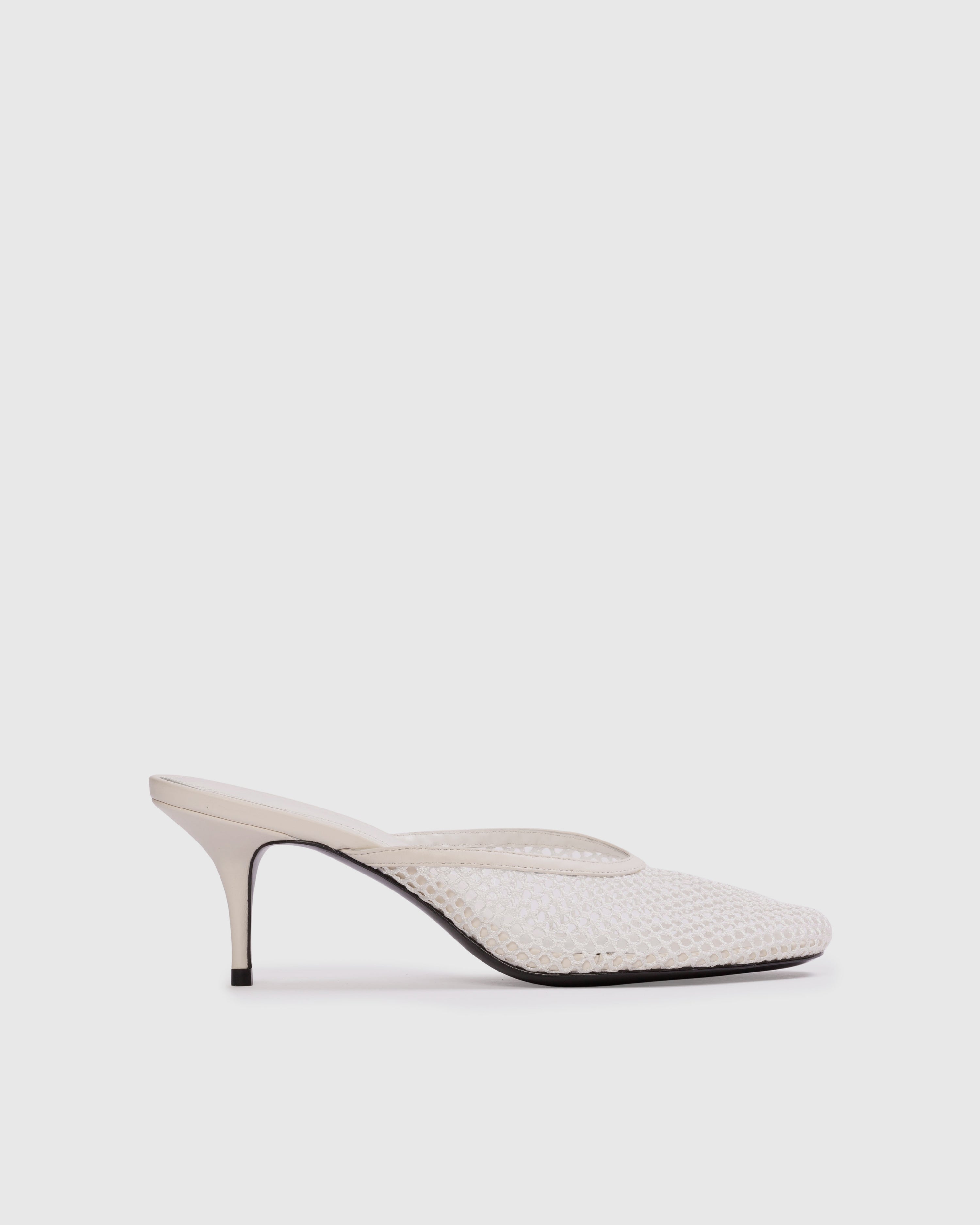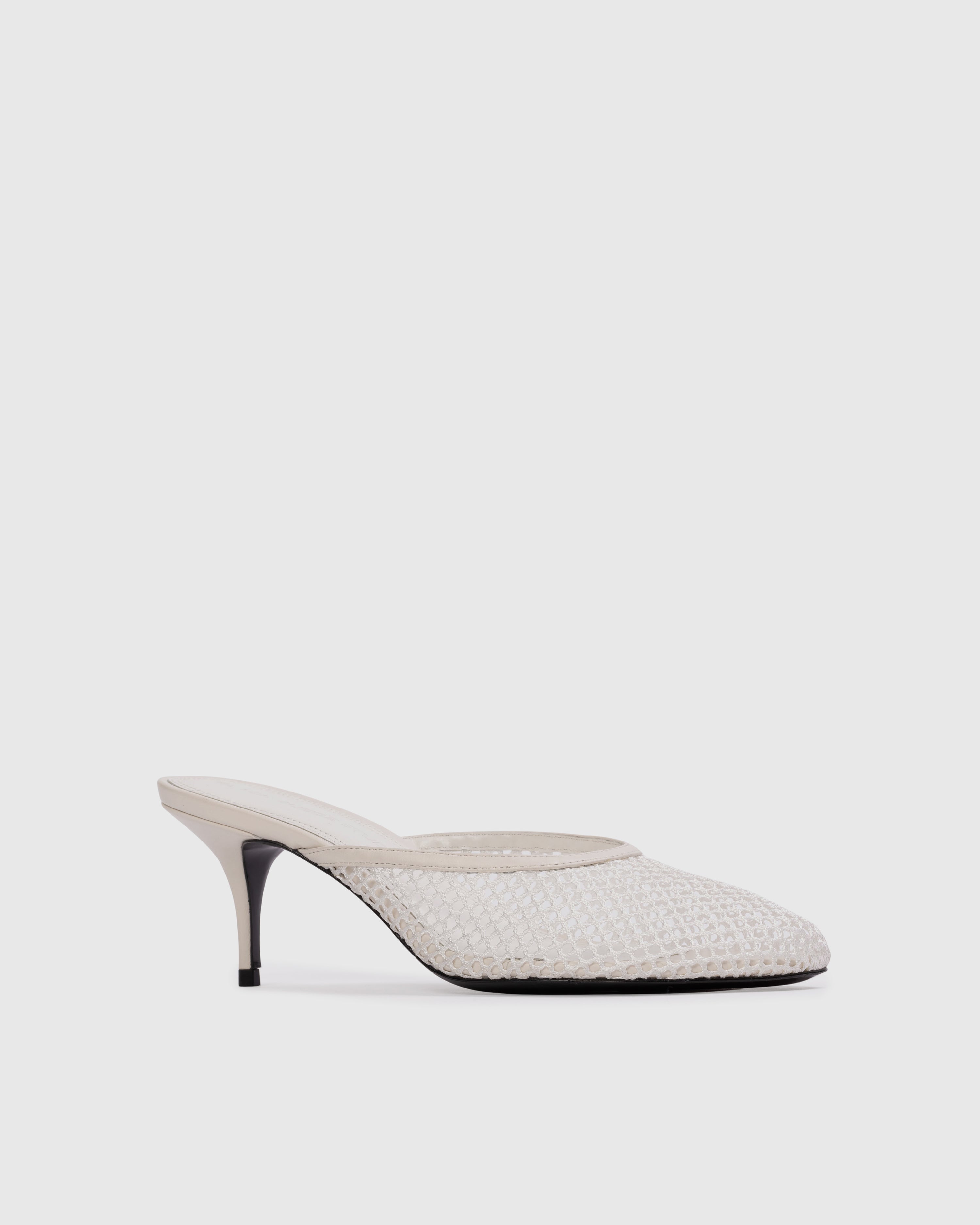 Angled round toe mesh mule, set on a curved mid heel.