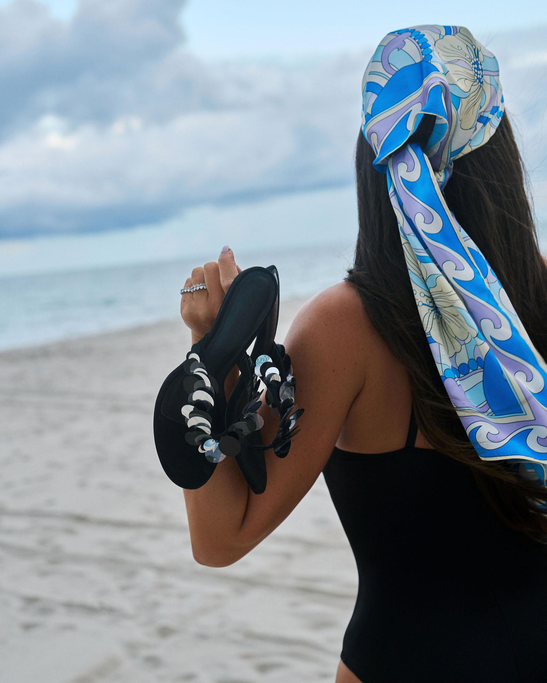 Round toe slip-on thong mule with multi-sized pailettes. Made with brushed kid suede.