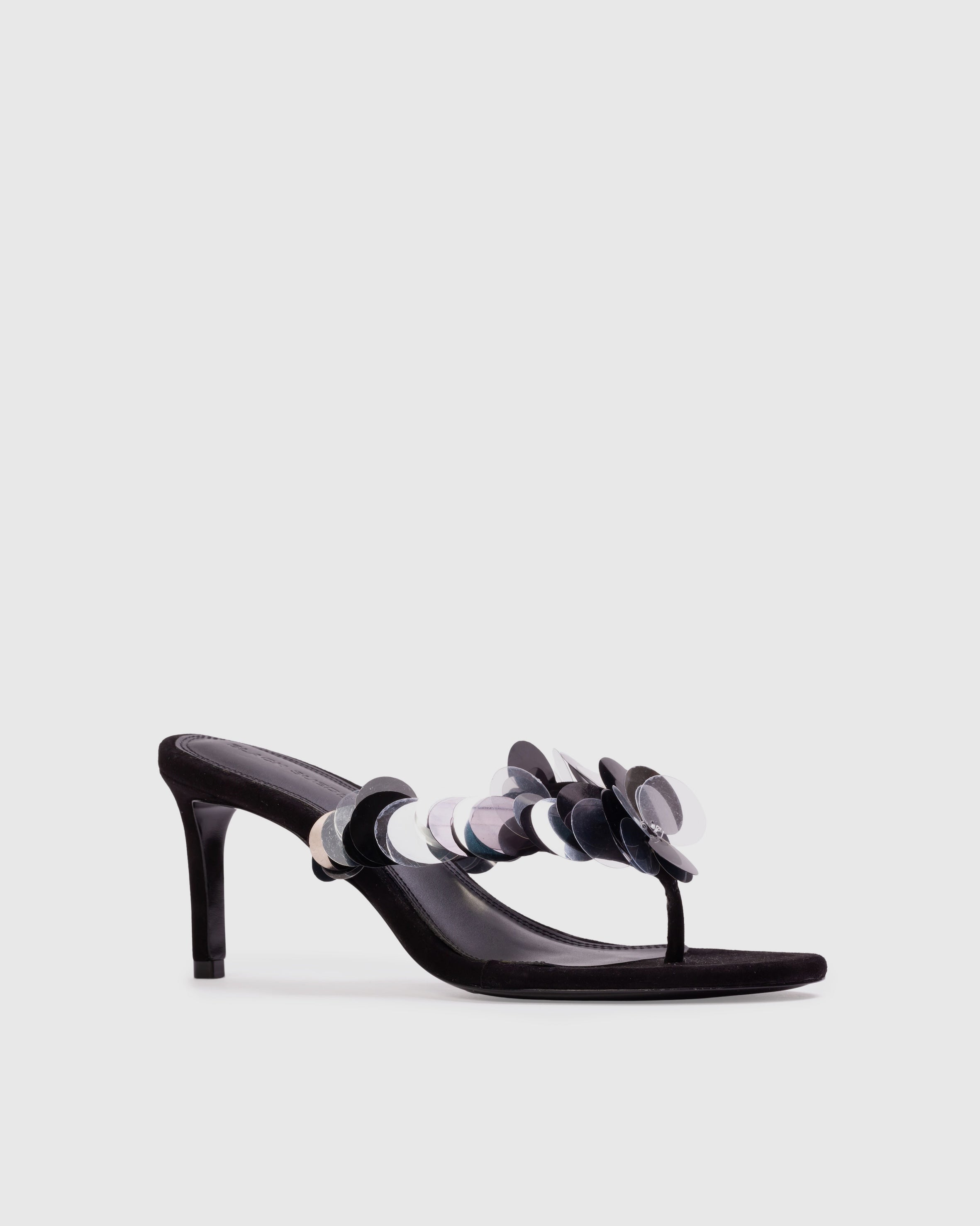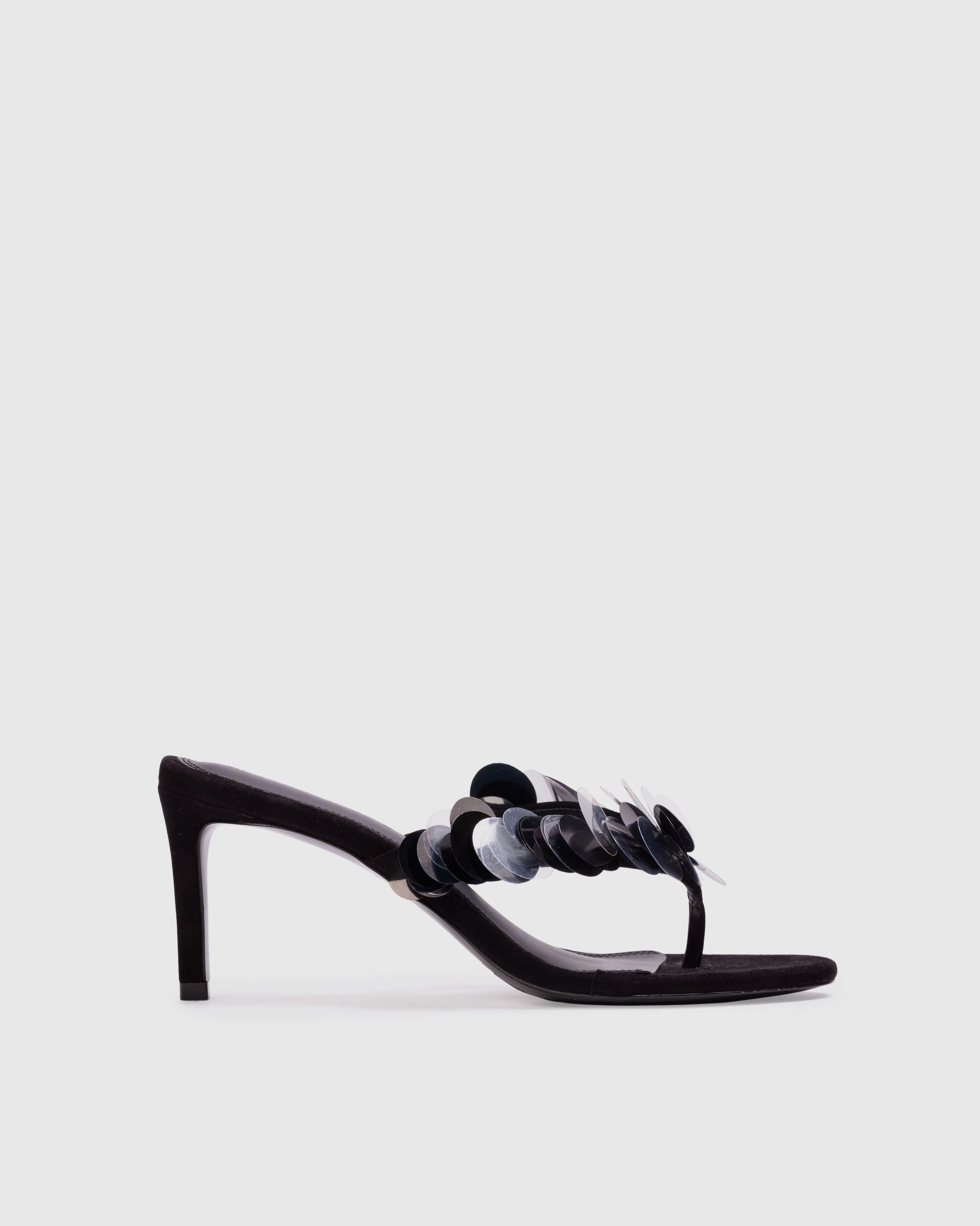 round toe slip-on thong sandal with multi-sized pailettes. set on a straight mid heel