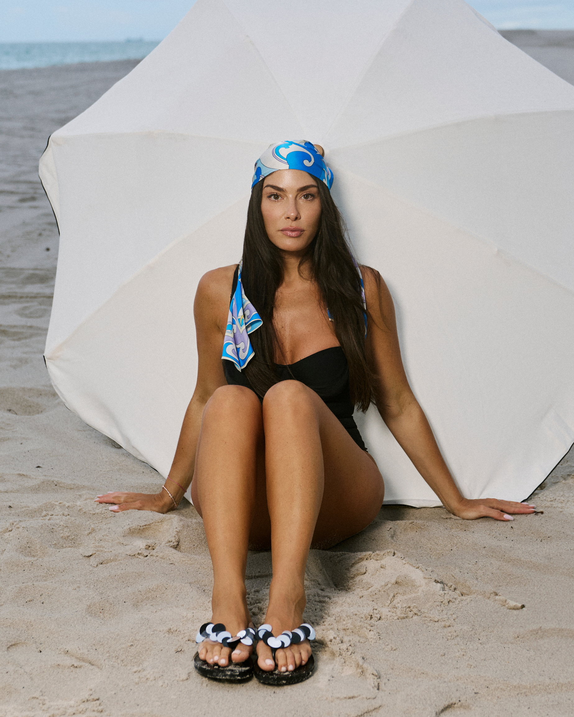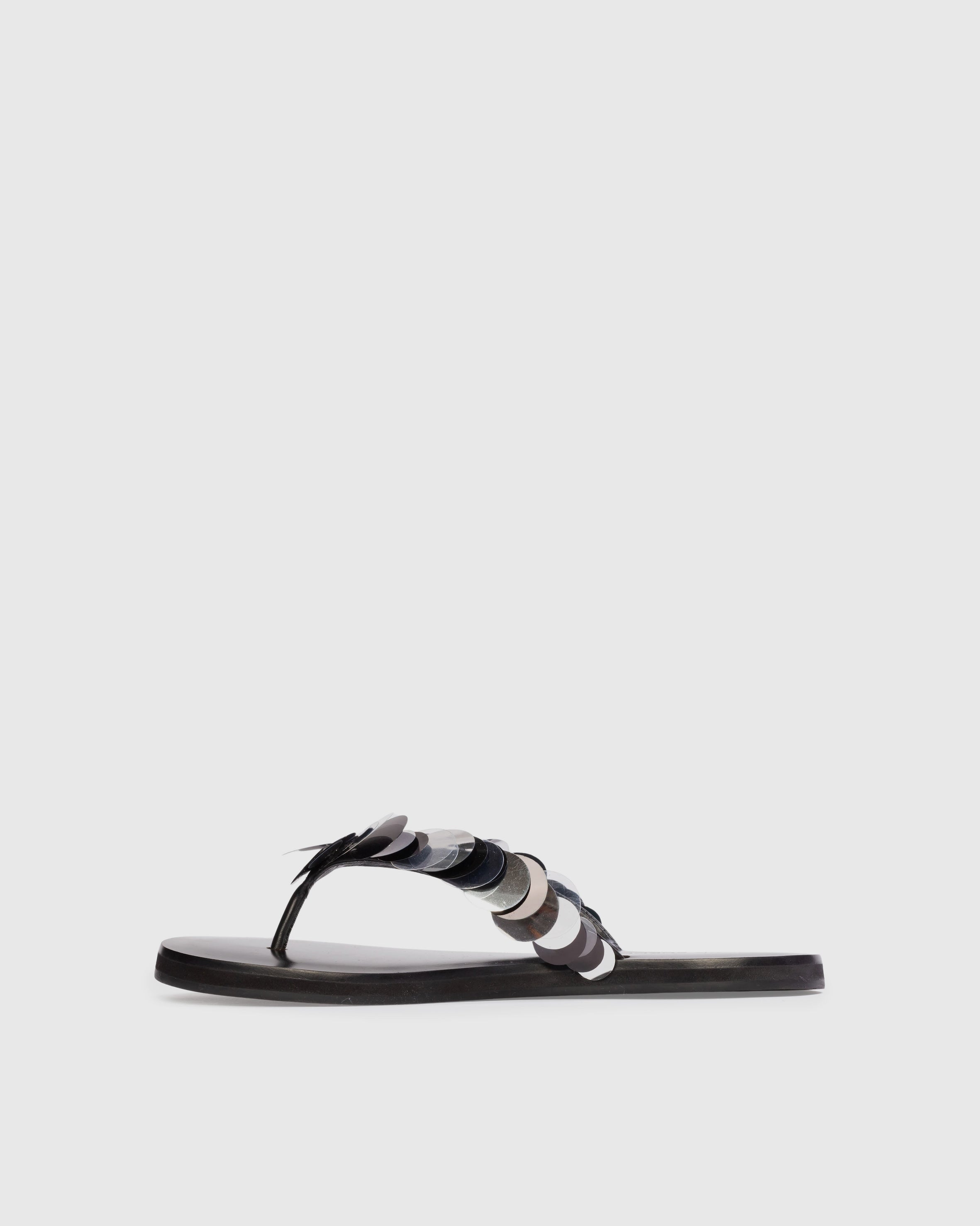 Round toe slip on flat sandal with pailettes, set on a leather sole. made with smooth buffed leather.