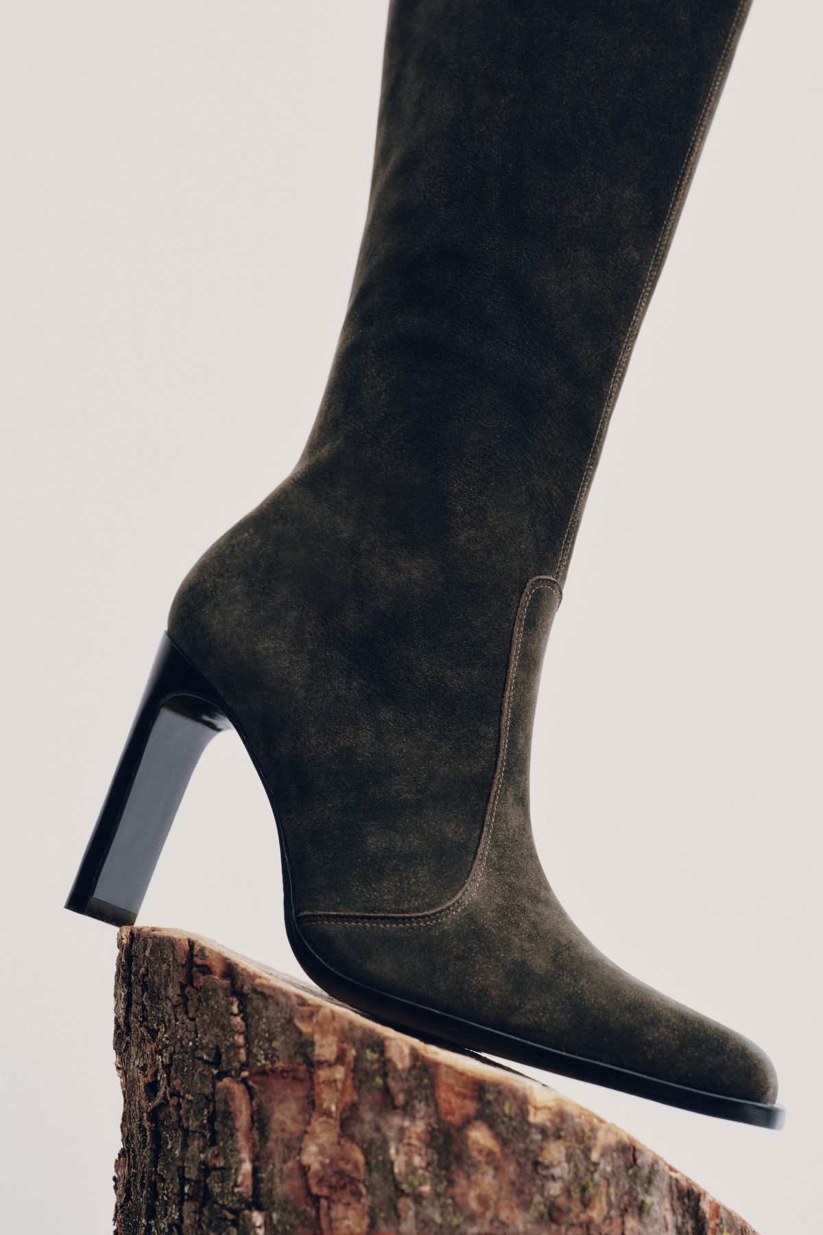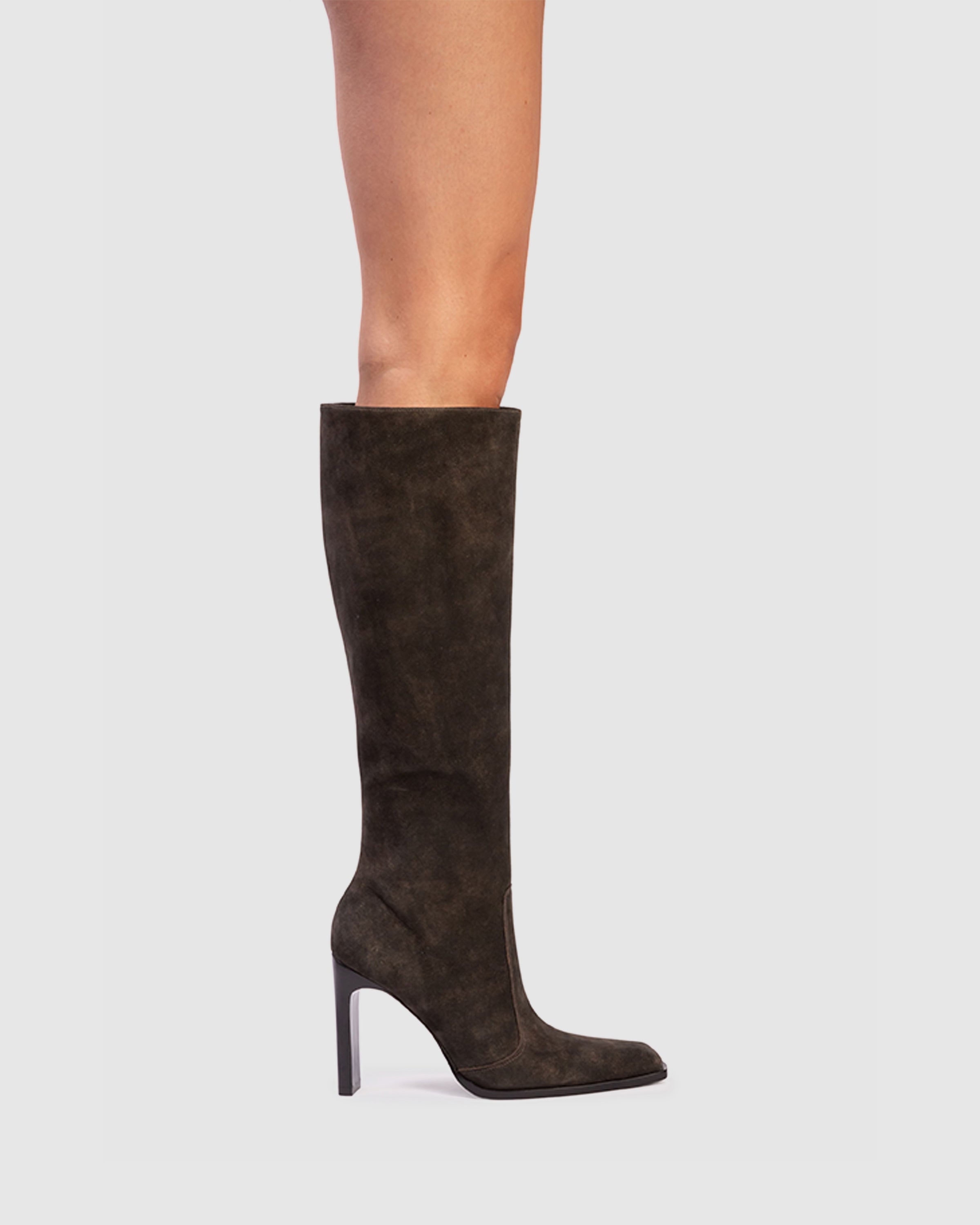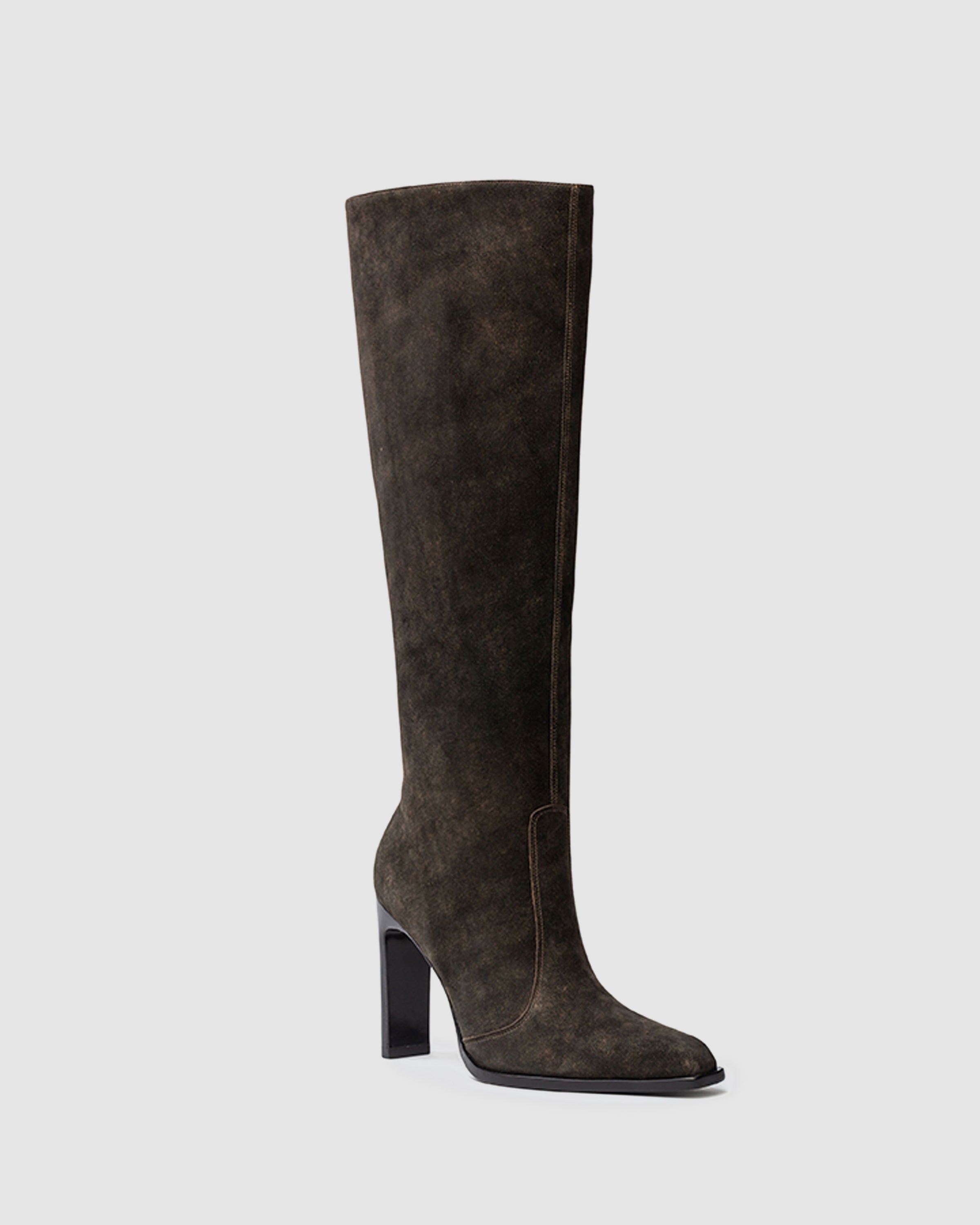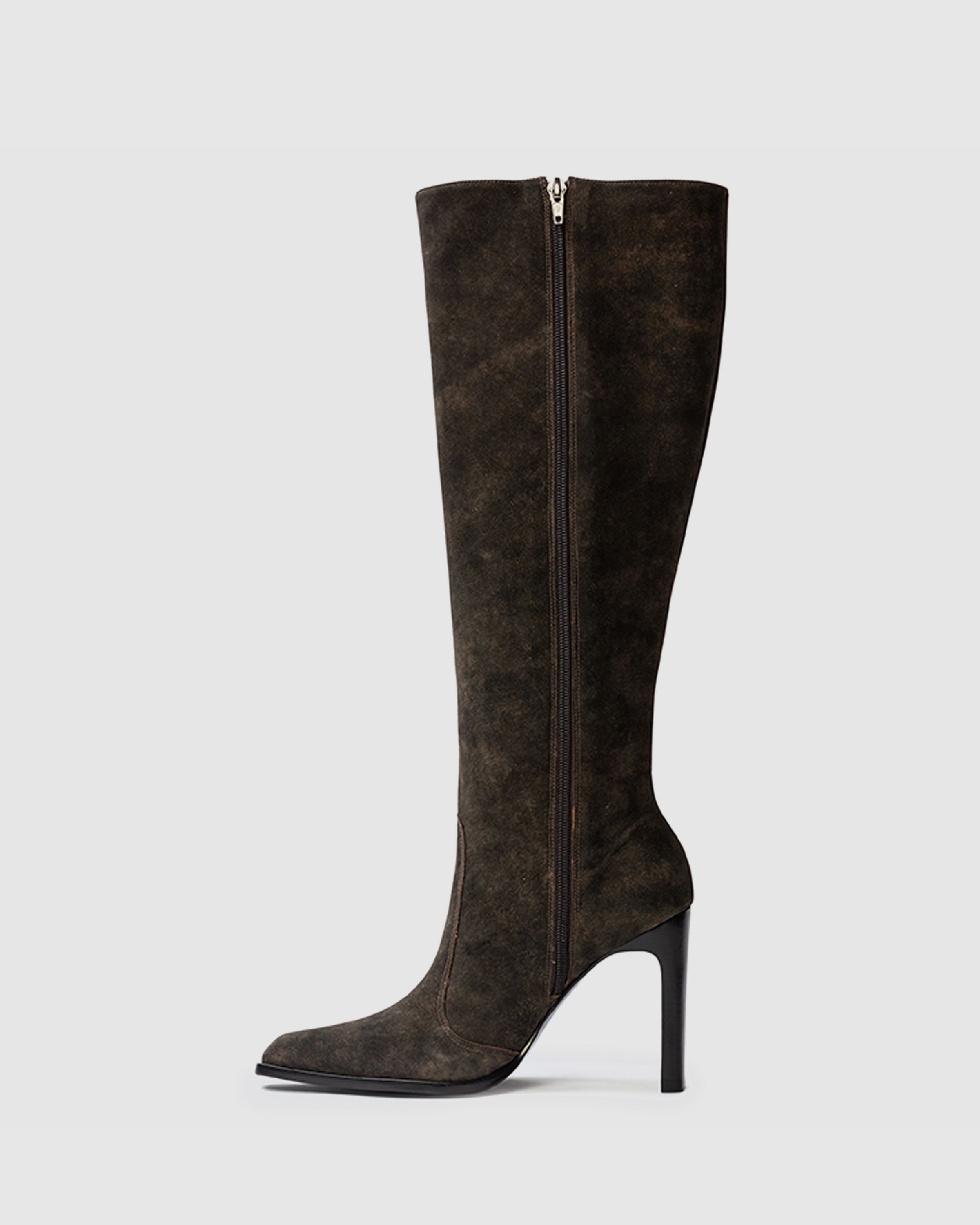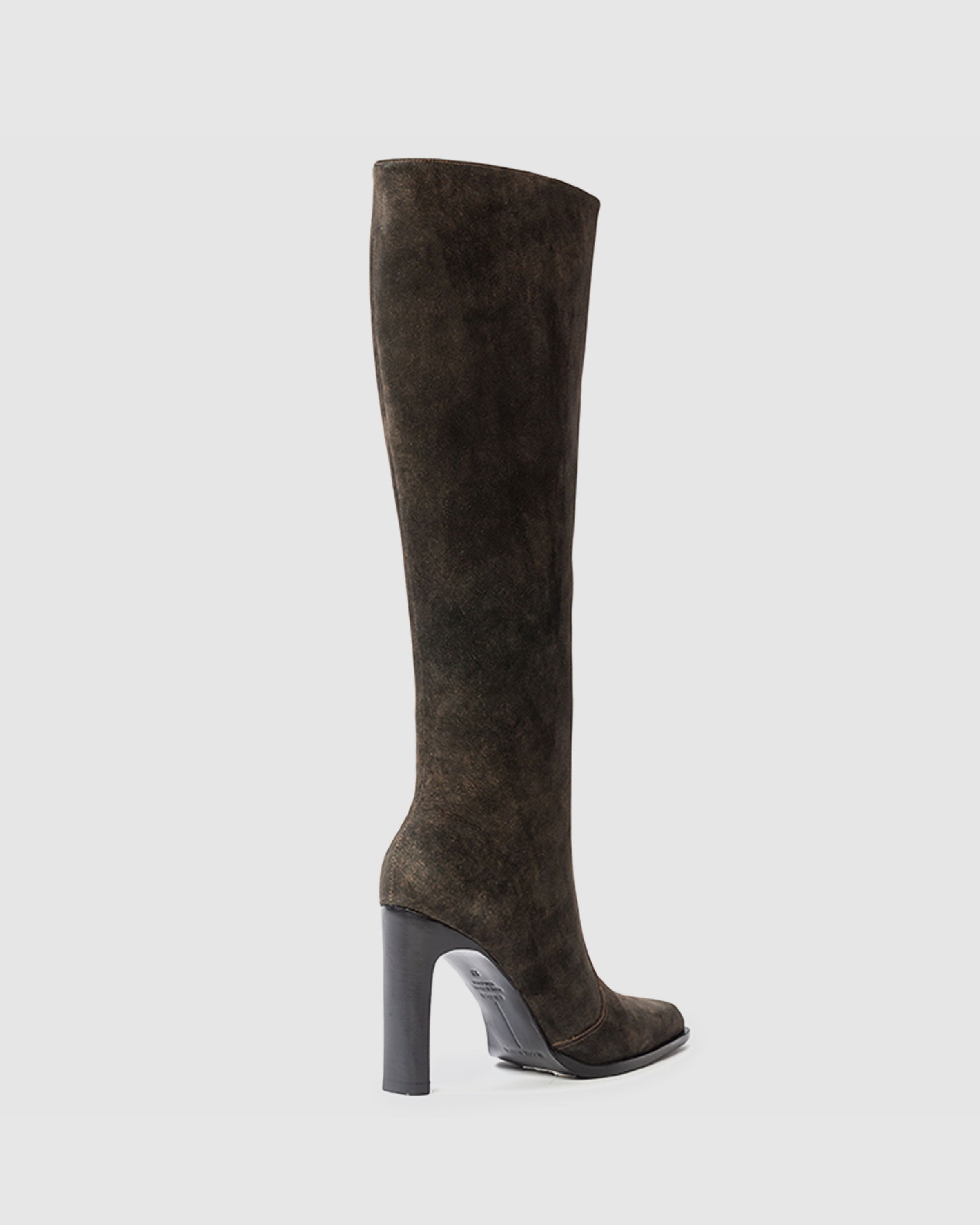 Snipped toe below the knee boot, set on an electroplated set back domino heel. Made with distressed nubuck.