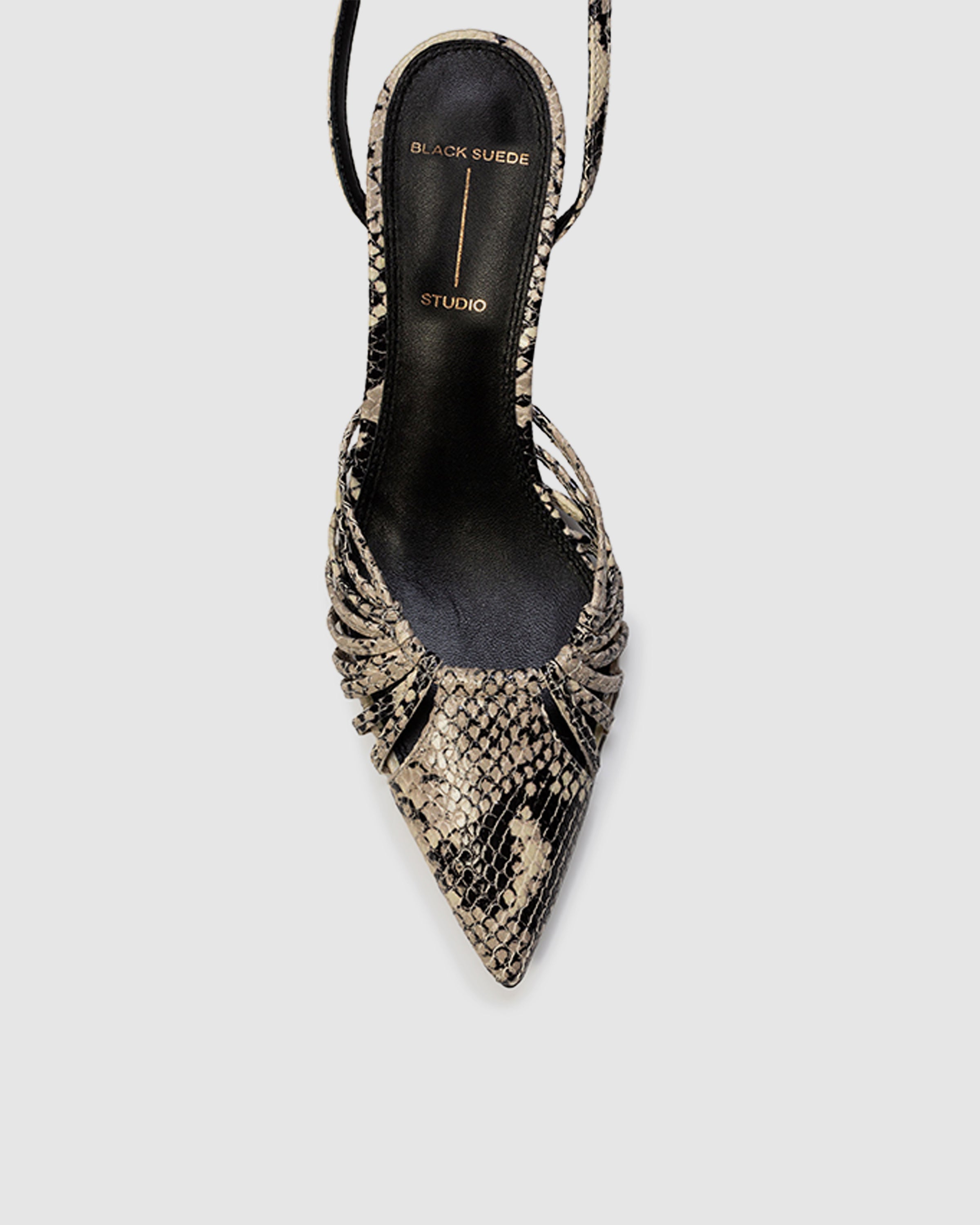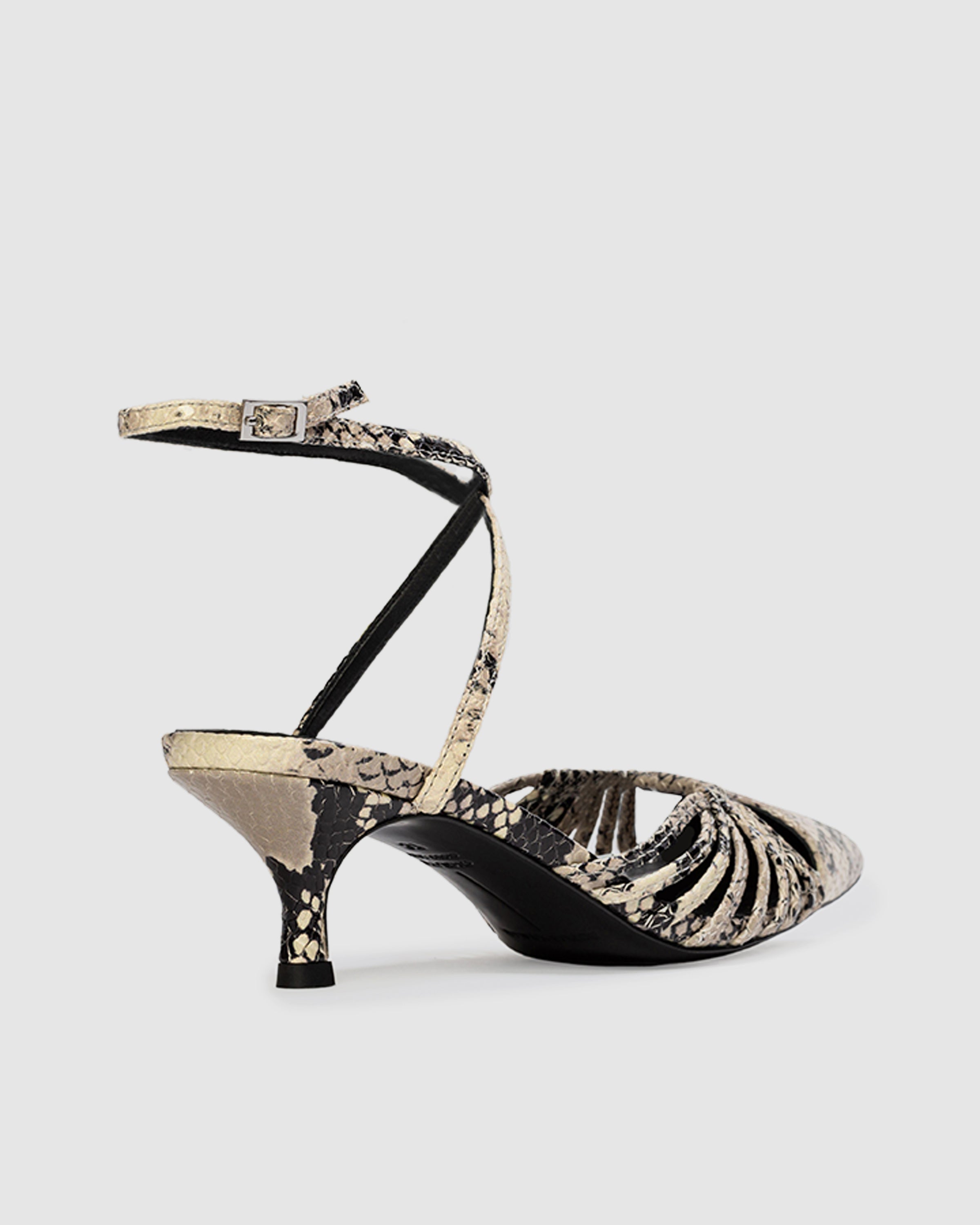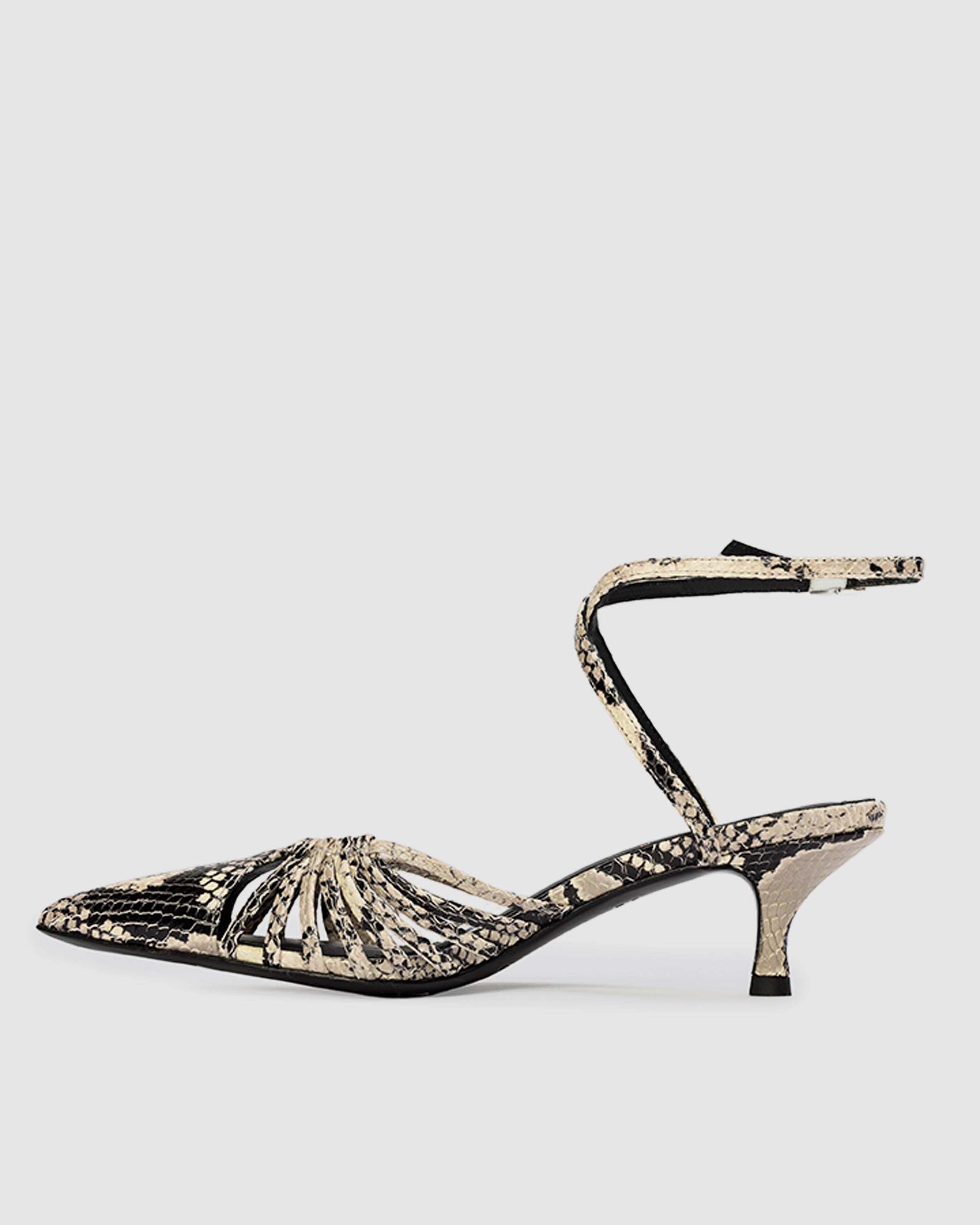Pointy toe strappy pump, set on a curved kitten heel. Made with textured snake printed  leather.