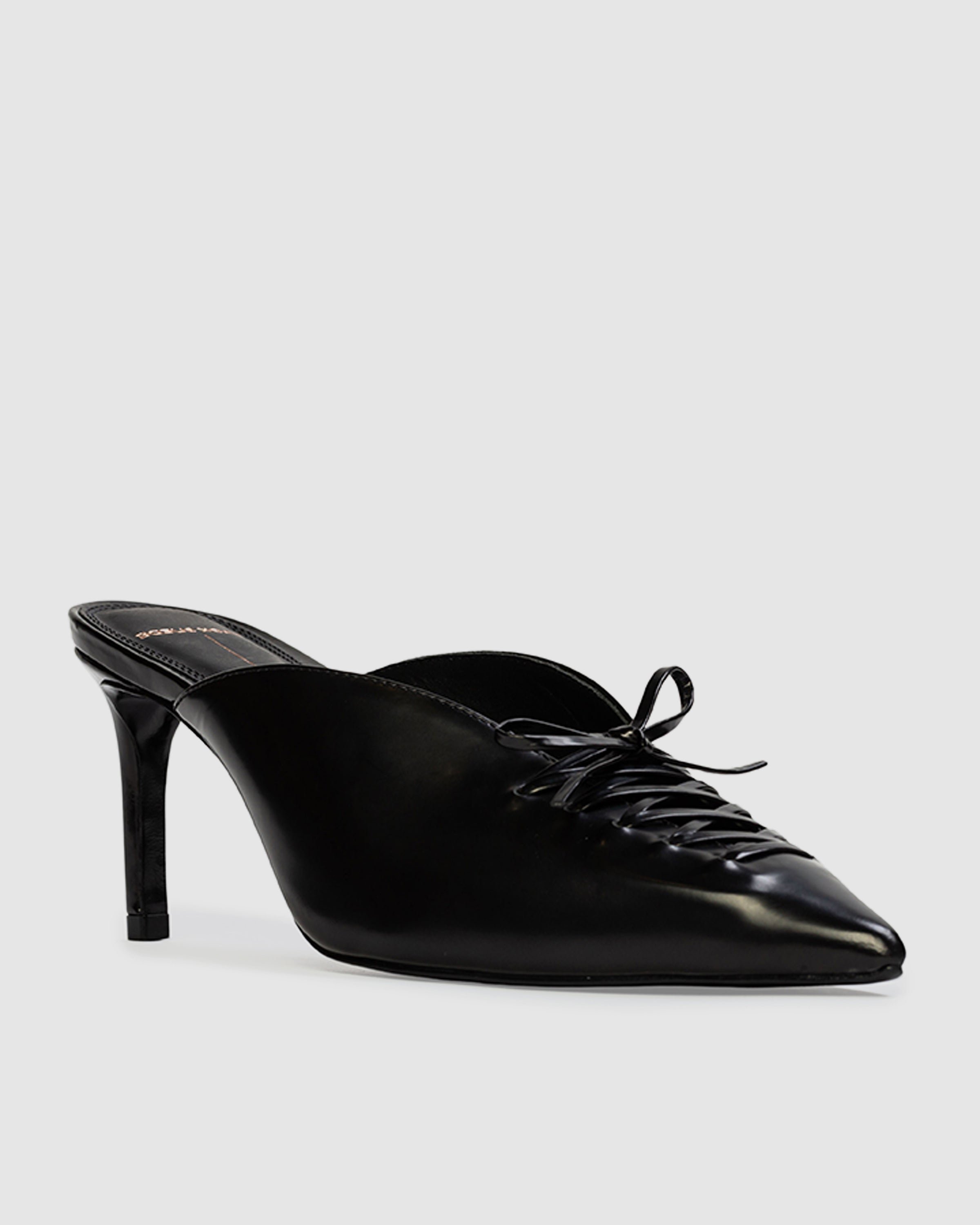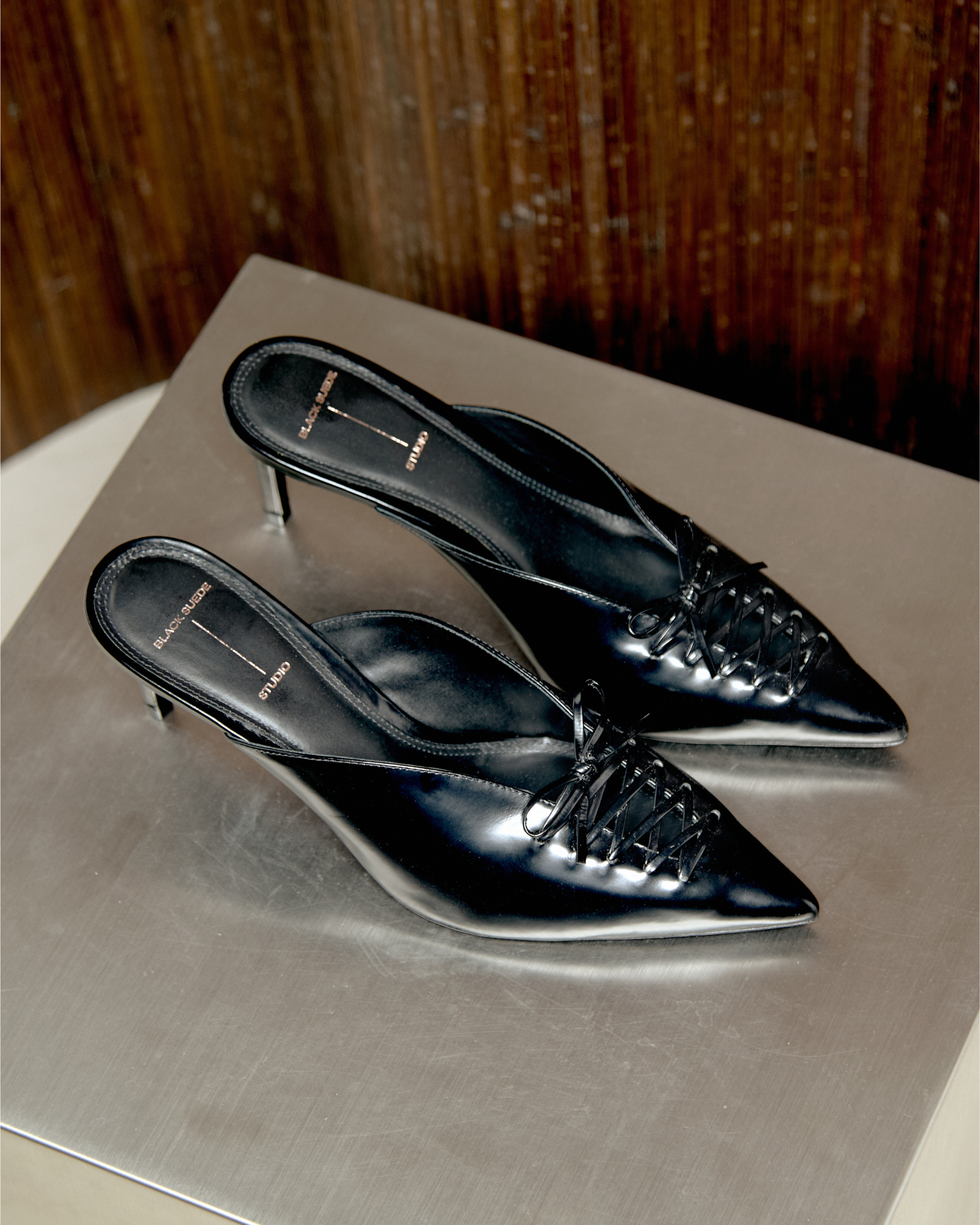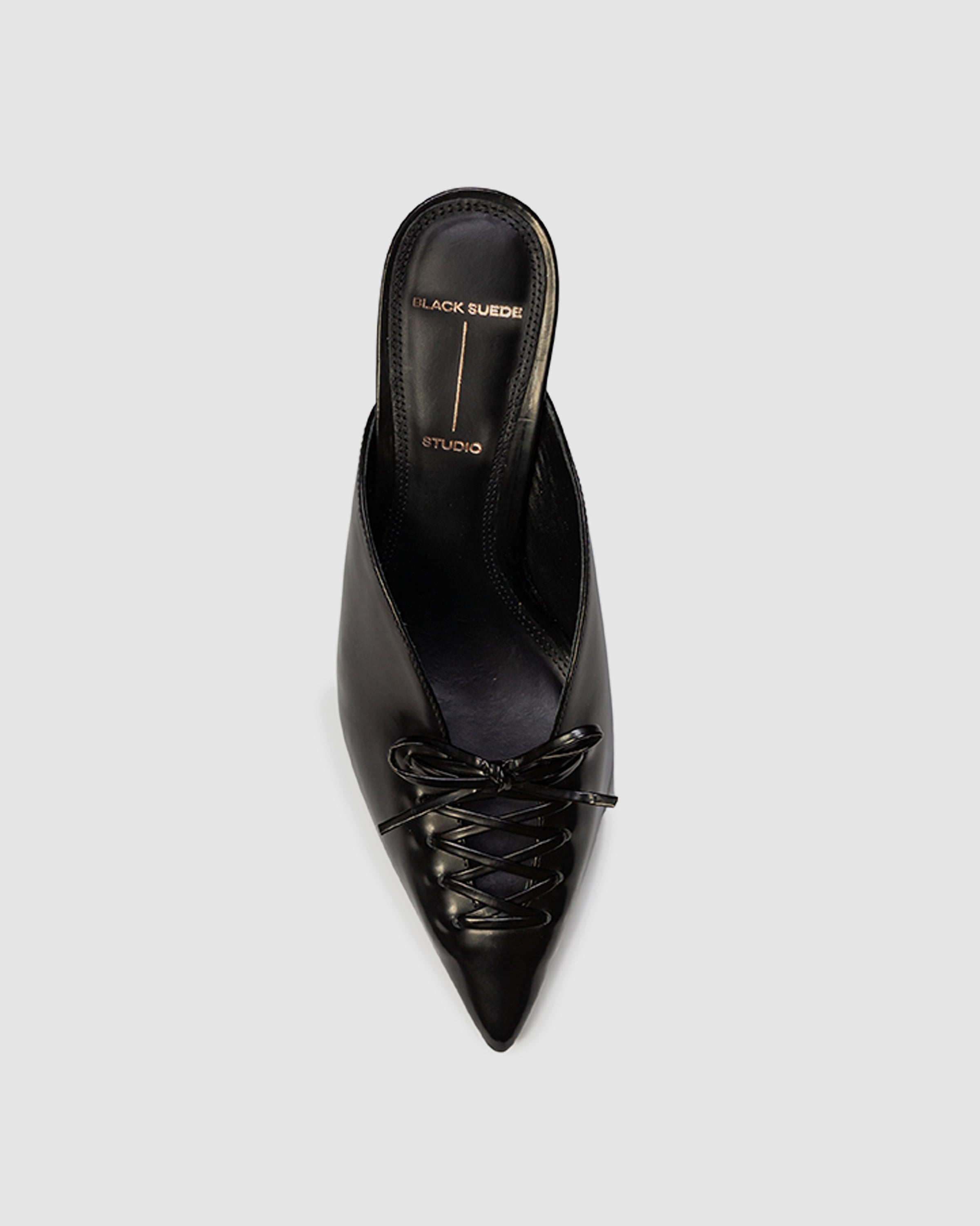 Pointy toe mule with lace up detail, set on a straight kitten heel. Made with smooth box leather.