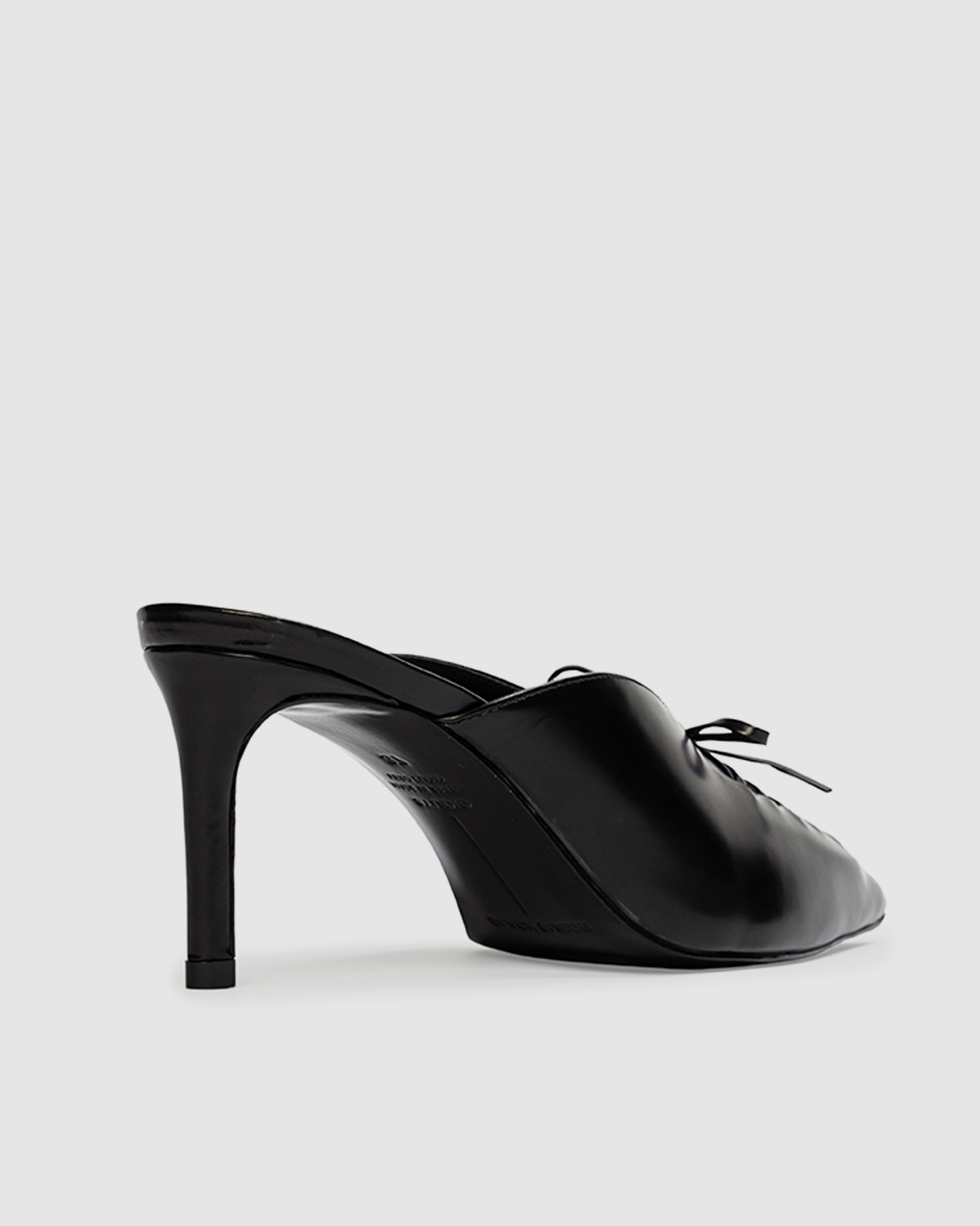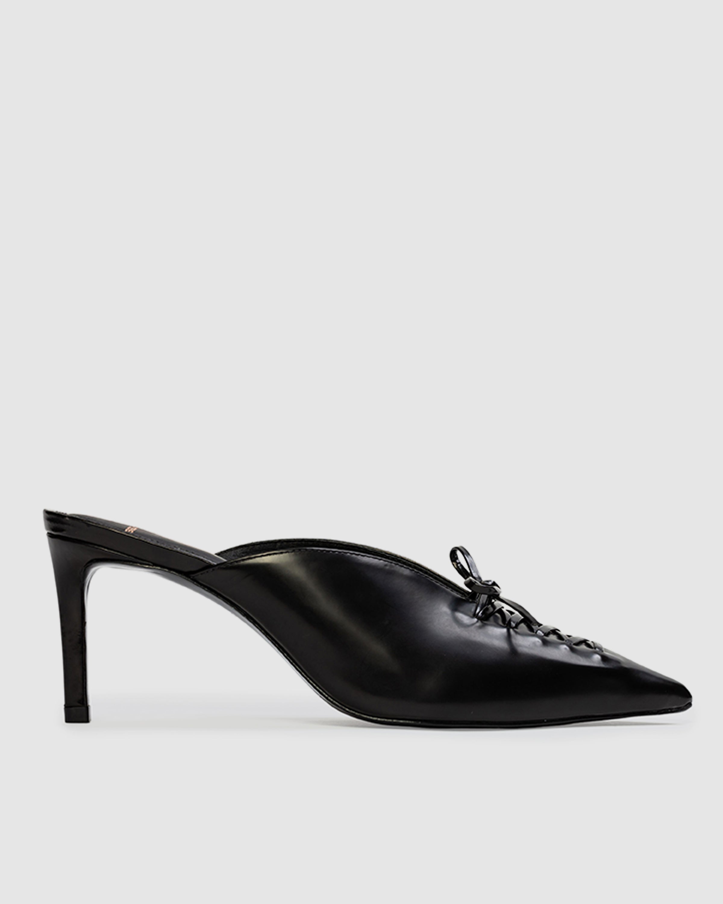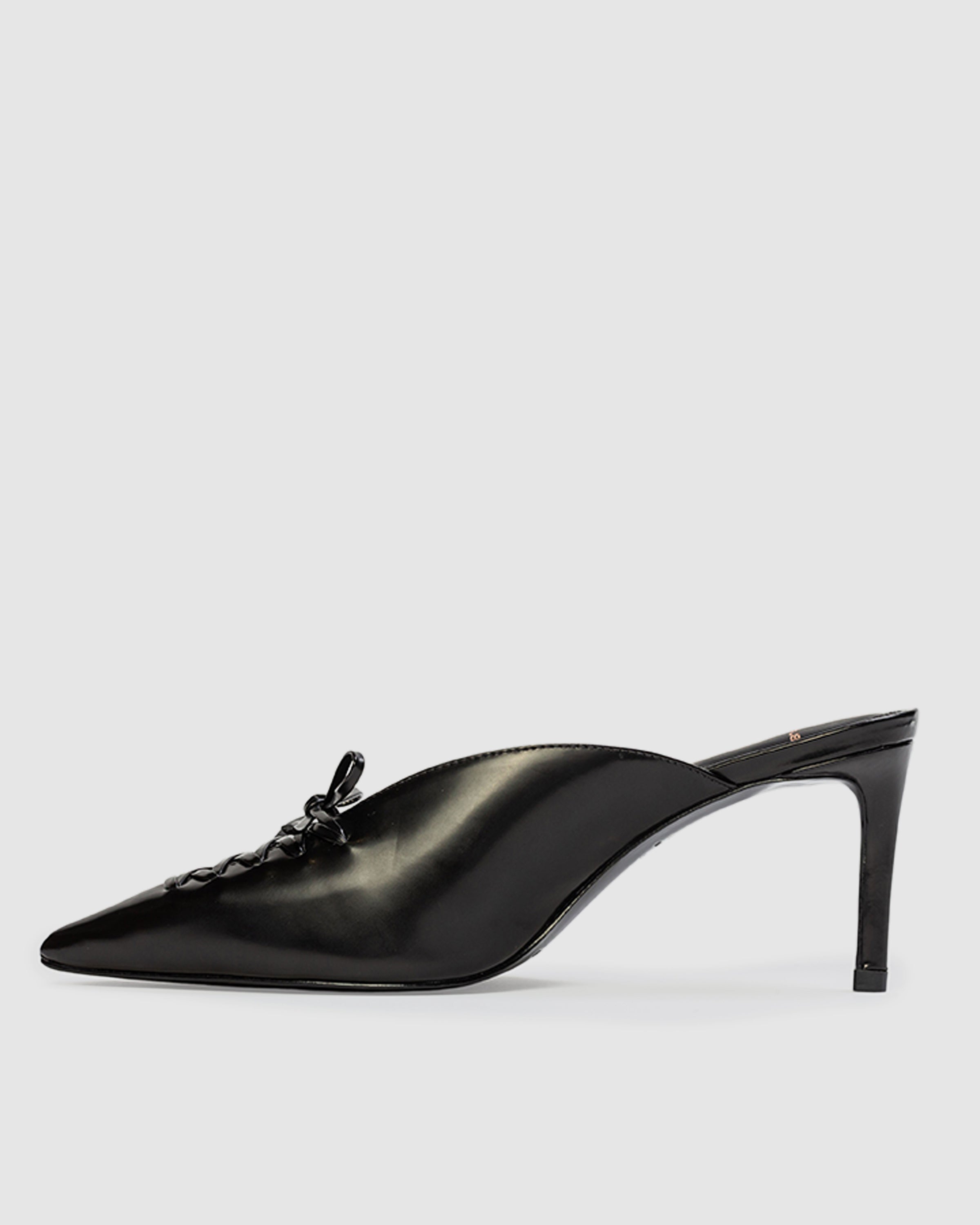 Pointy toe mule with lace up detail, set on a straight kitten heel. Made with smooth box leather.