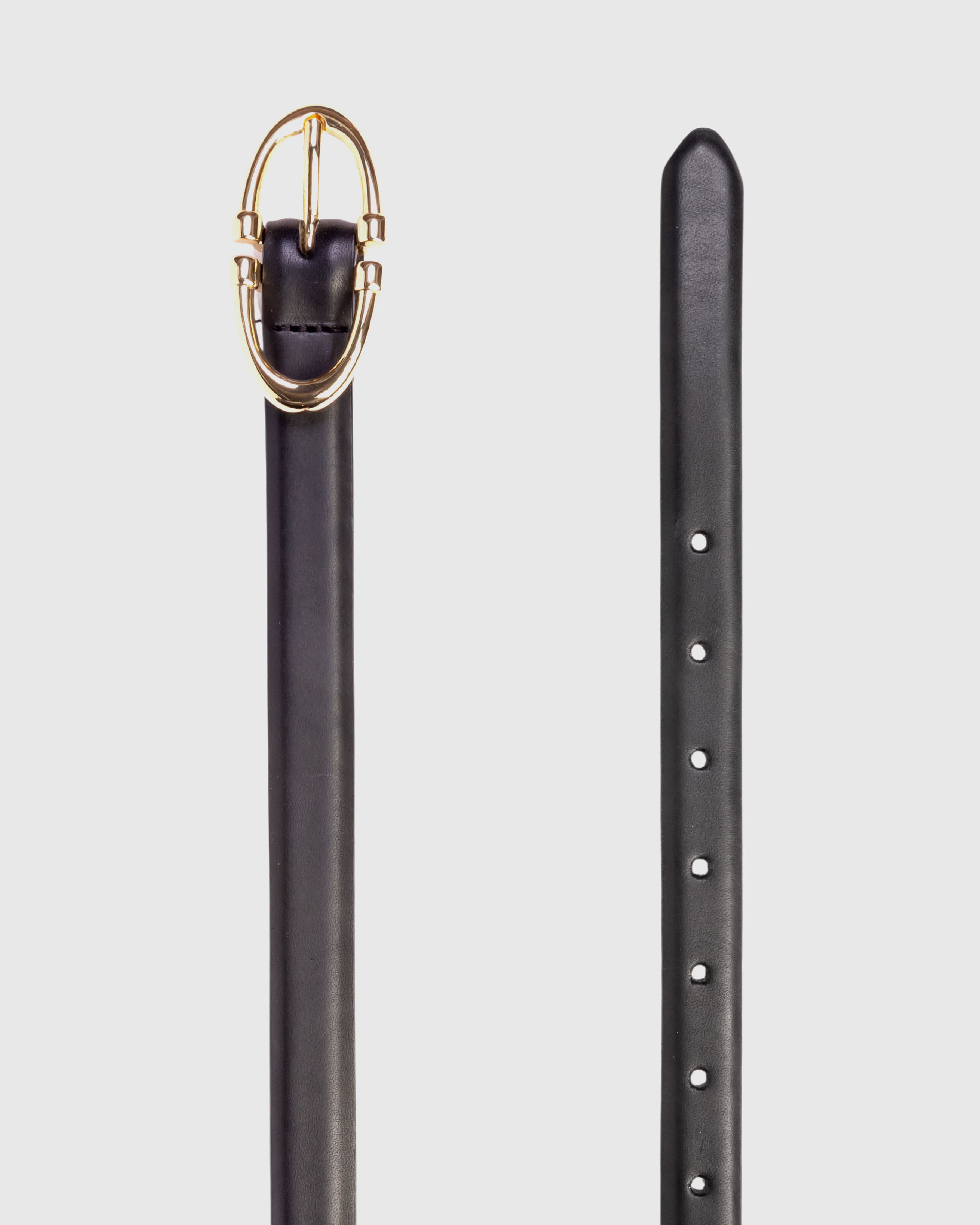 18k gold plated brass halo shaped buckle. Secured on a smooth buffed leather strap.
