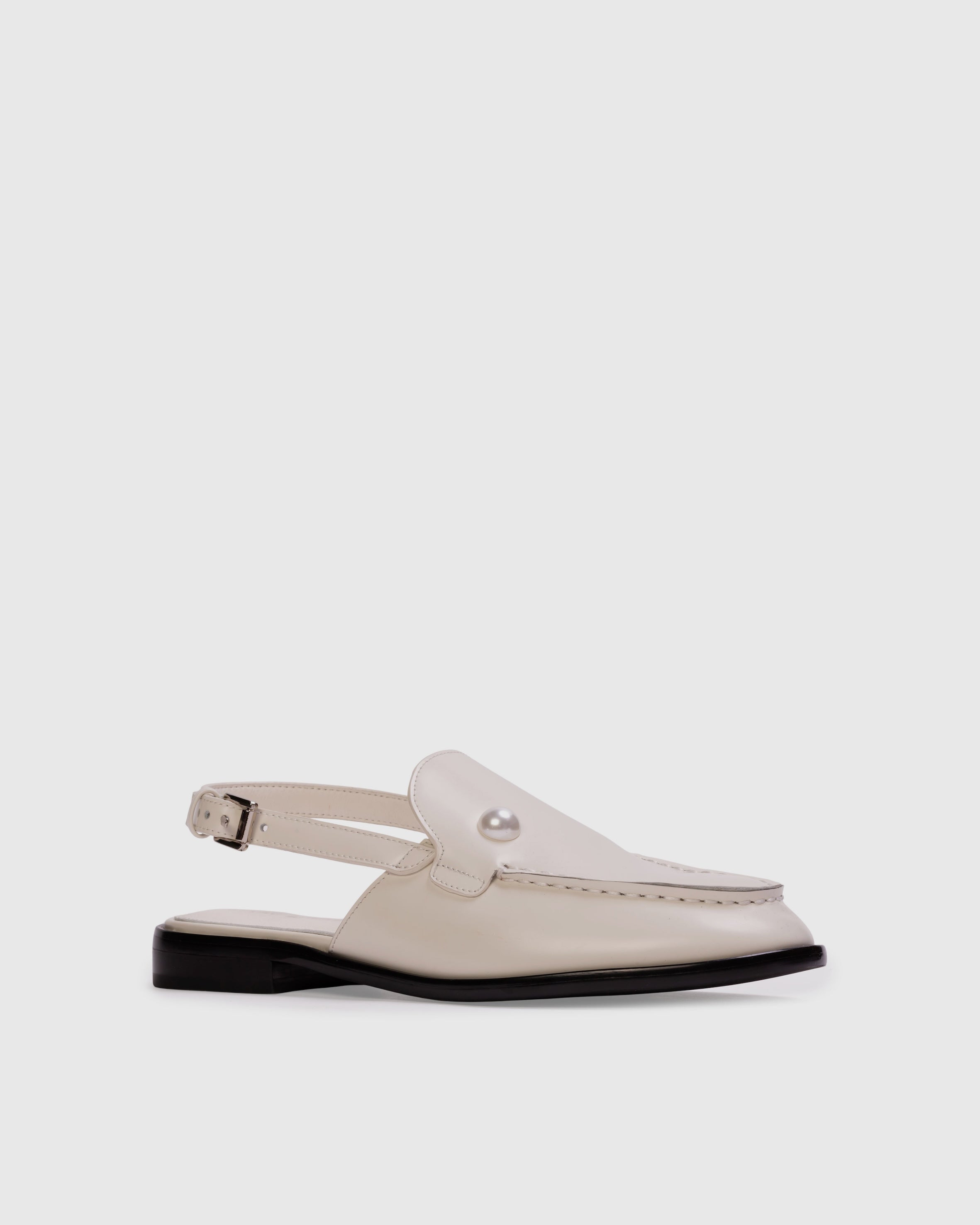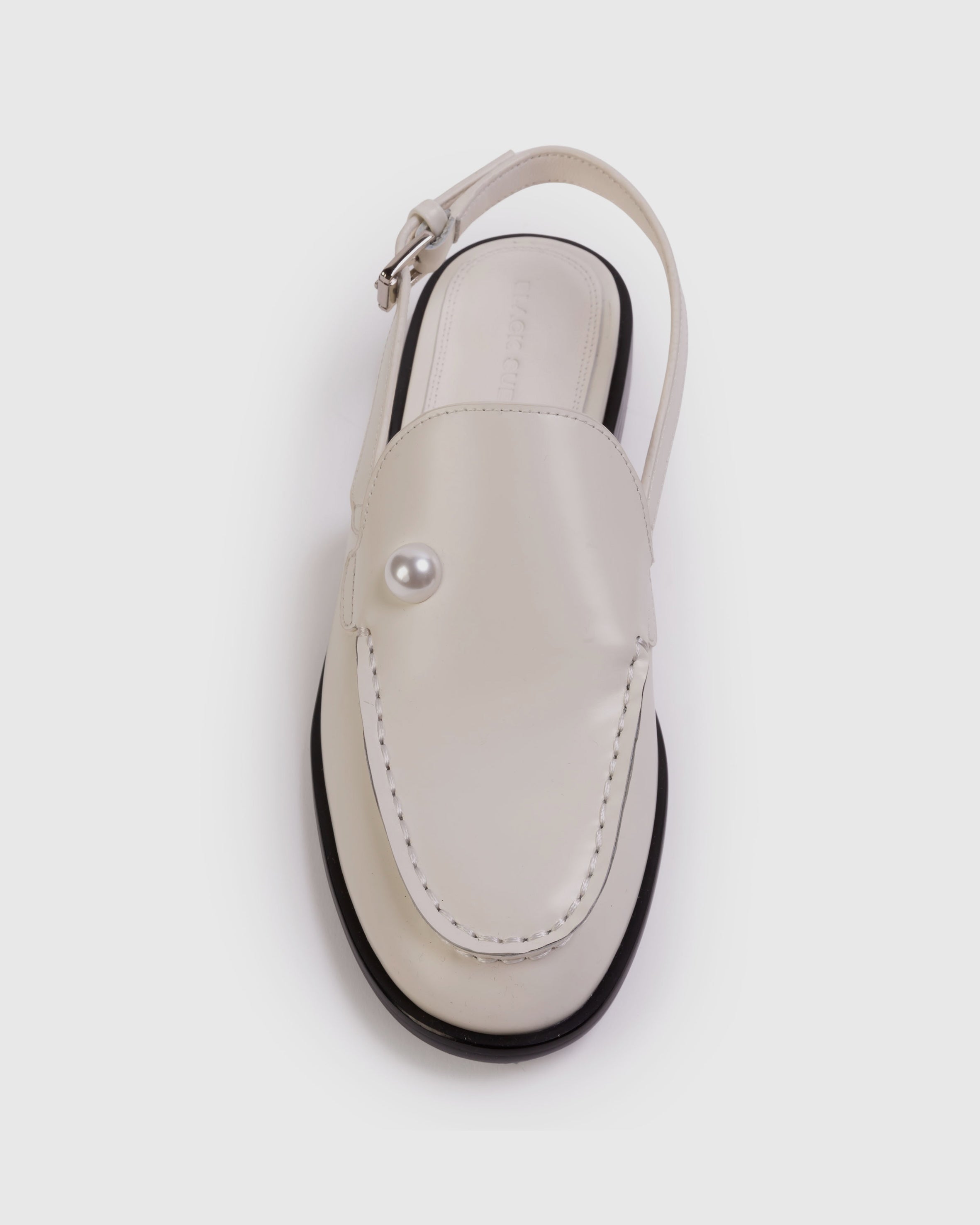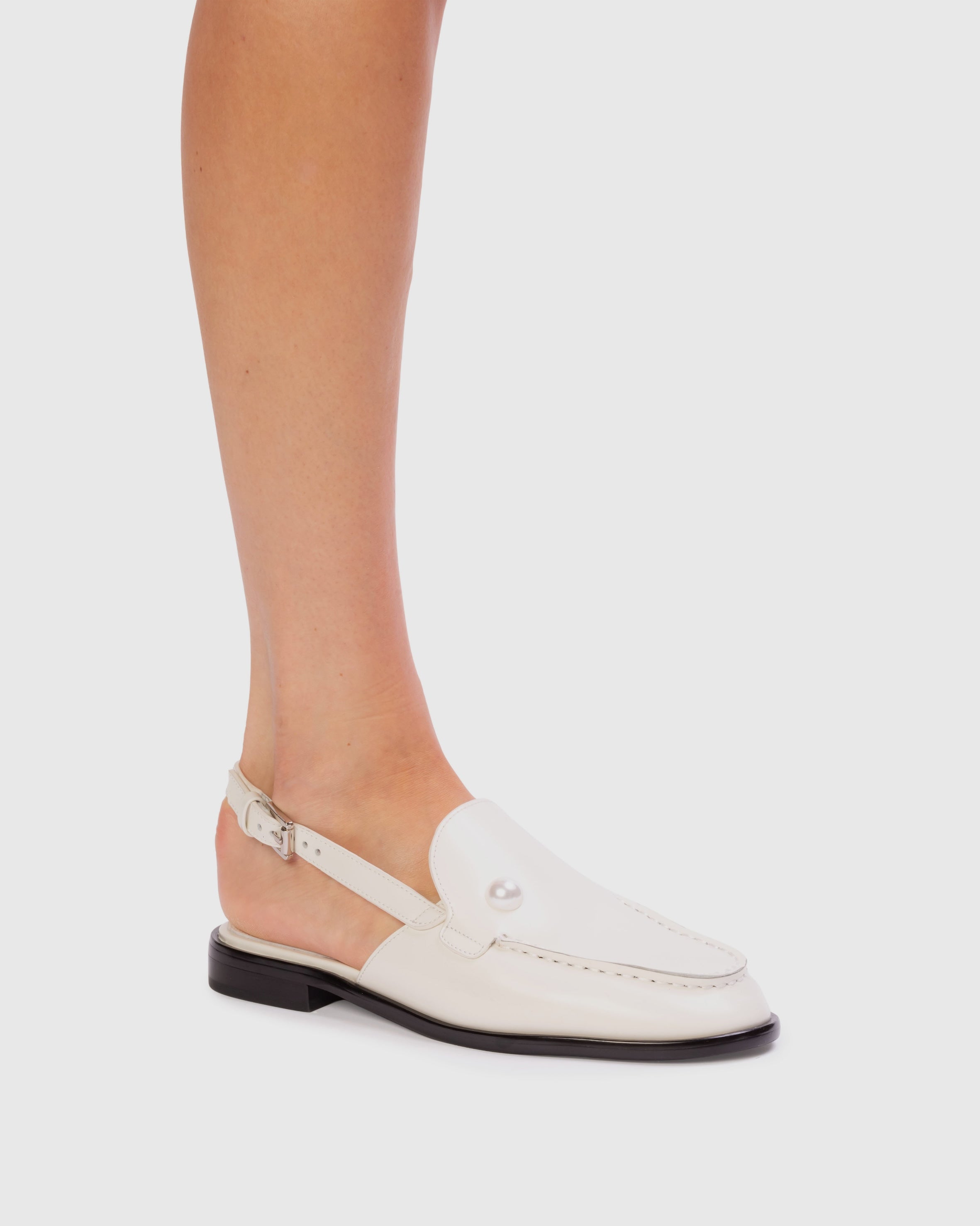 Round-toe slingback loafer with pearl detail, set on a built-up sole. Made with smooth buffed leather.