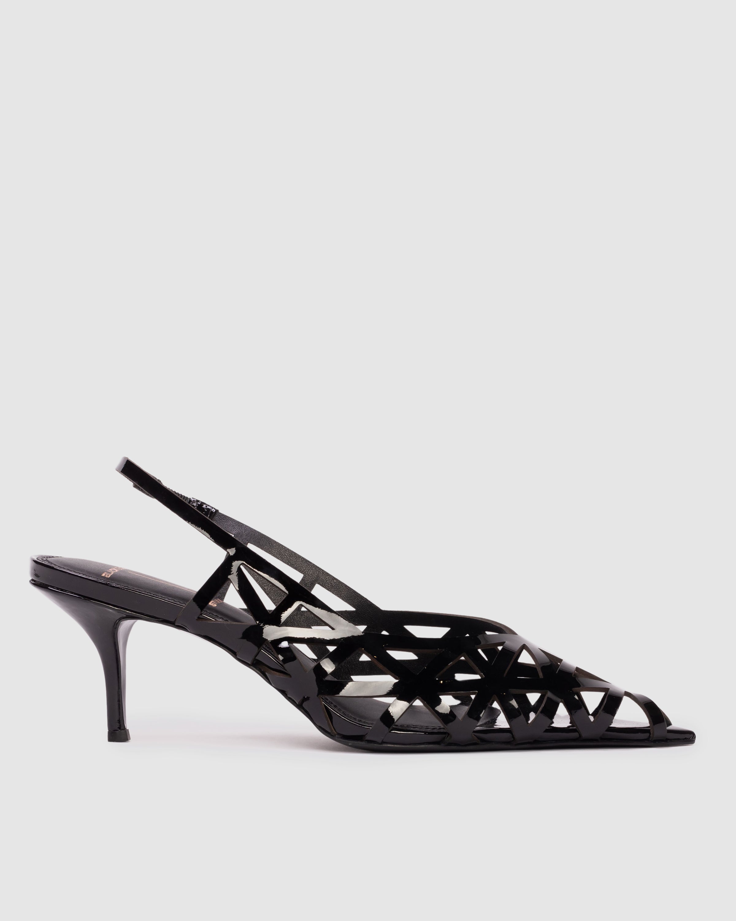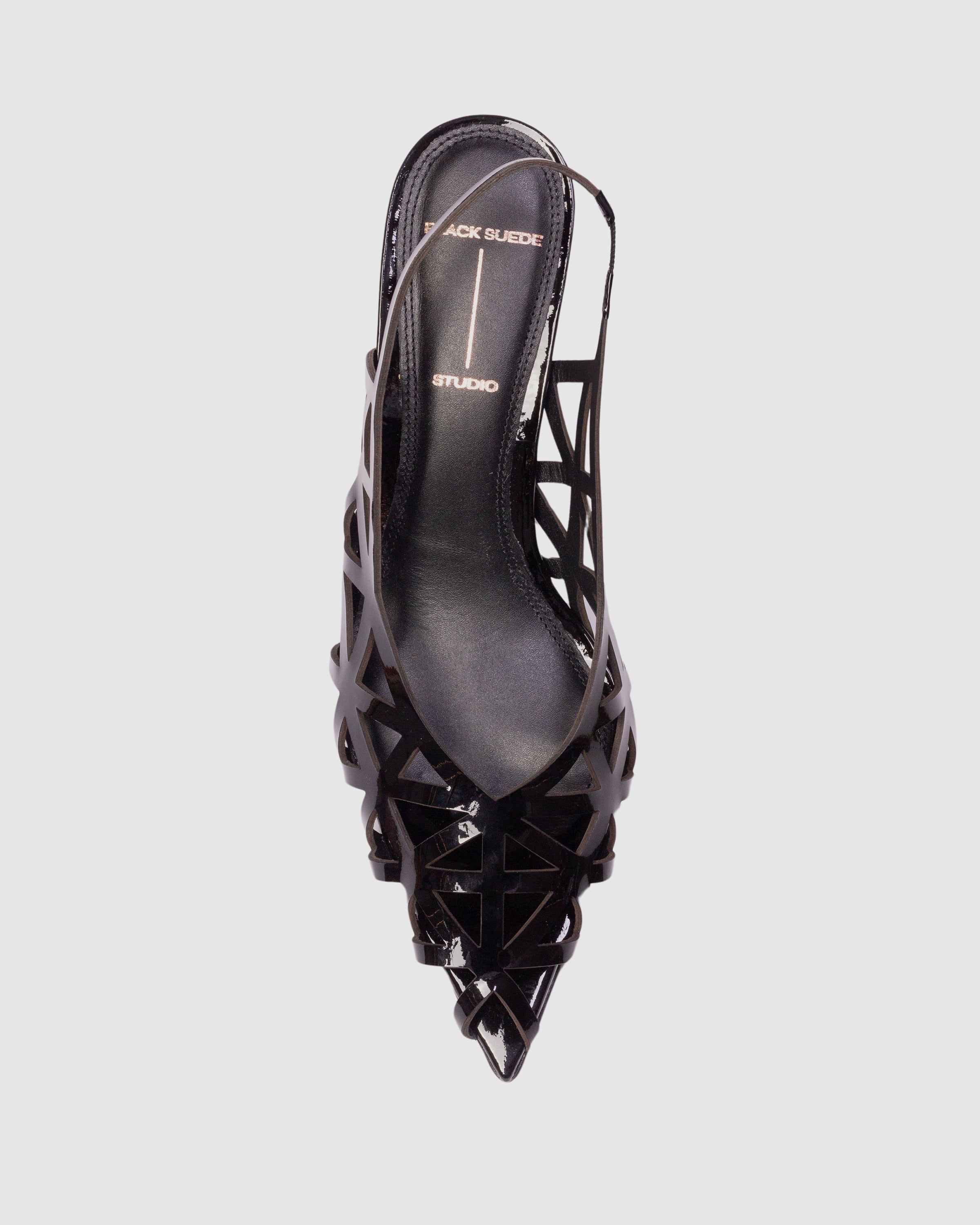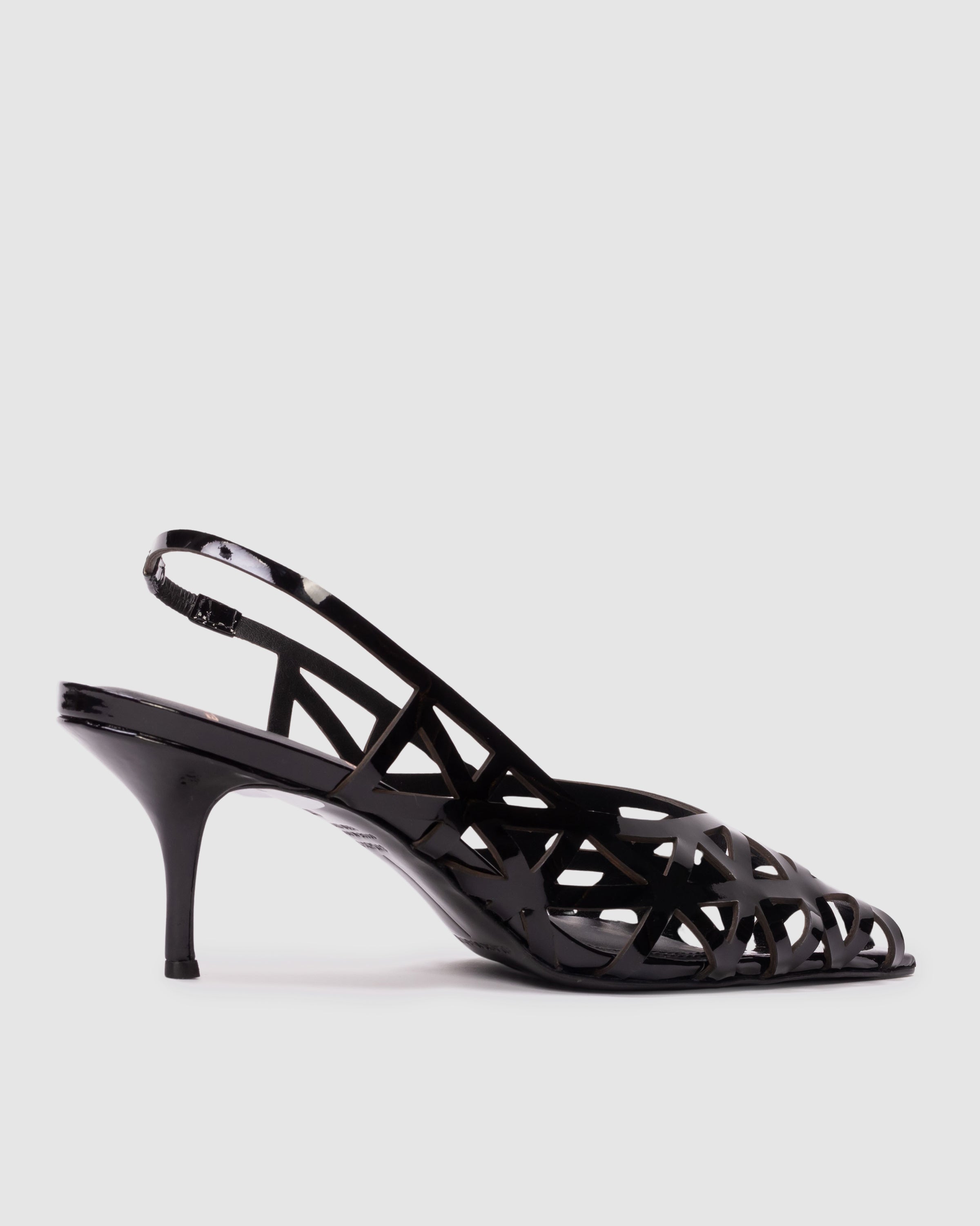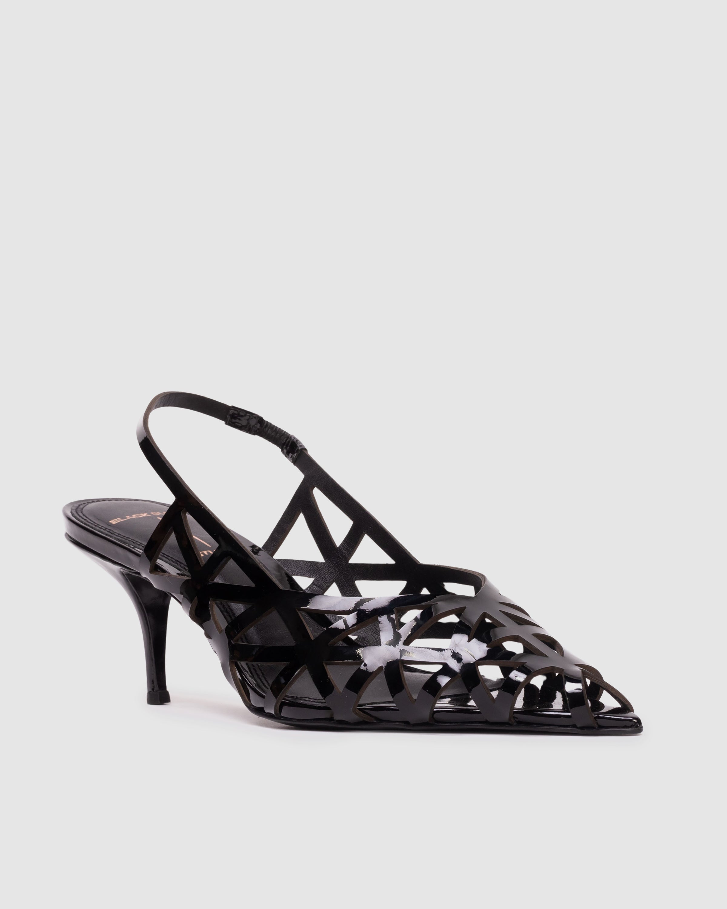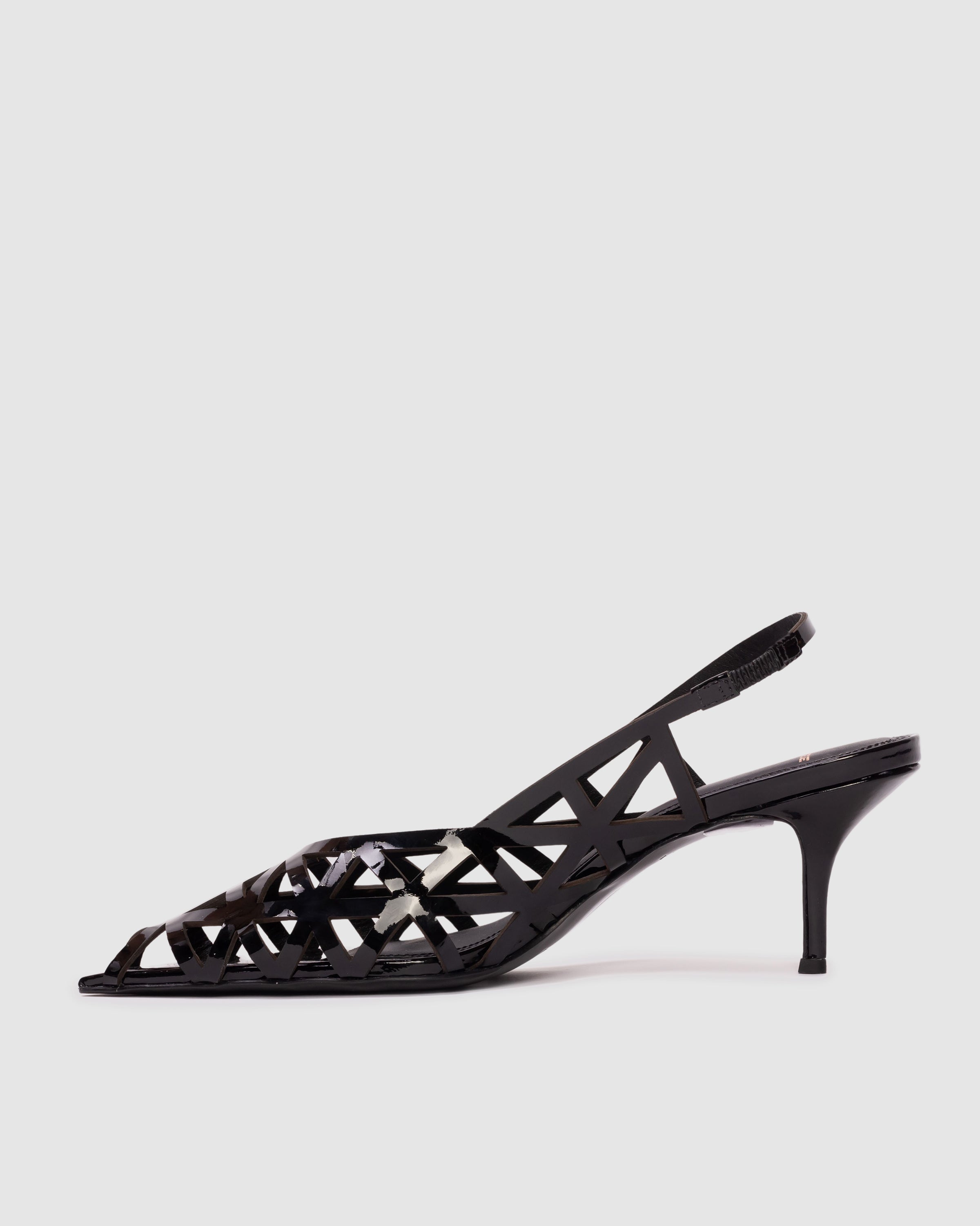 Pointed toe laser-cut slingback pump set on a kitten heel. Made with patent leather.
