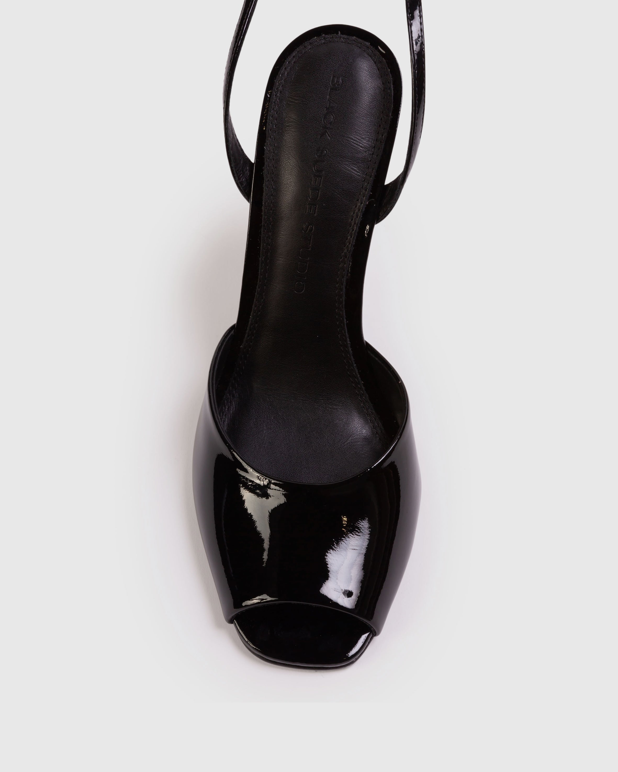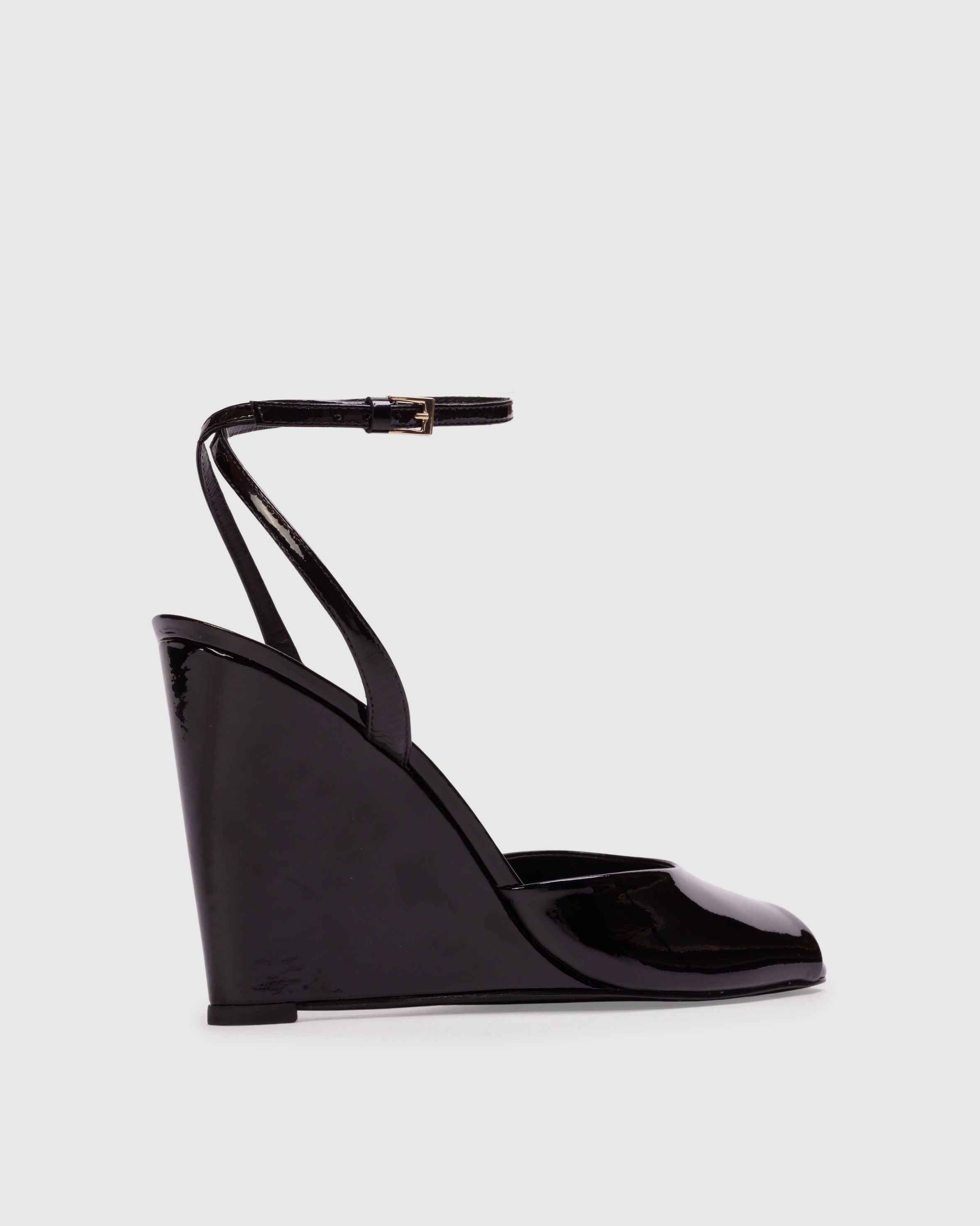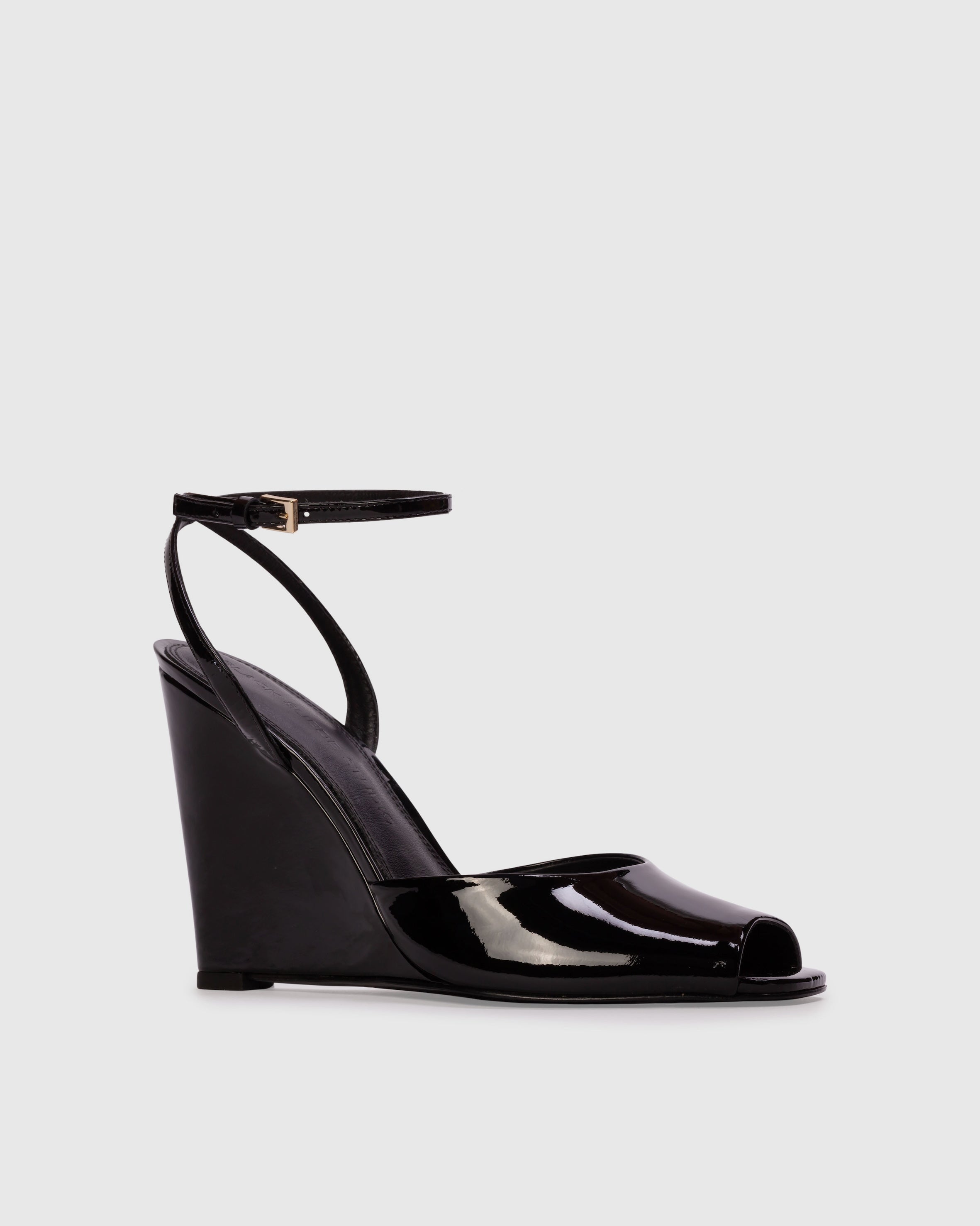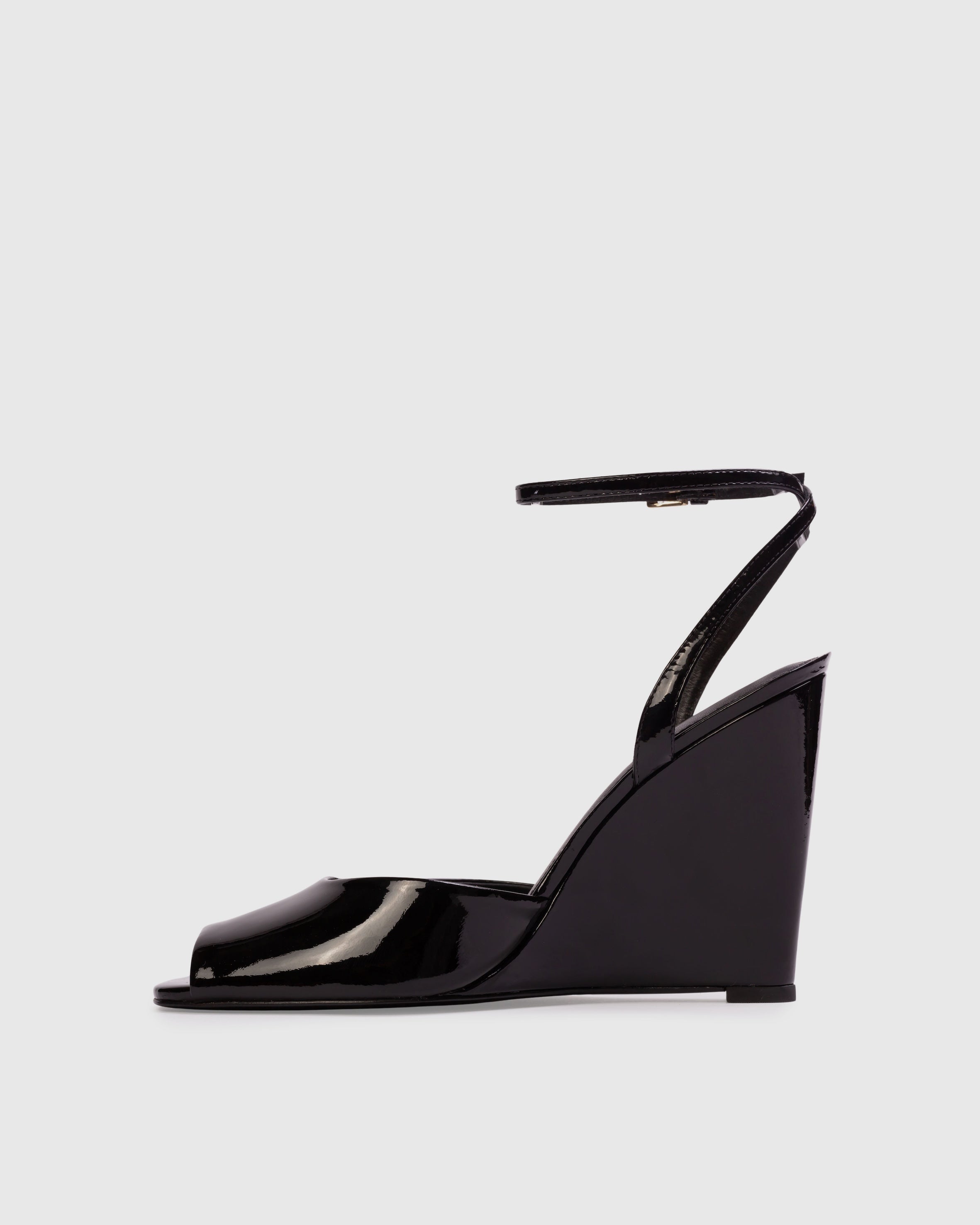 Micro peep toe sandal, set on a tapered wedge. Made with smooth patent finished leather.