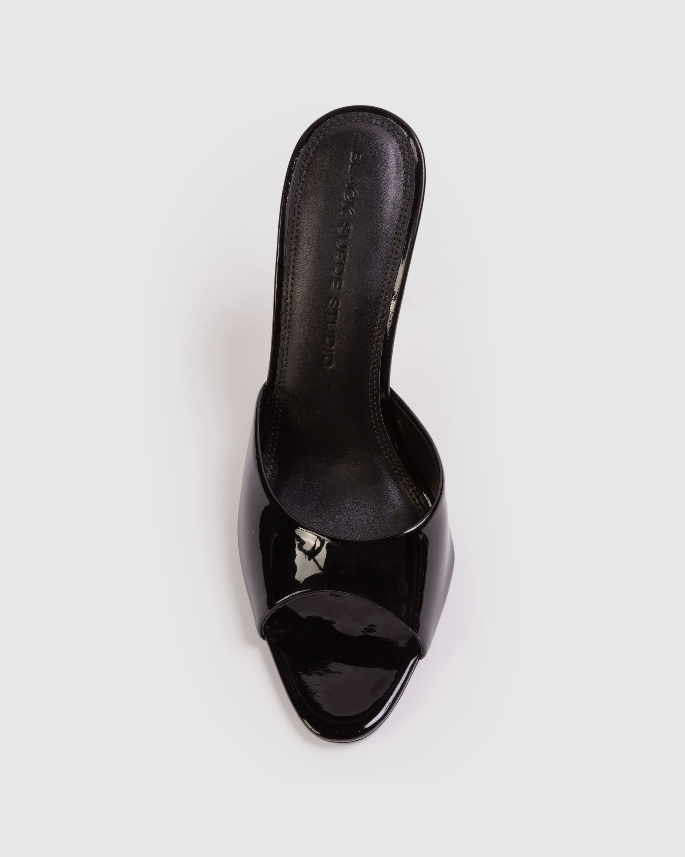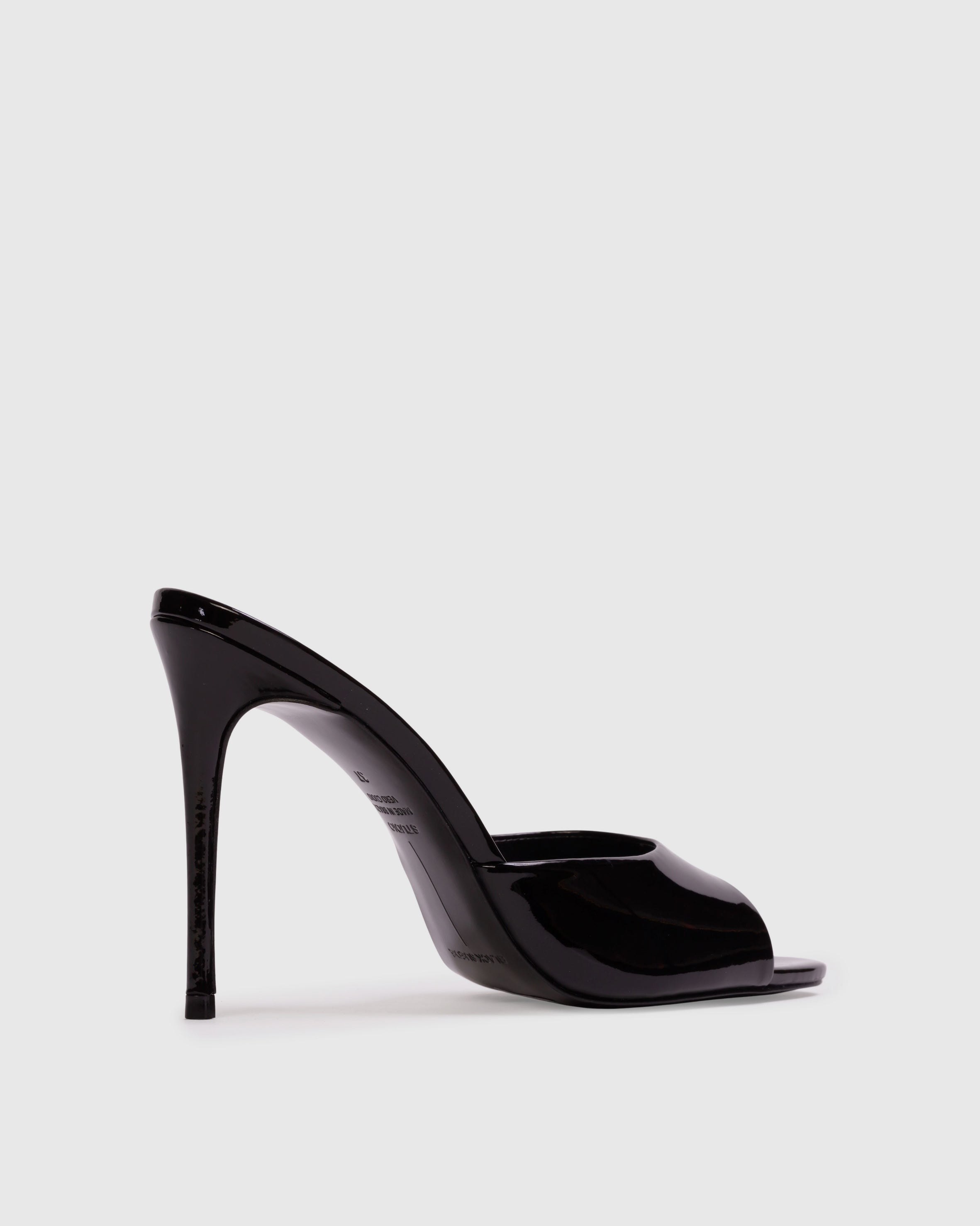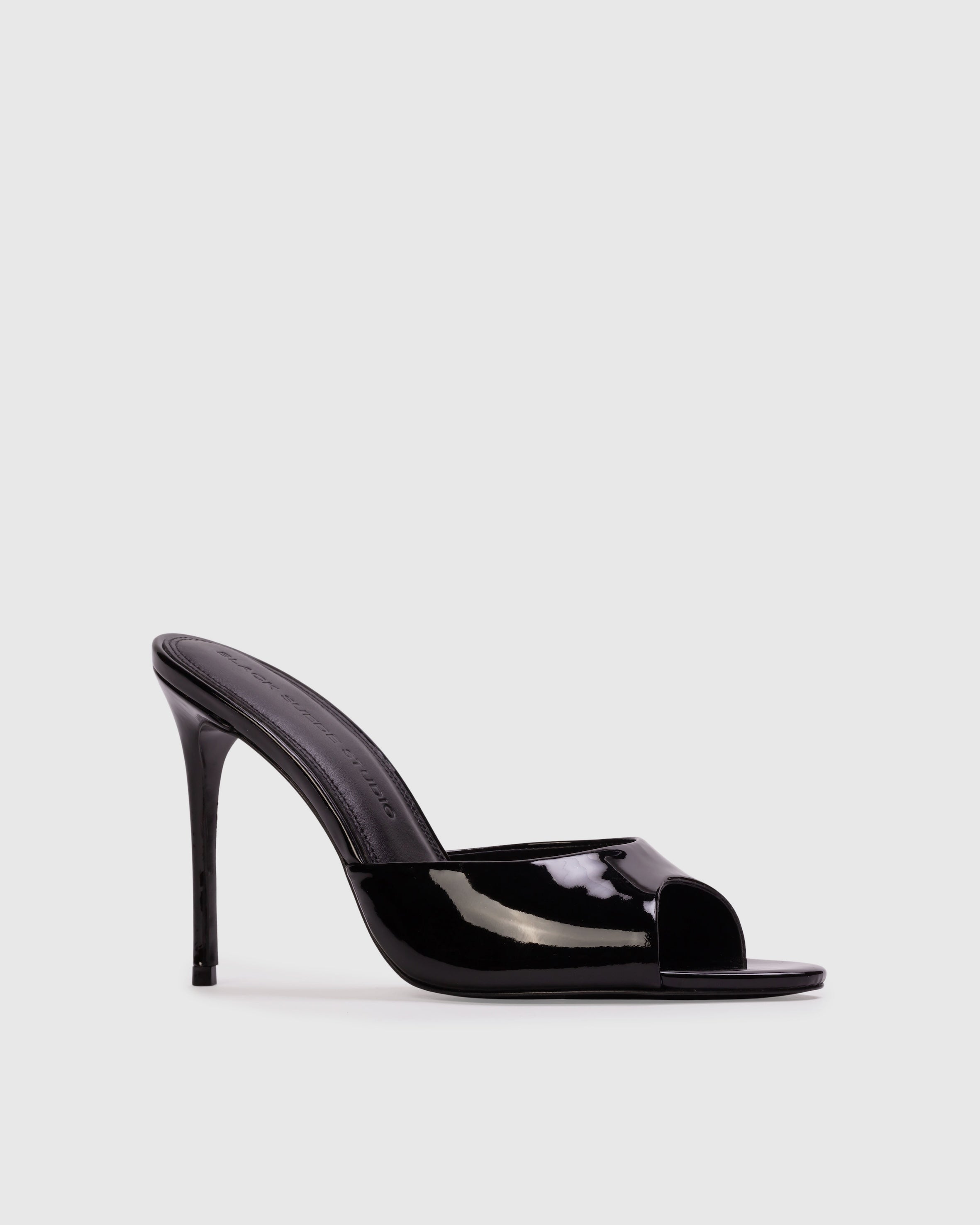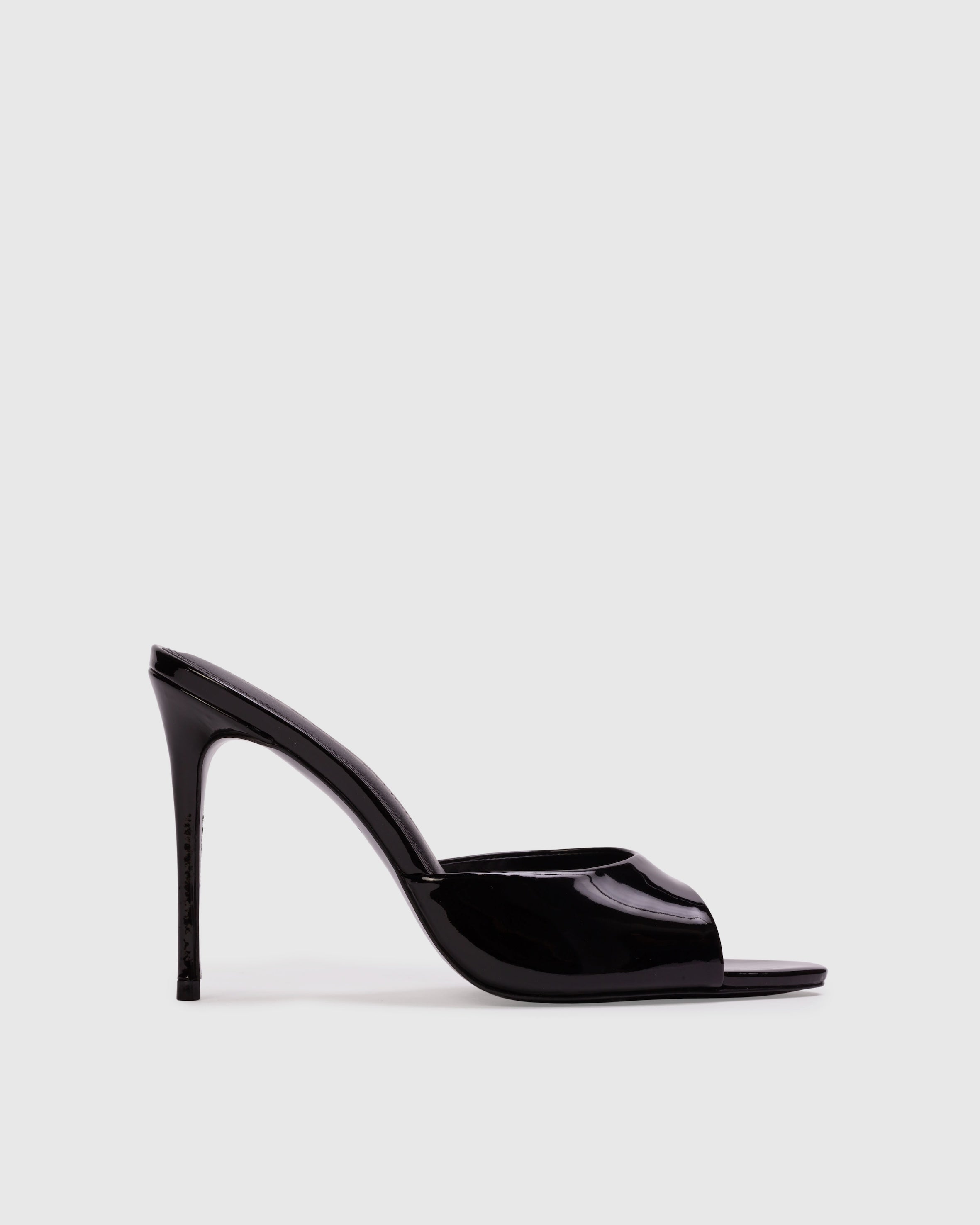 Almond toe classic mule, set on a straight stiletto heel. Made with smooth patent leather.