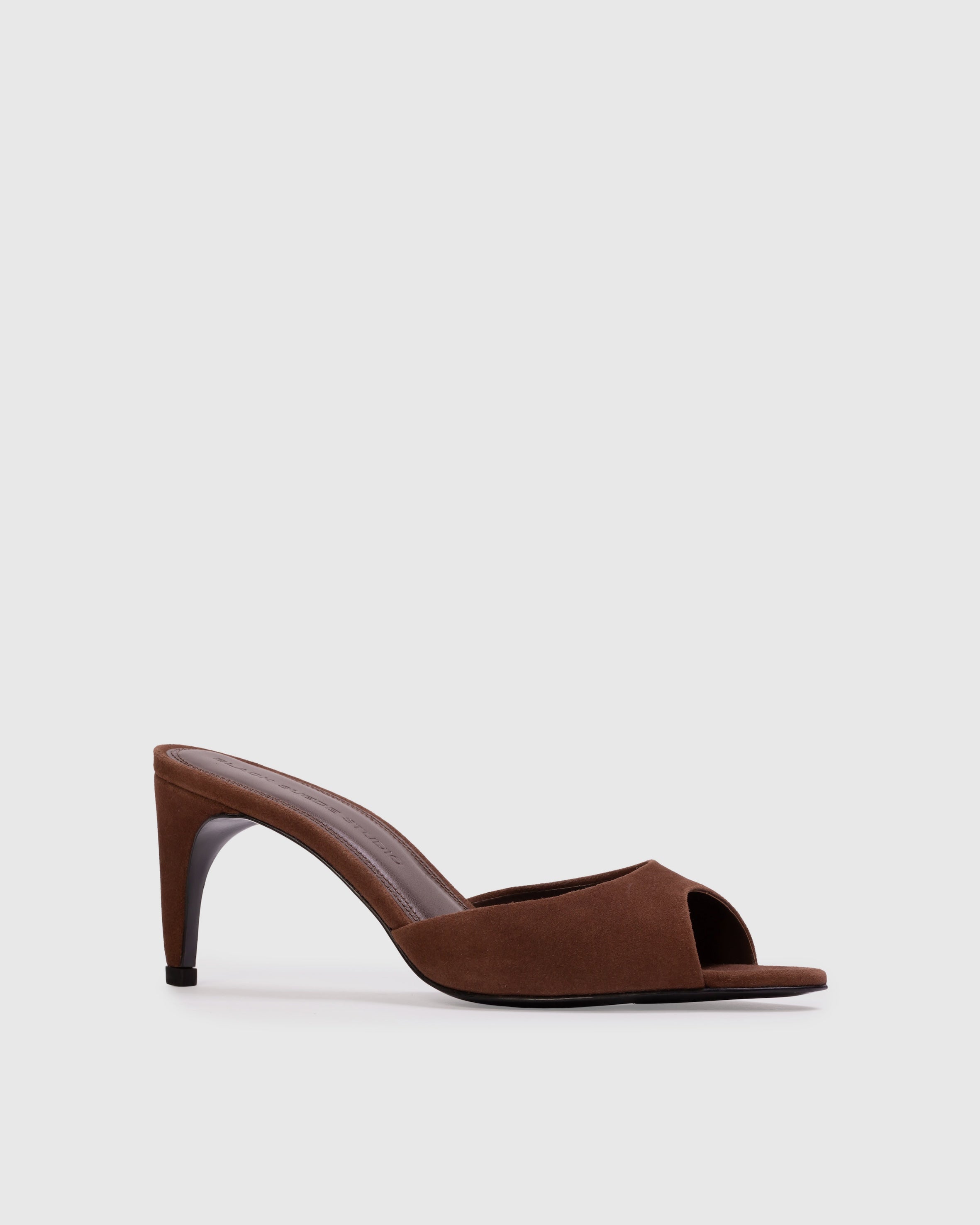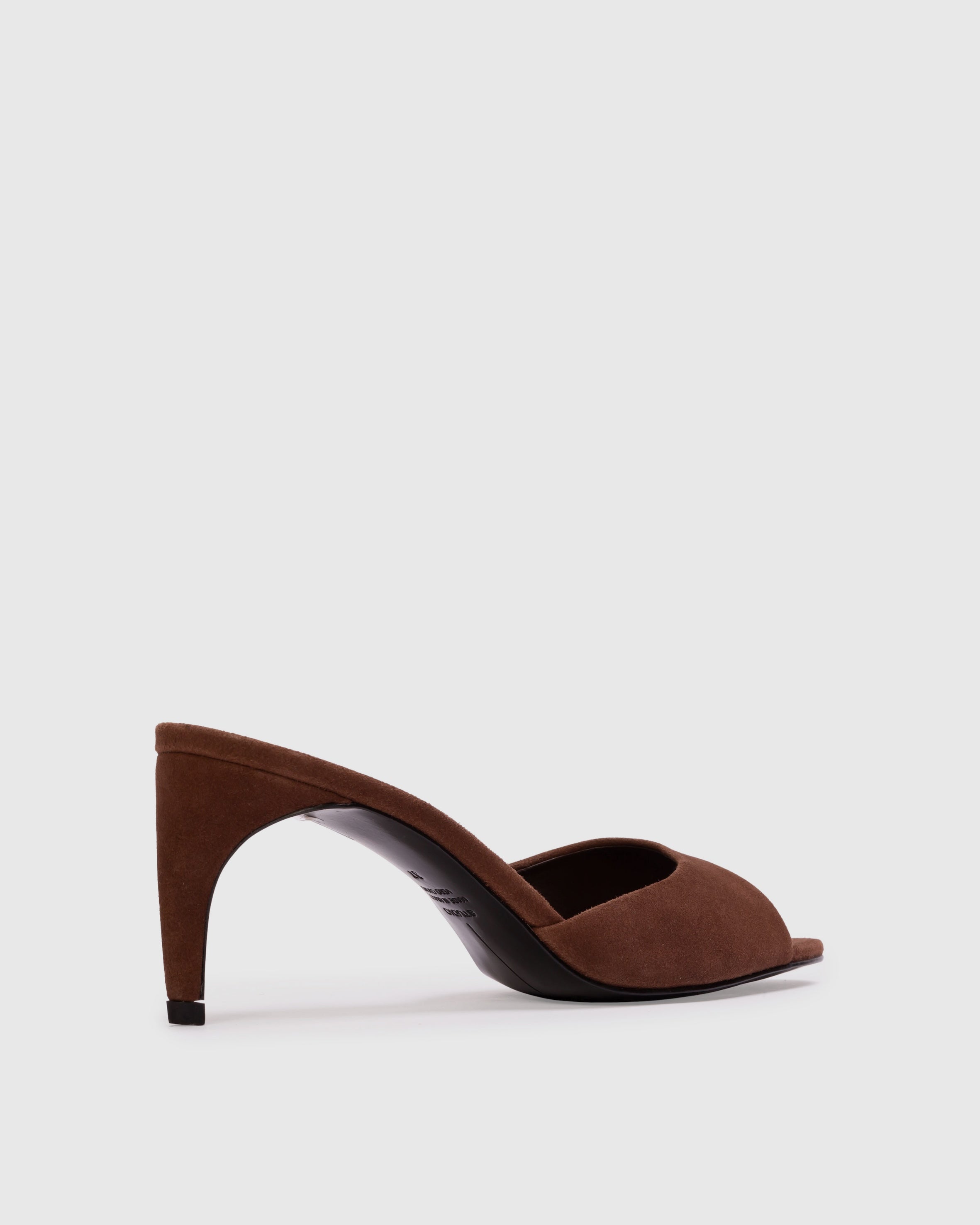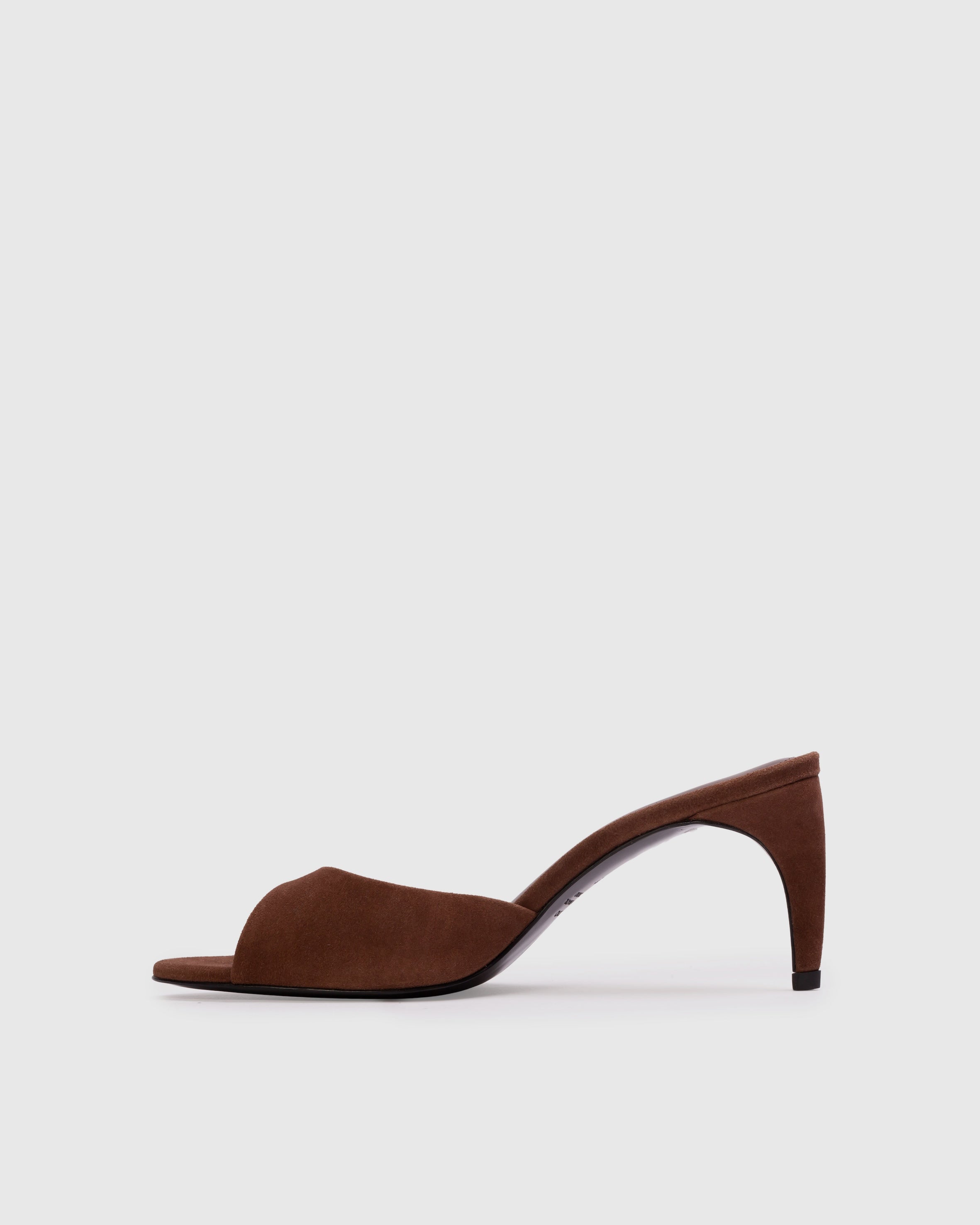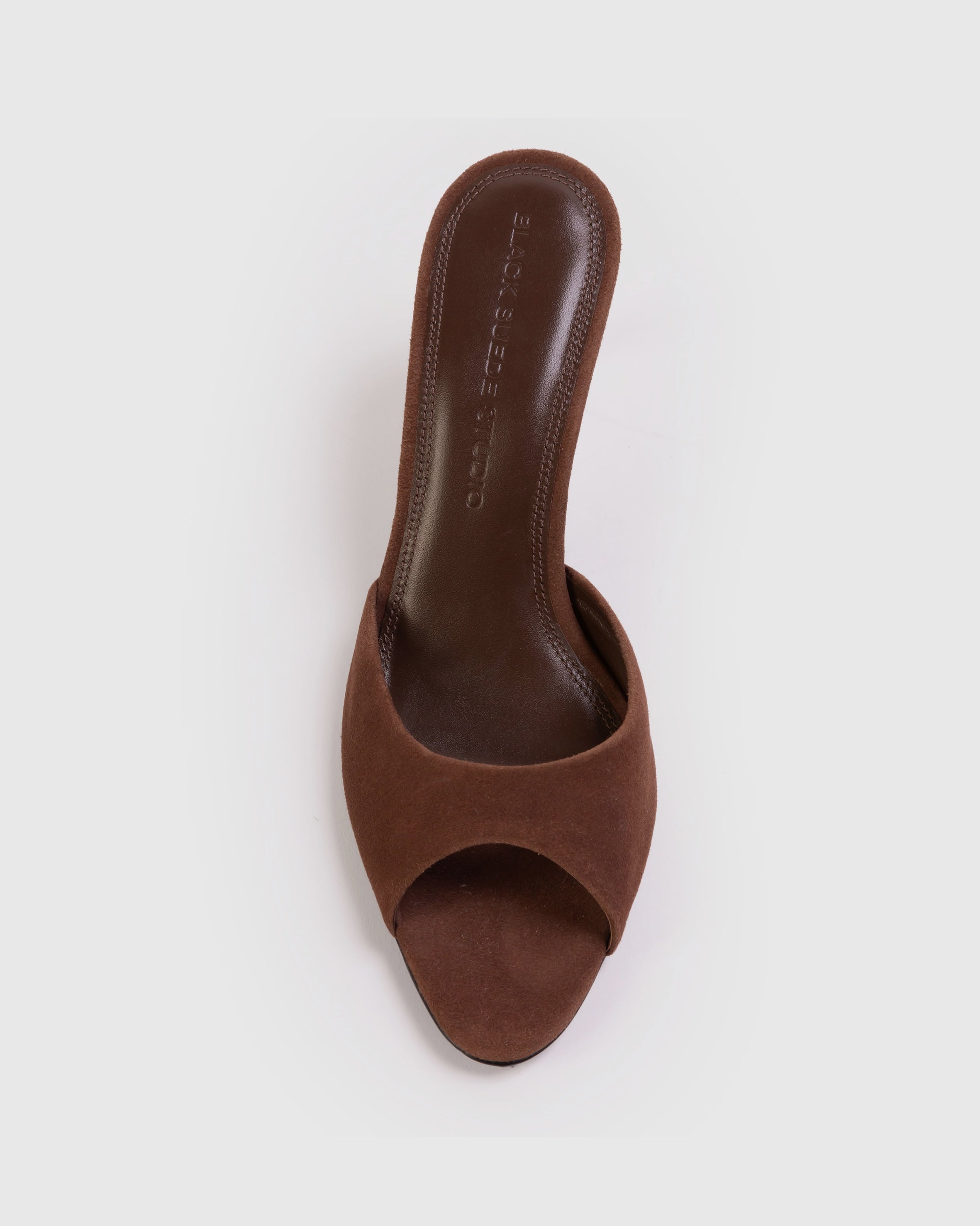 Almond toe classic mule, set on a c-curve mid heel. made with brushed kid suede.