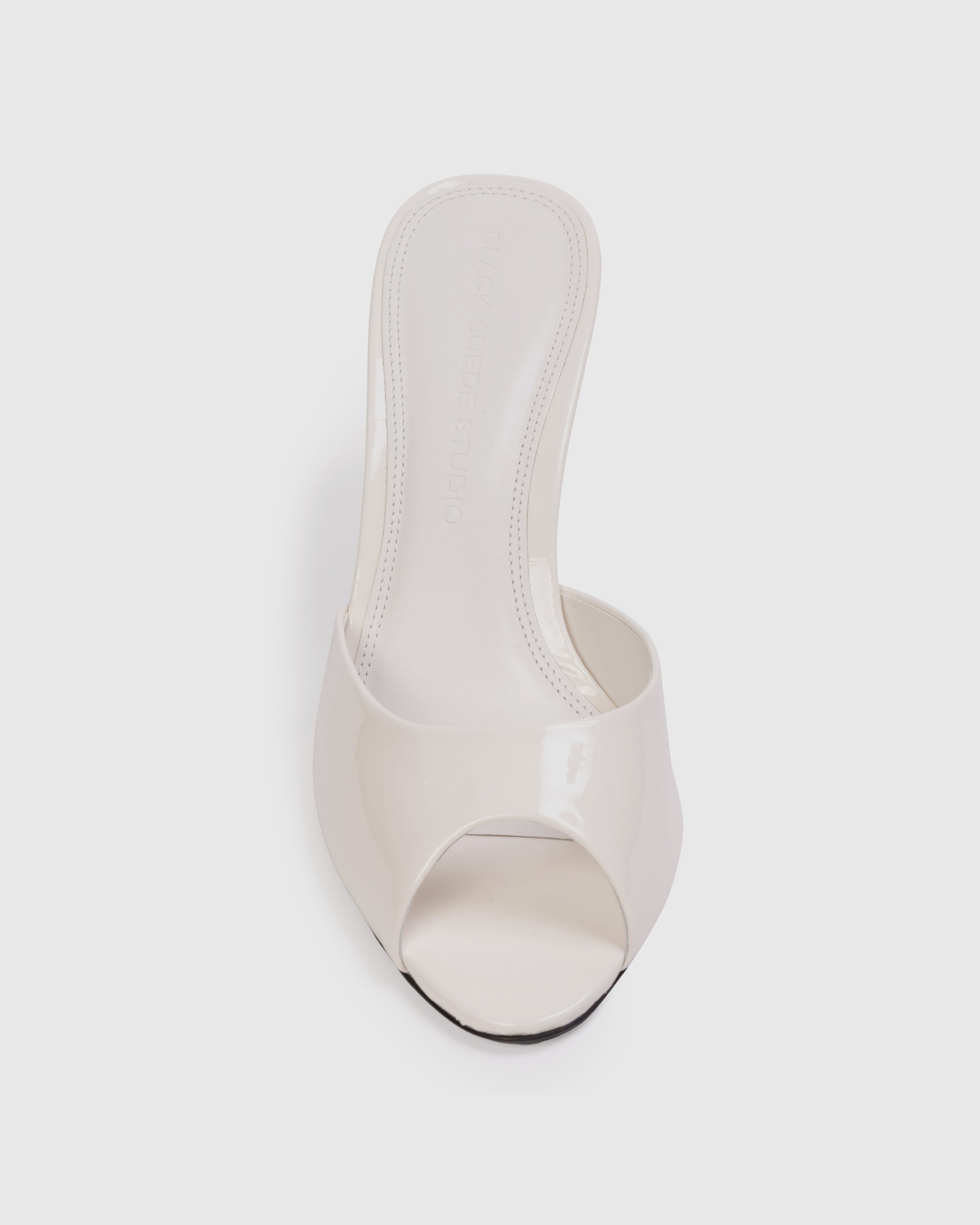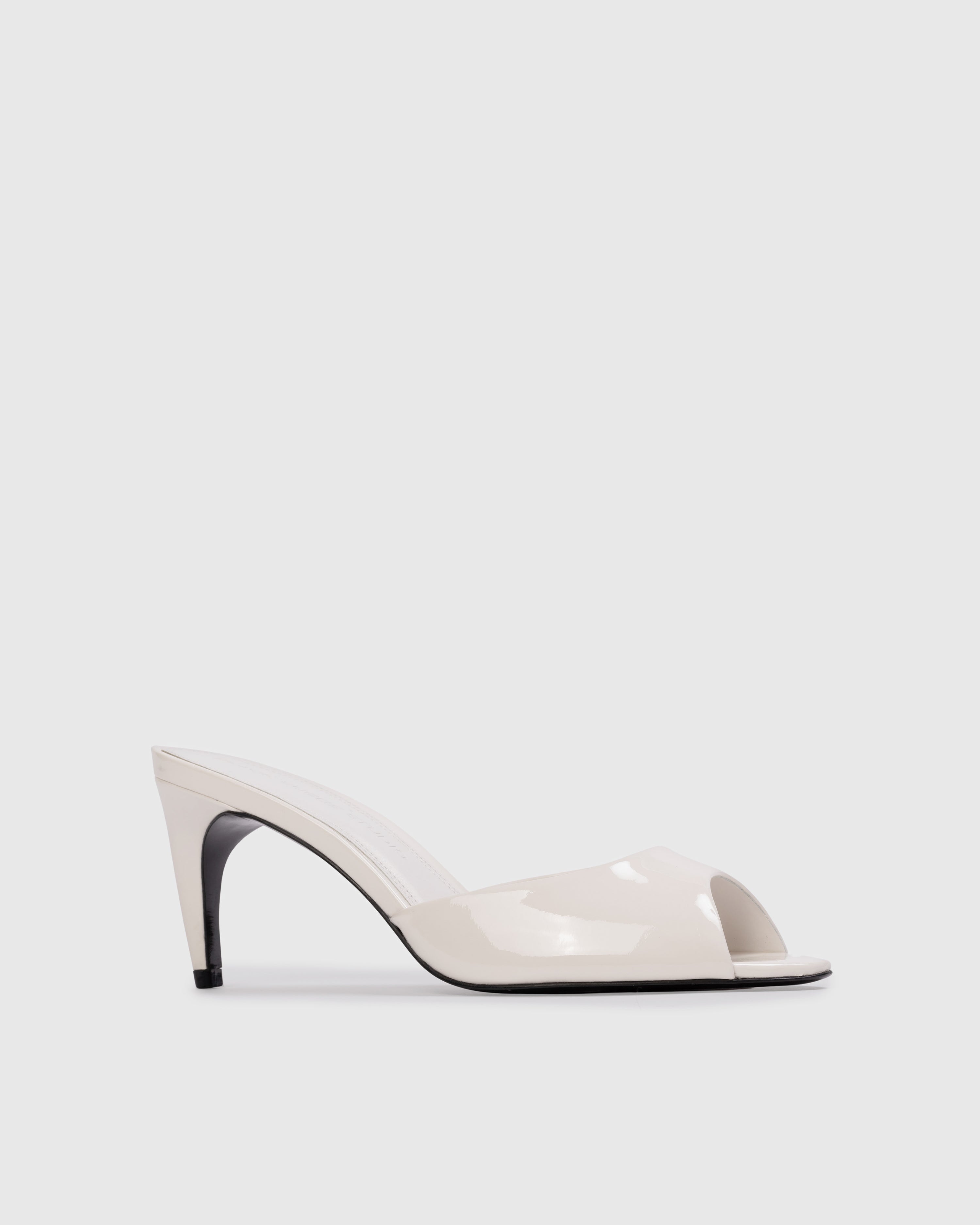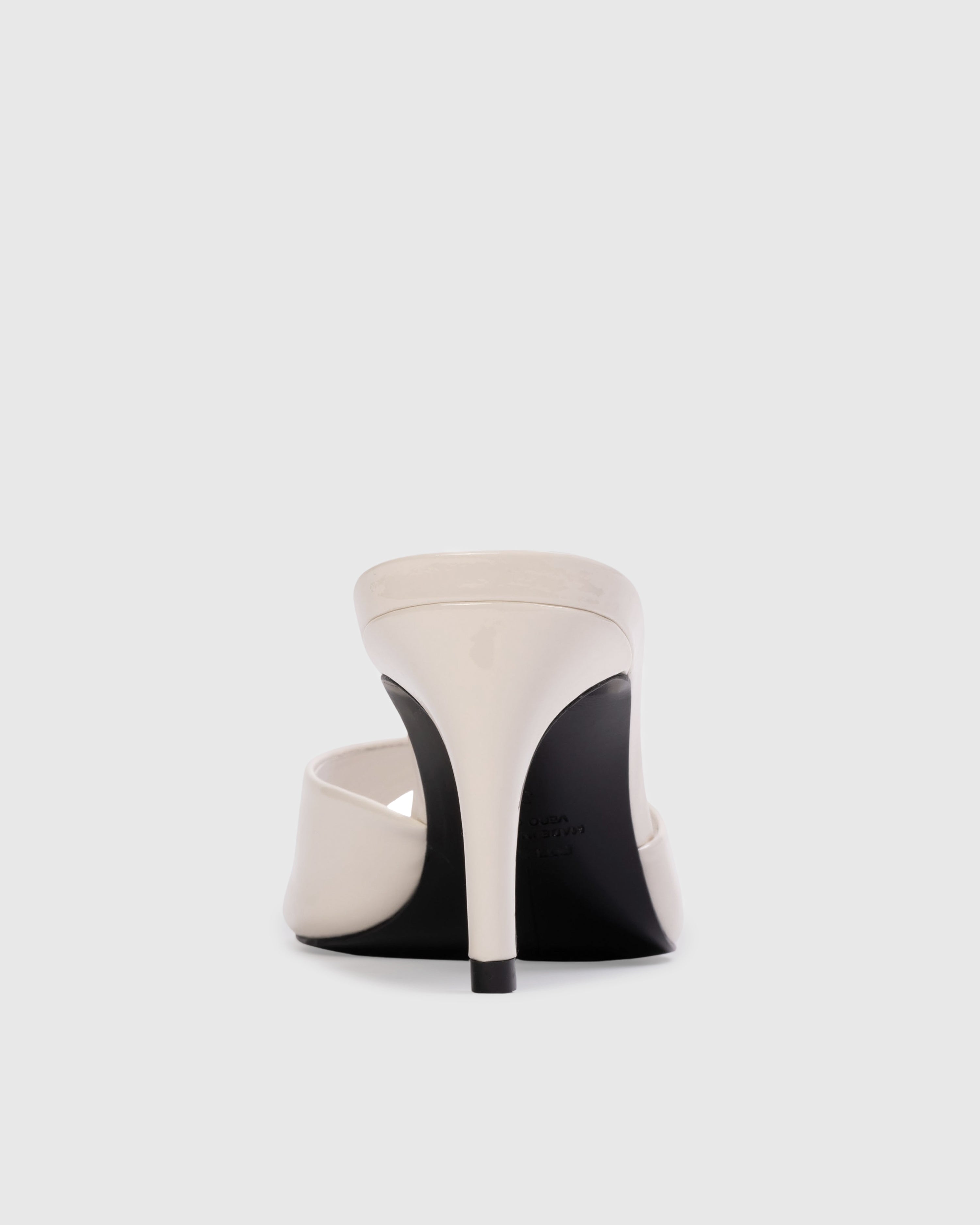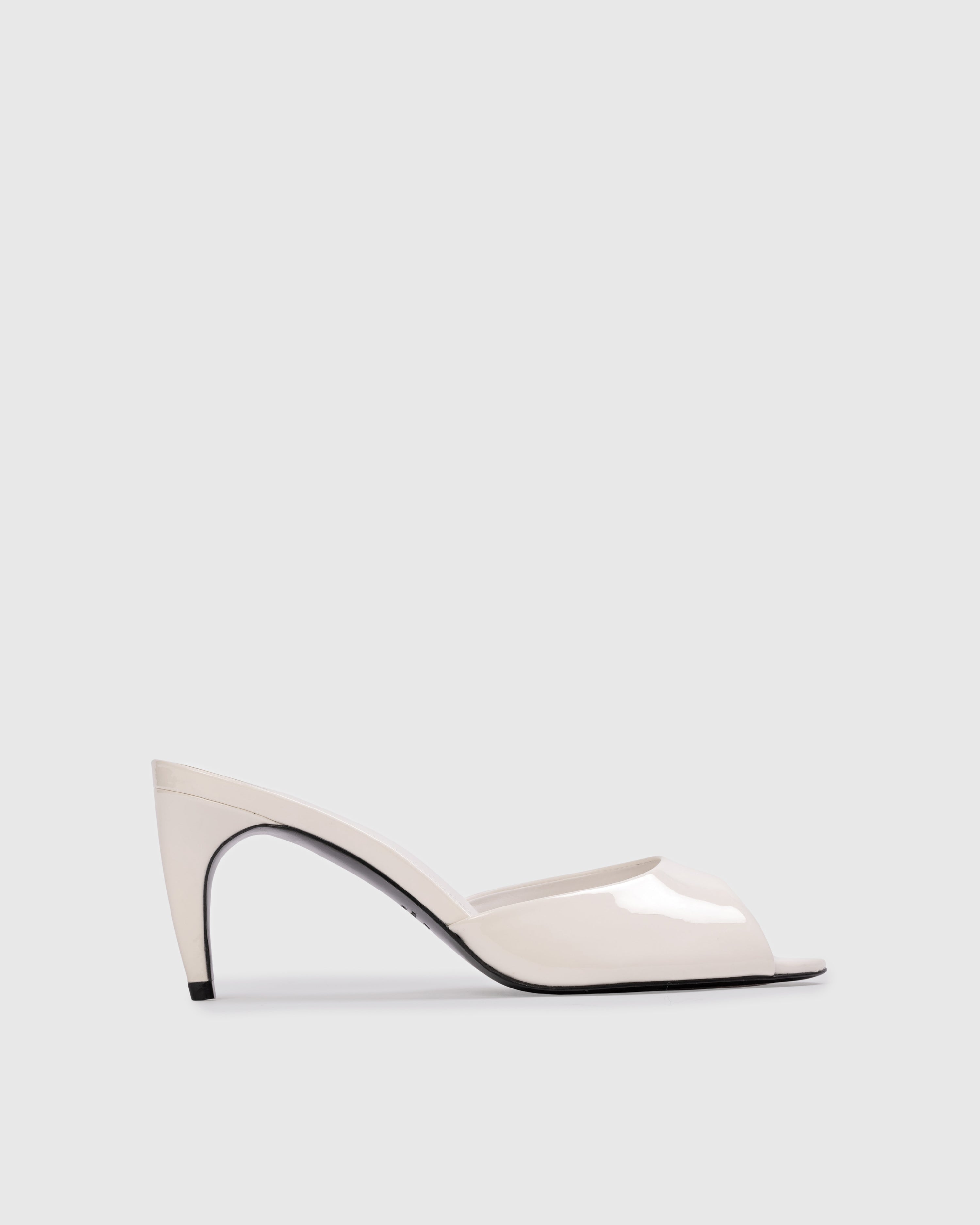 Almond toe classic mule, set on a c-curve mid heel. made with smooth patent leather.