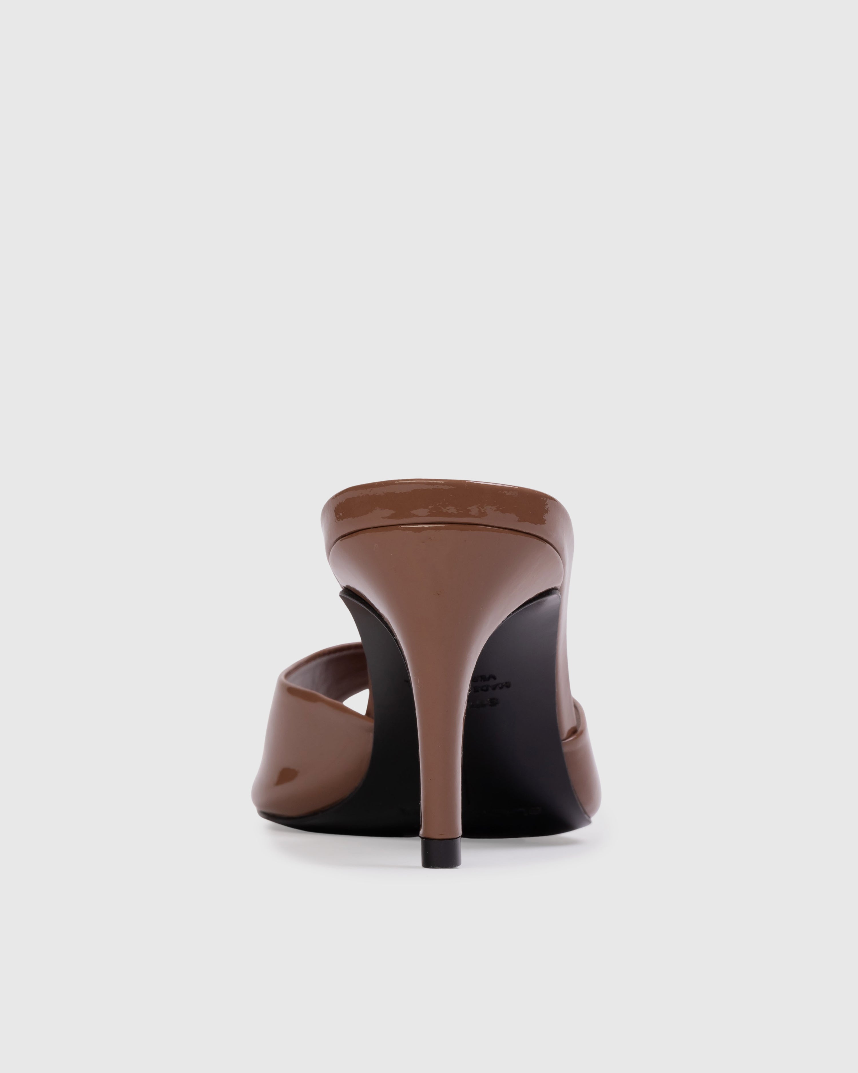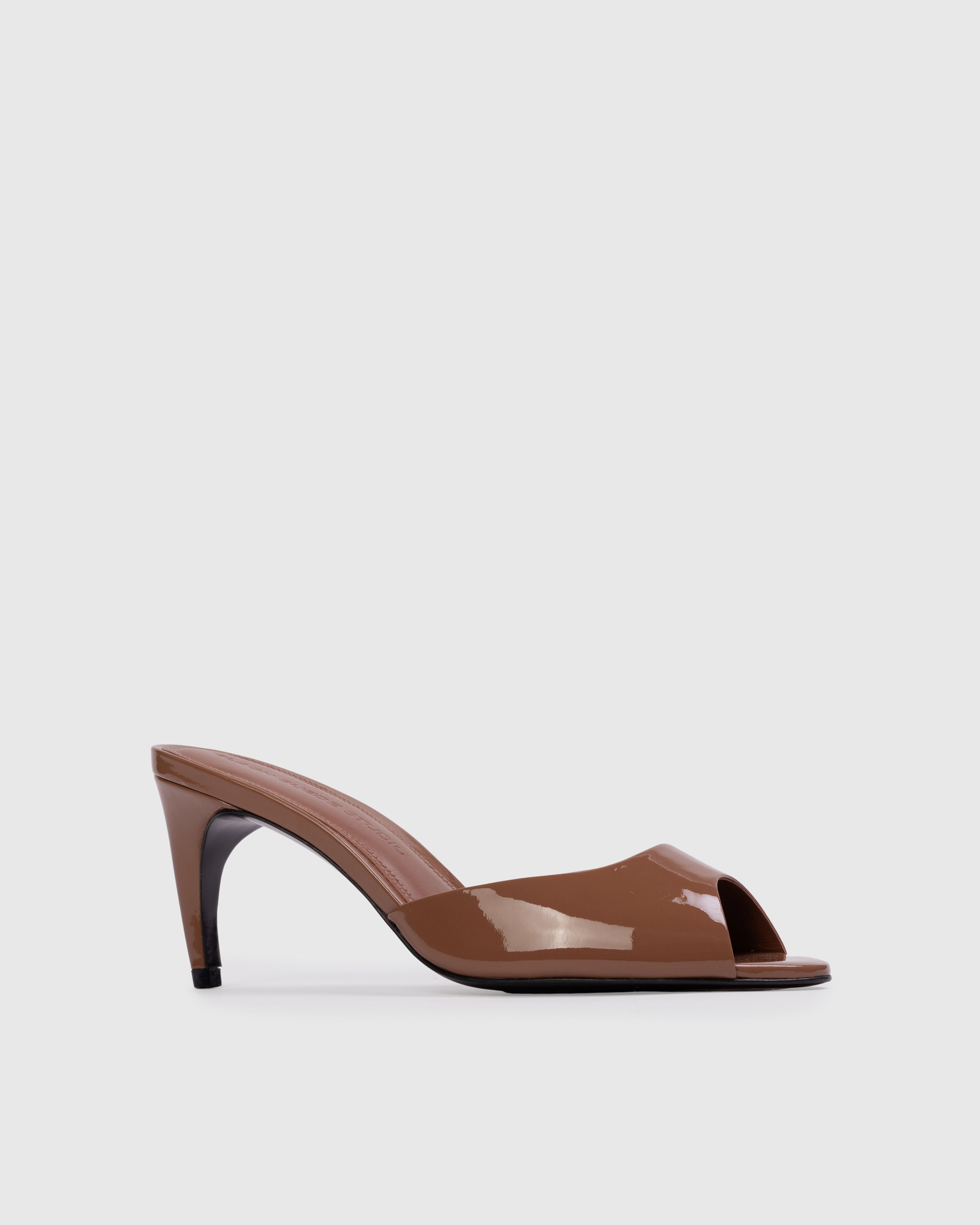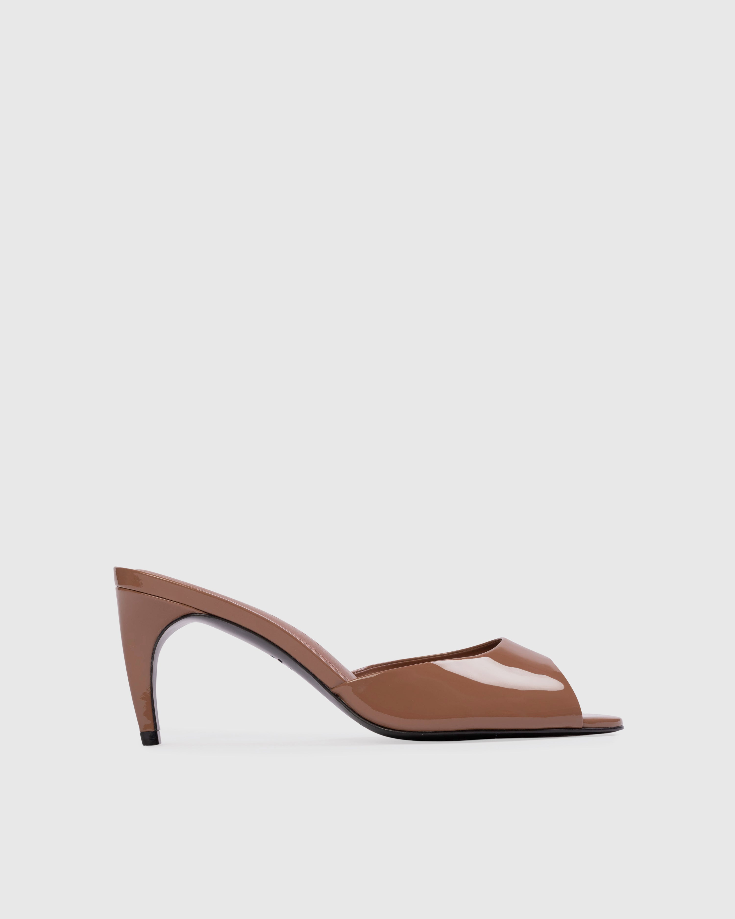 Almond toe classic mule, set on a c-curve mid heel. made with smooth patent leather.