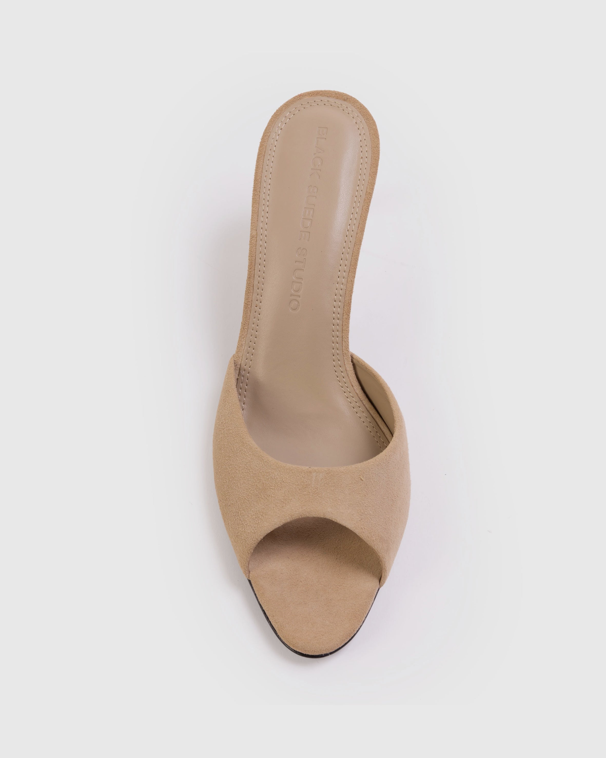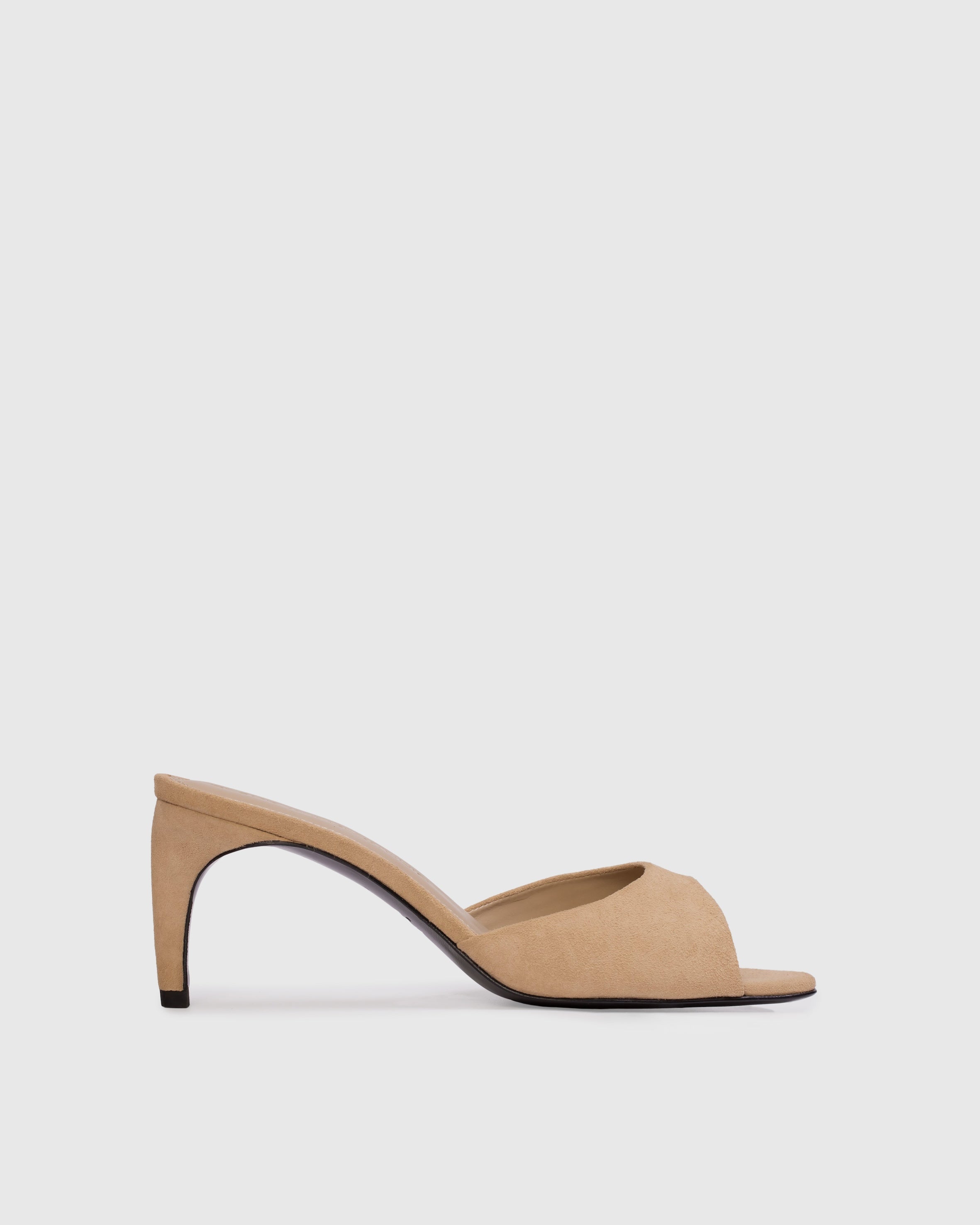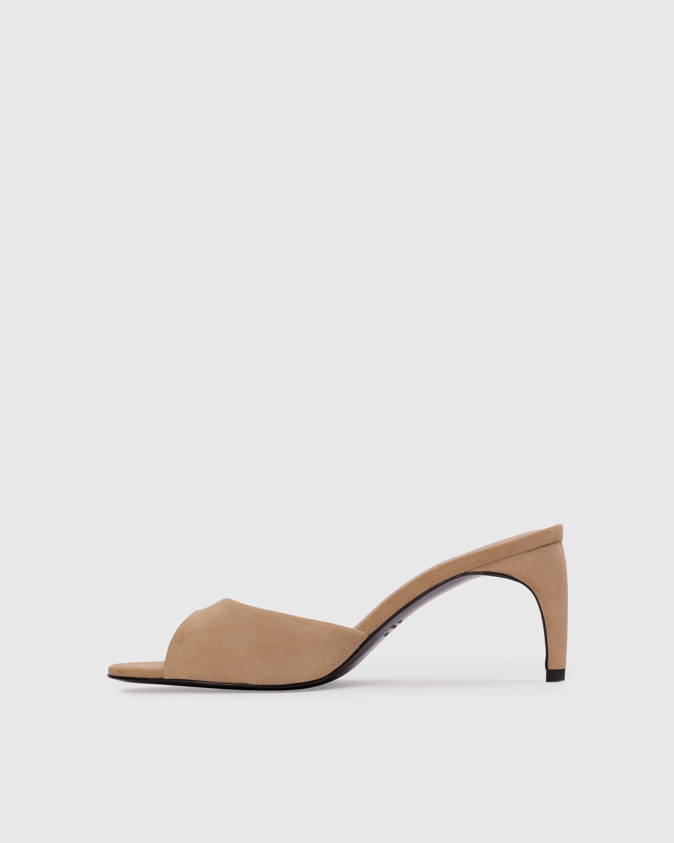 Almond toe classic mule, set on a c-curve mid heel. made with brushed kid suede.