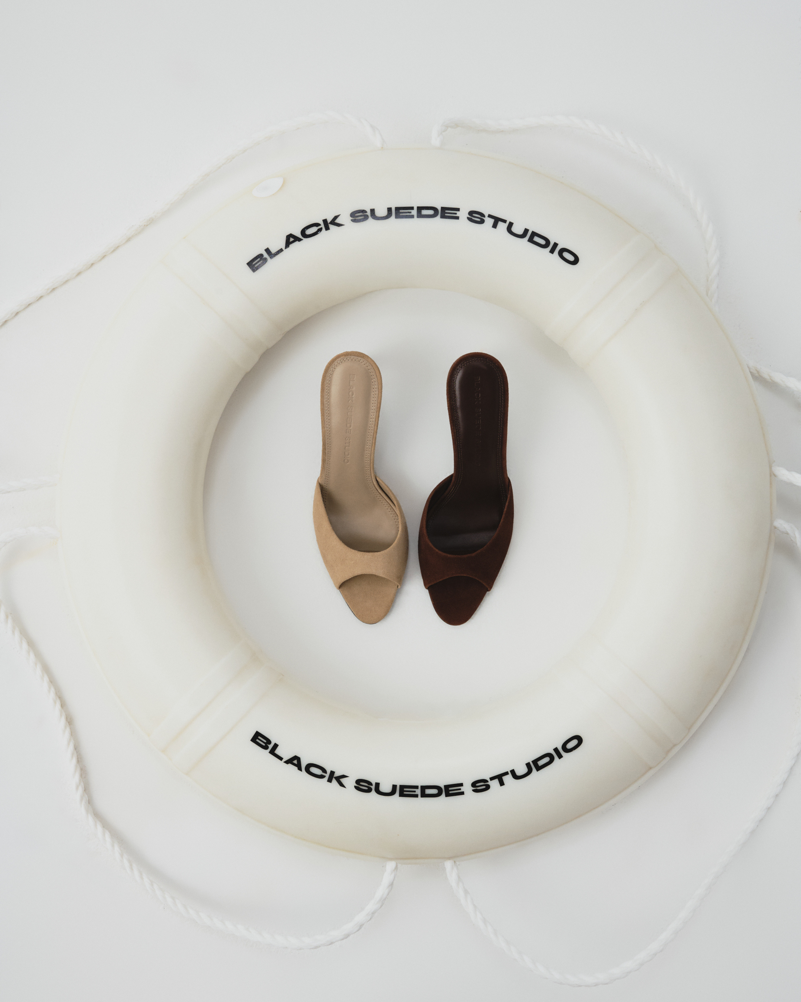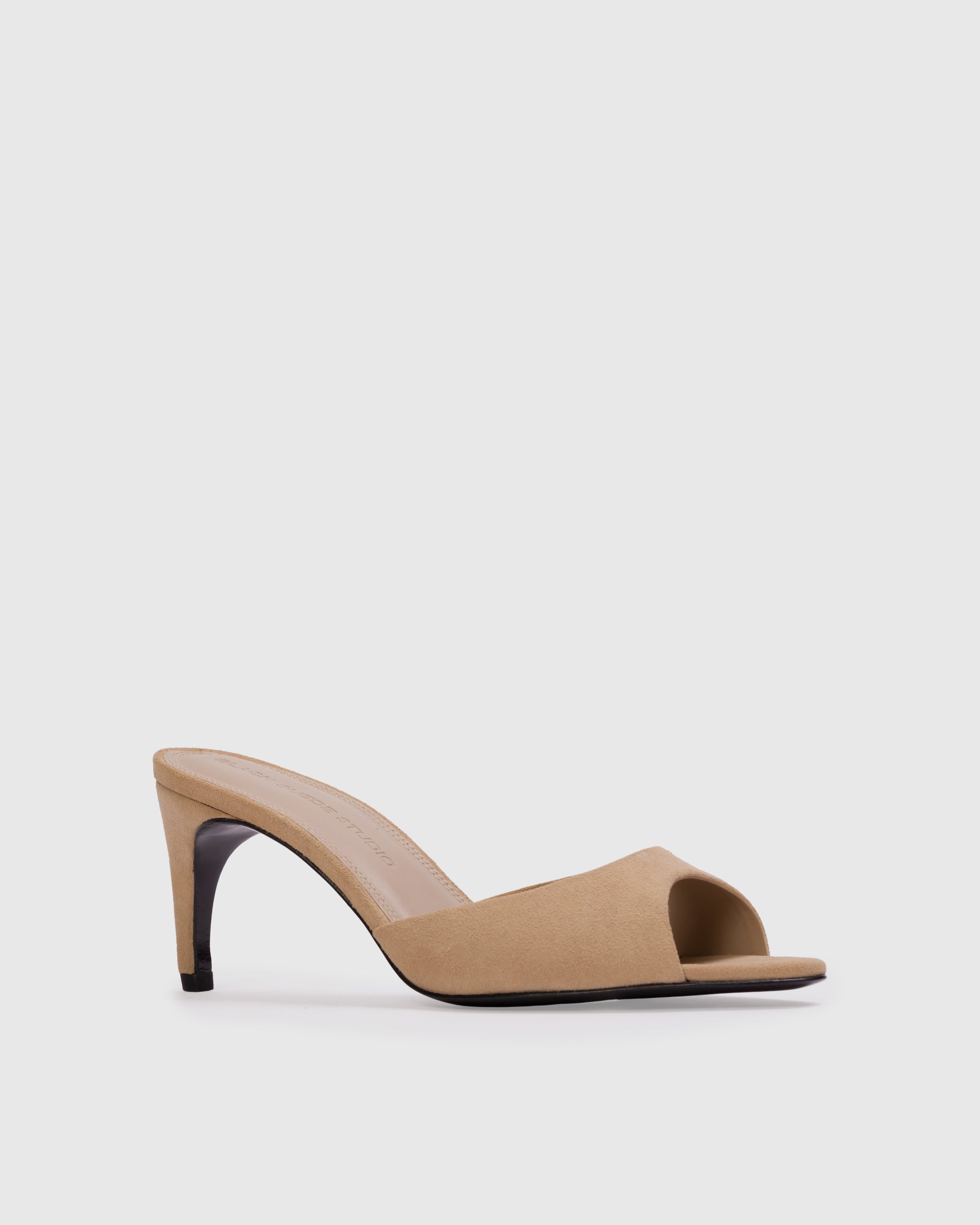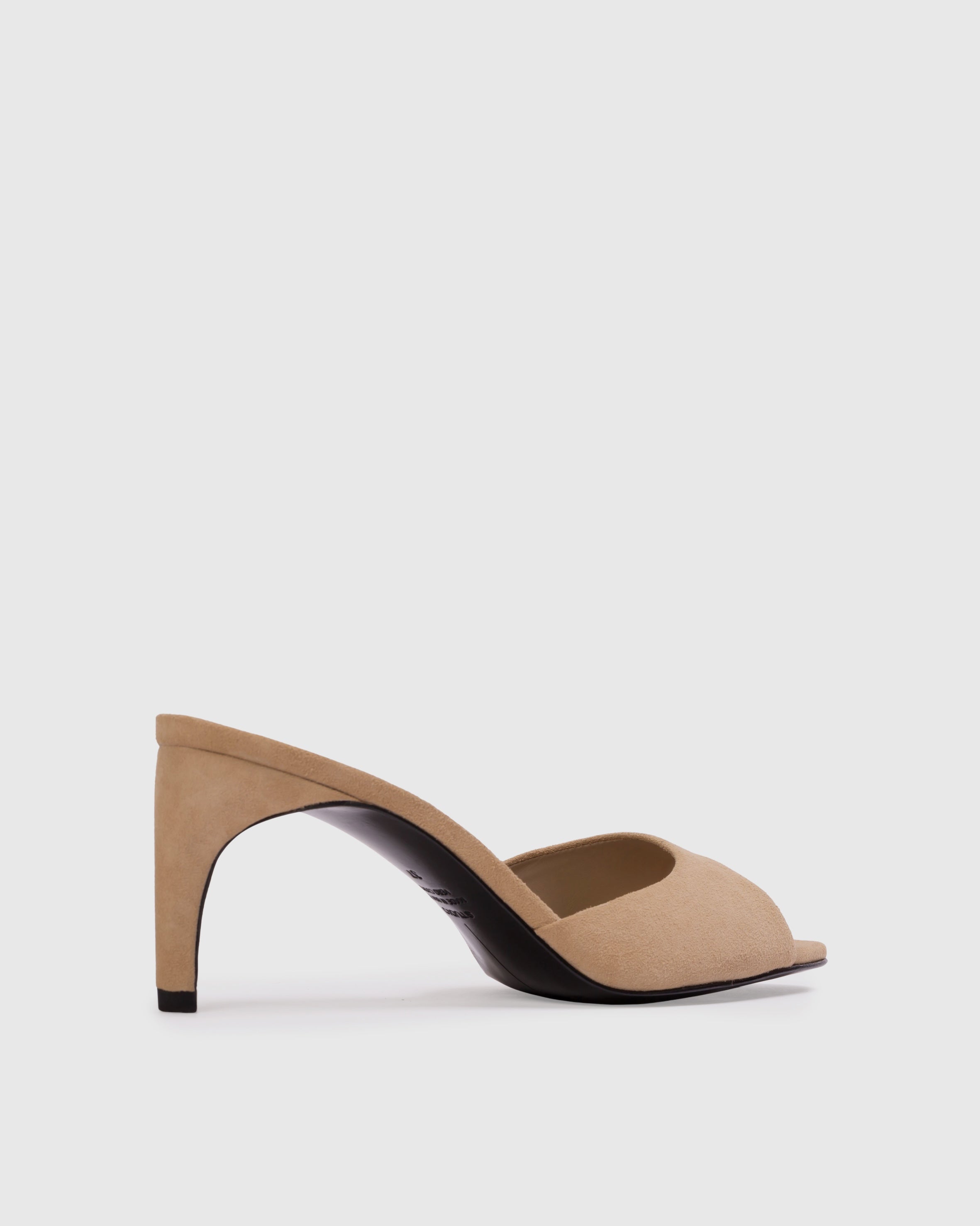 Almond toe classic mule, set on a c-curve mid heel. made with brushed kid suede.