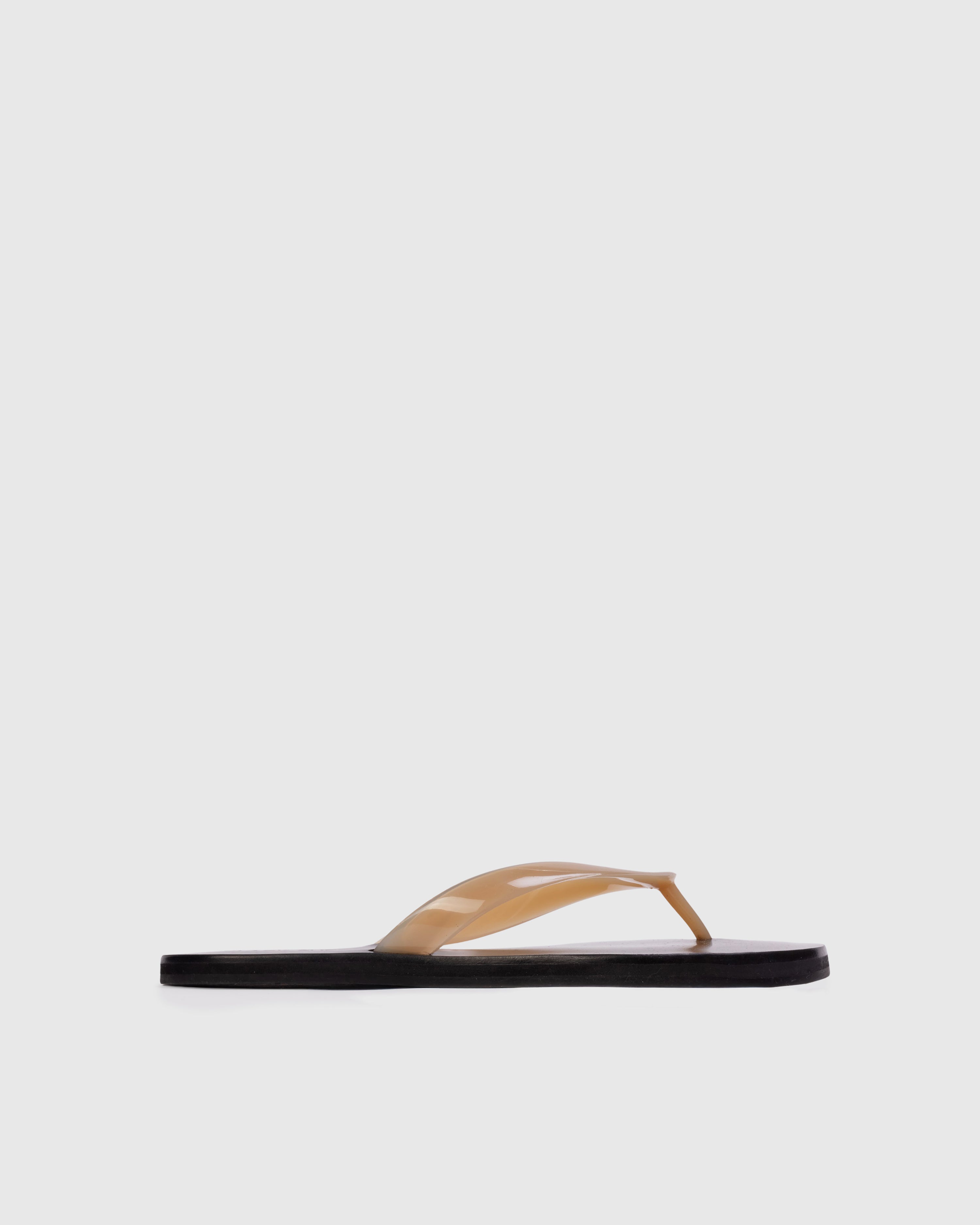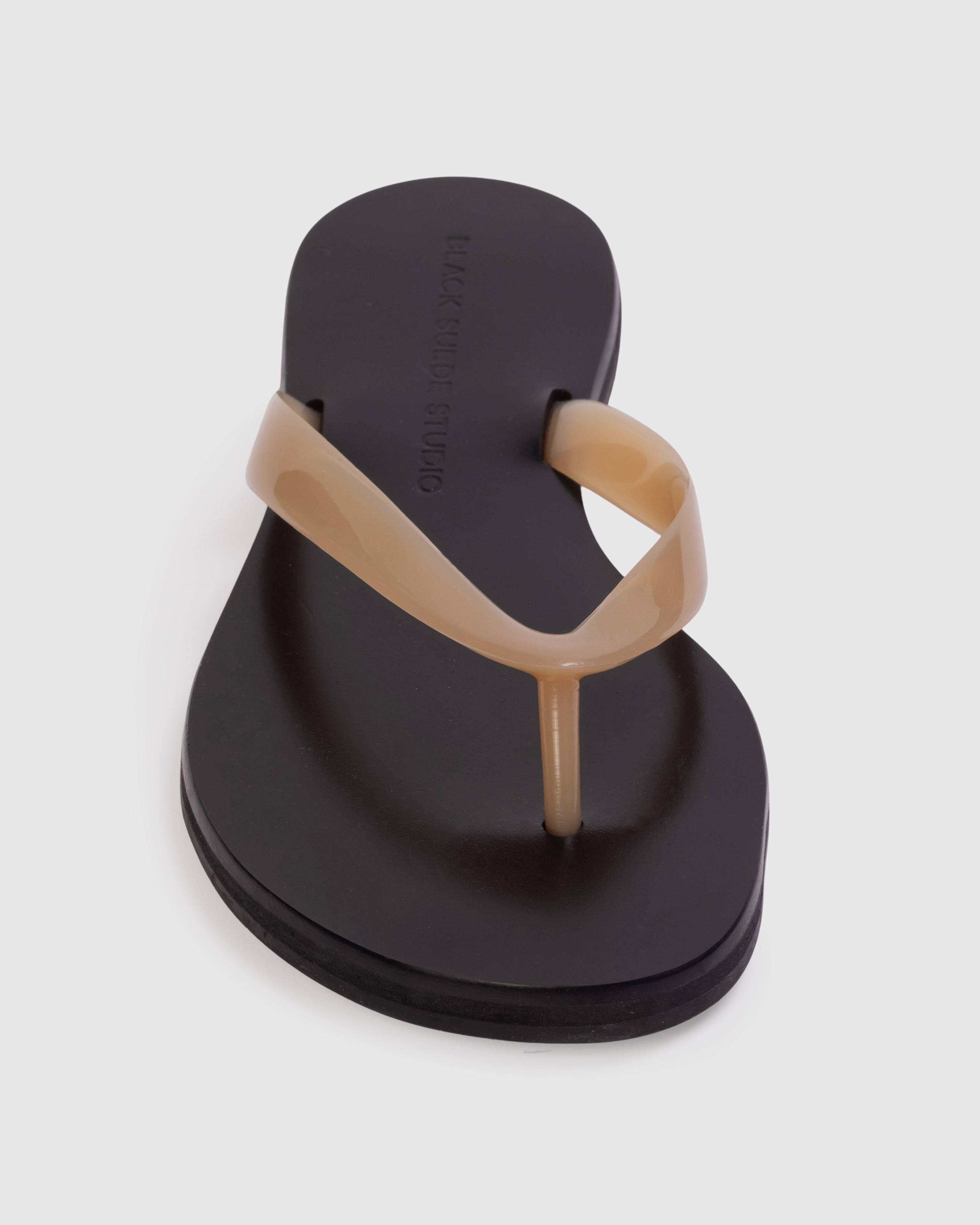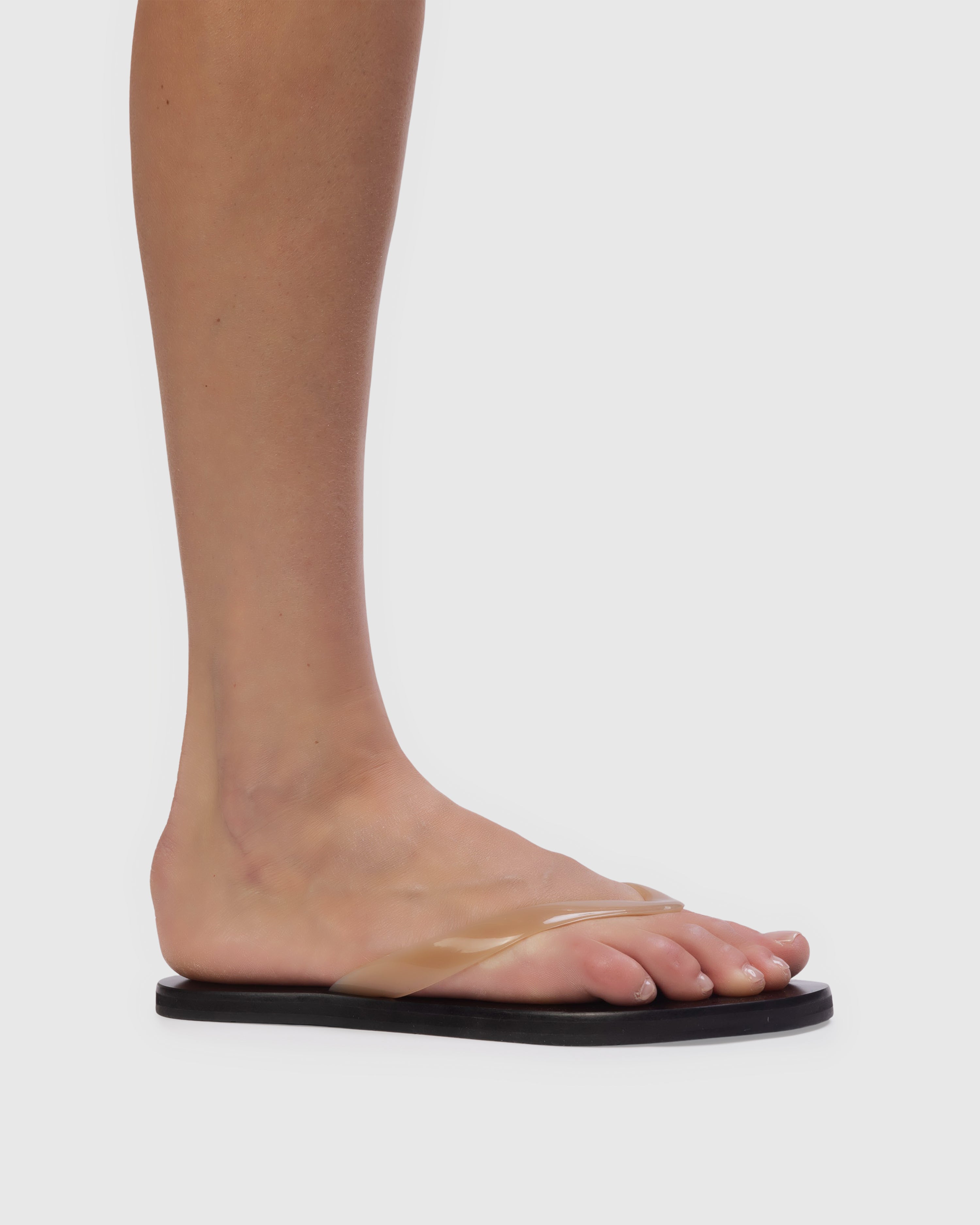 round toe jeli pvc thong flip flops, set on a leather sole.
