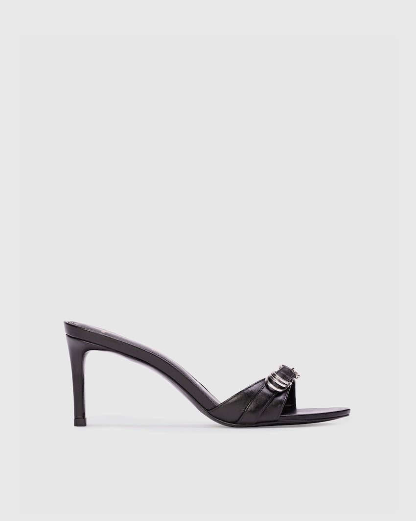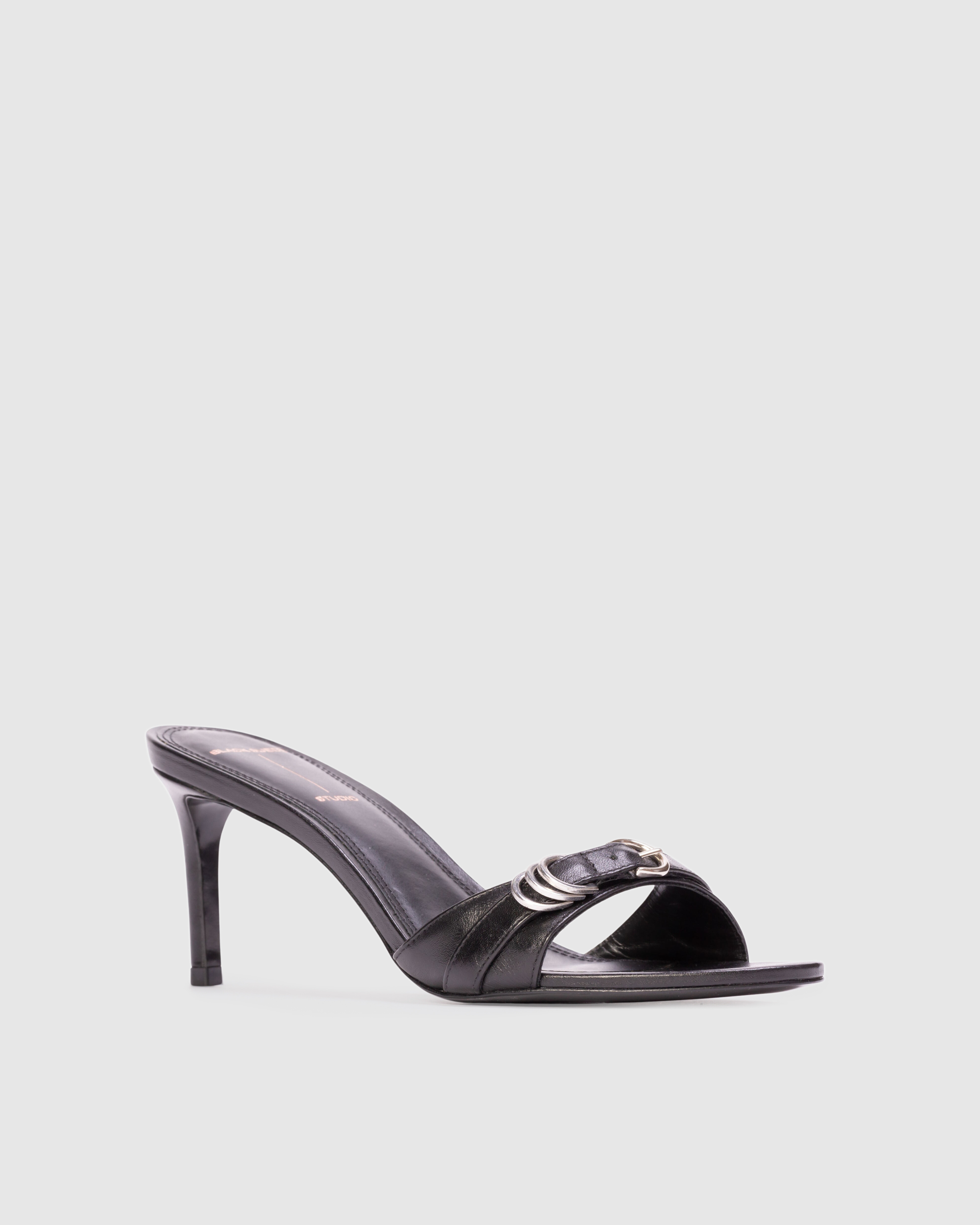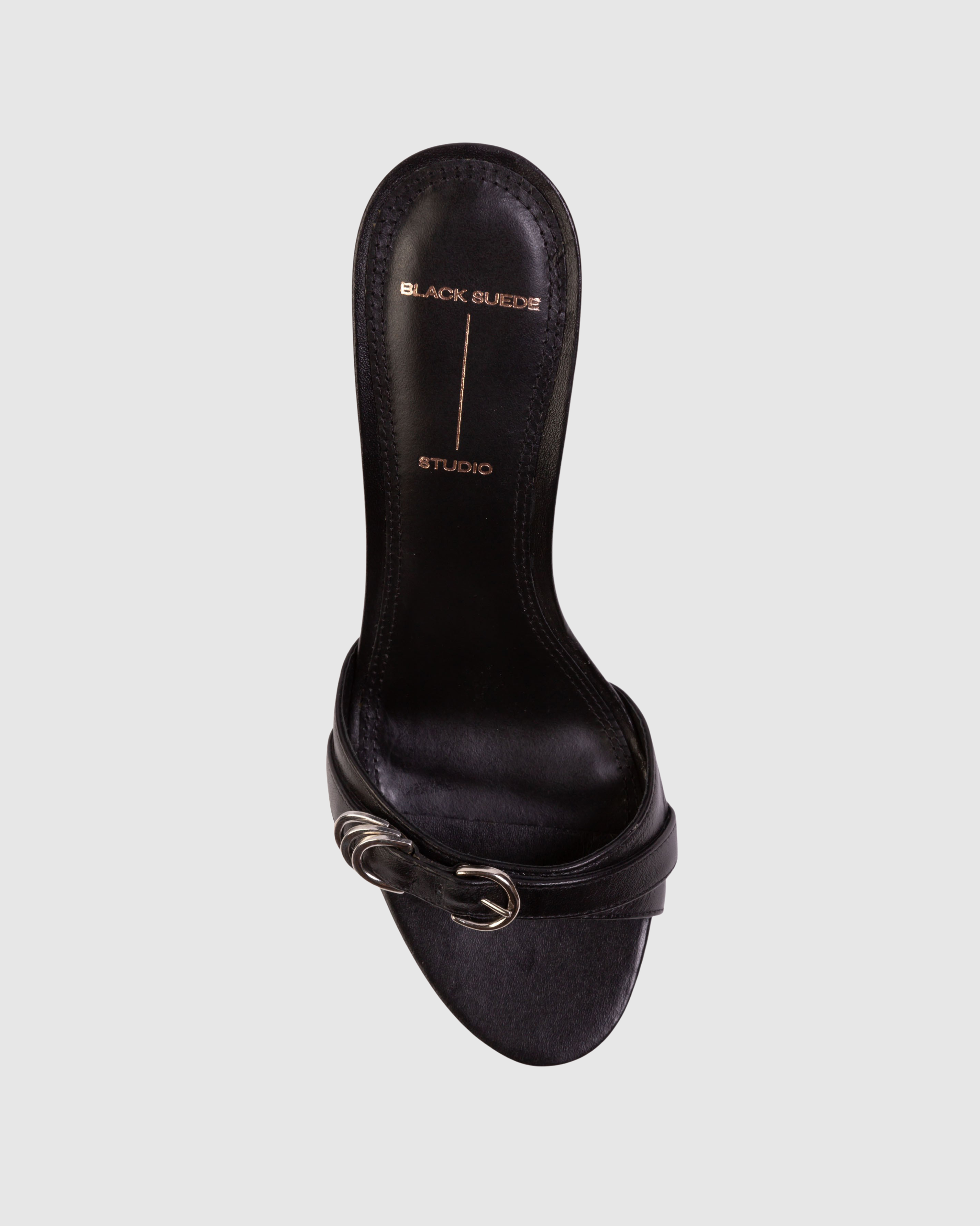 Round toe slipper mule with multi d-ring buckle detail, set on a straight mid heel. Made with smooth buffed leather.