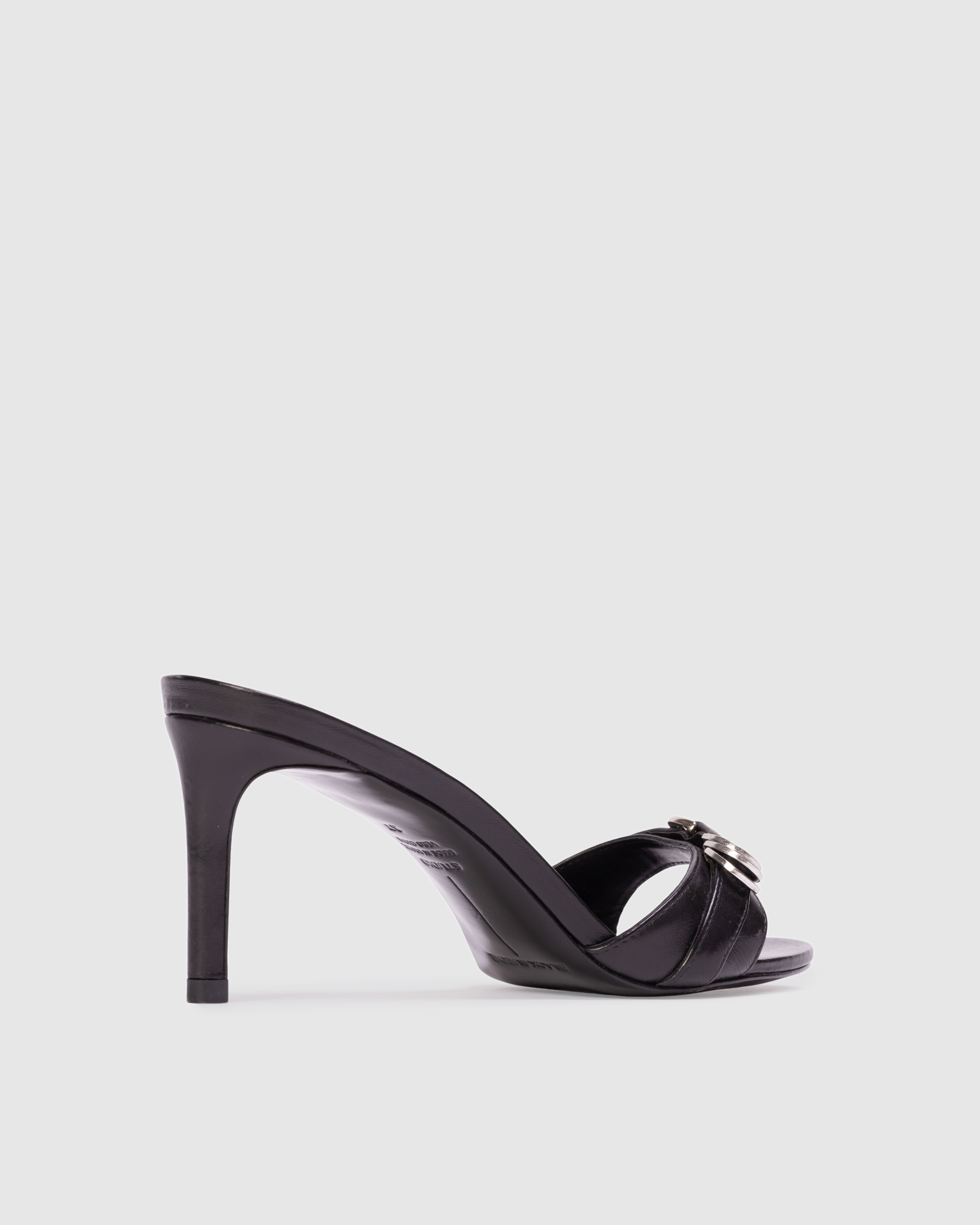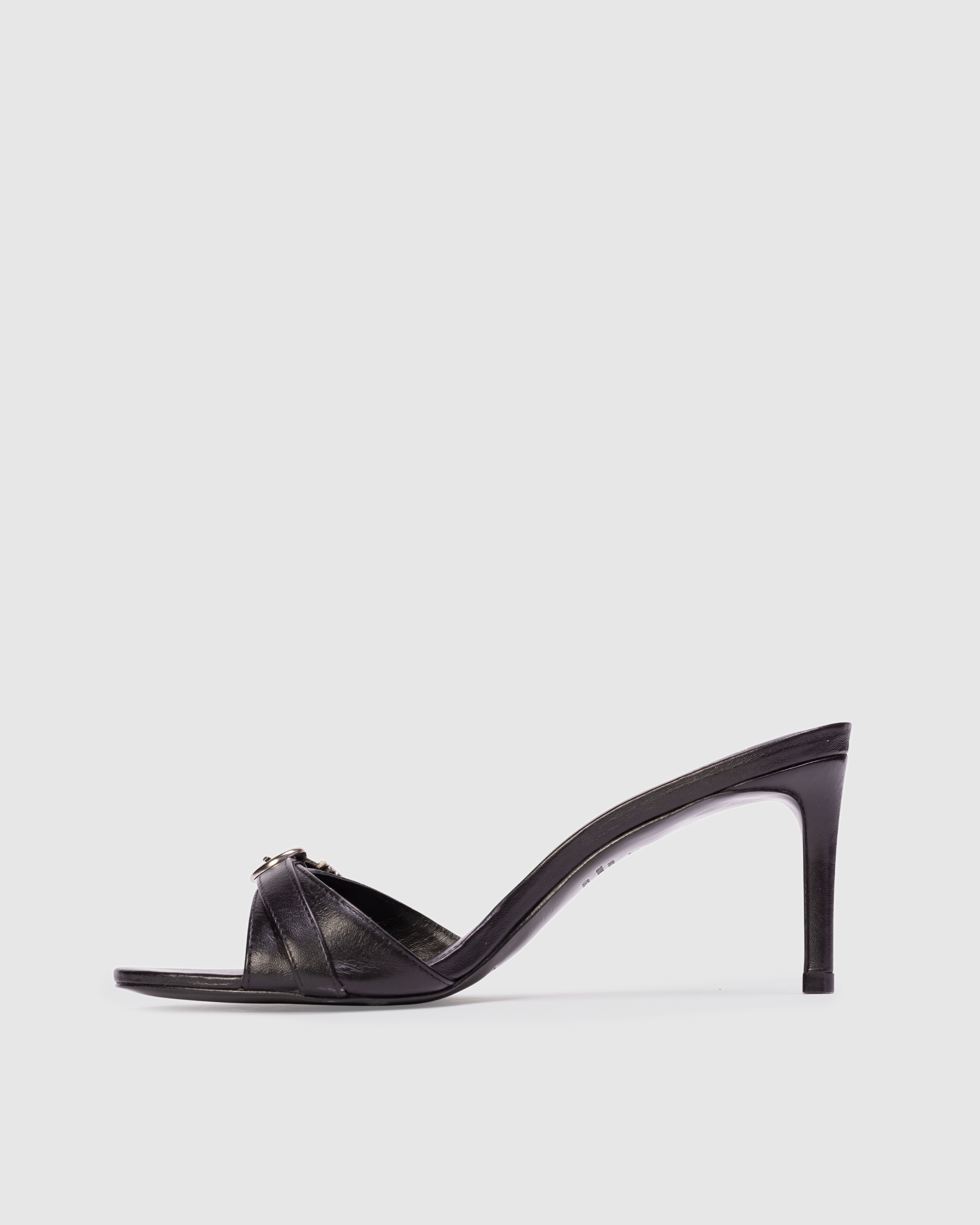 Round toe slipper mule, set on a straight mid heel. made with smooth buffed leather.