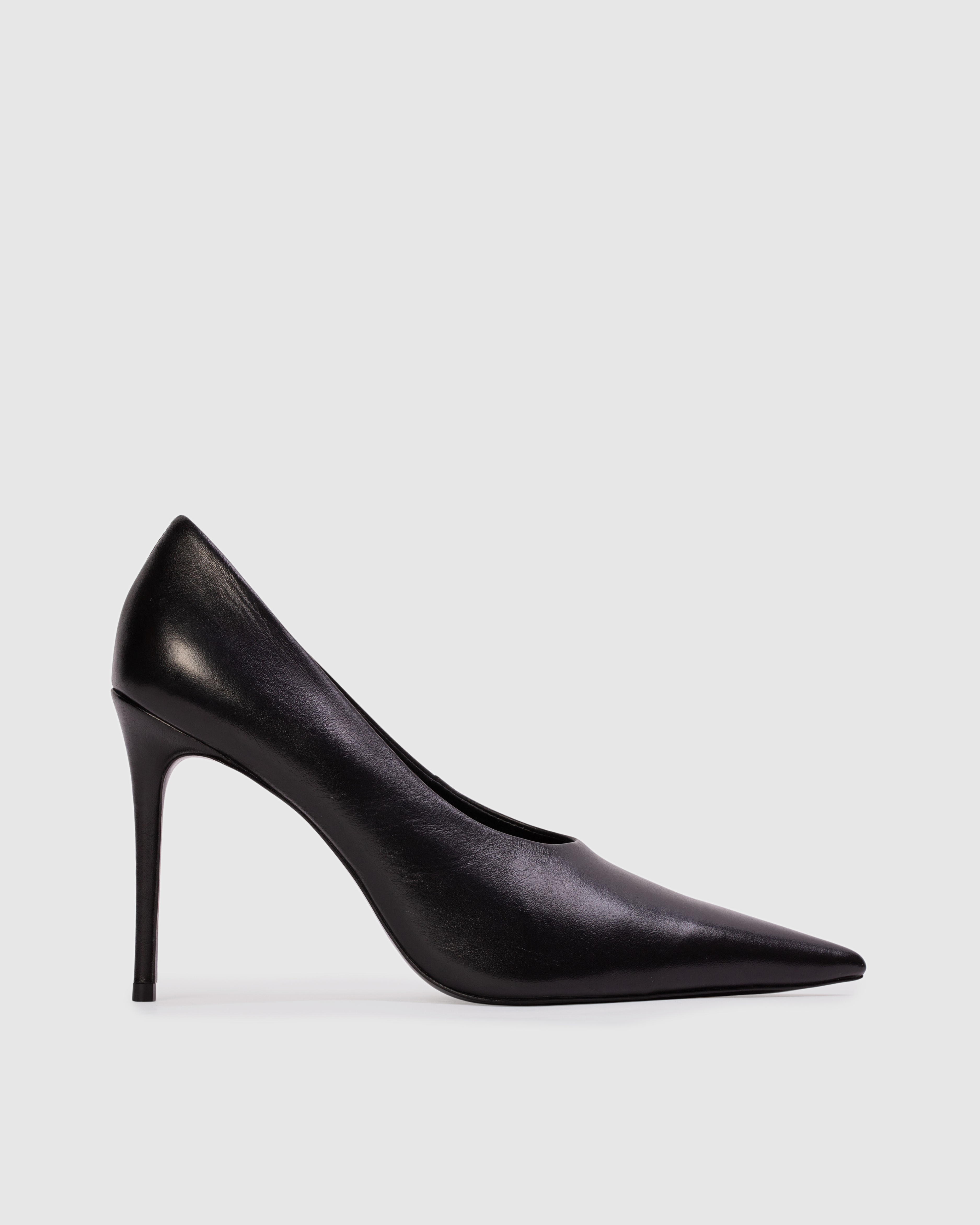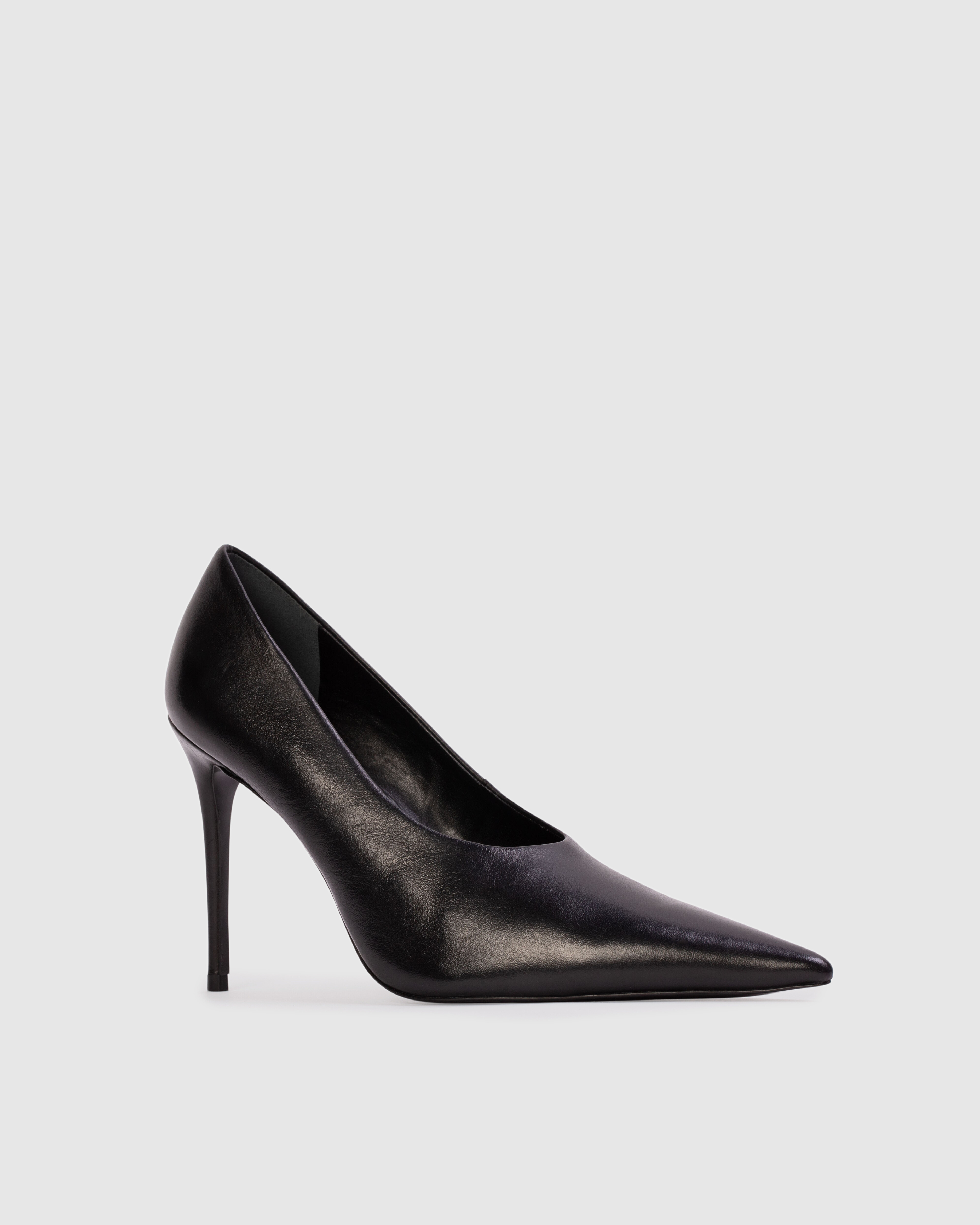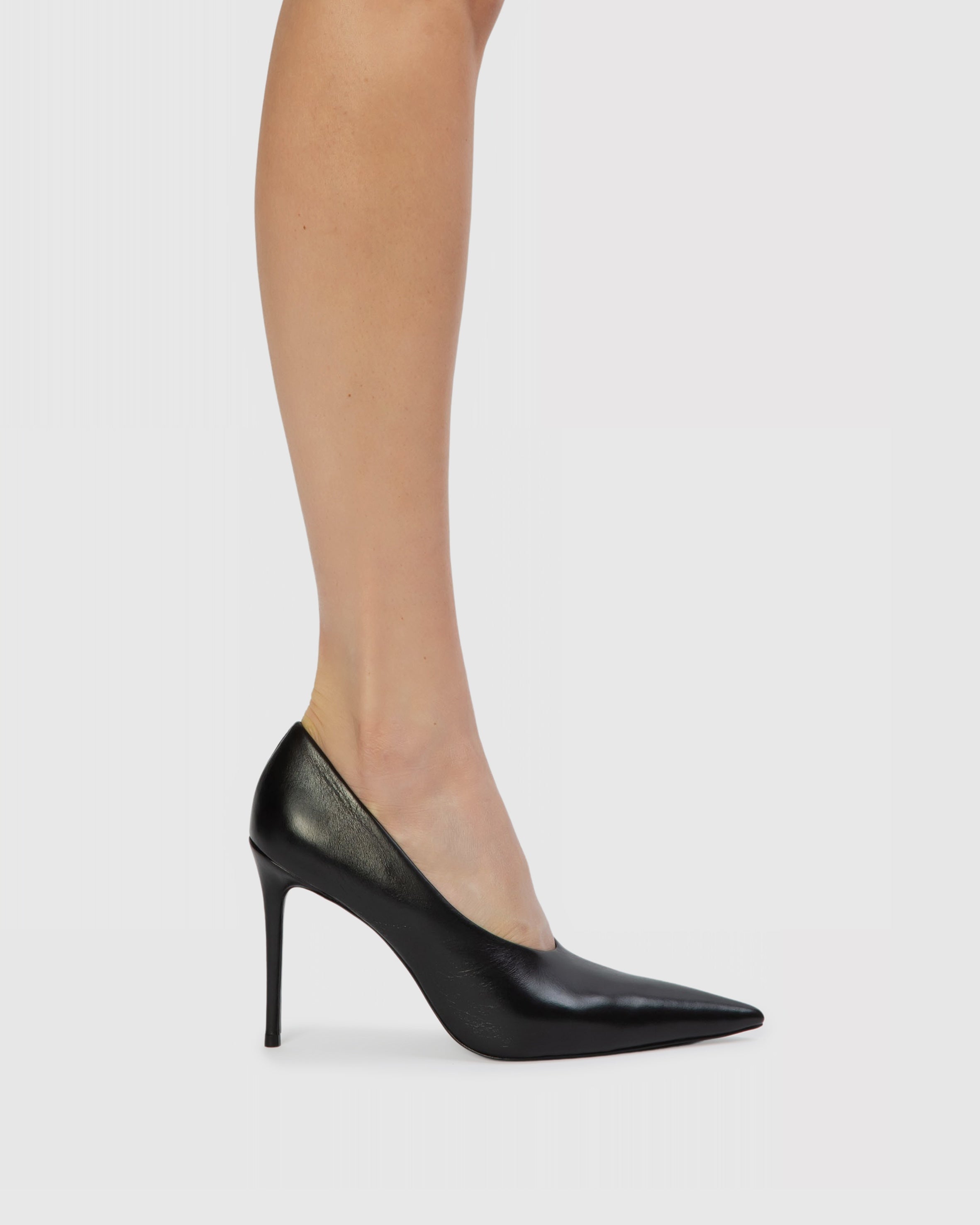 Pointy toe classic pump, set on a stiletto pin heel. Made with smooth buffed leather.