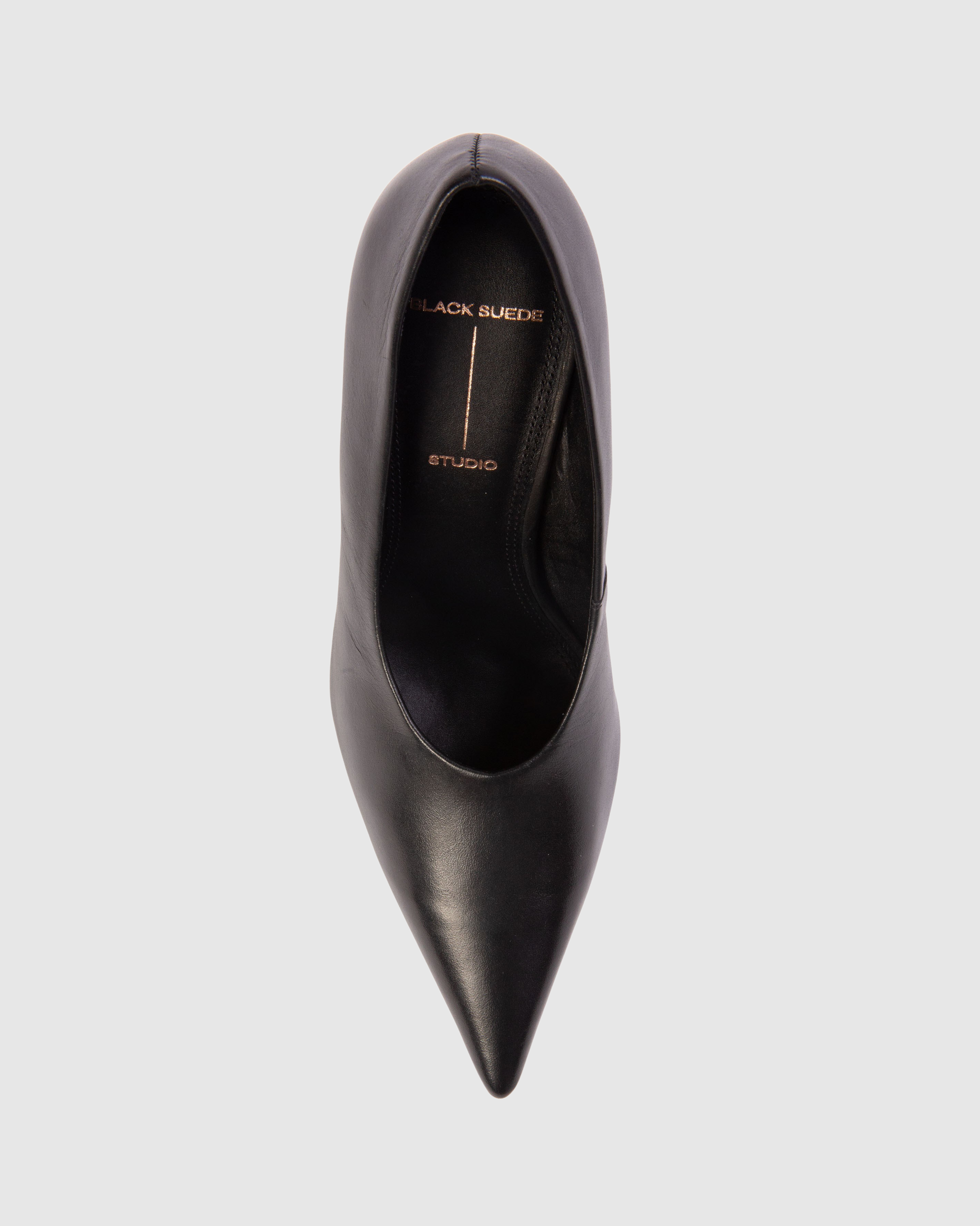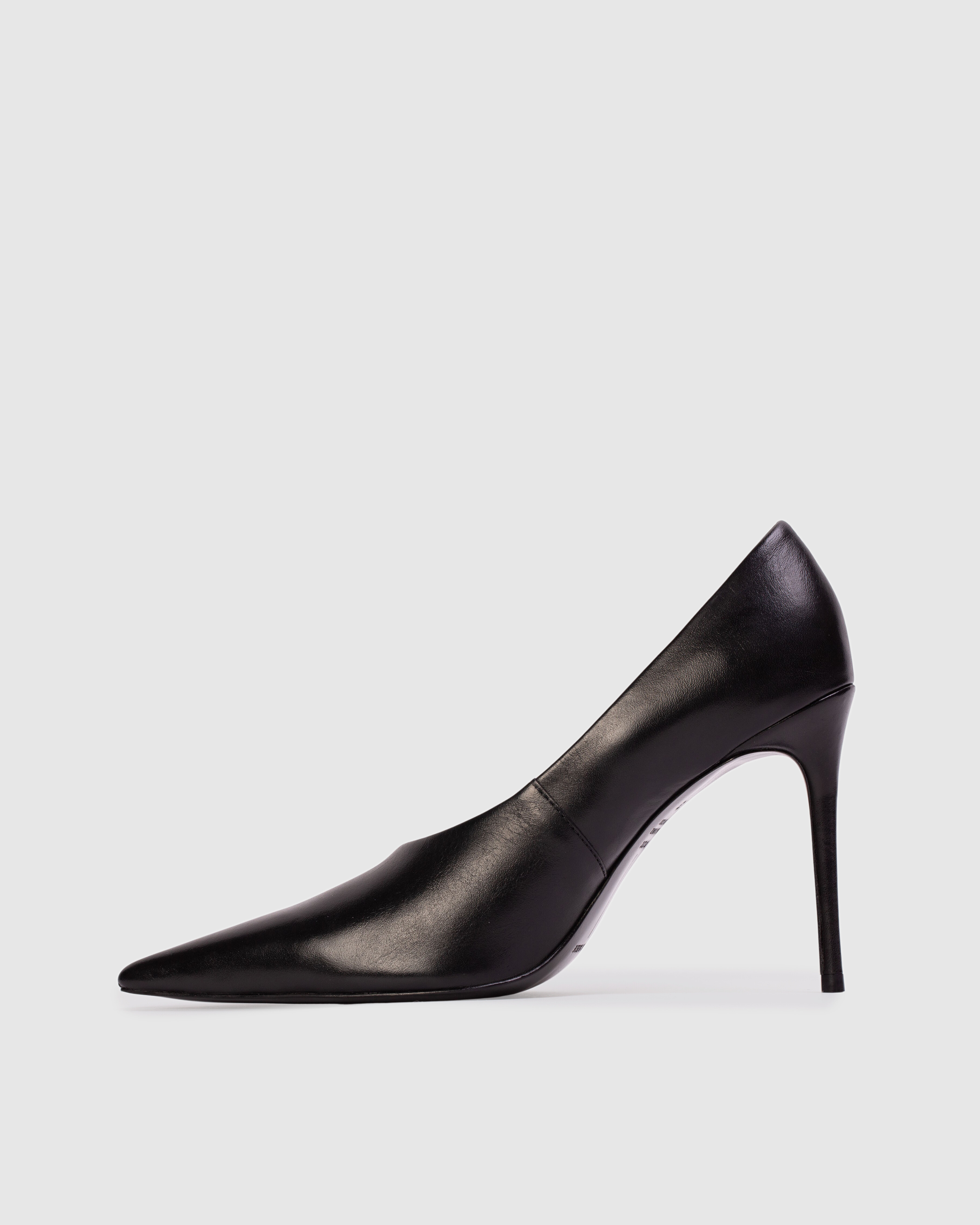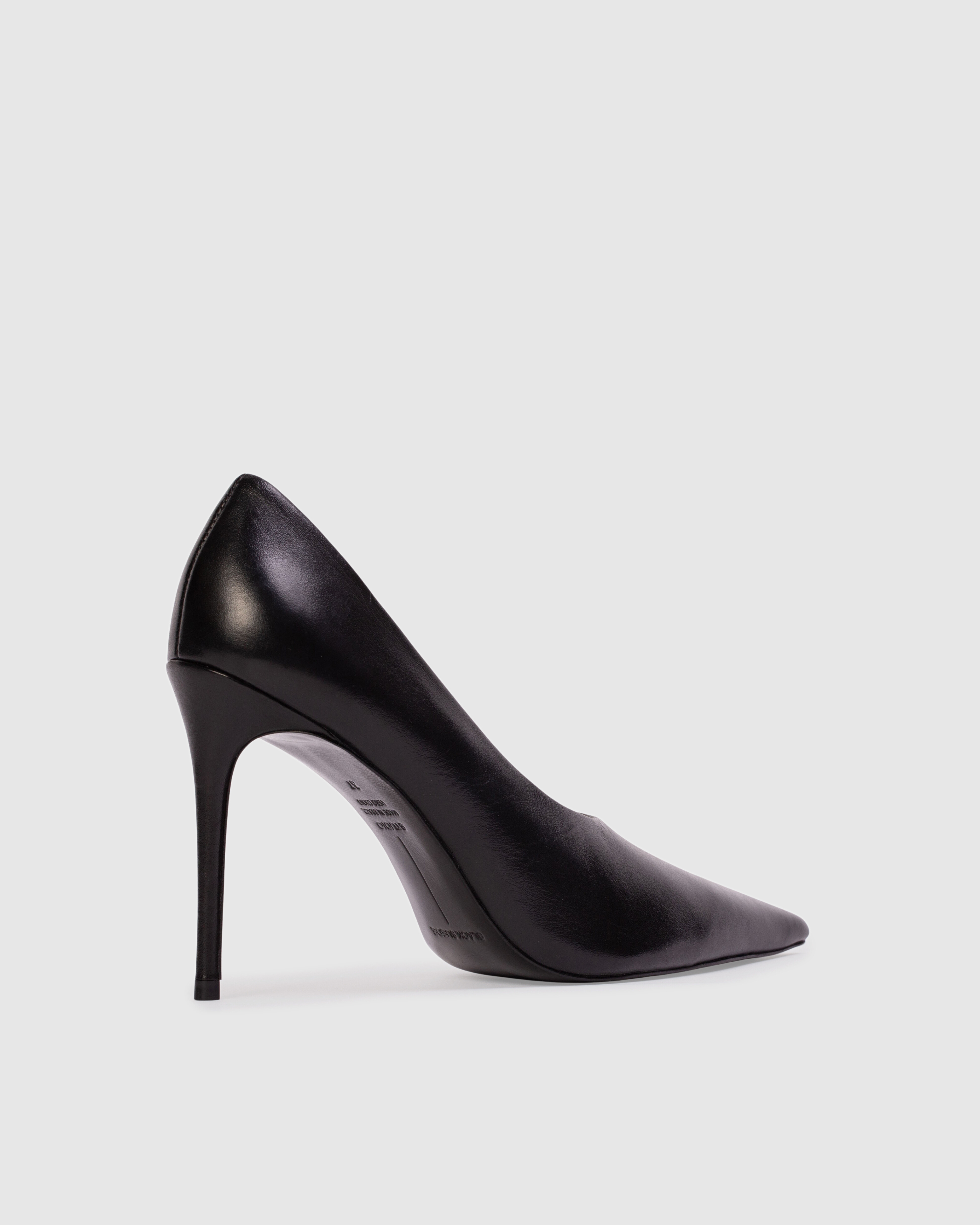 Pointy toe classic pump, set on a stiletto pin heel. Made with smooth buffed leather.