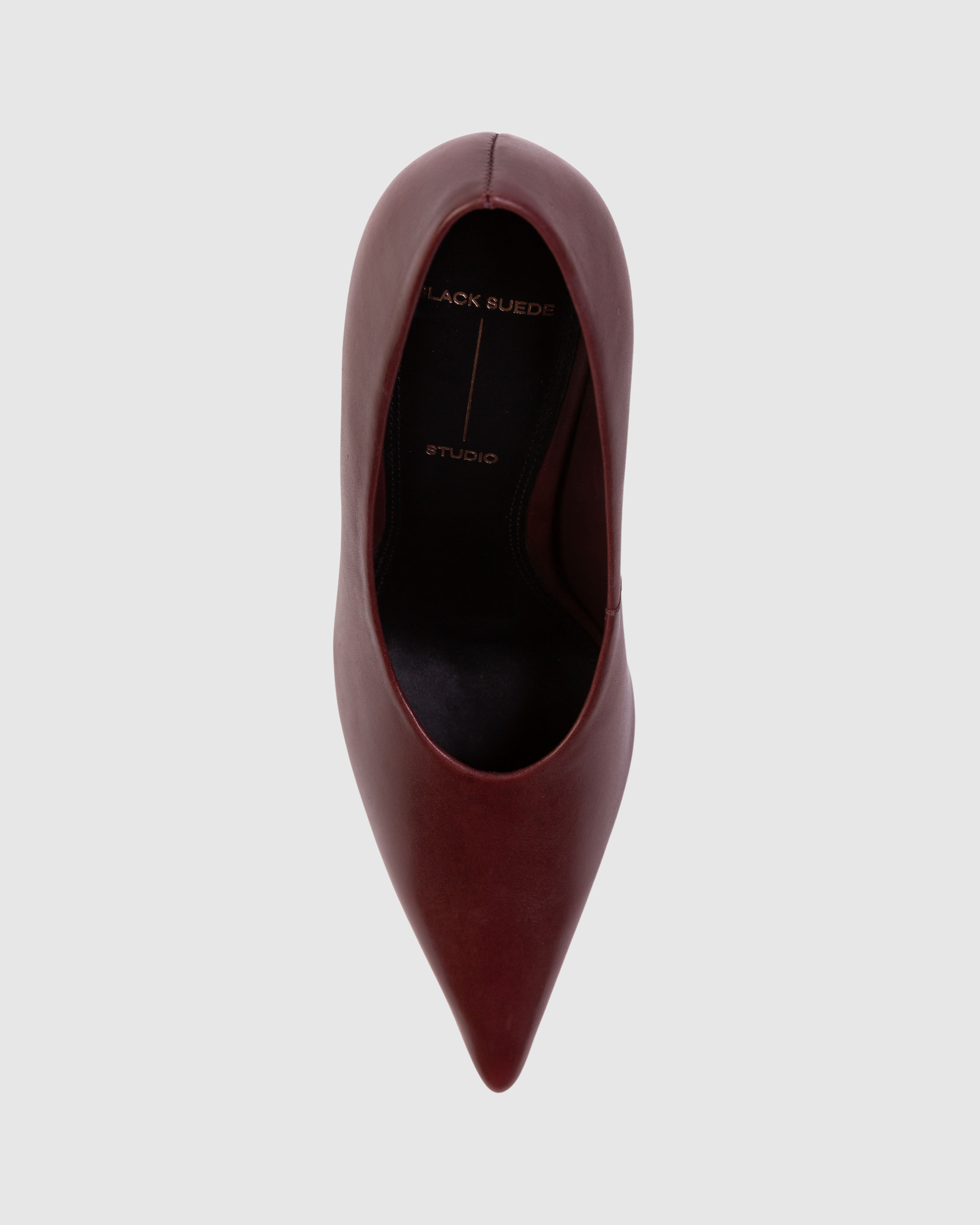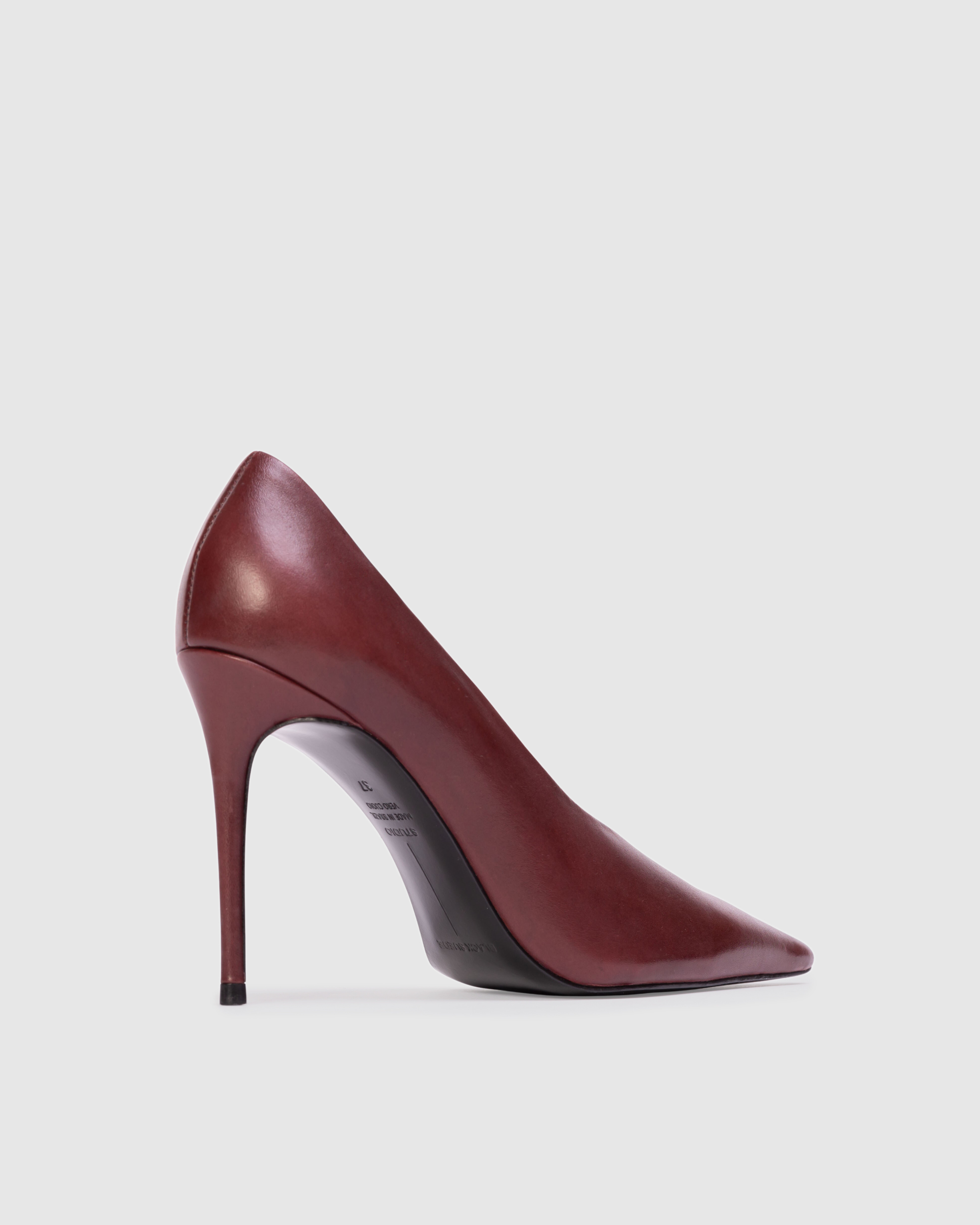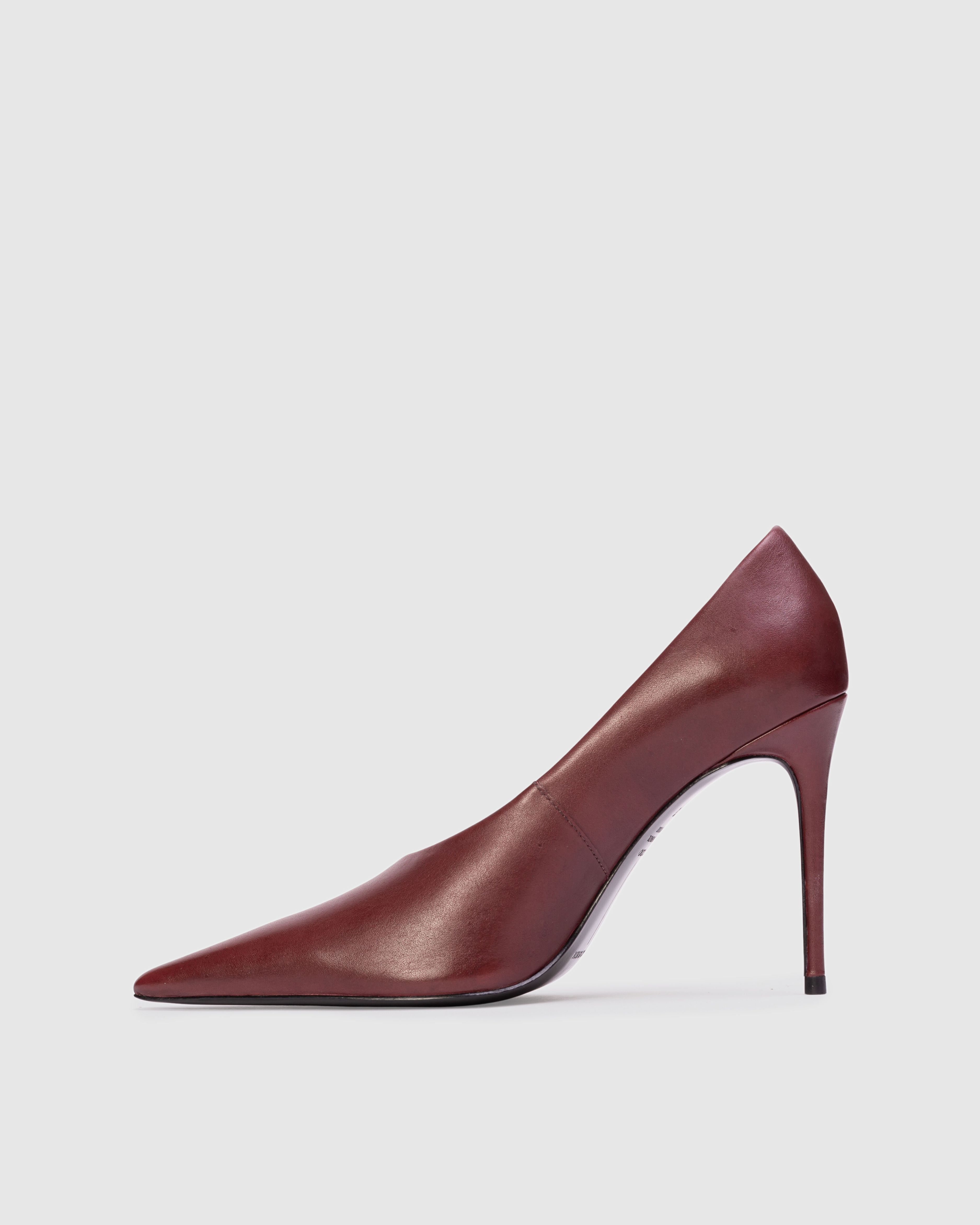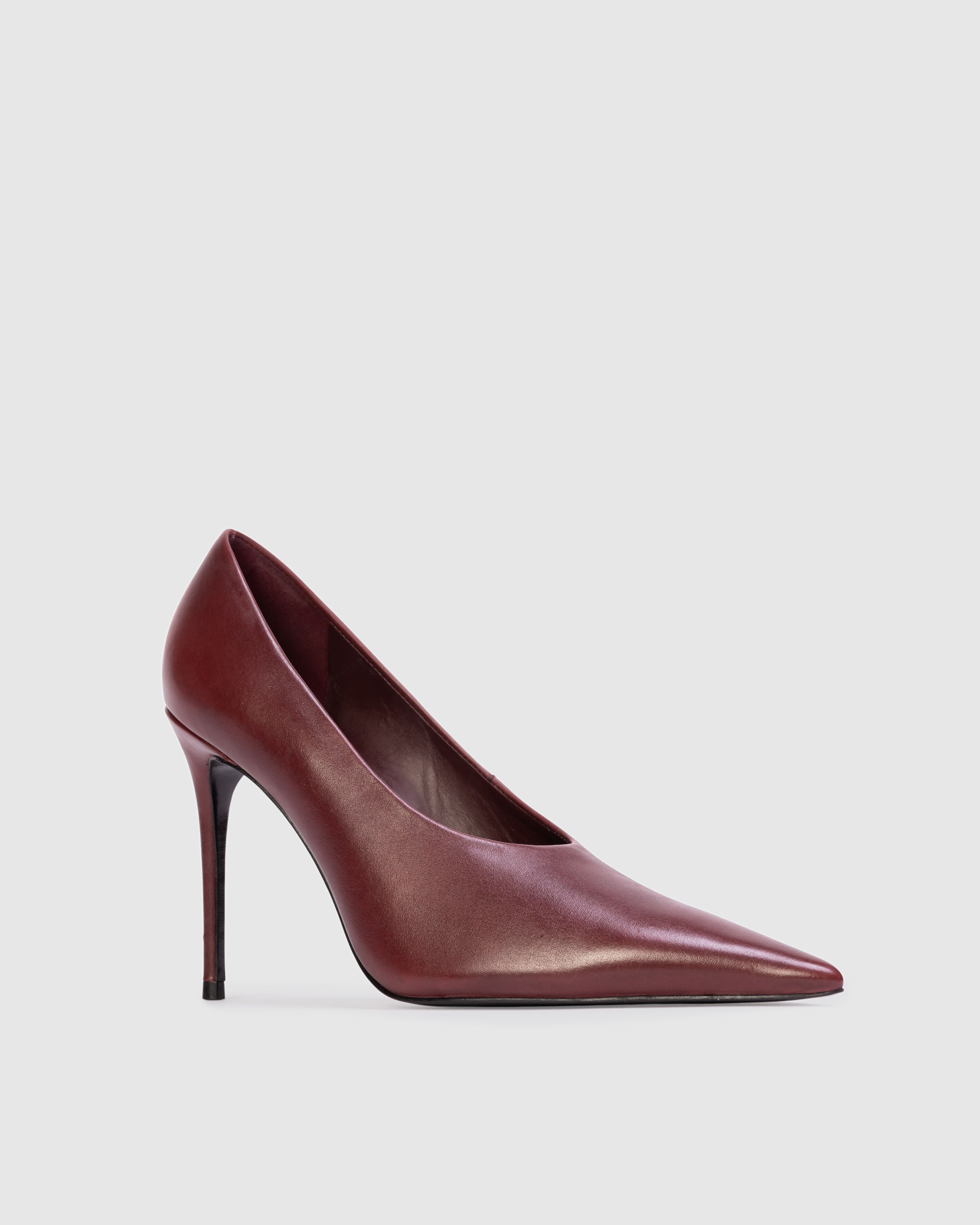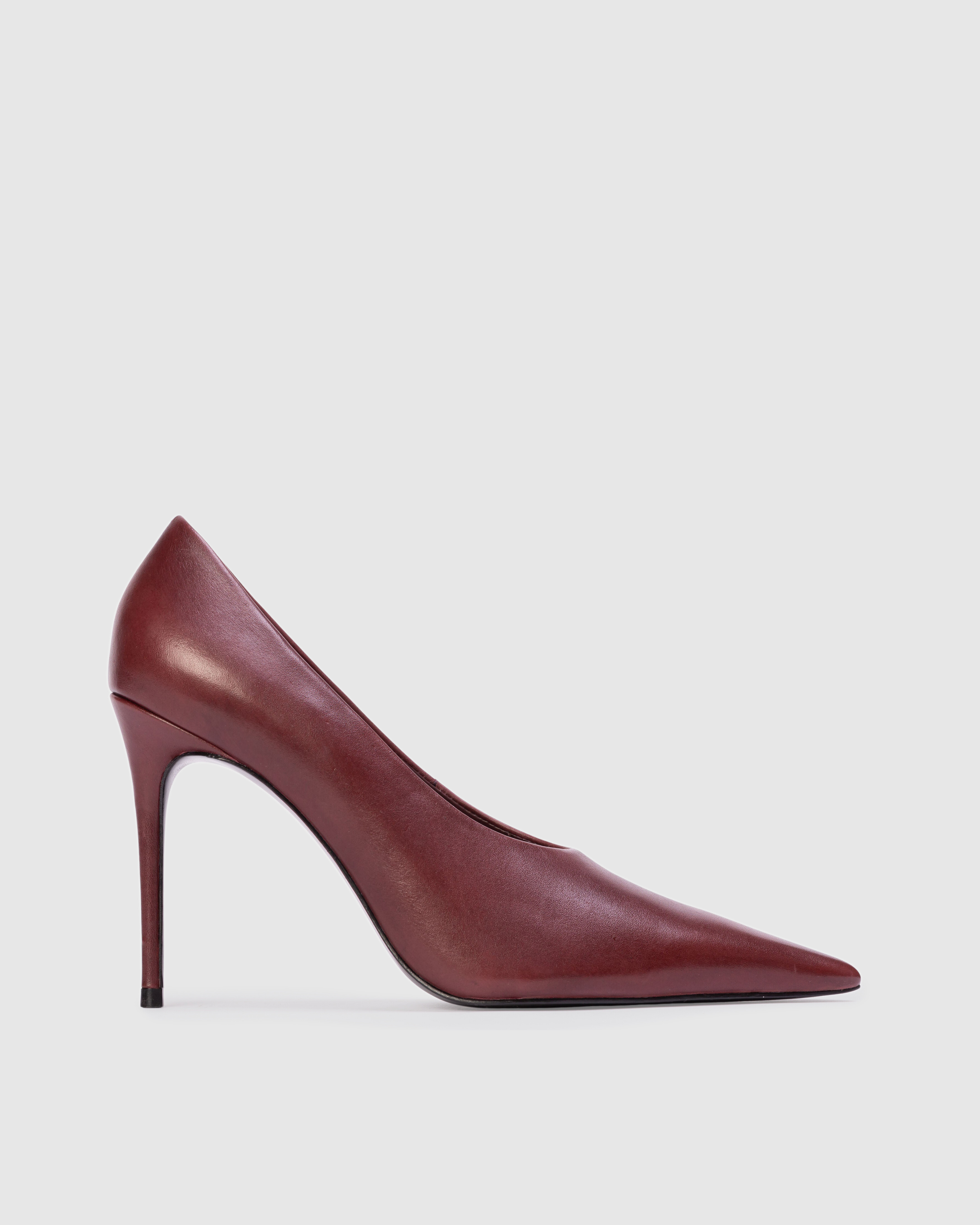 Pointy toe classic pump, set on a stiletto pin heel. Made with smooth buffed leather.