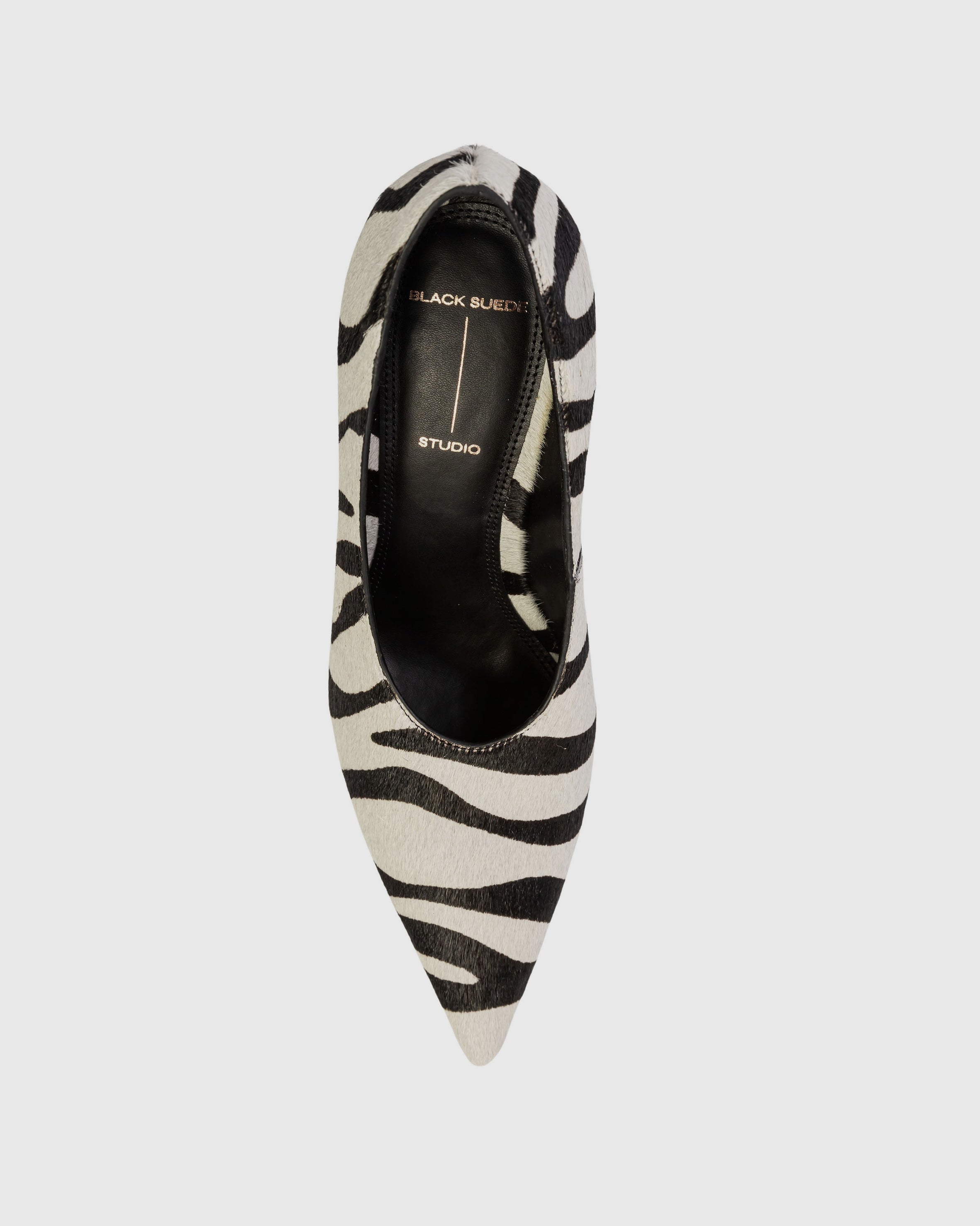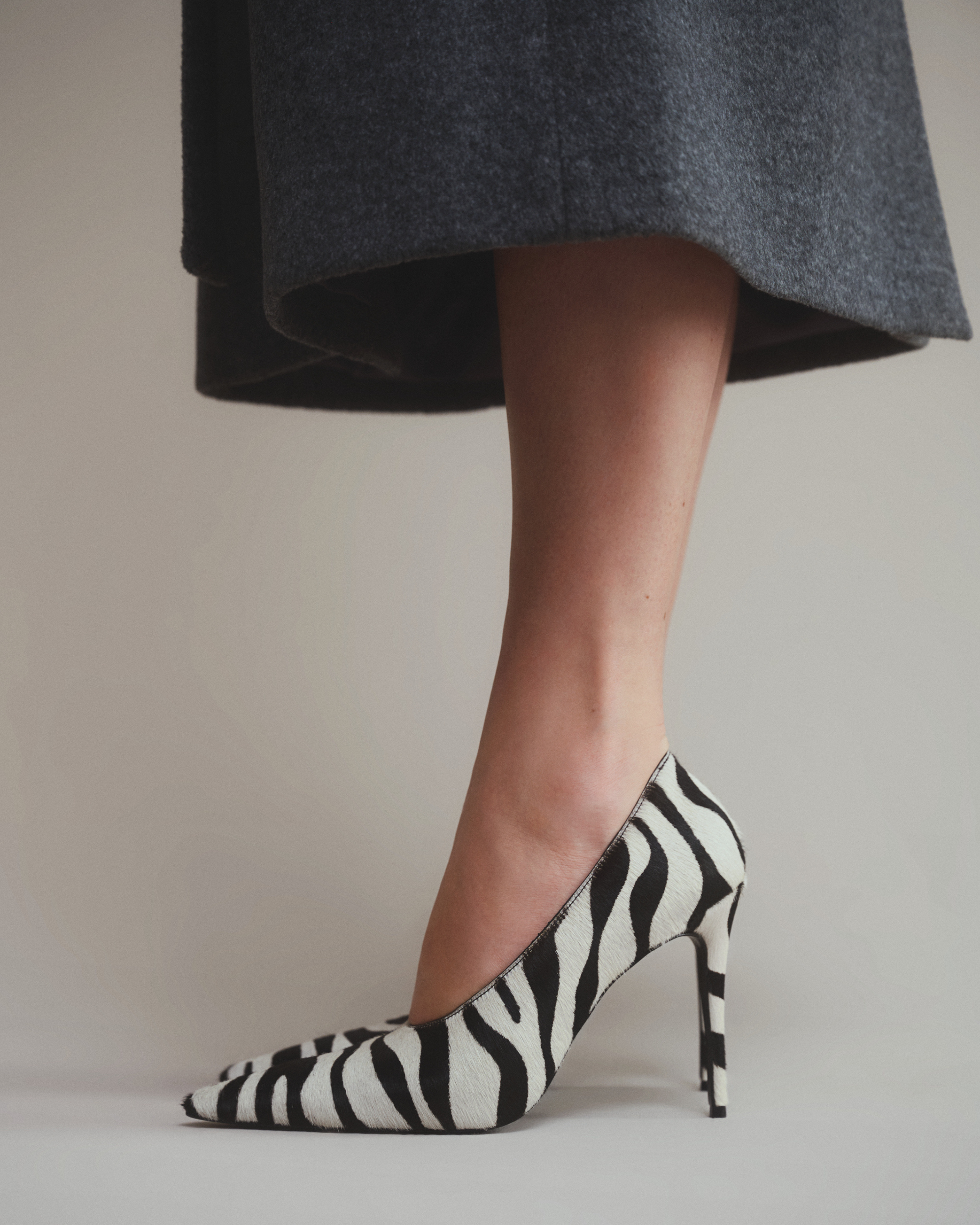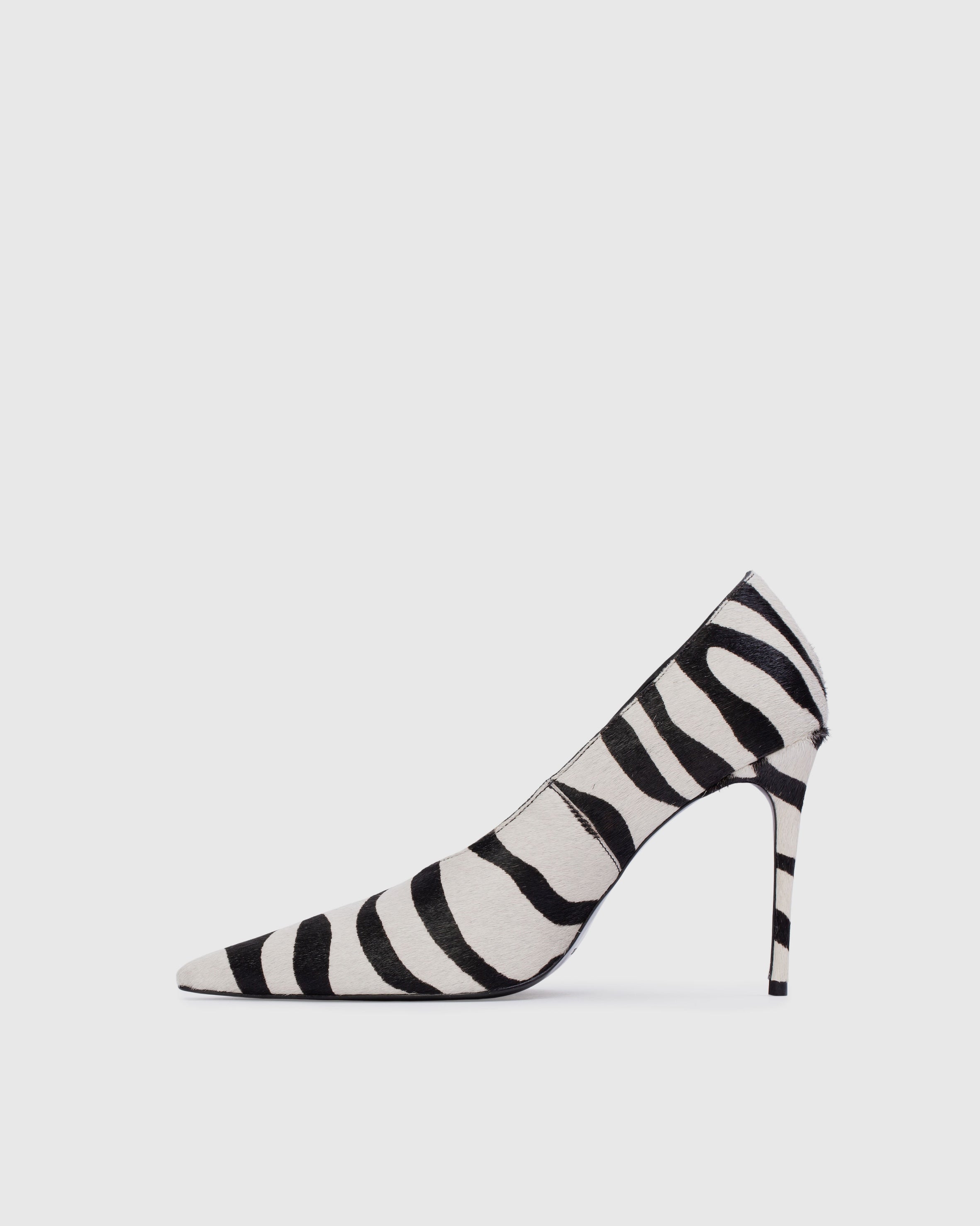 Pointy toe classic pump, set on a stiletto pin heel. Made with zebra printed pony hair.