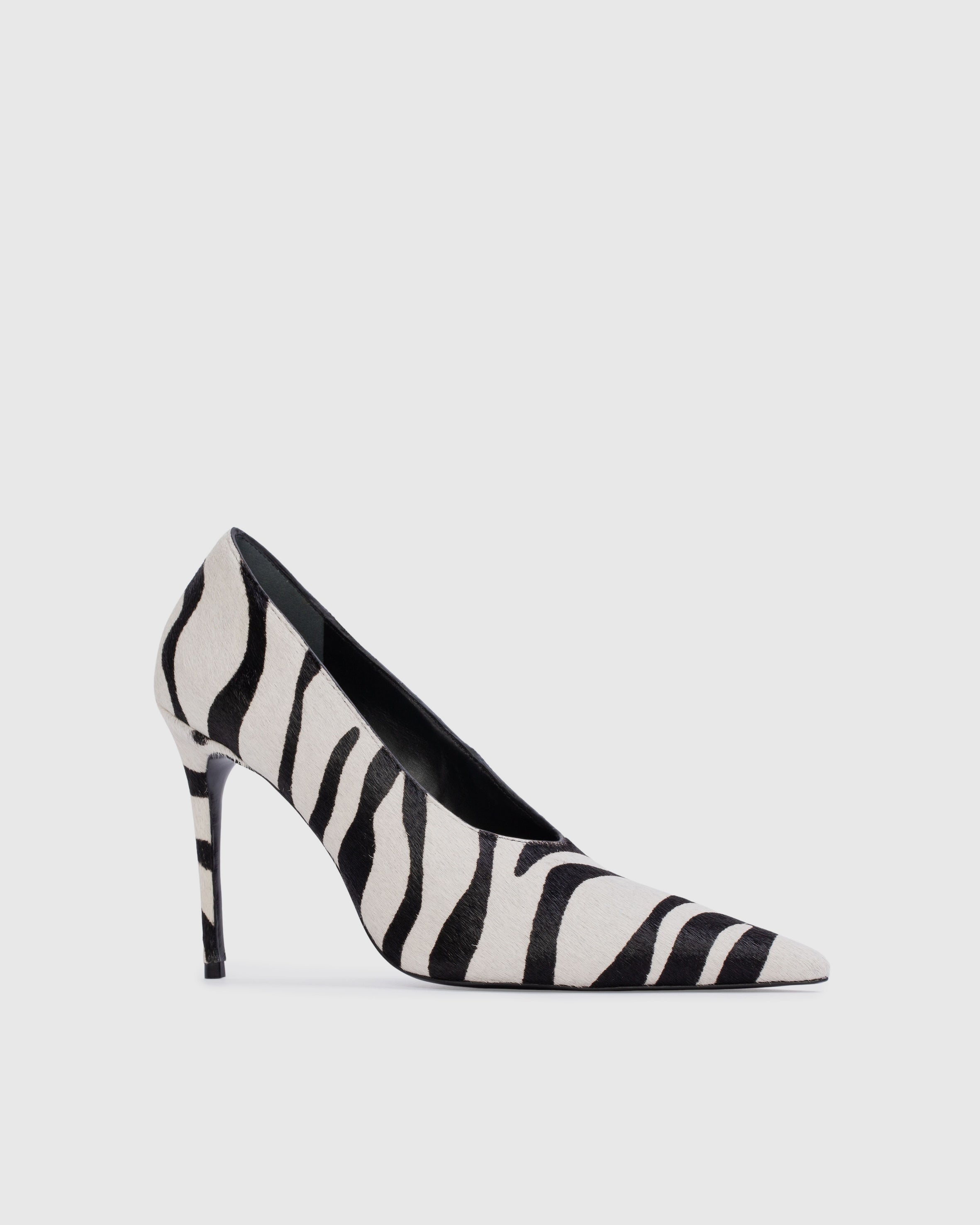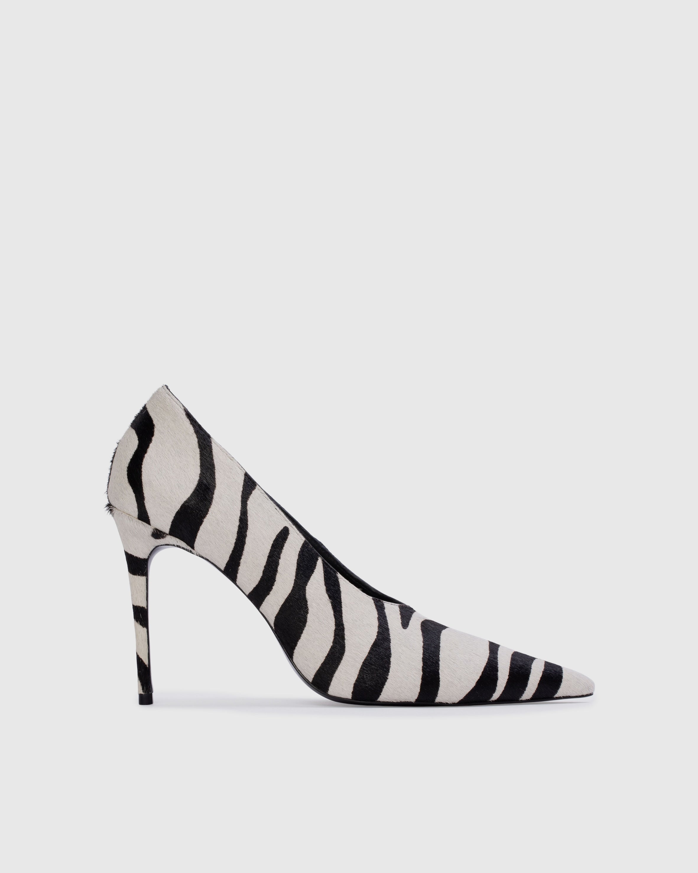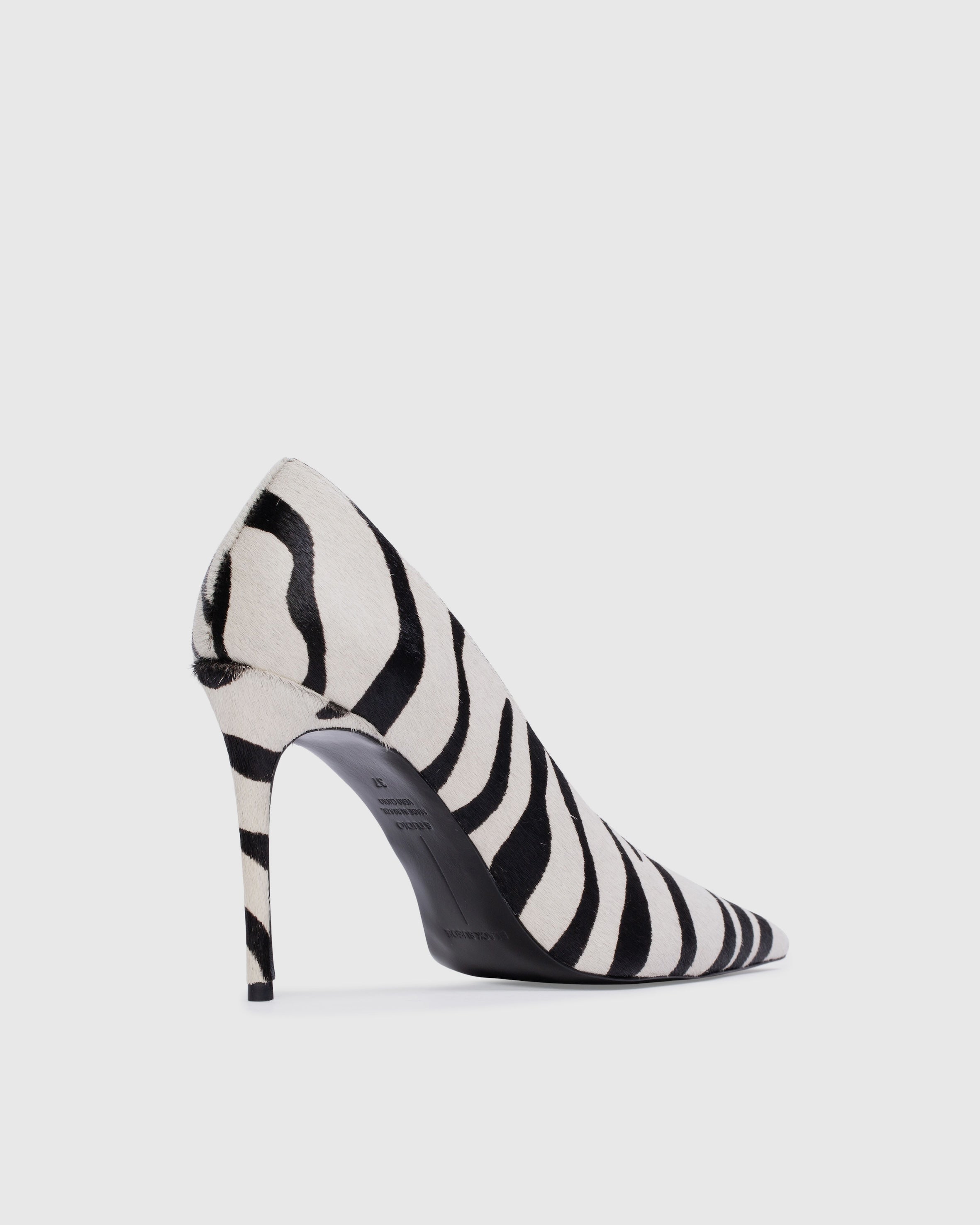 Pointy toe classic pump, set on a stiletto pin heel. Made with zebra printed pony hair.