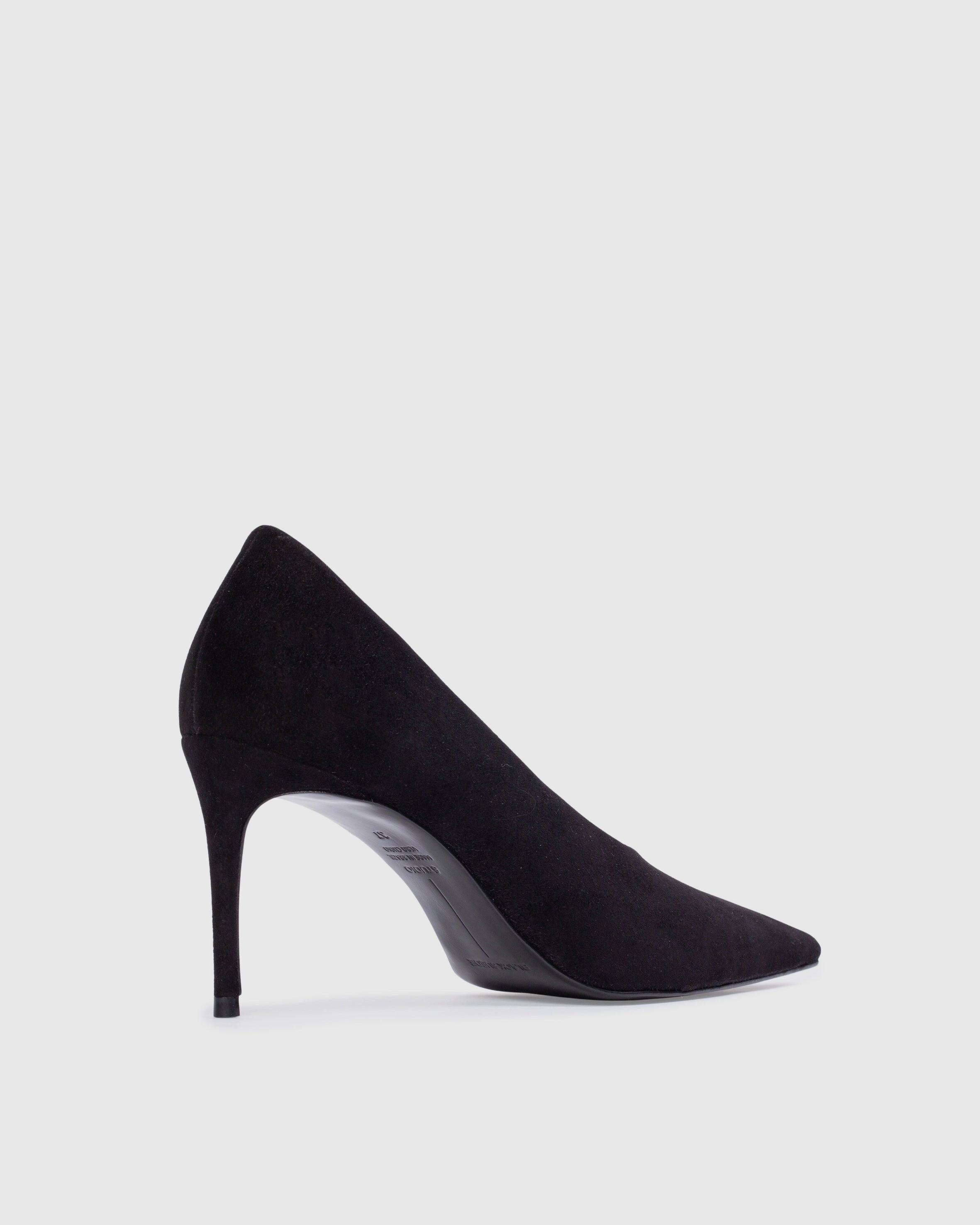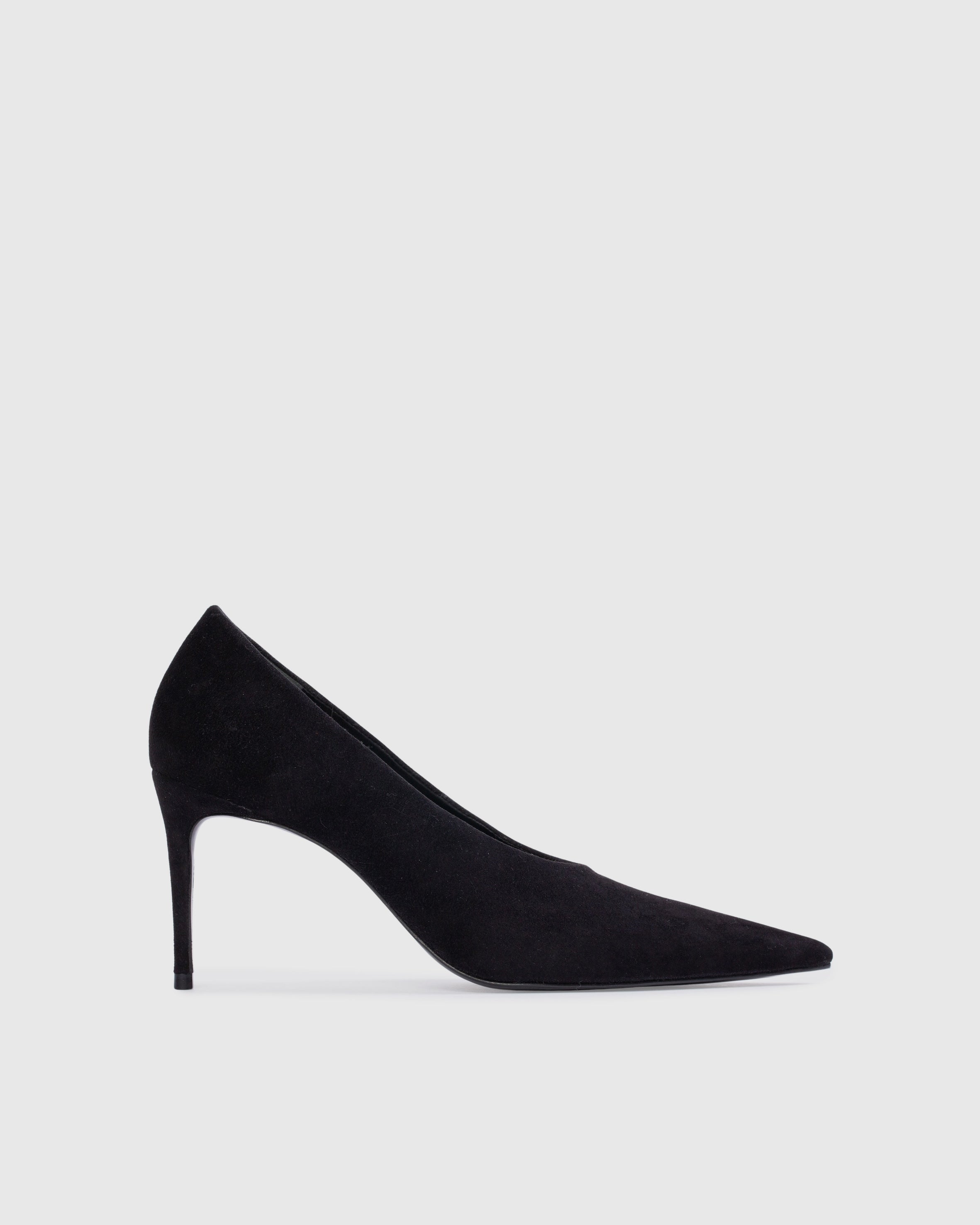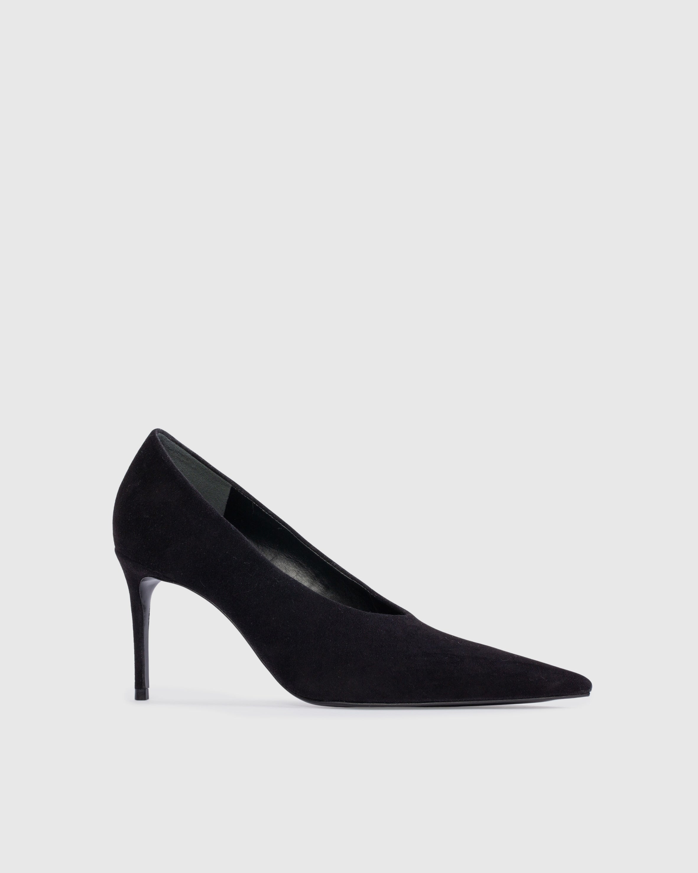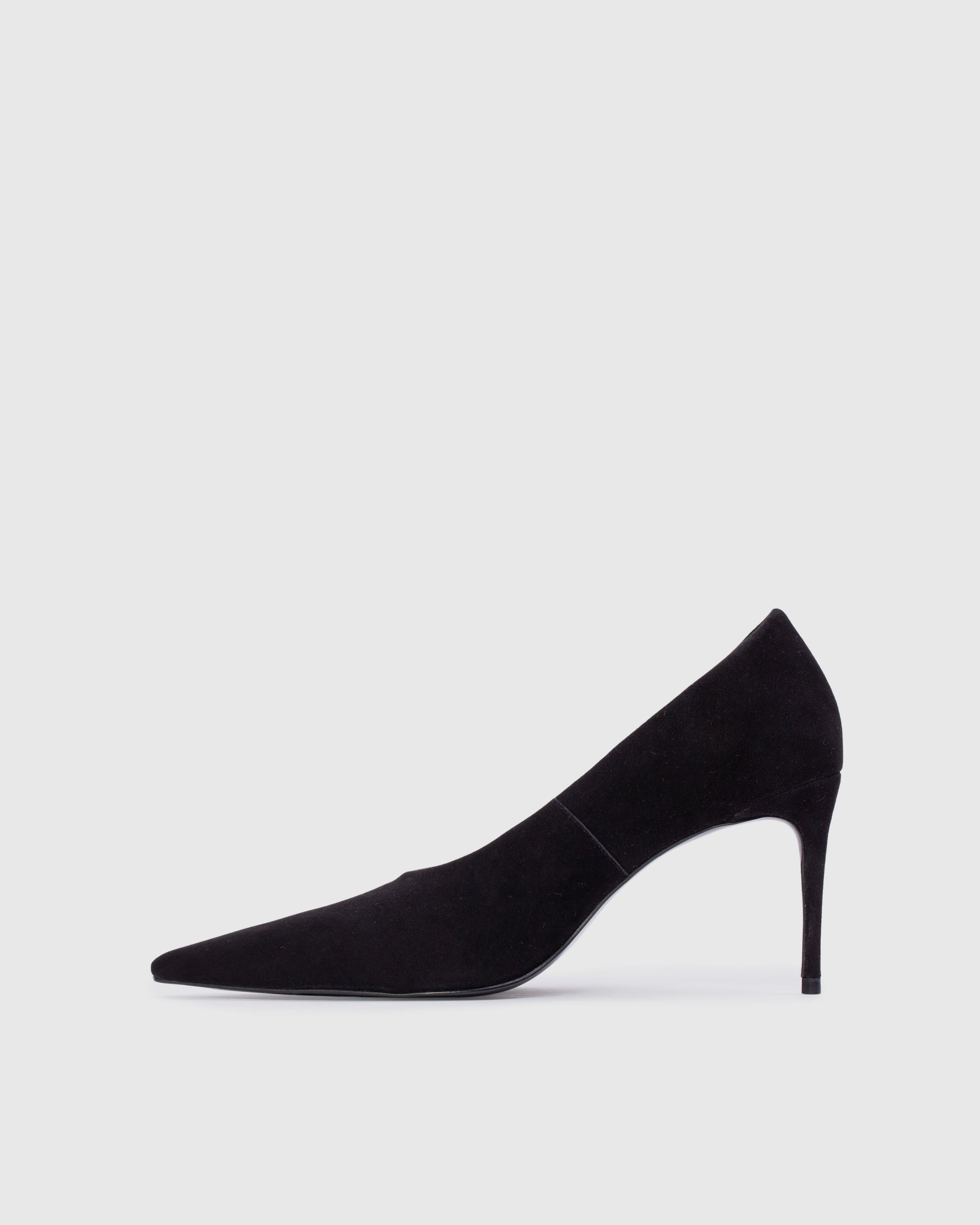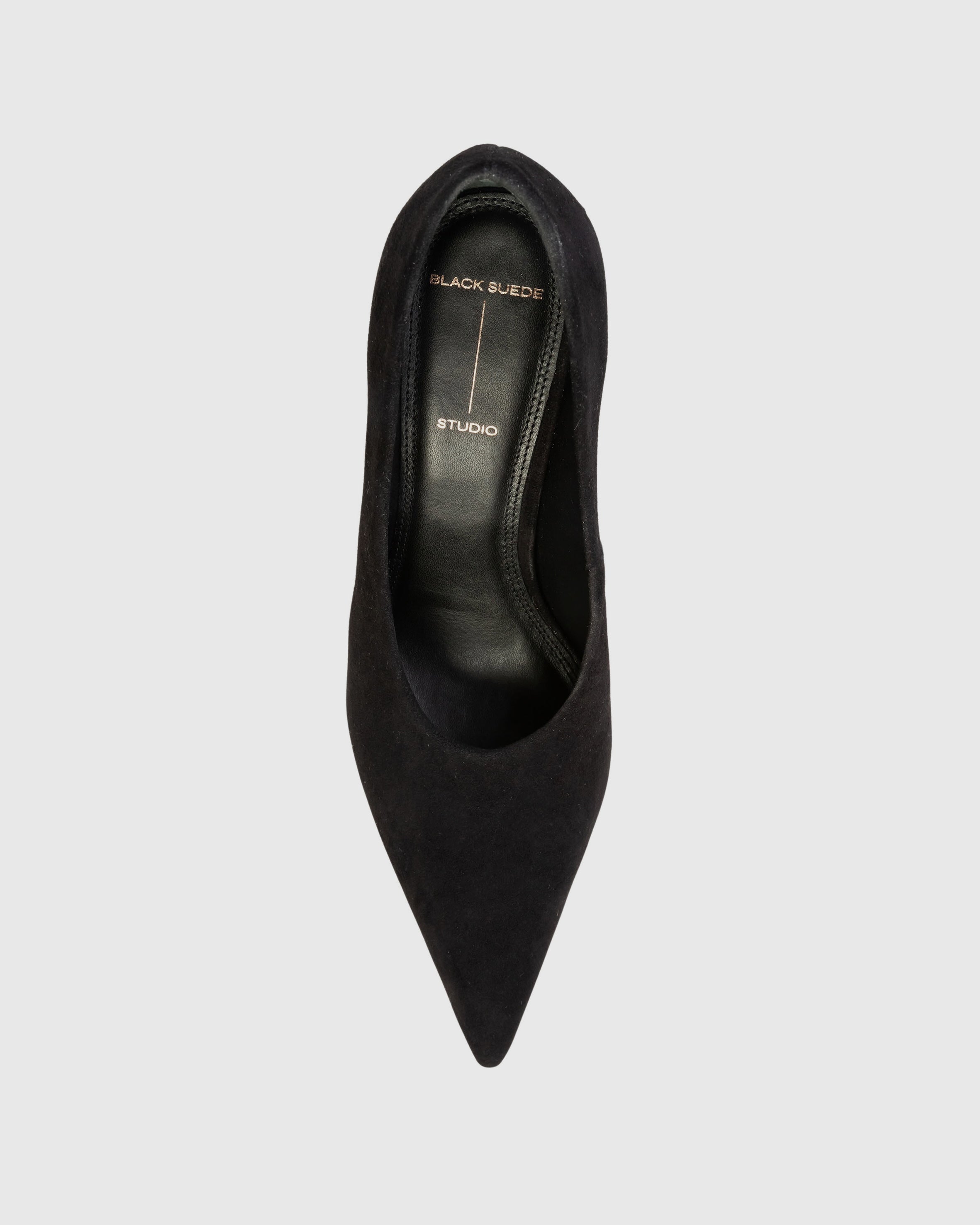pointy toe classic pump, set on a high pin heel. made with brushed kid suede.