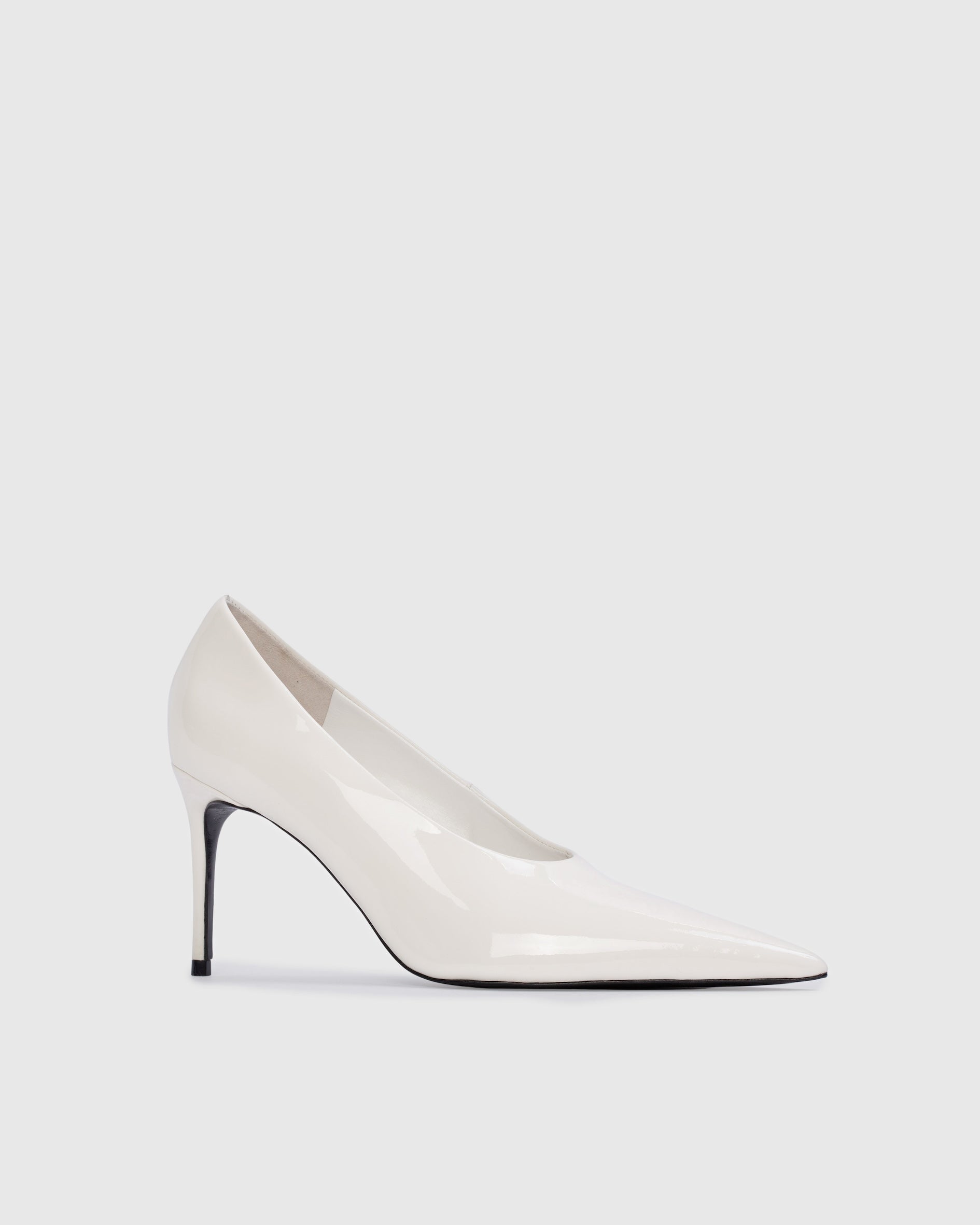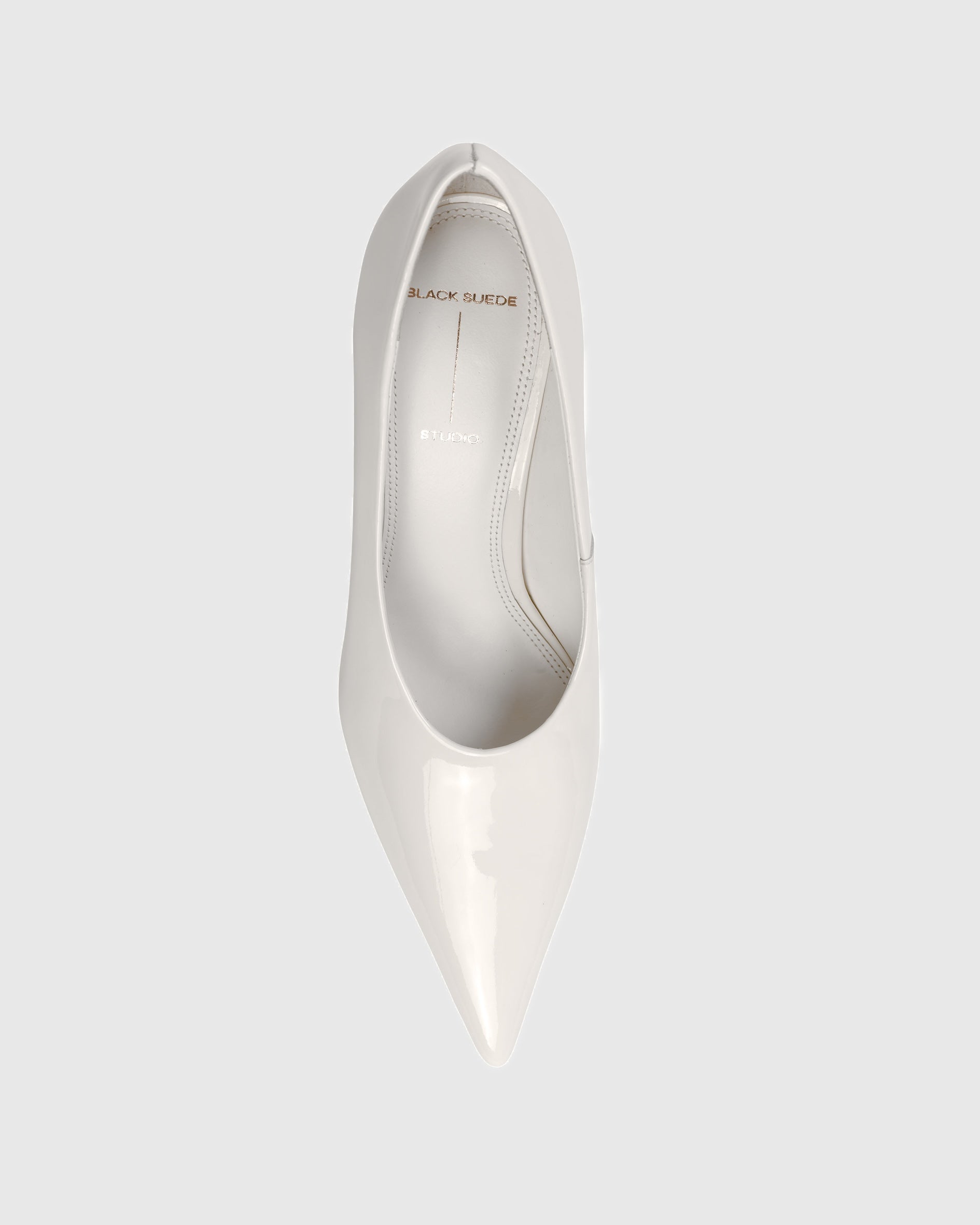 Pointy toe classic pump, set on a high pin heel. Made with smooth patent leather.
