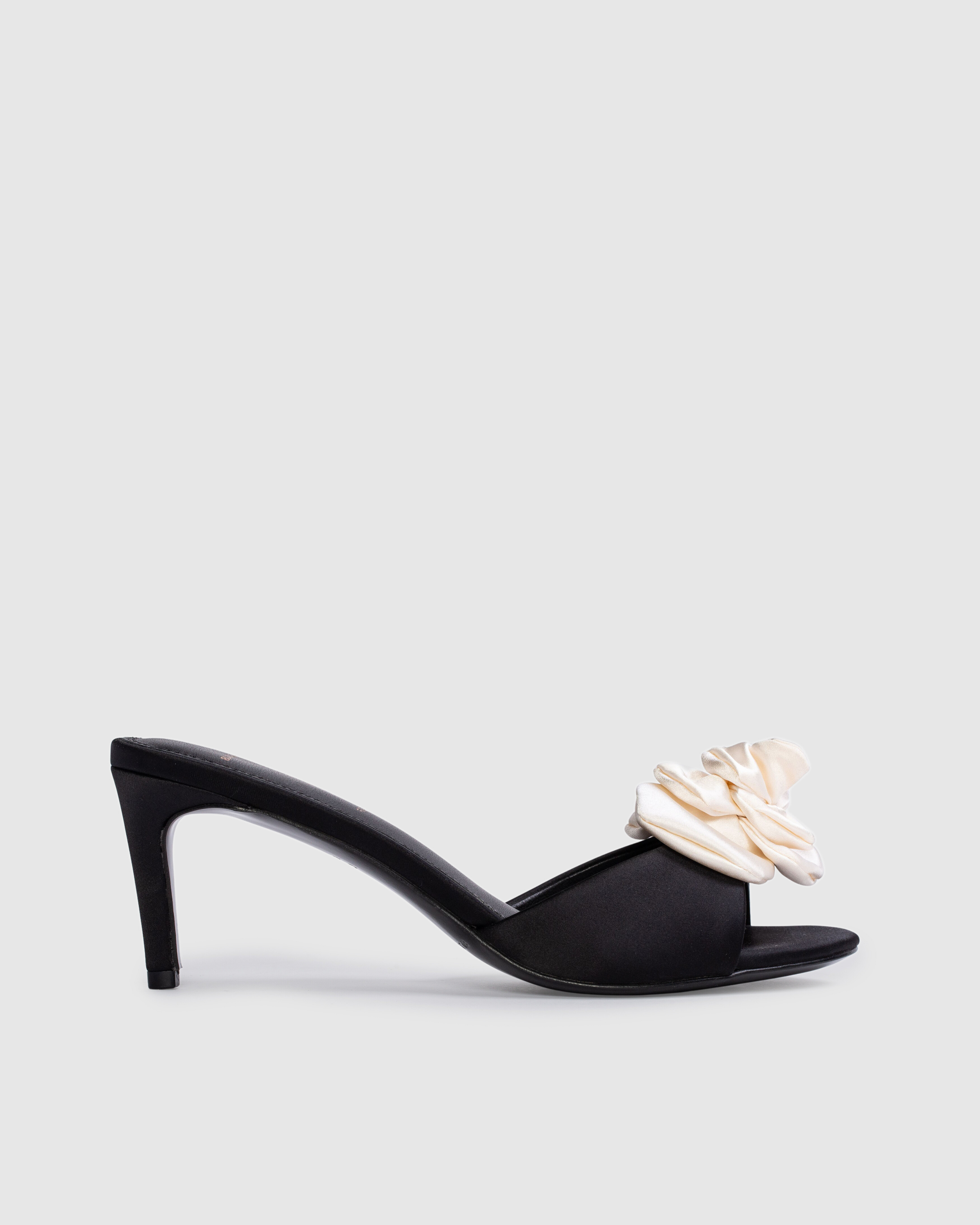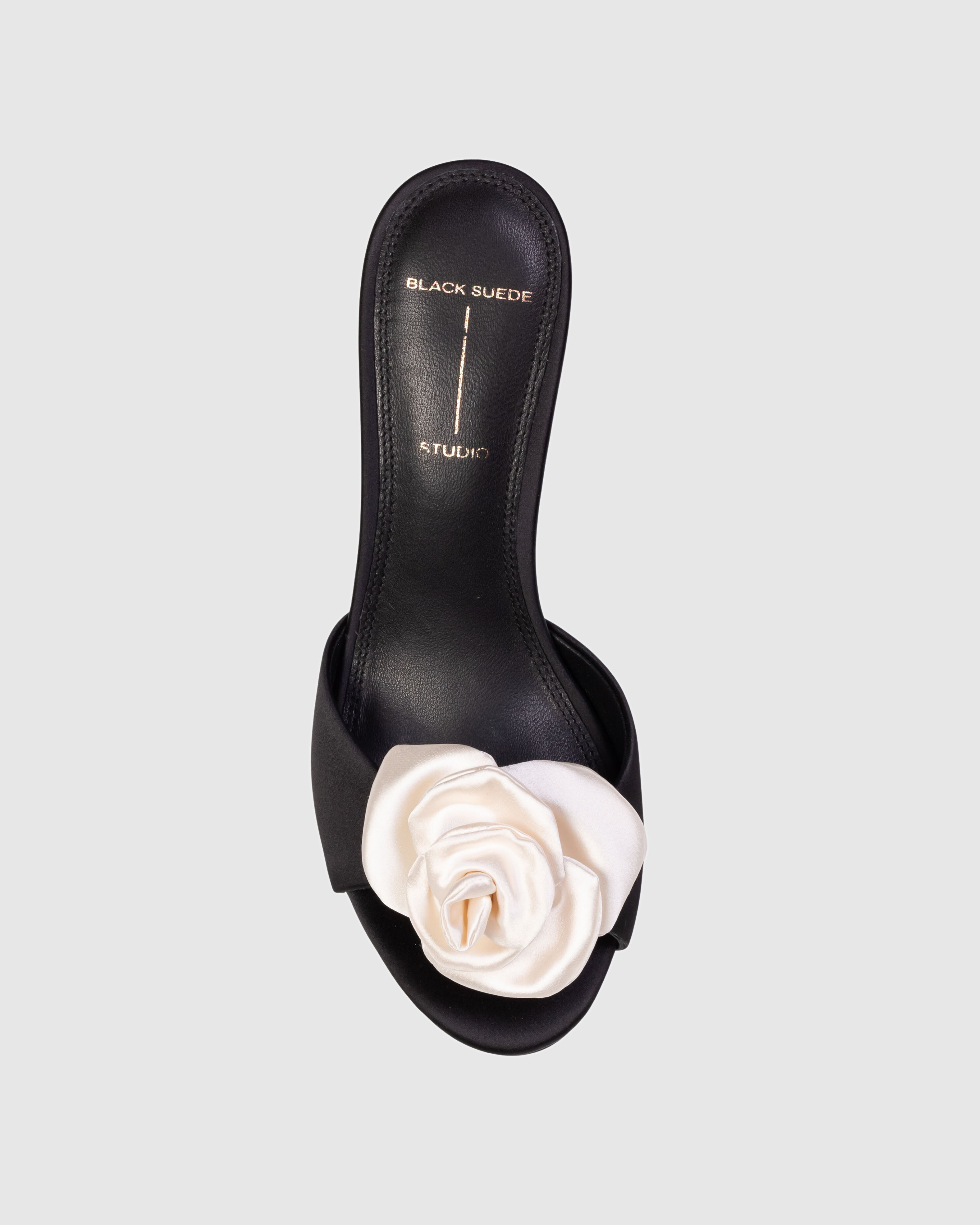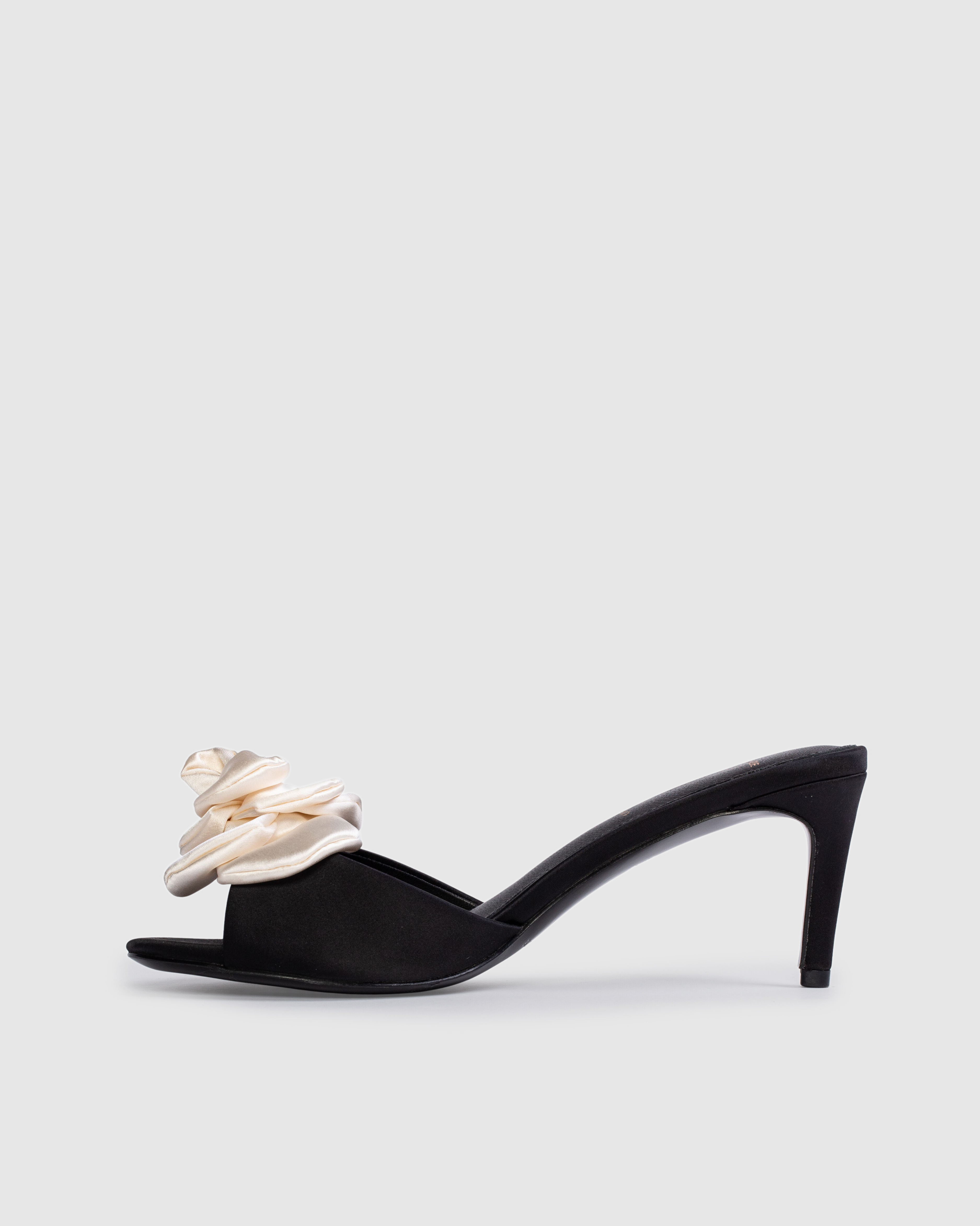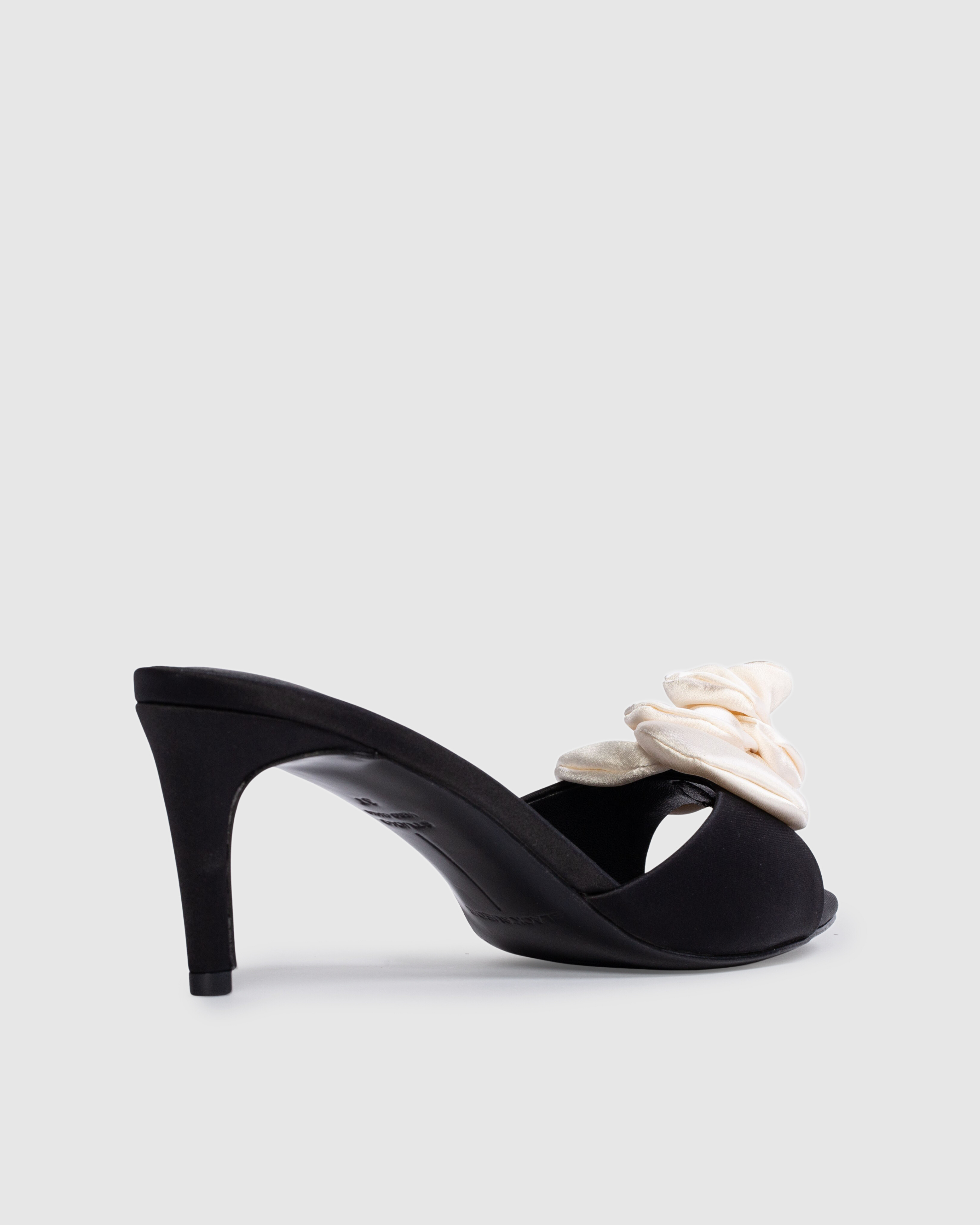 Round toe slipper mule with satin rosette detail, set on a straight mid heel. Made with satin crepe.