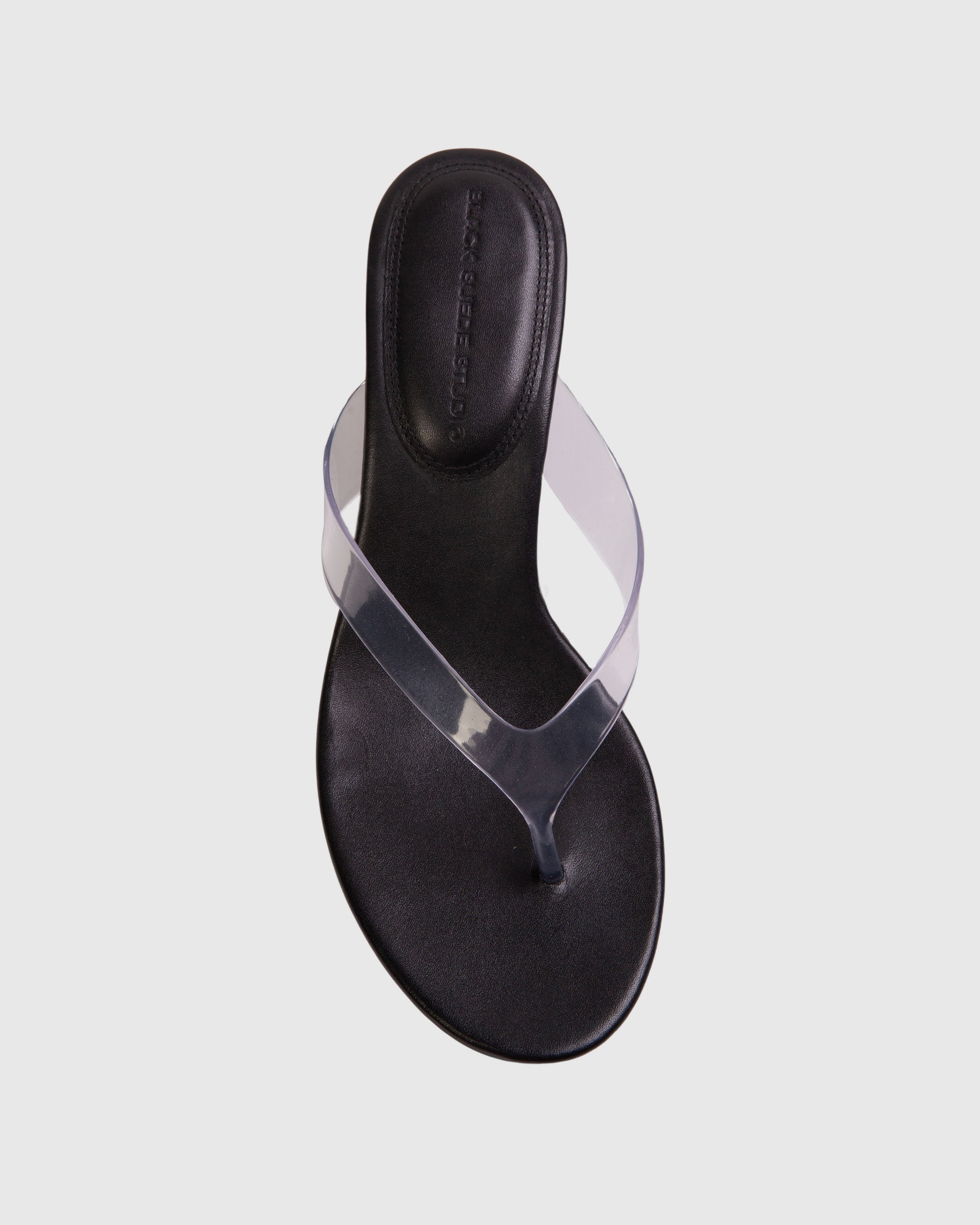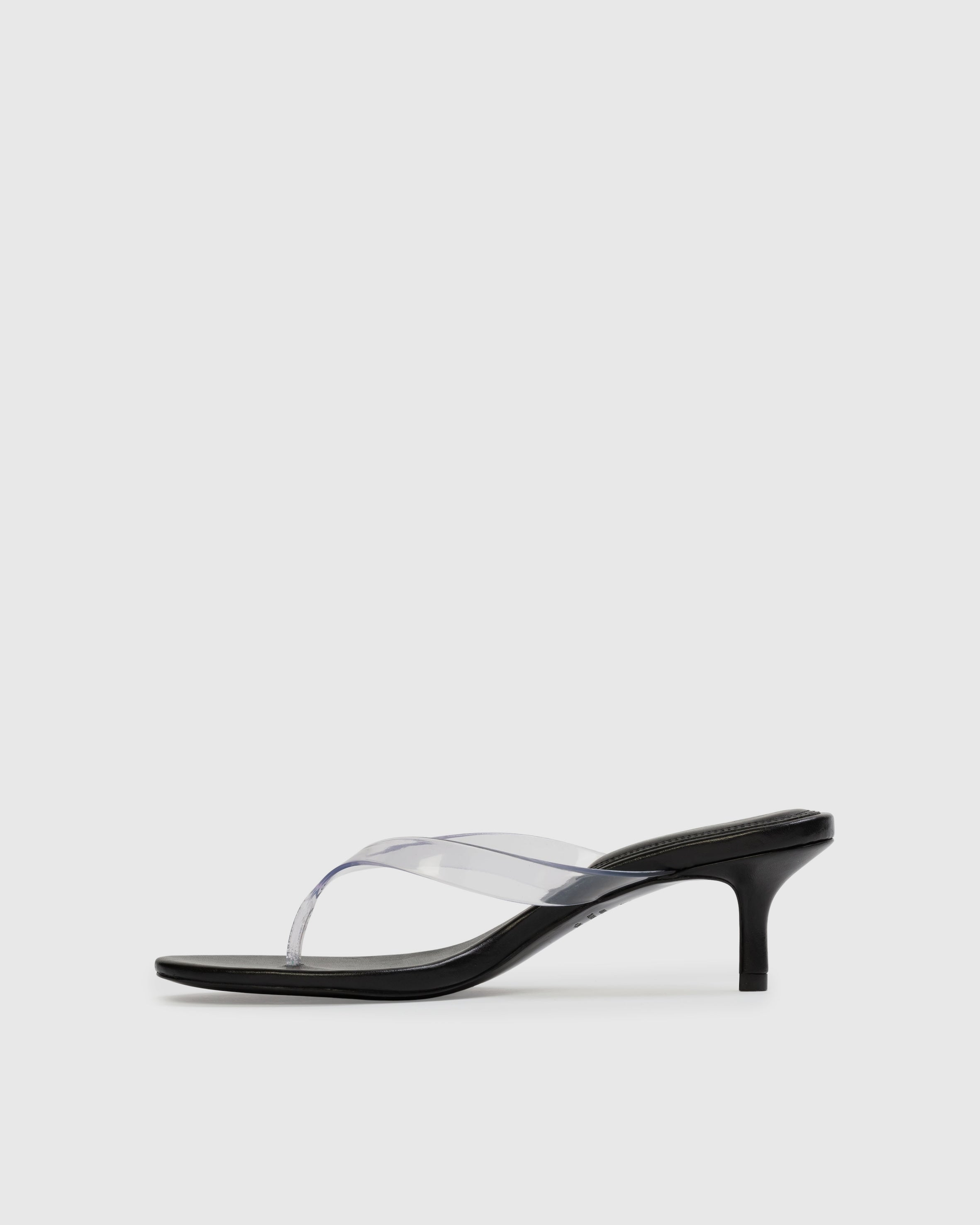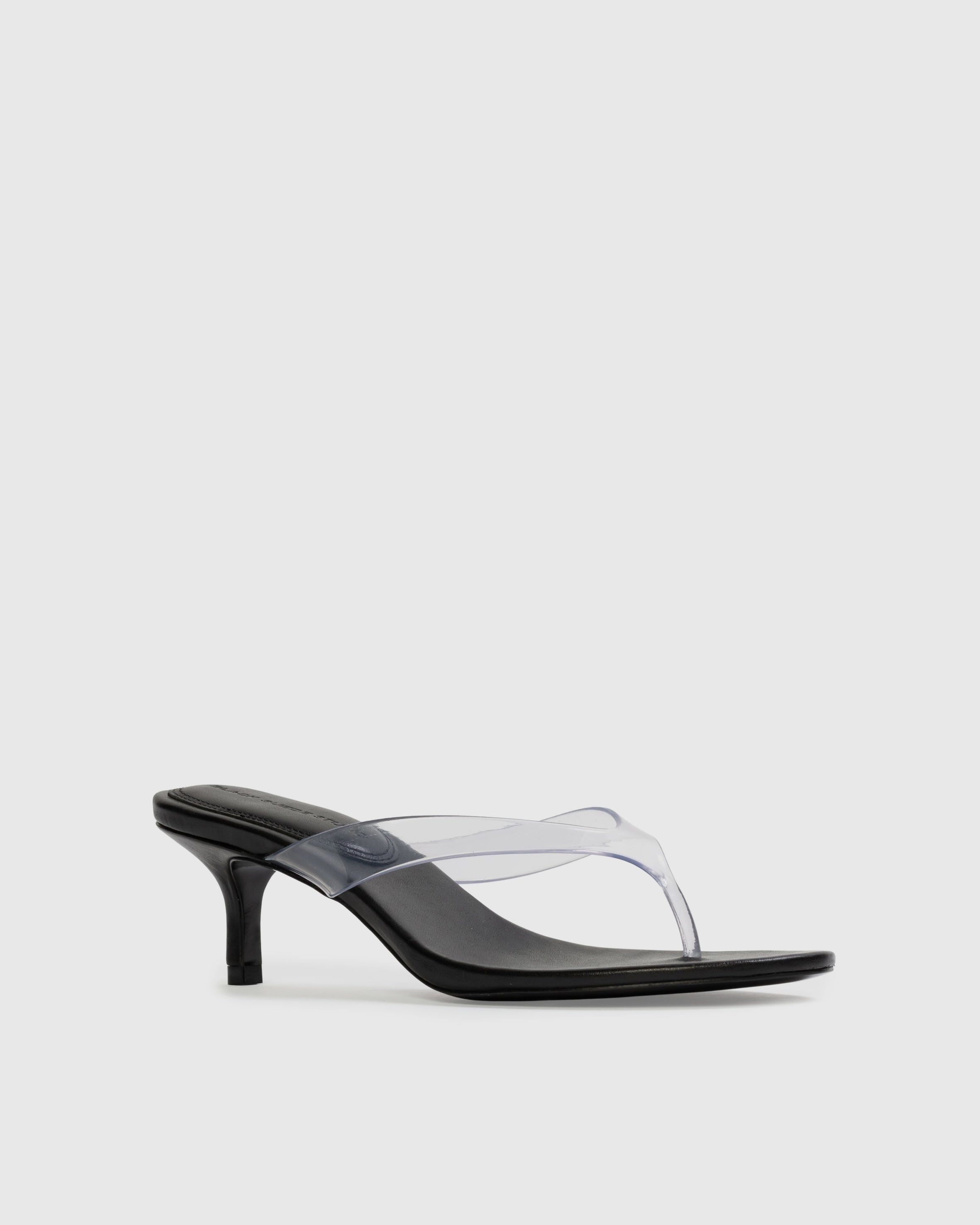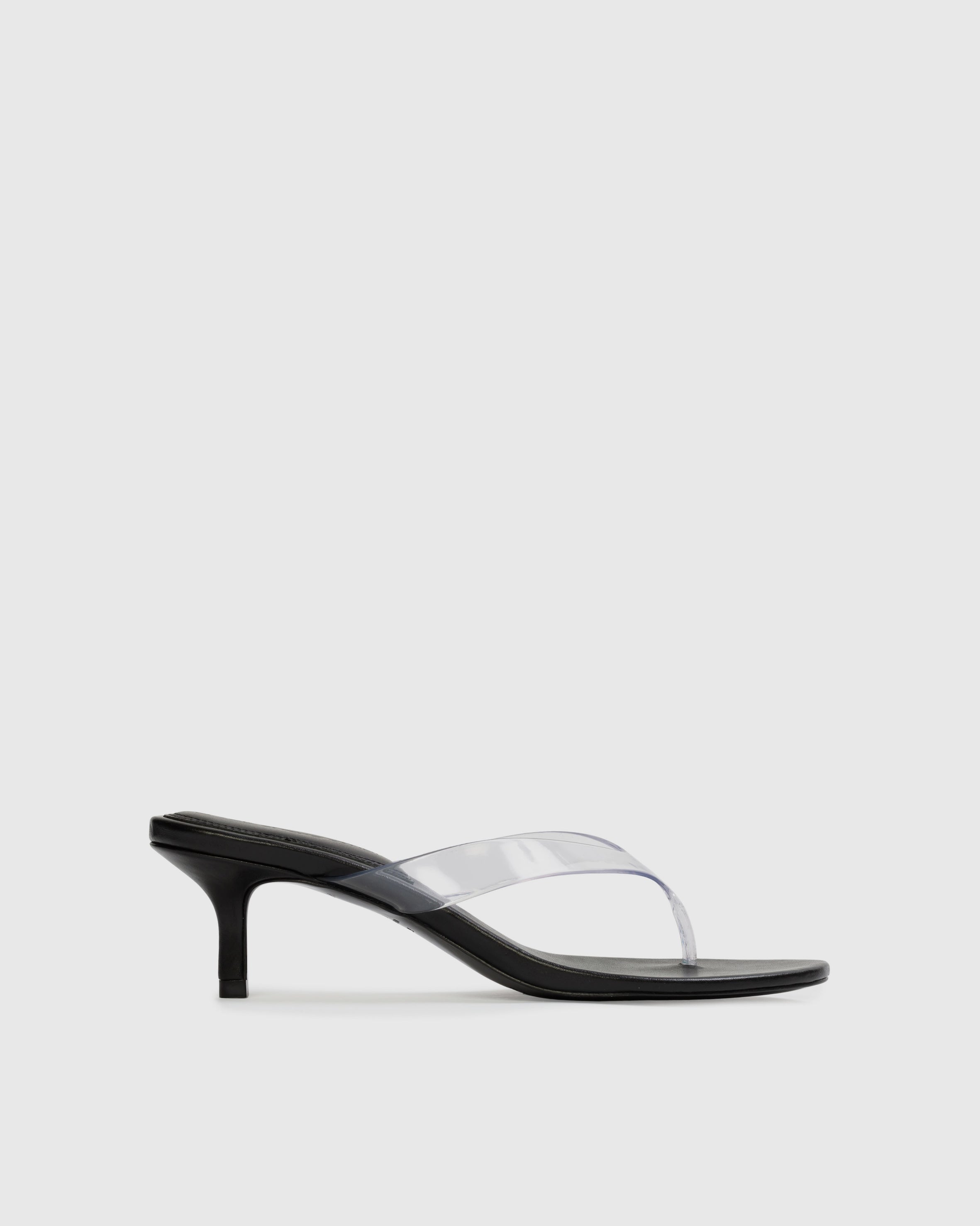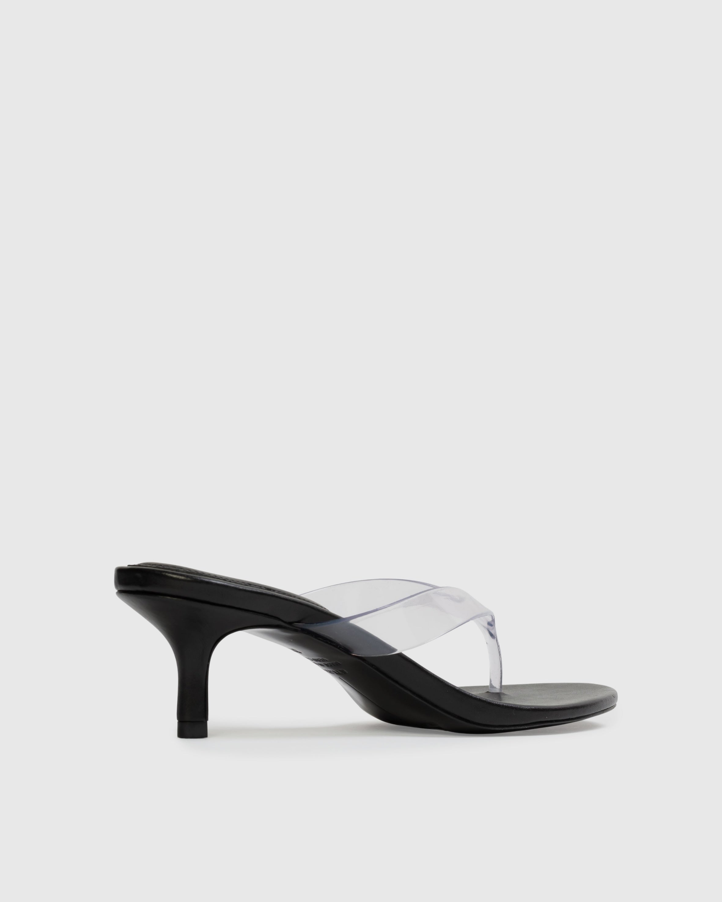 round toe PVC thong slipper mule, set on a curved low heel. Made with smooth buffed leather.