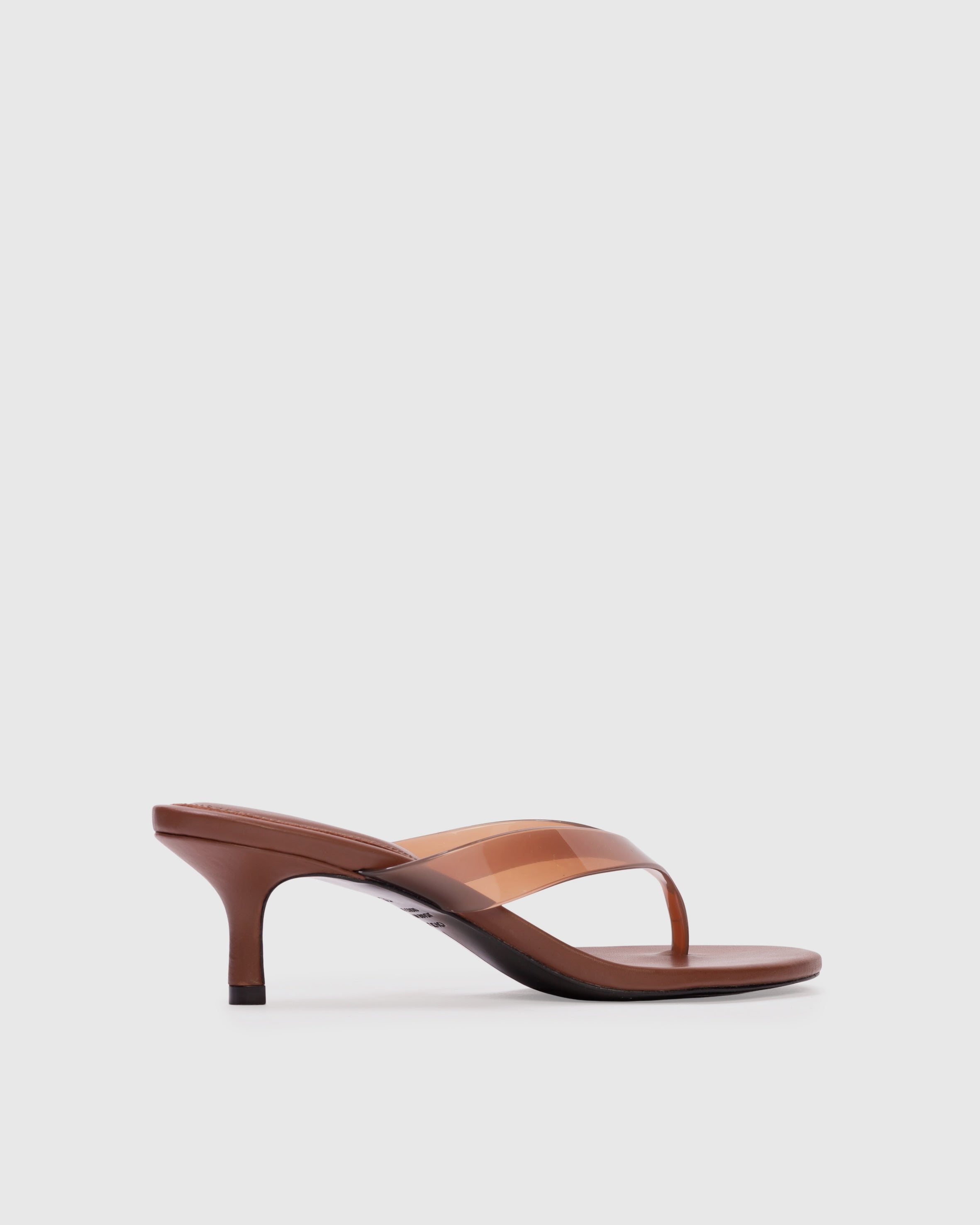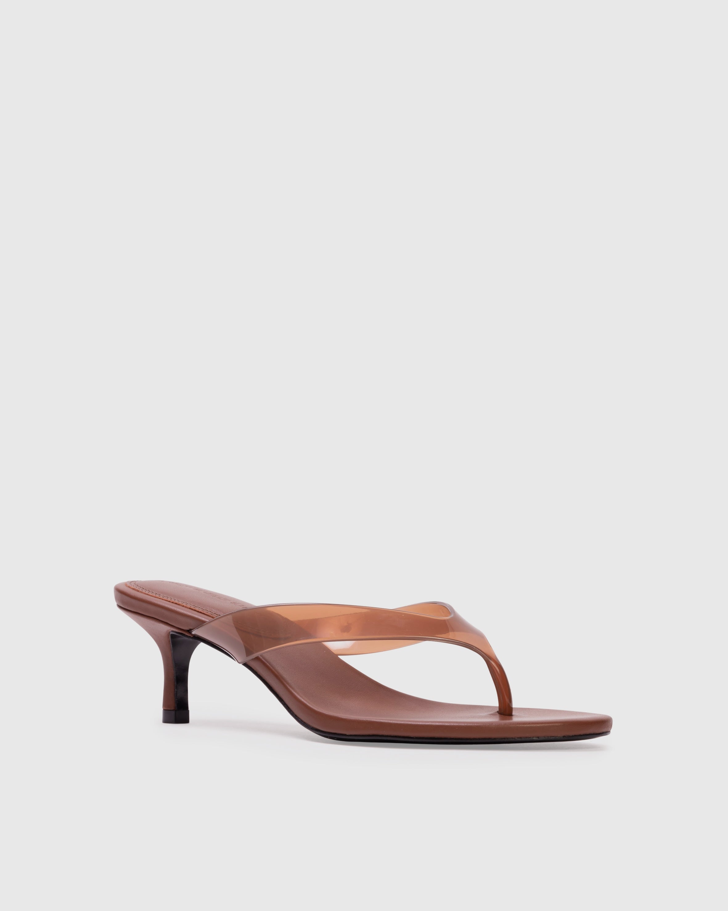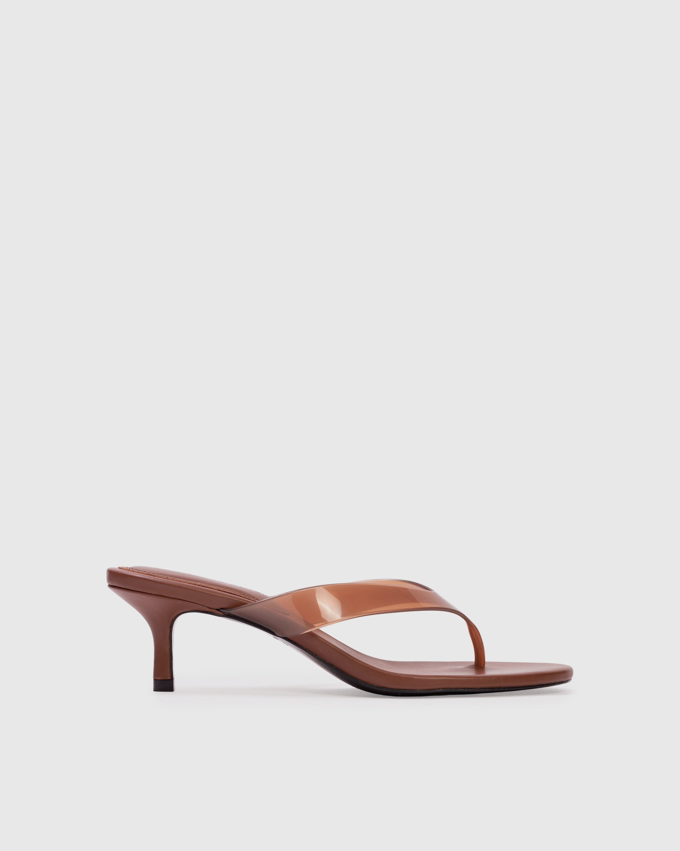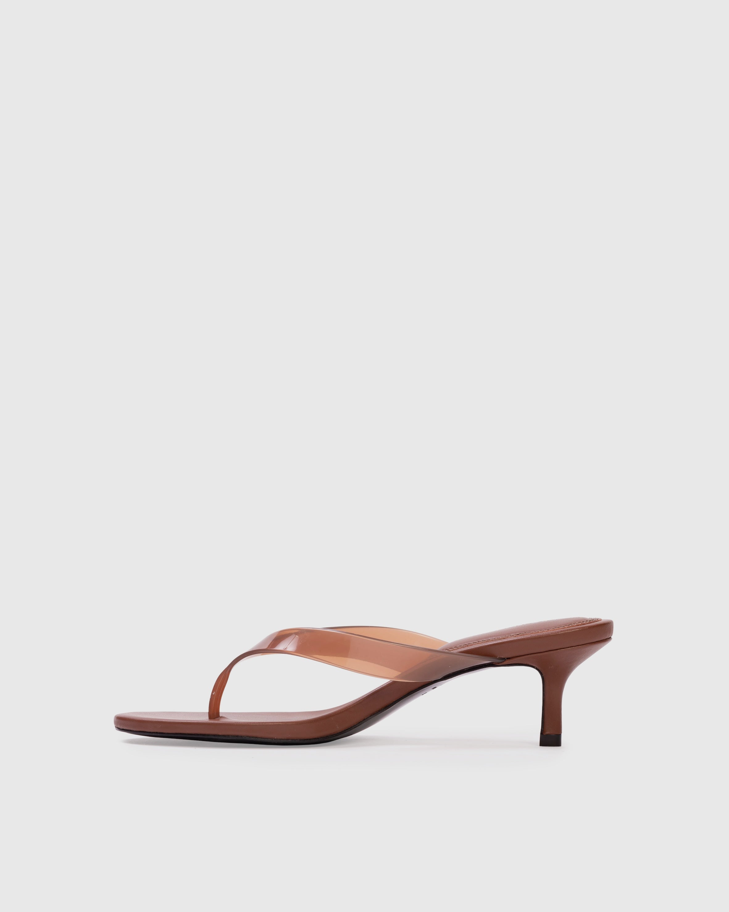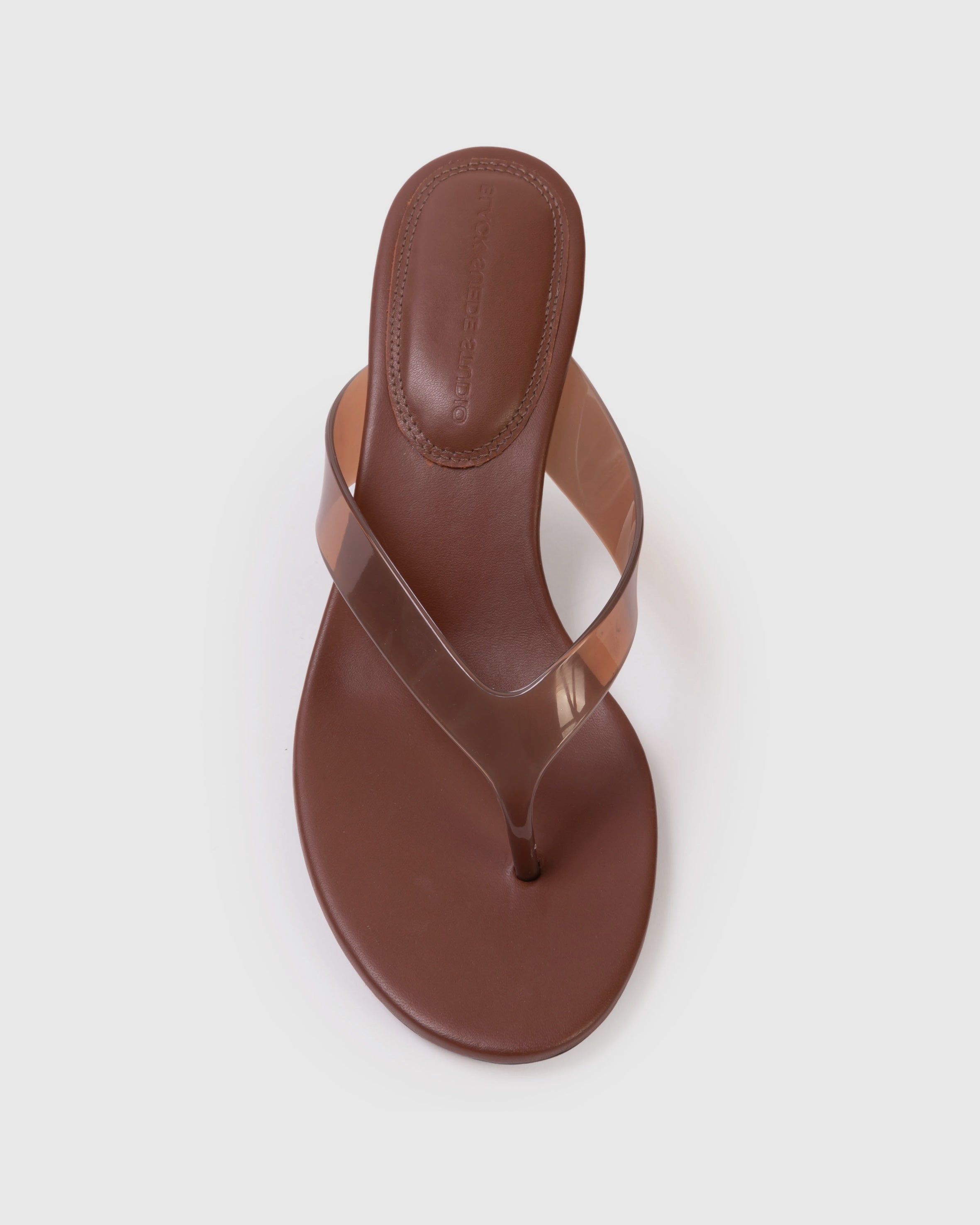 round toe PVC thong slipper mule, set on a curved low heel. Made with smooth buffed leather.