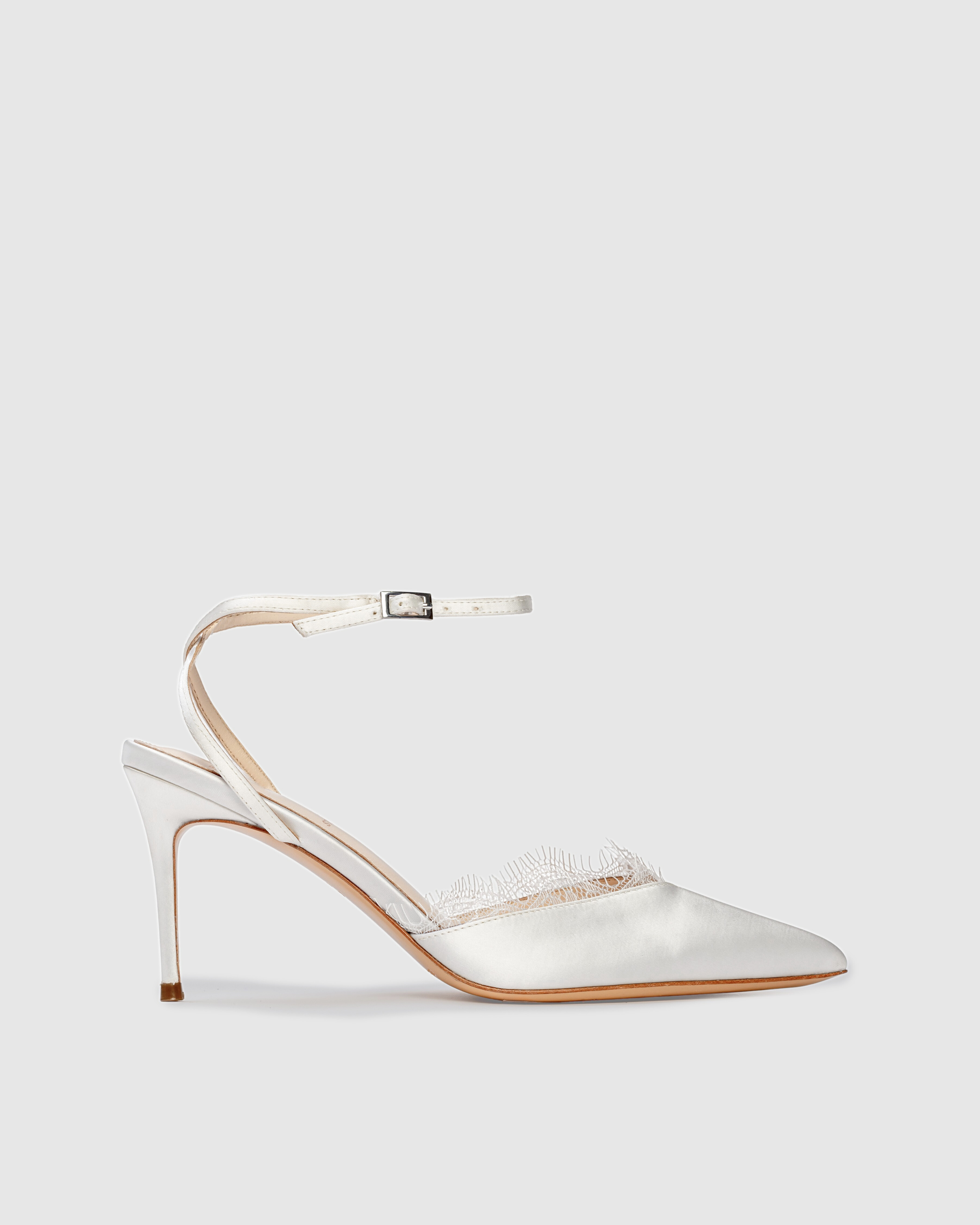 Pointy toe ankle strap pump with lace upper detail, set on a high pin heel. Made with satin crepe.