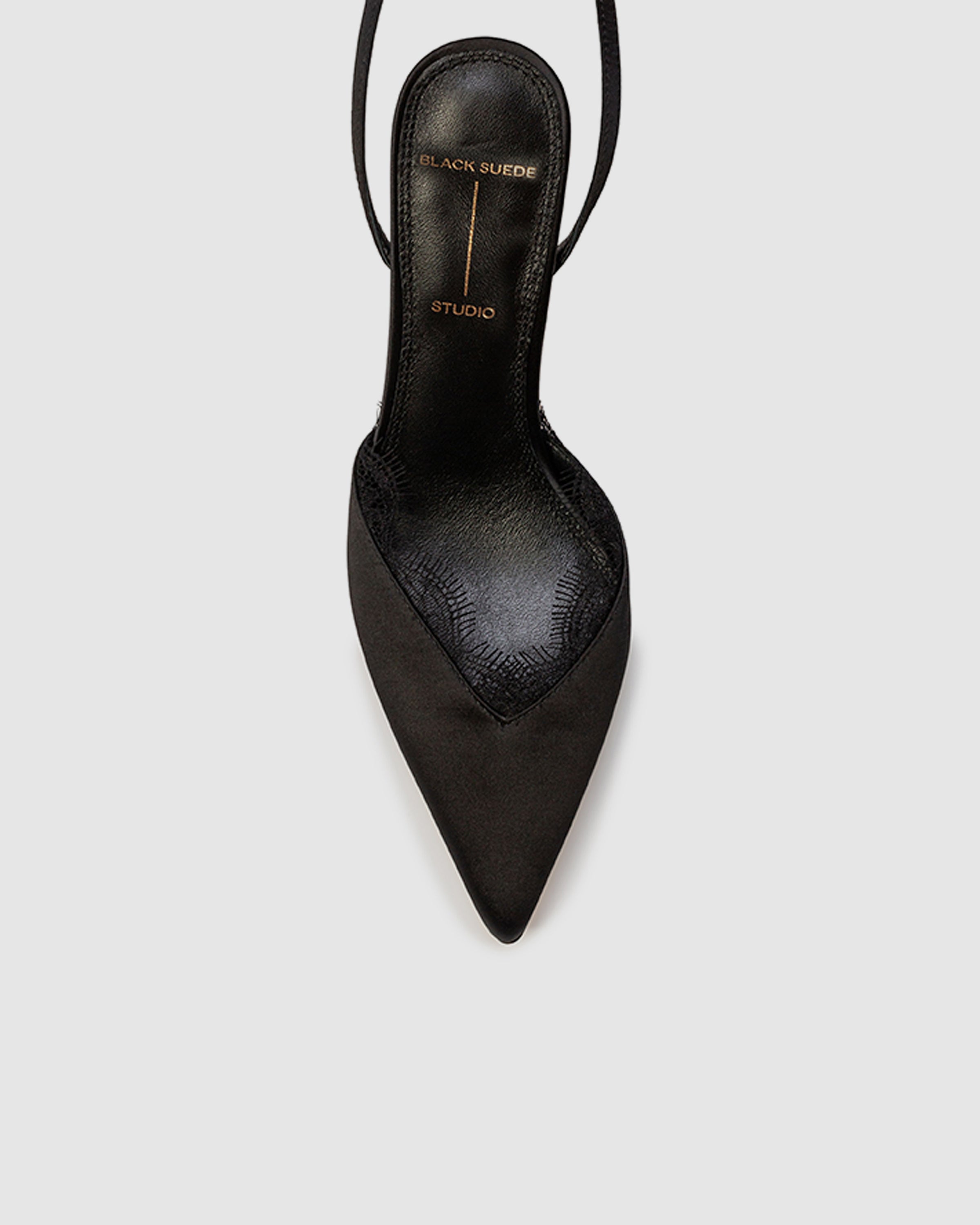 Pointy toe ankle strap pump with lace upper detail, set on a high pin heel. Made with satin crepe.