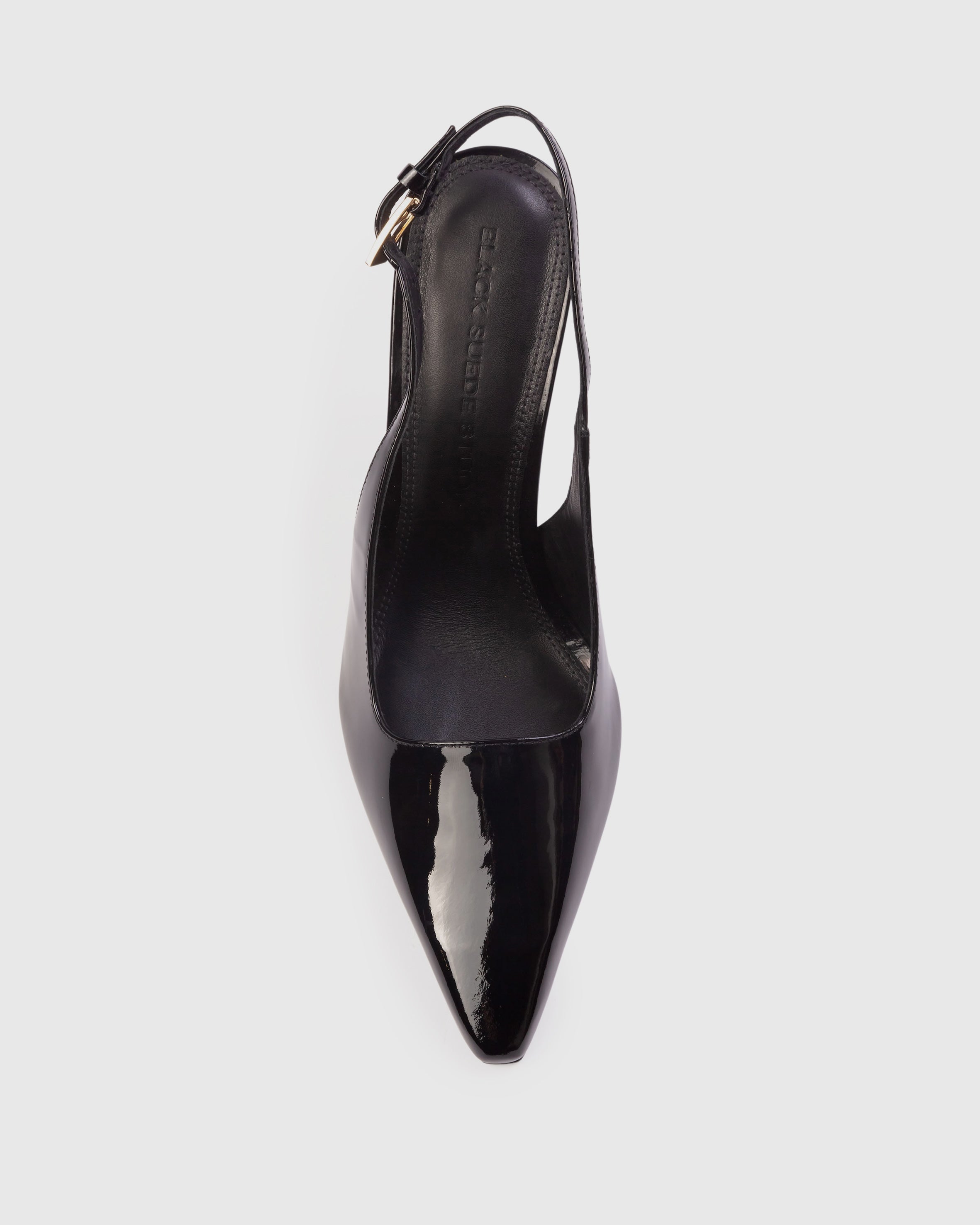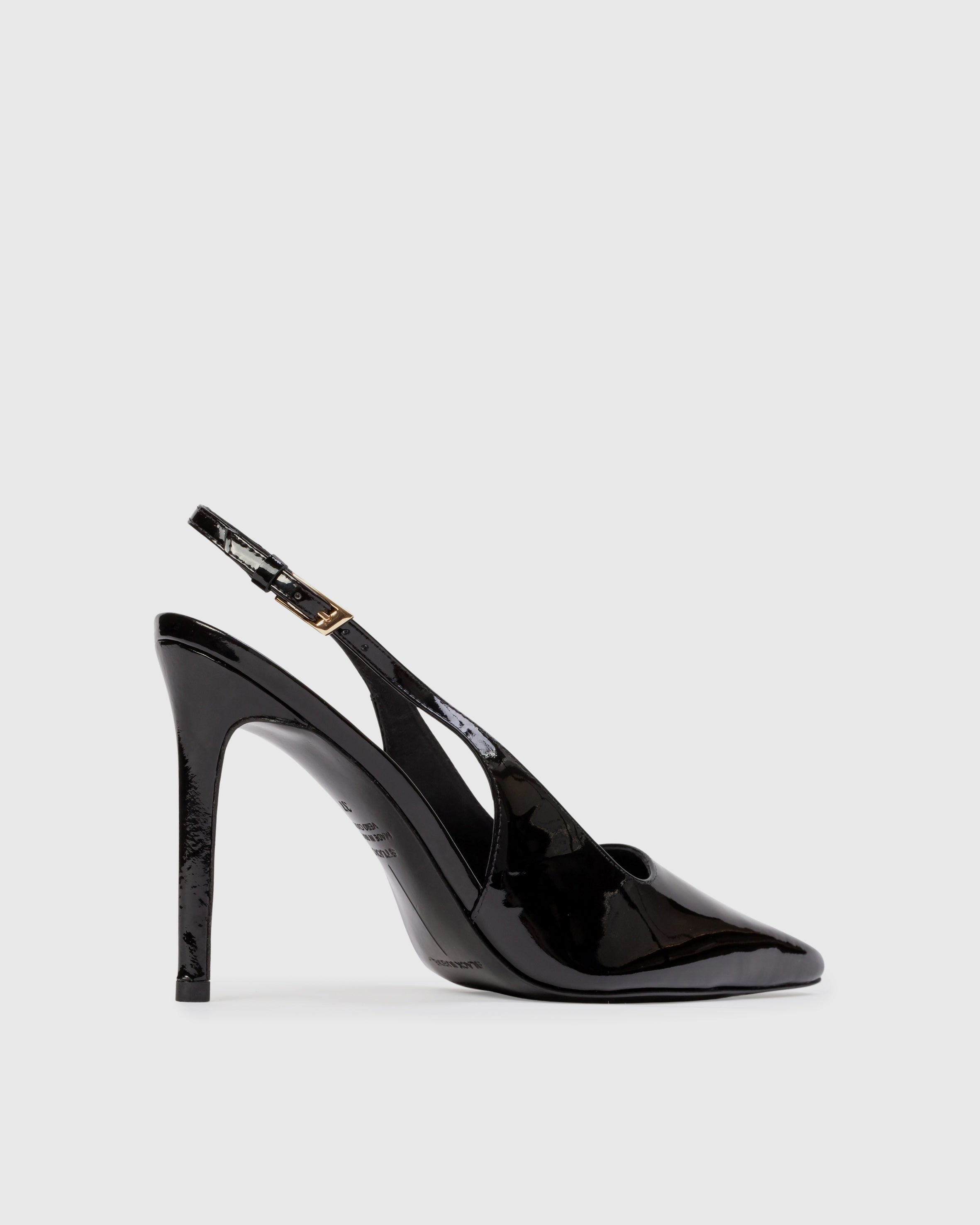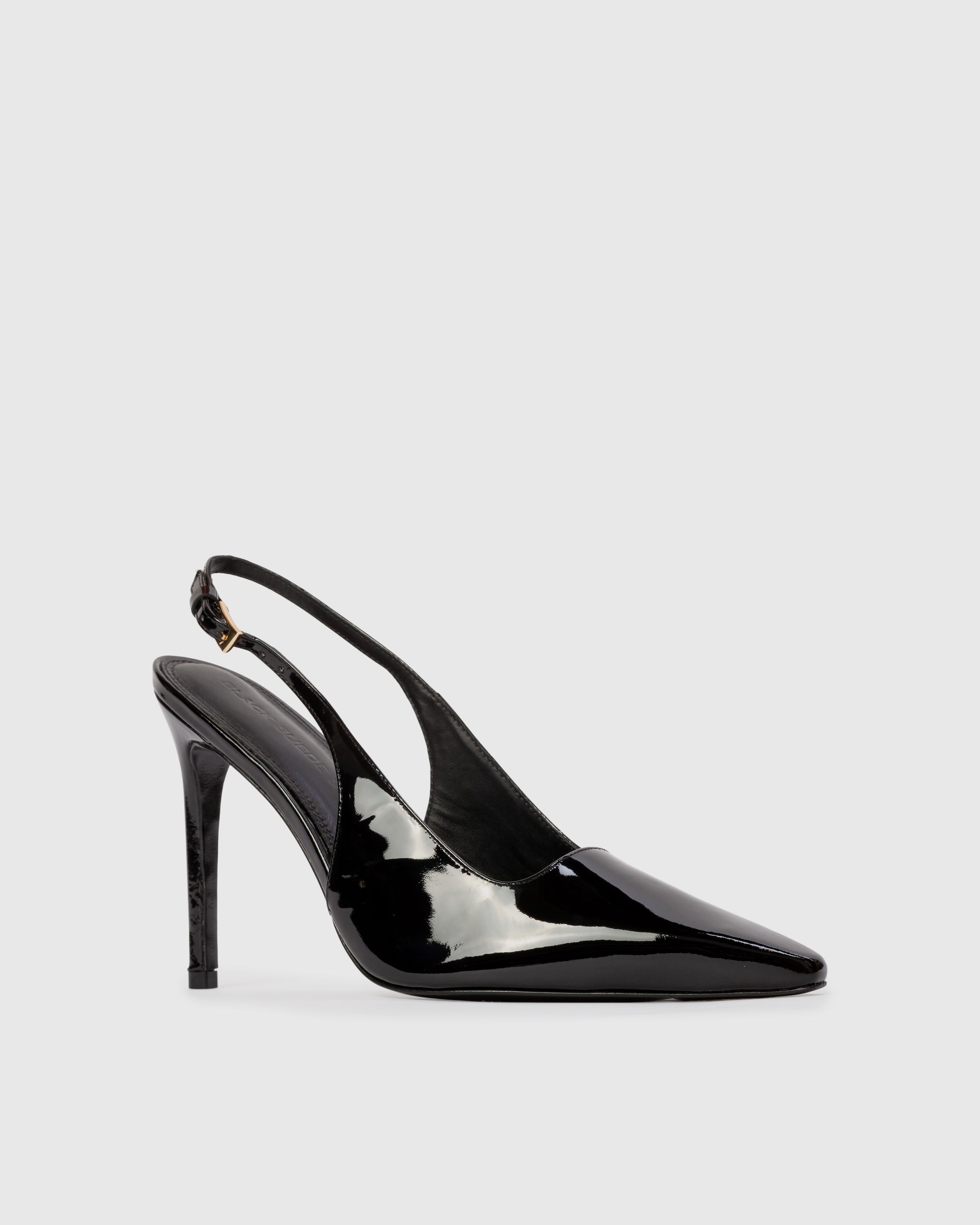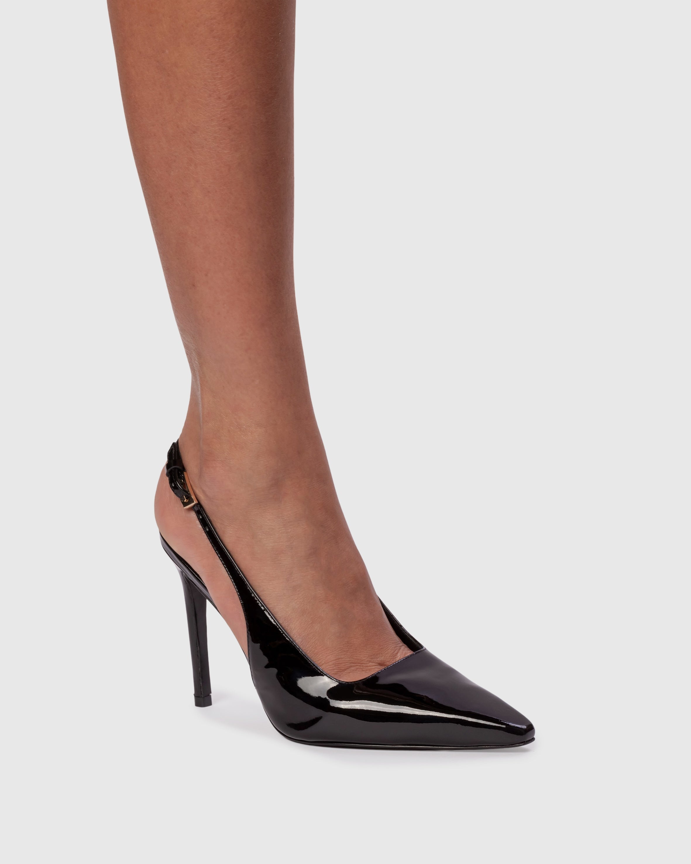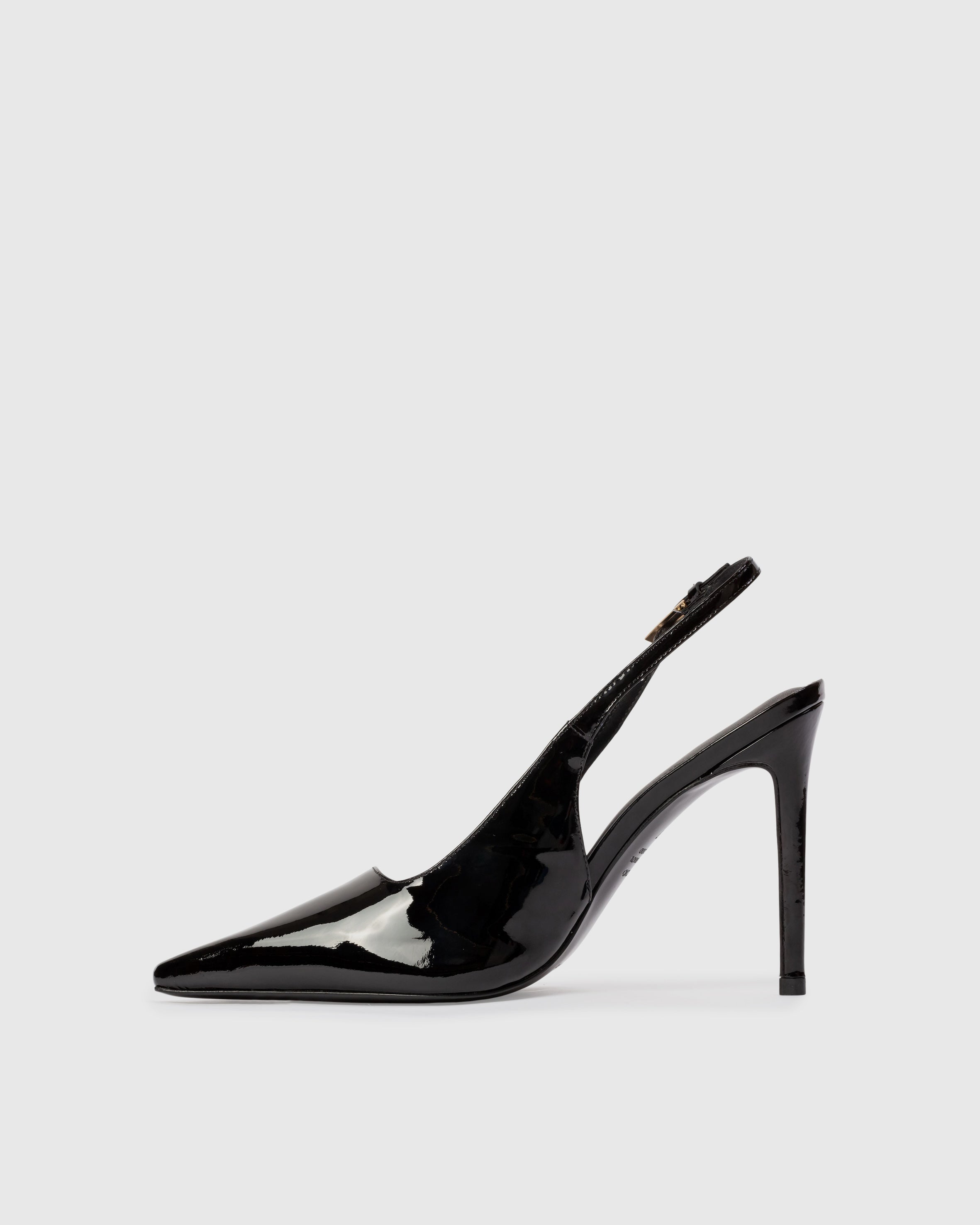 Snip toe slingback pump with a squared throat line, set on a straight stiletto heel. Made with smooth patent leather.
