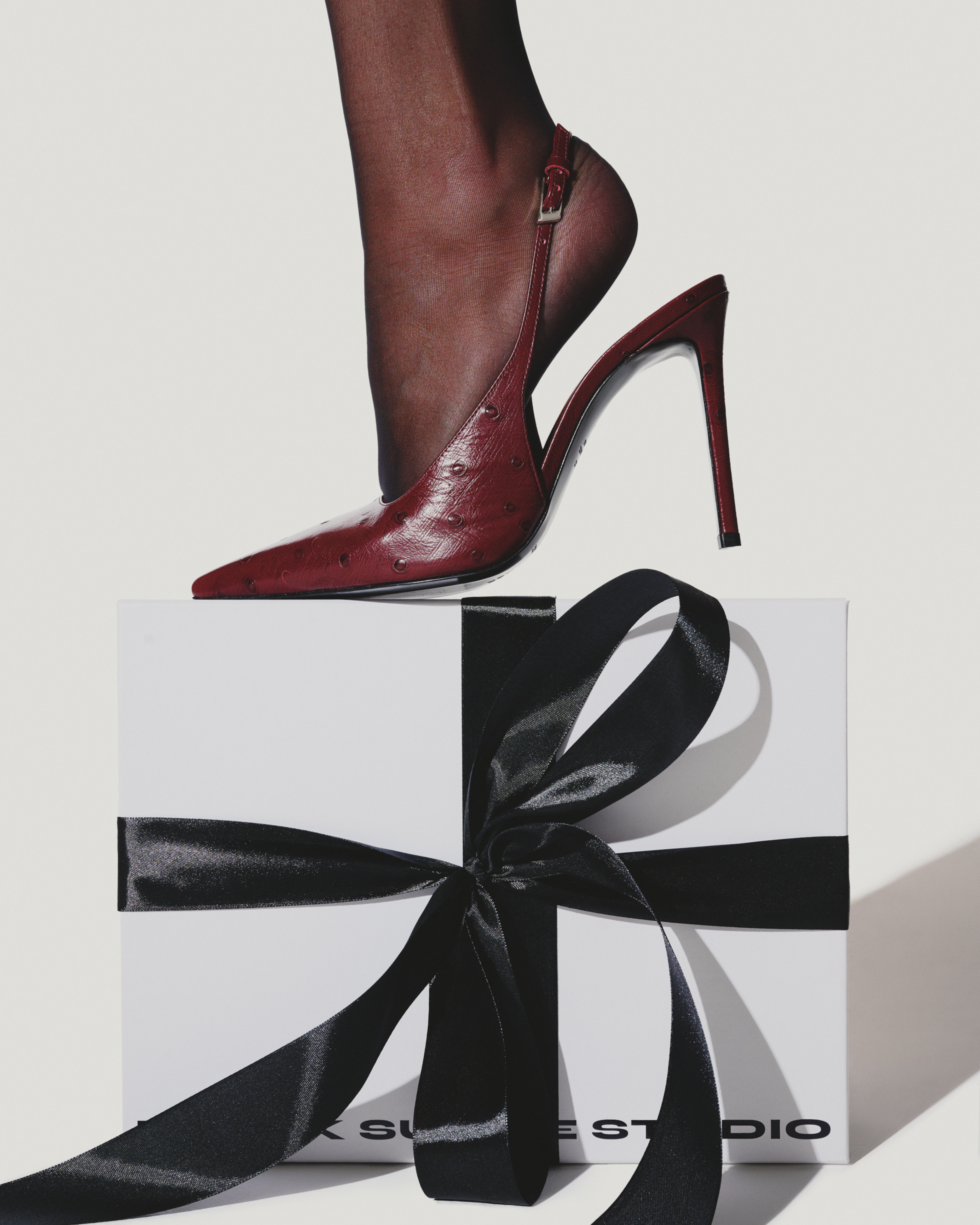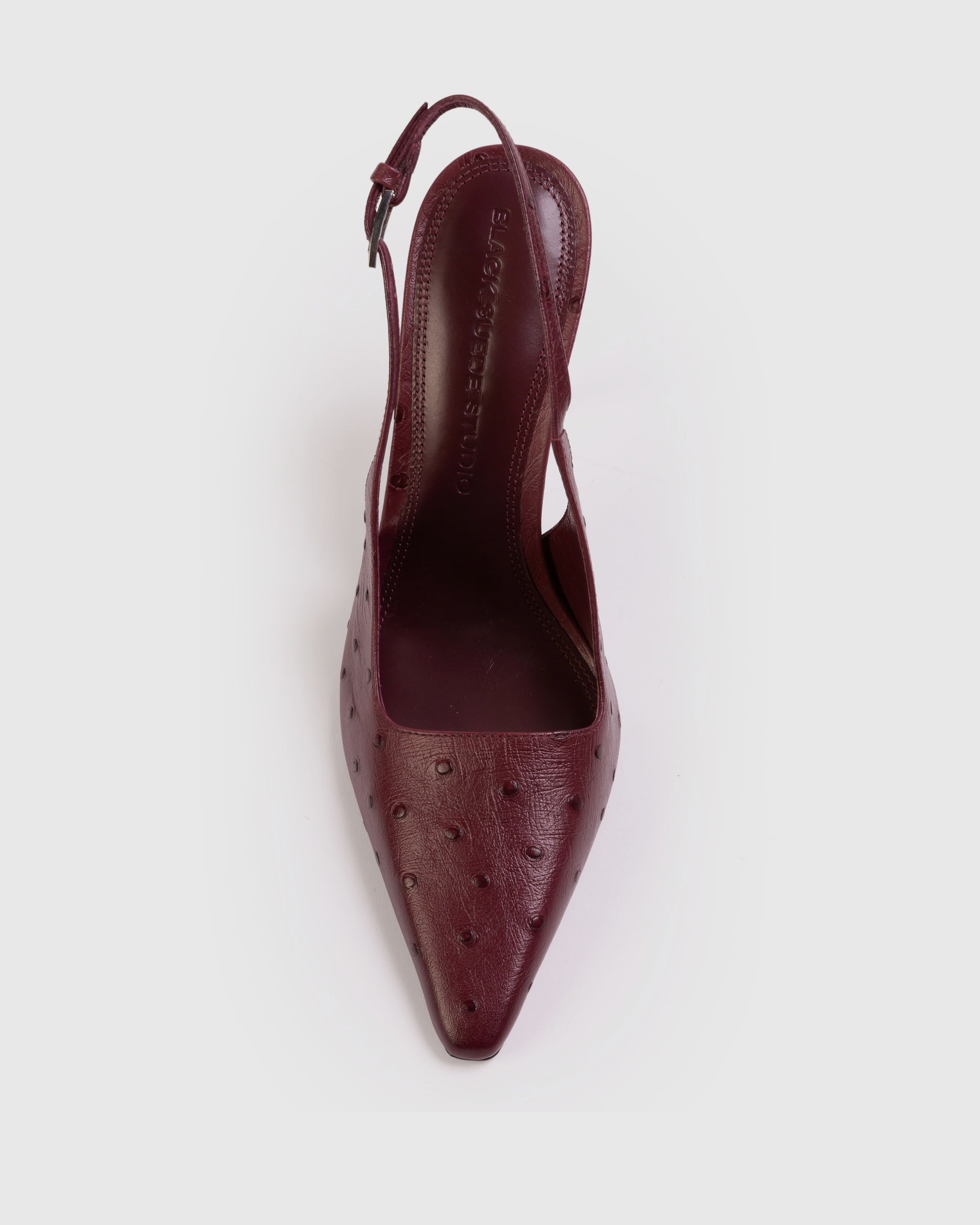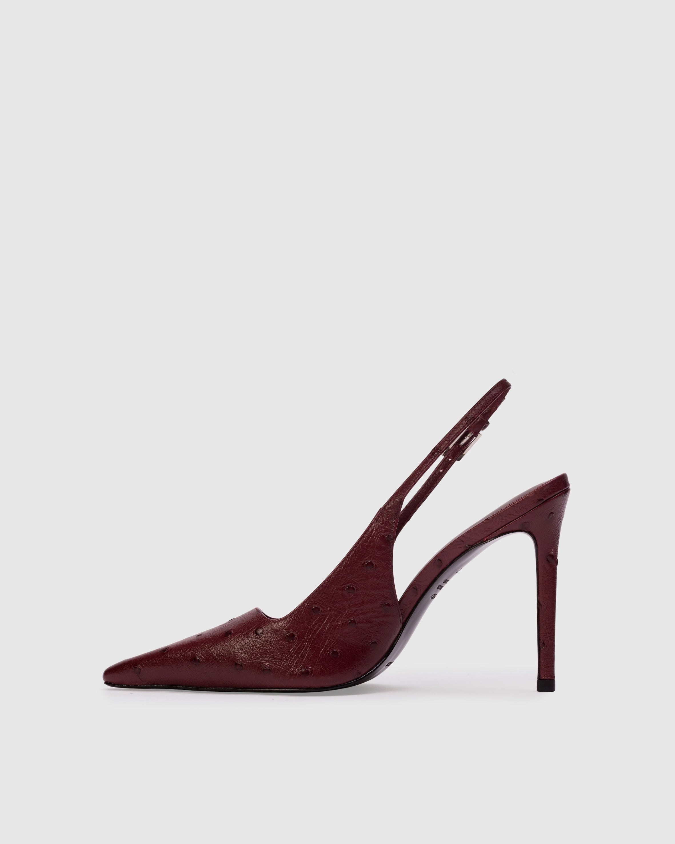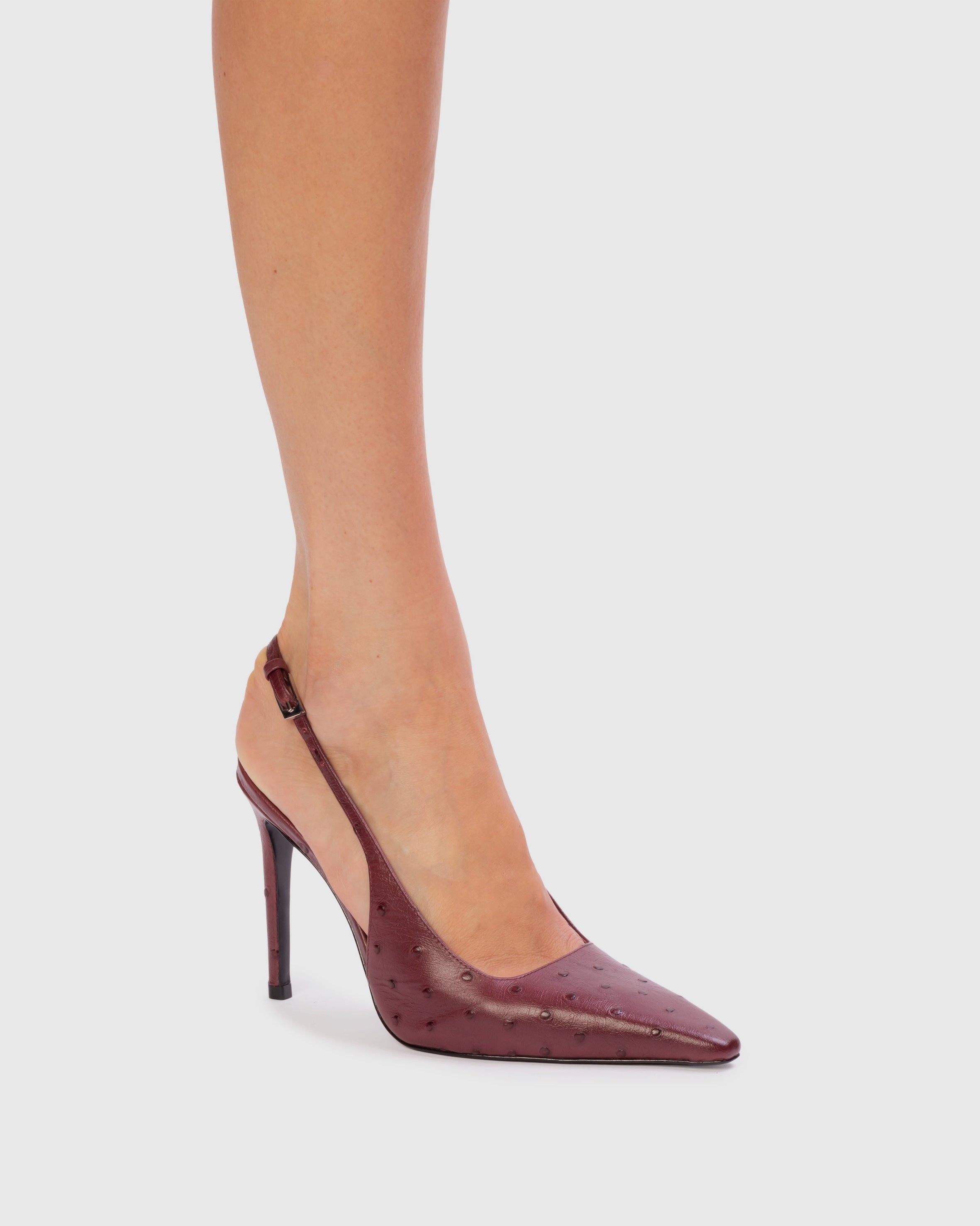 Snip toe slingback pump with a squared throat line, set on a straight stiletto heel. Made with ostrich print leather.