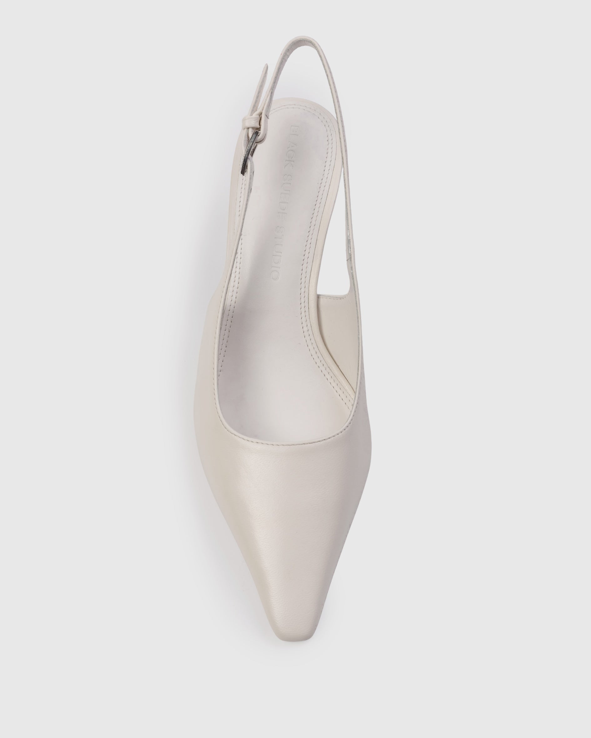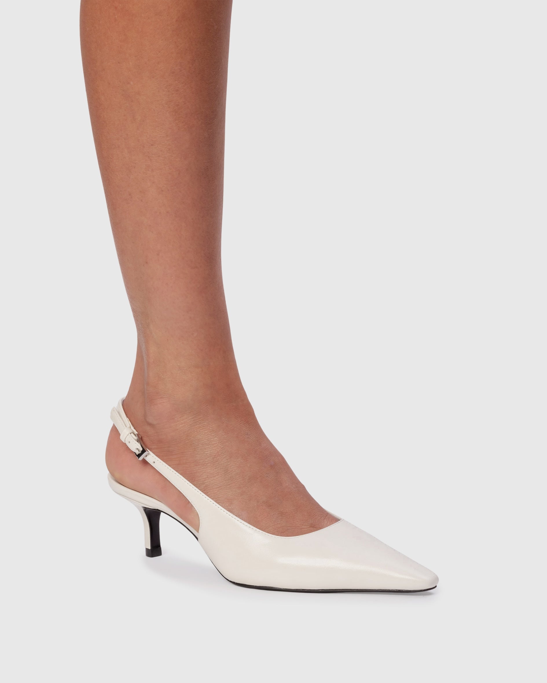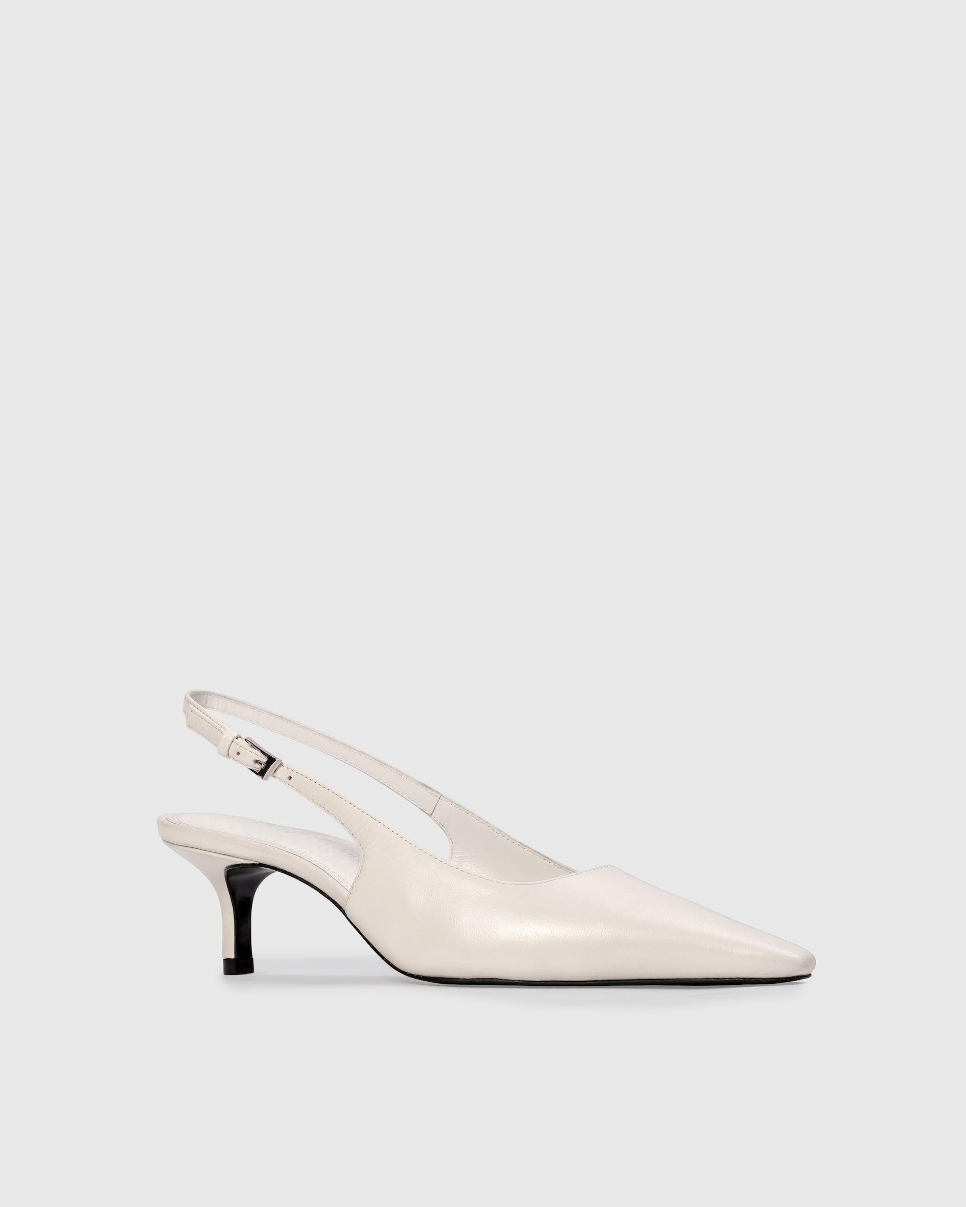 Snip toe slingback pump with a squared throat line, set on a straight mid heel. Made with smooth buffed leather.