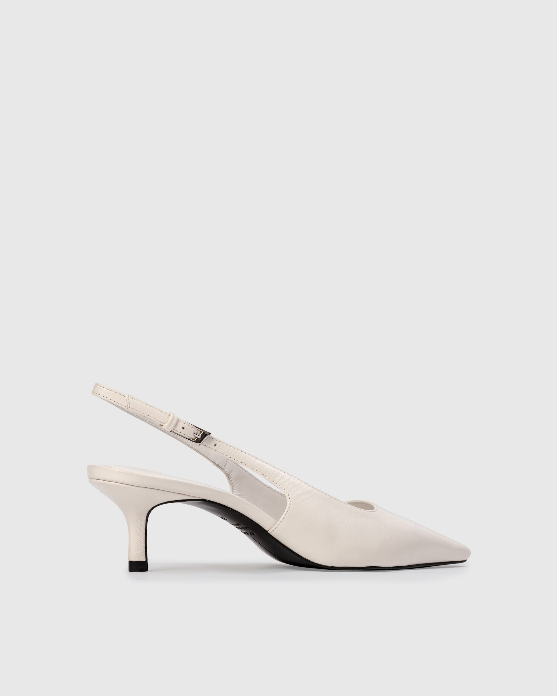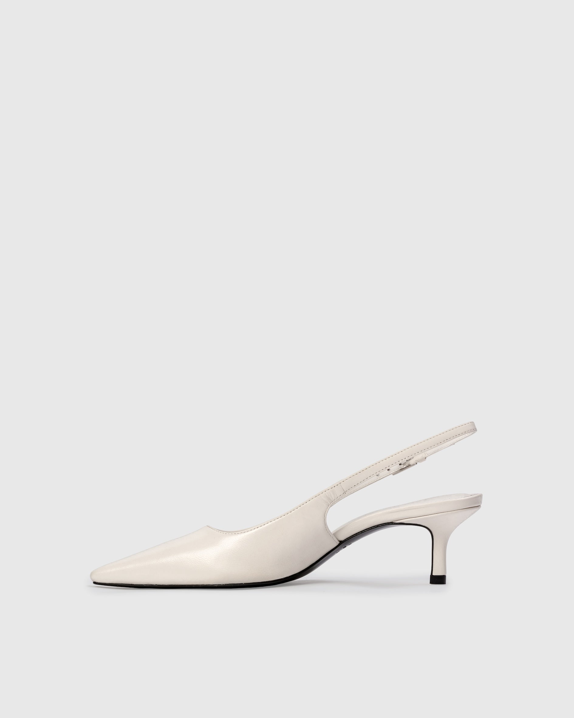 Snip toe slingback pump with a squared throat line, set on a straight mid heel