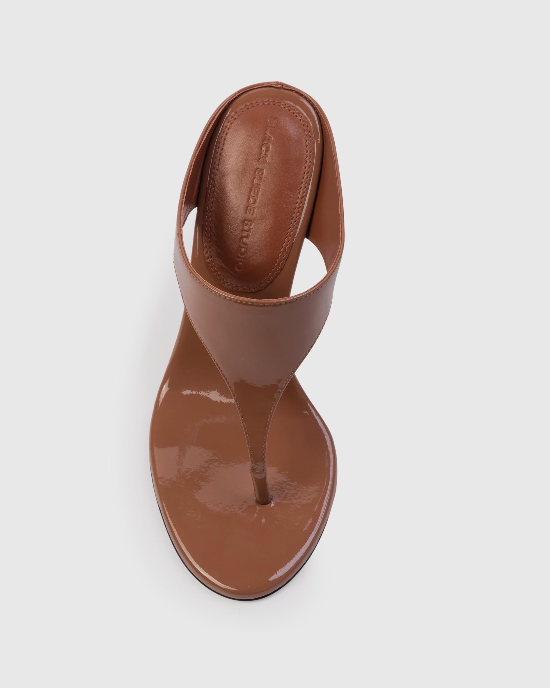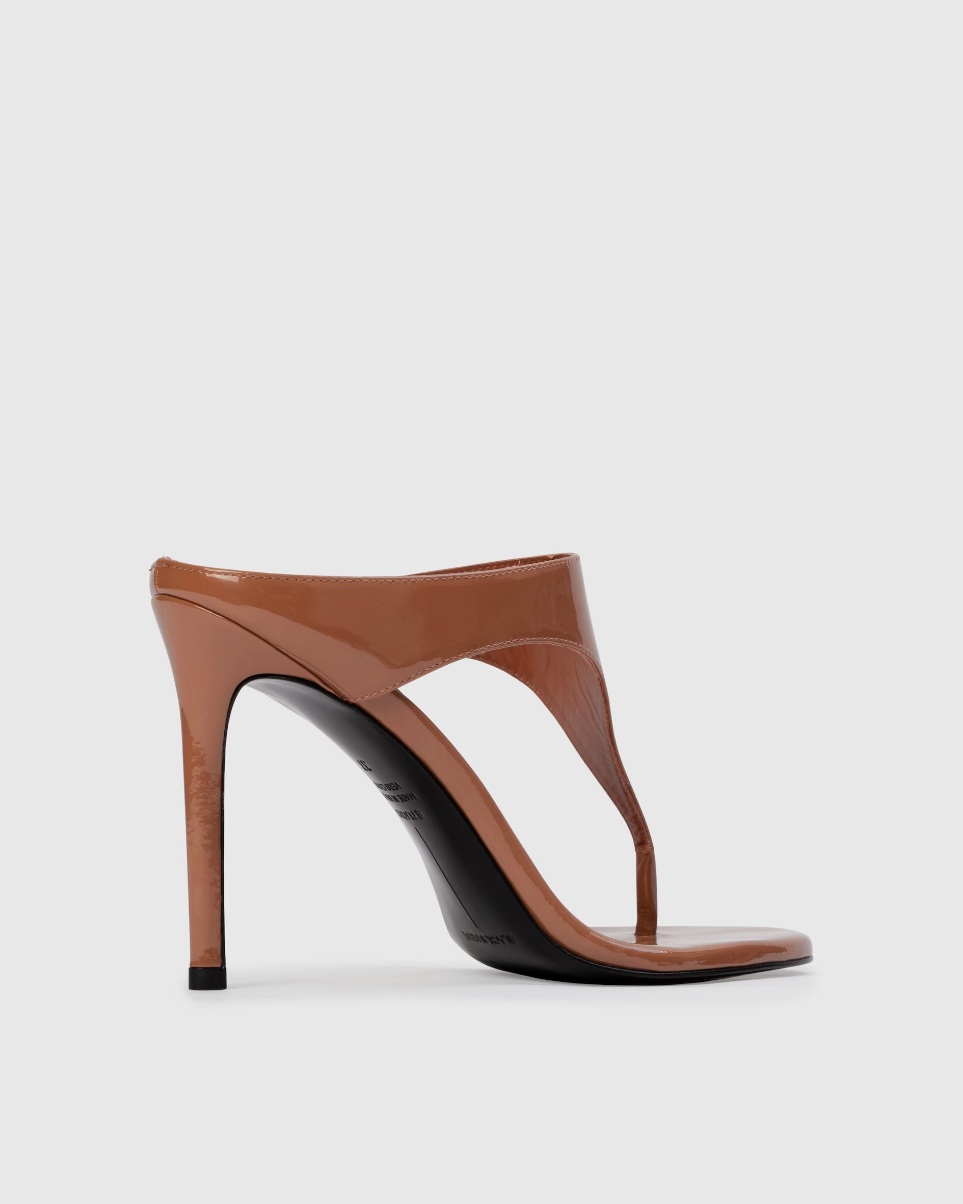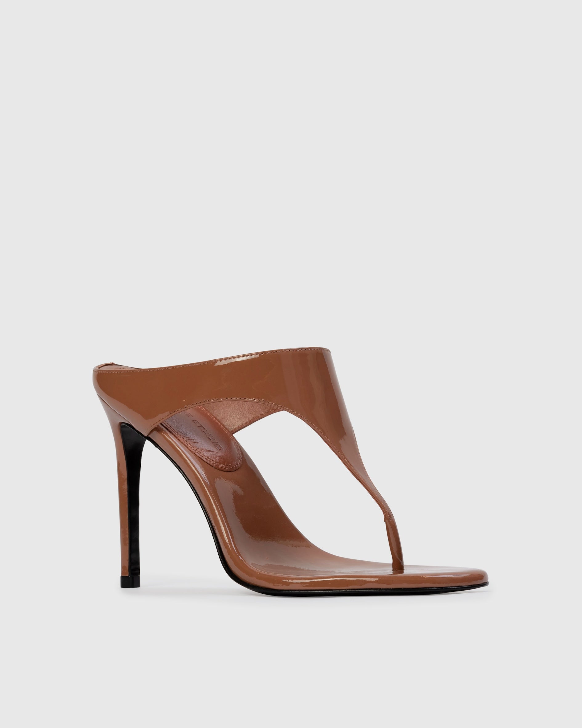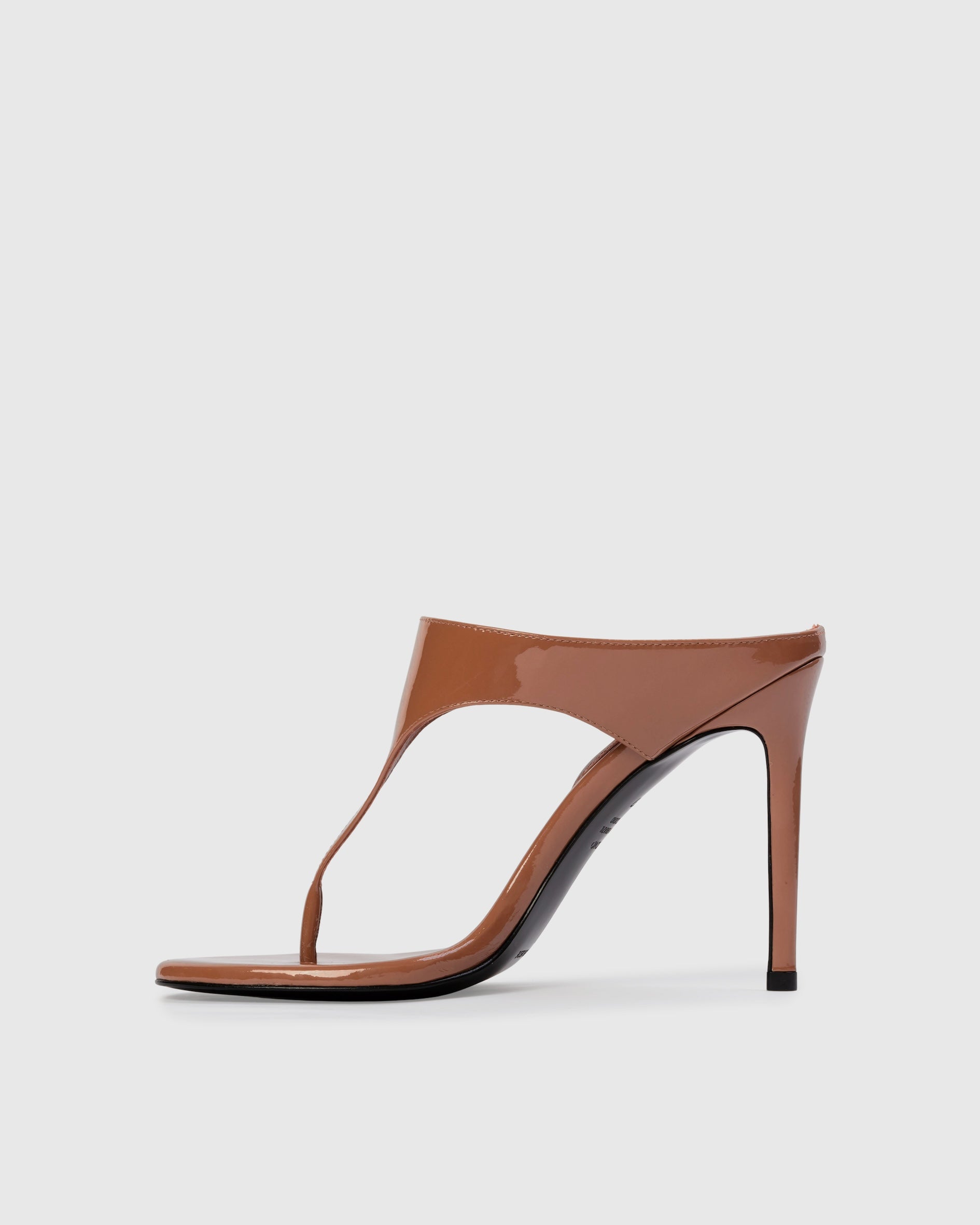 Round toe slip-on thong mule, set on a straight stiletto heel. Made with smooth patent leather.