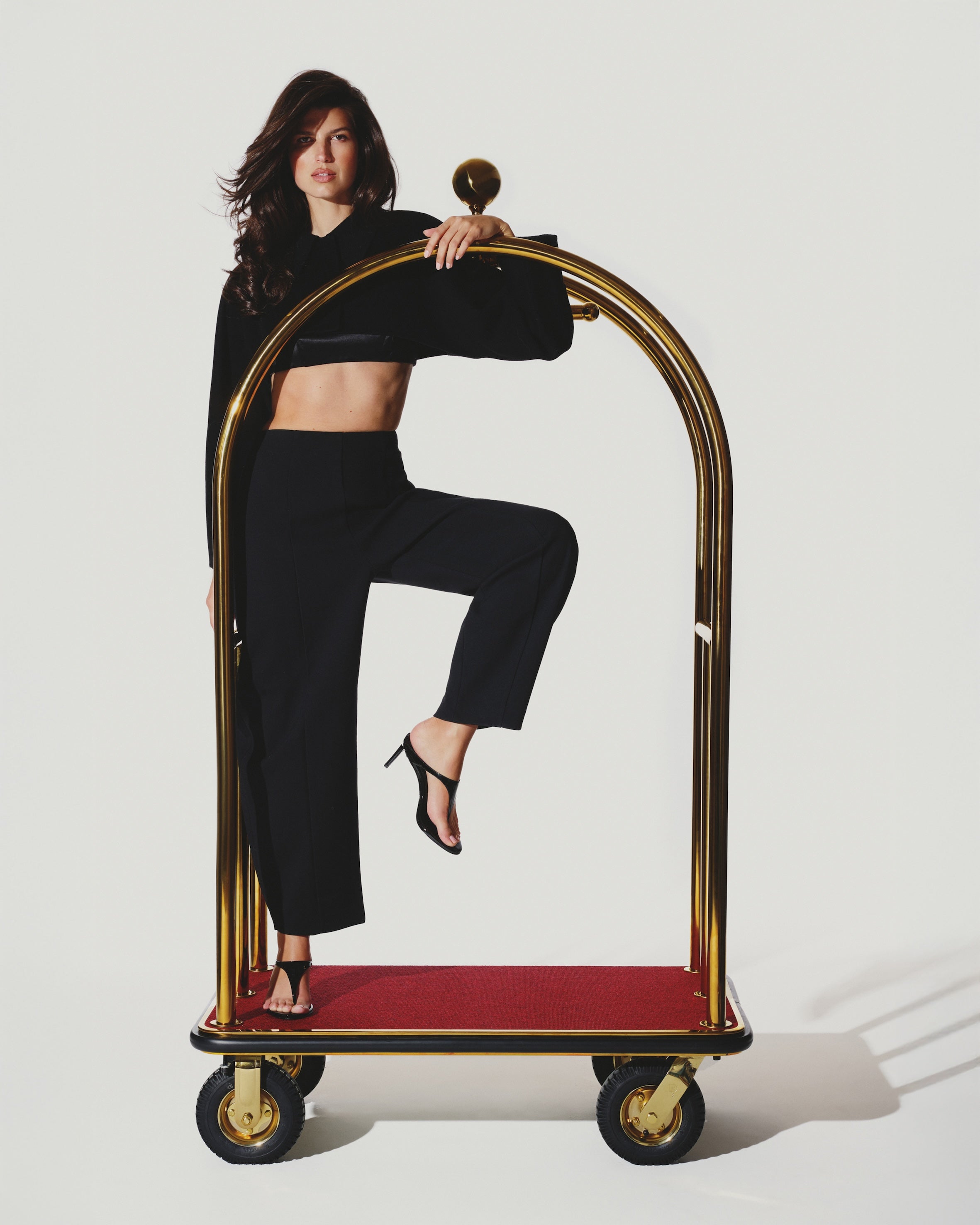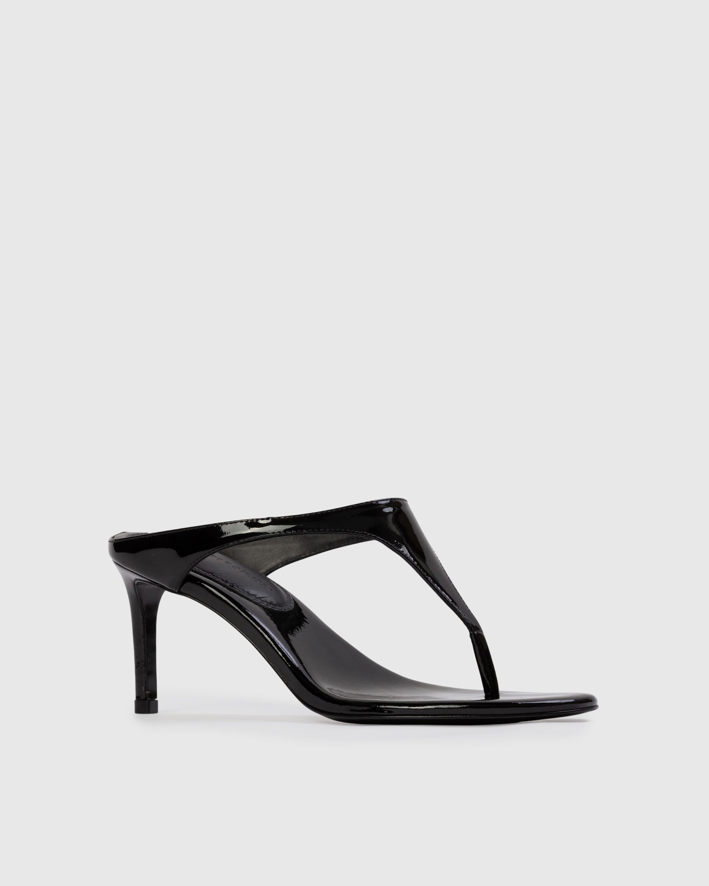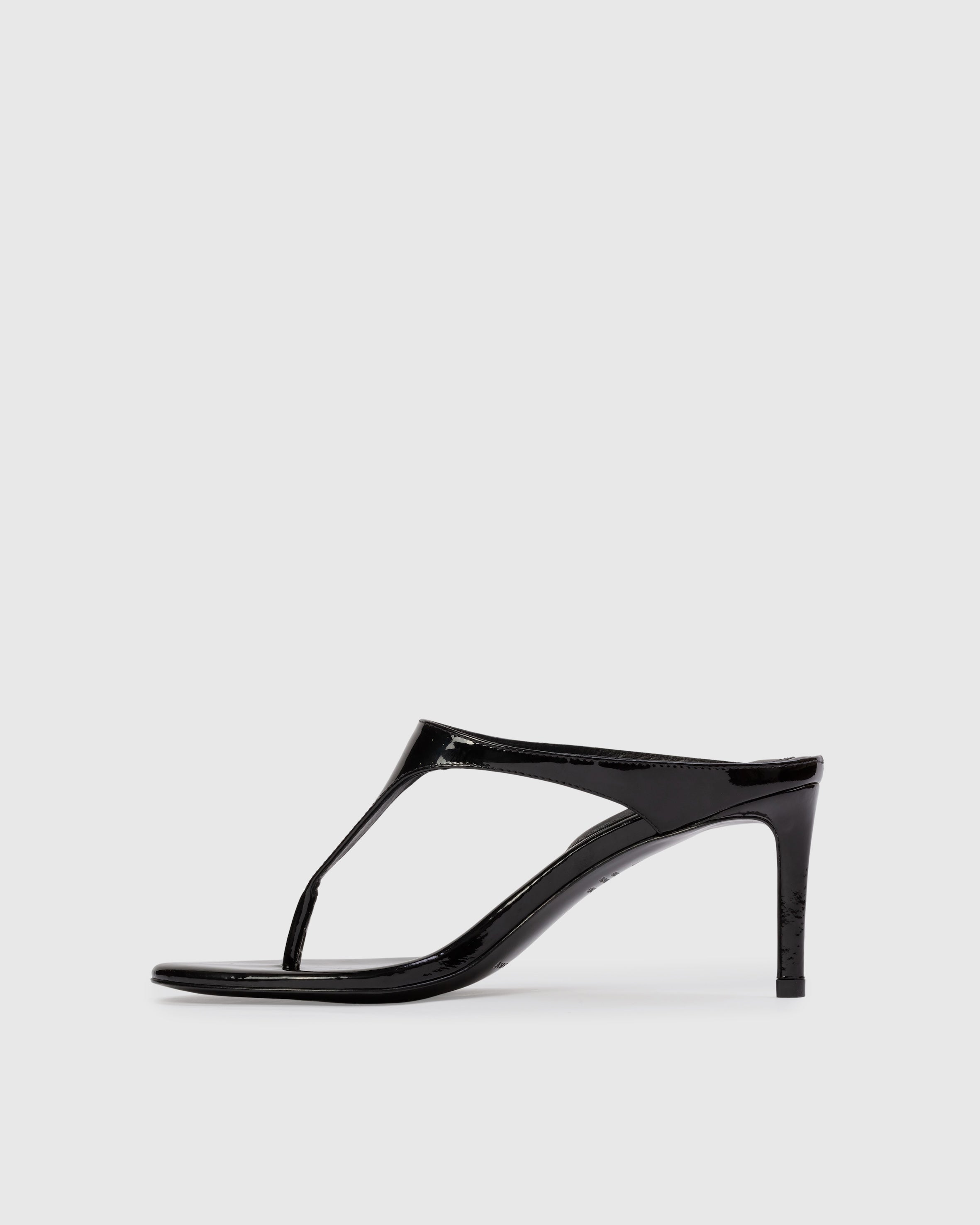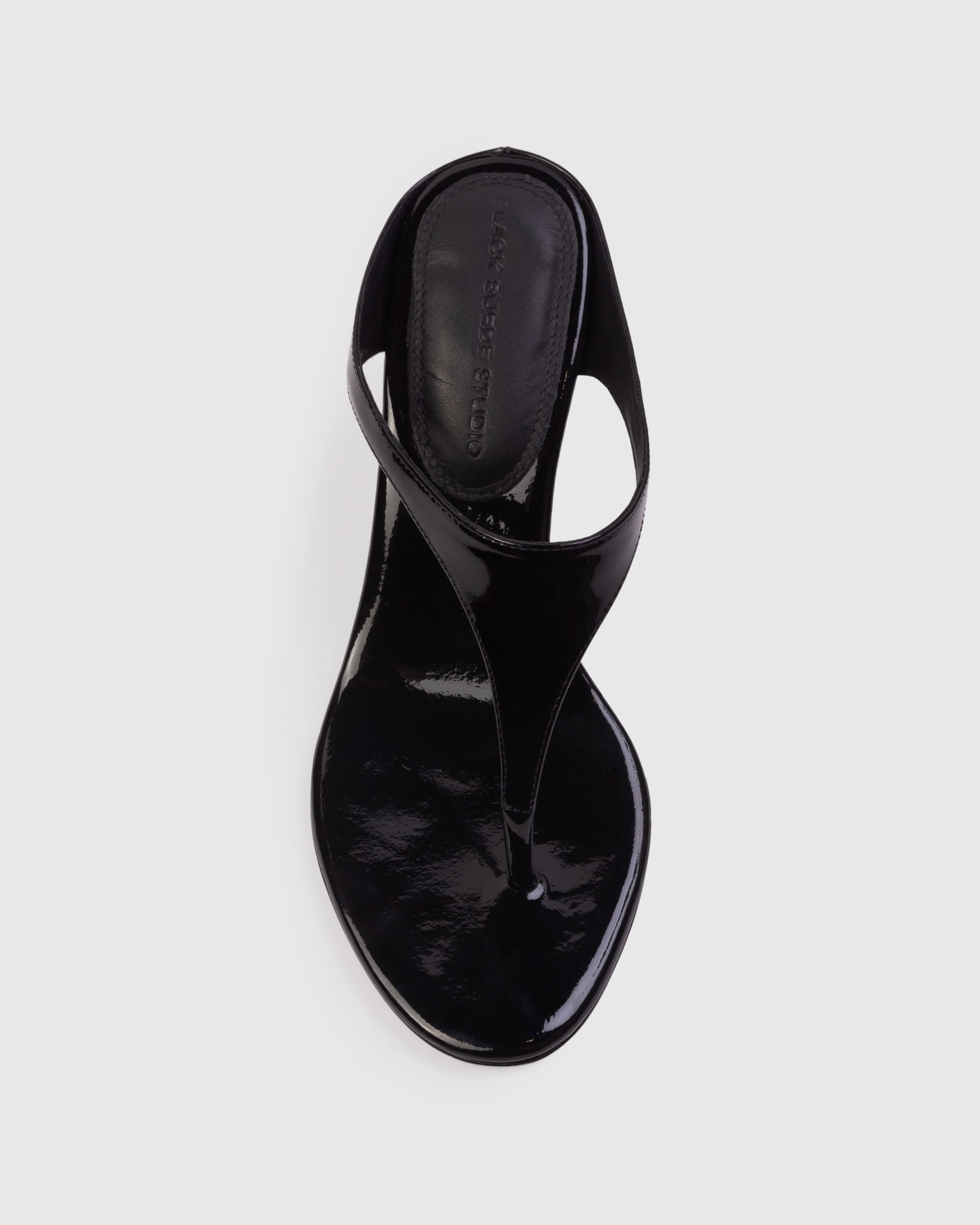 Round toe slip-on thong mule, set on a straight mid heel. Made with smooth patent leather.