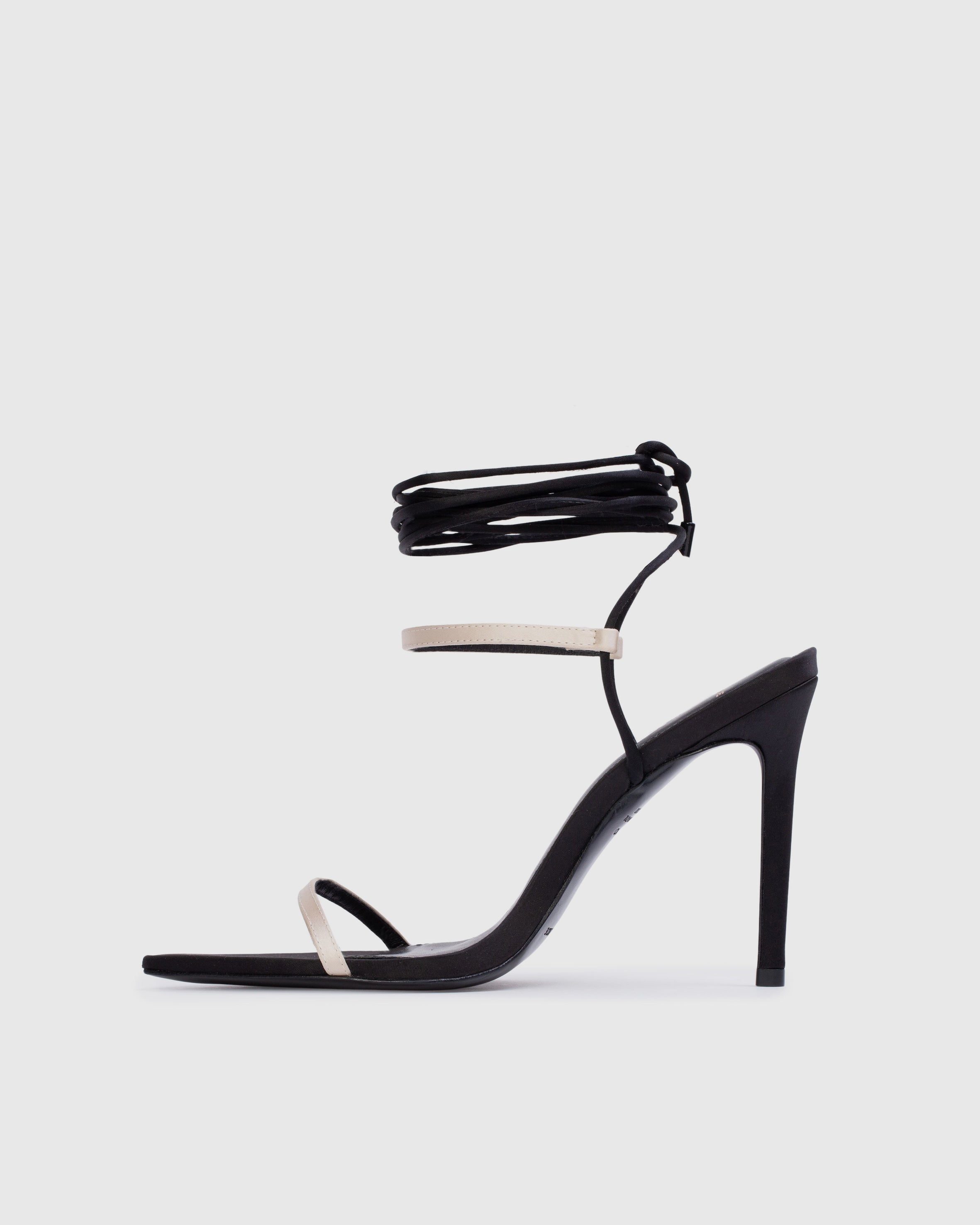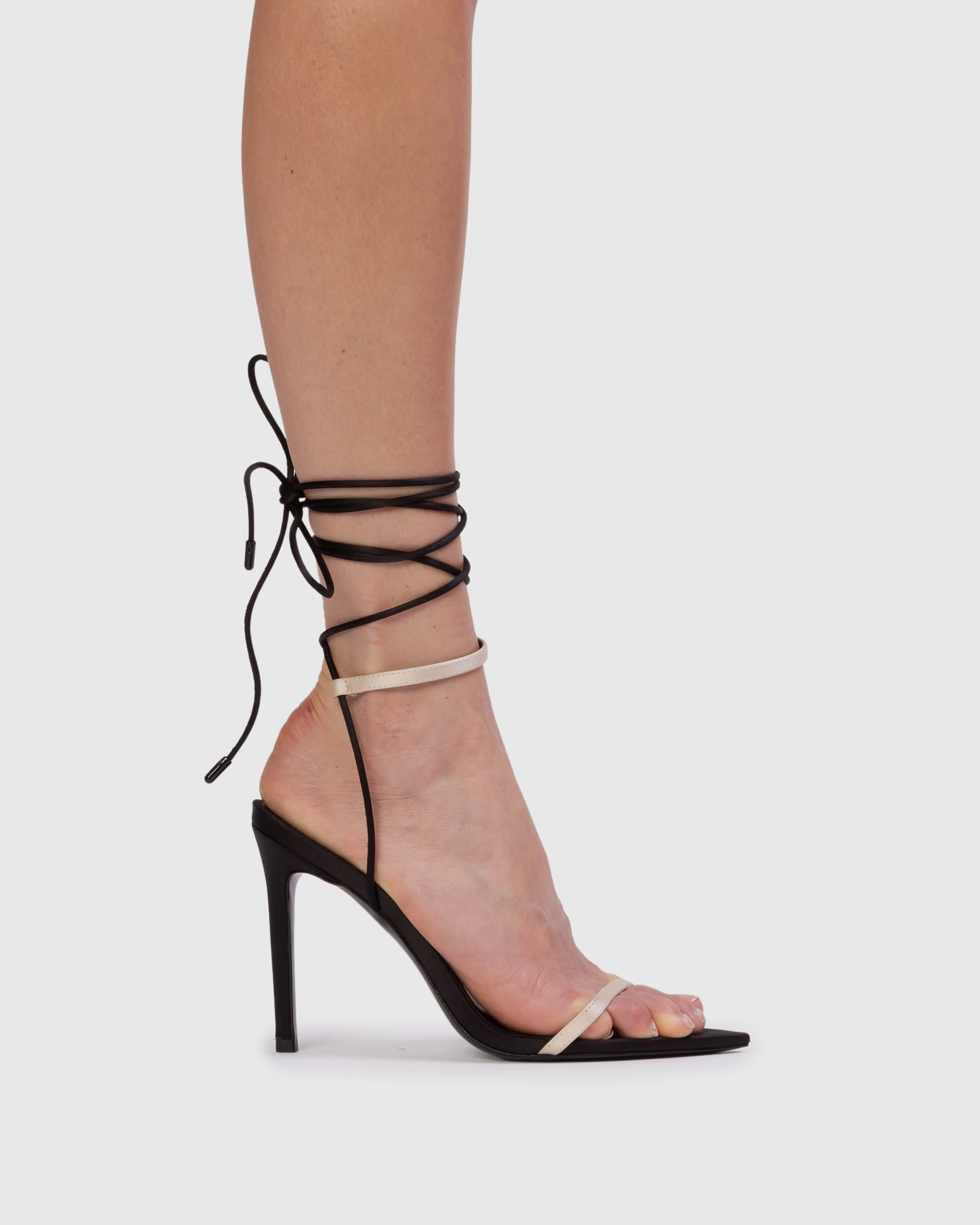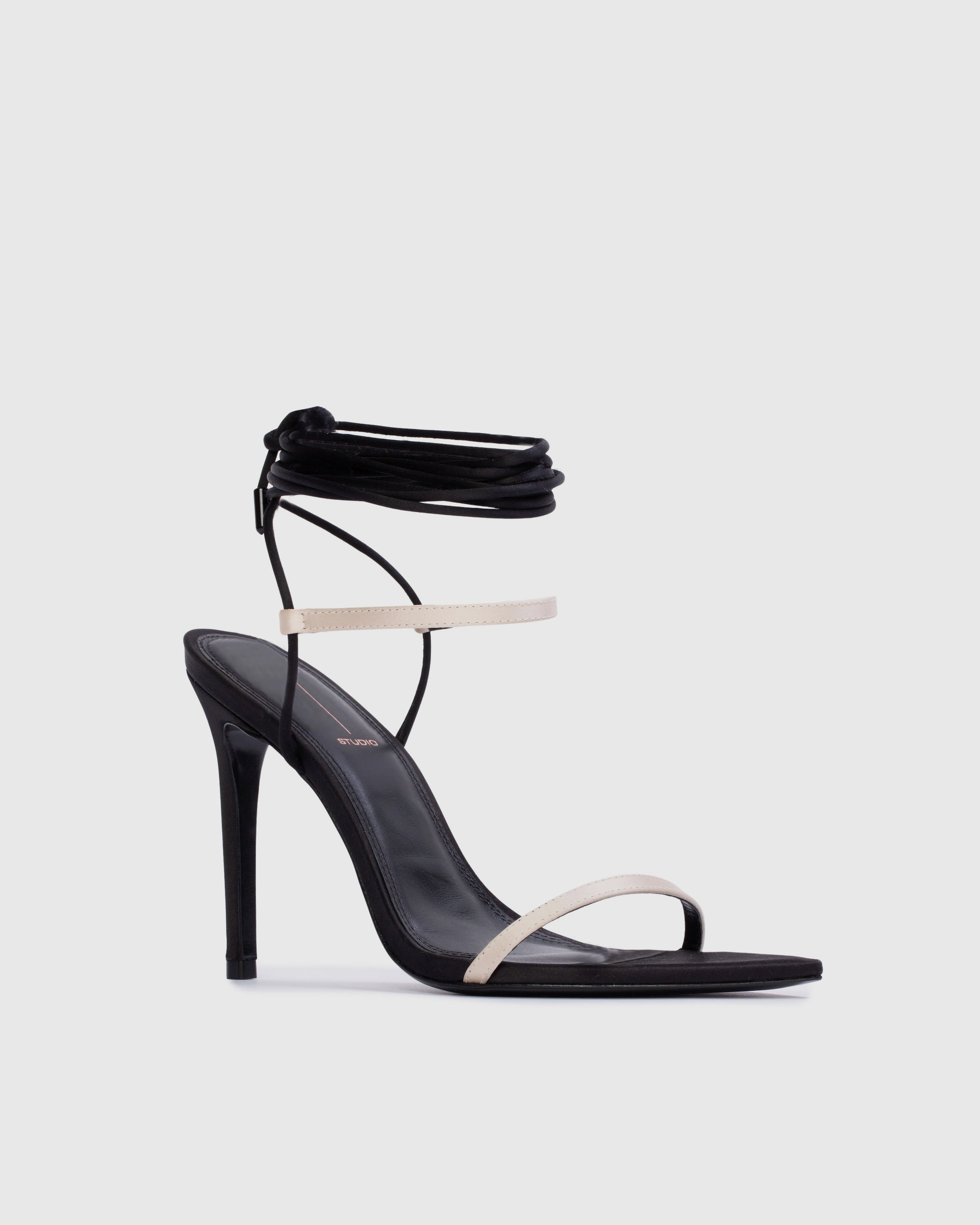 pointy toe wrap-up sandal, set on a straight stiletto heel. made with satin crepe.