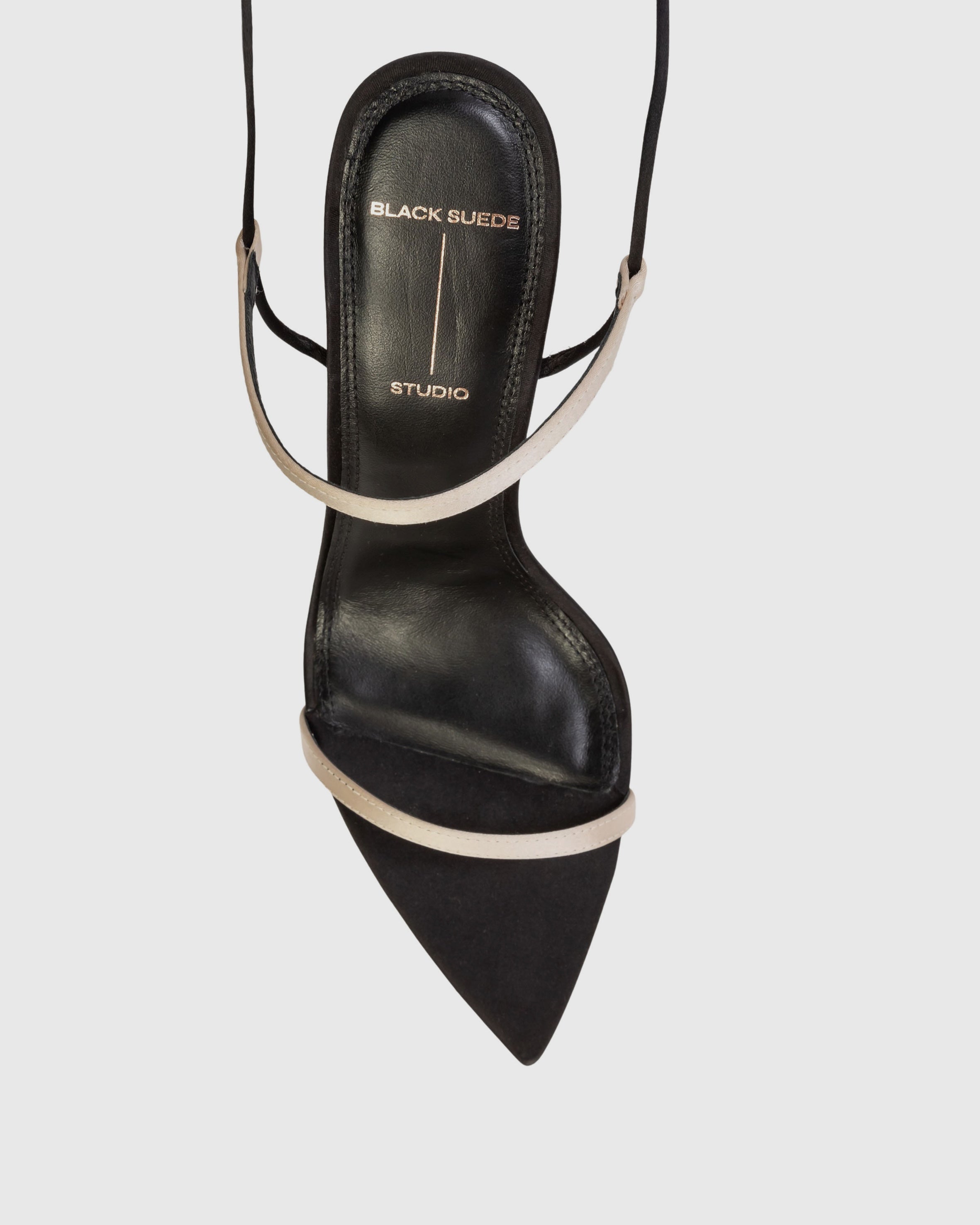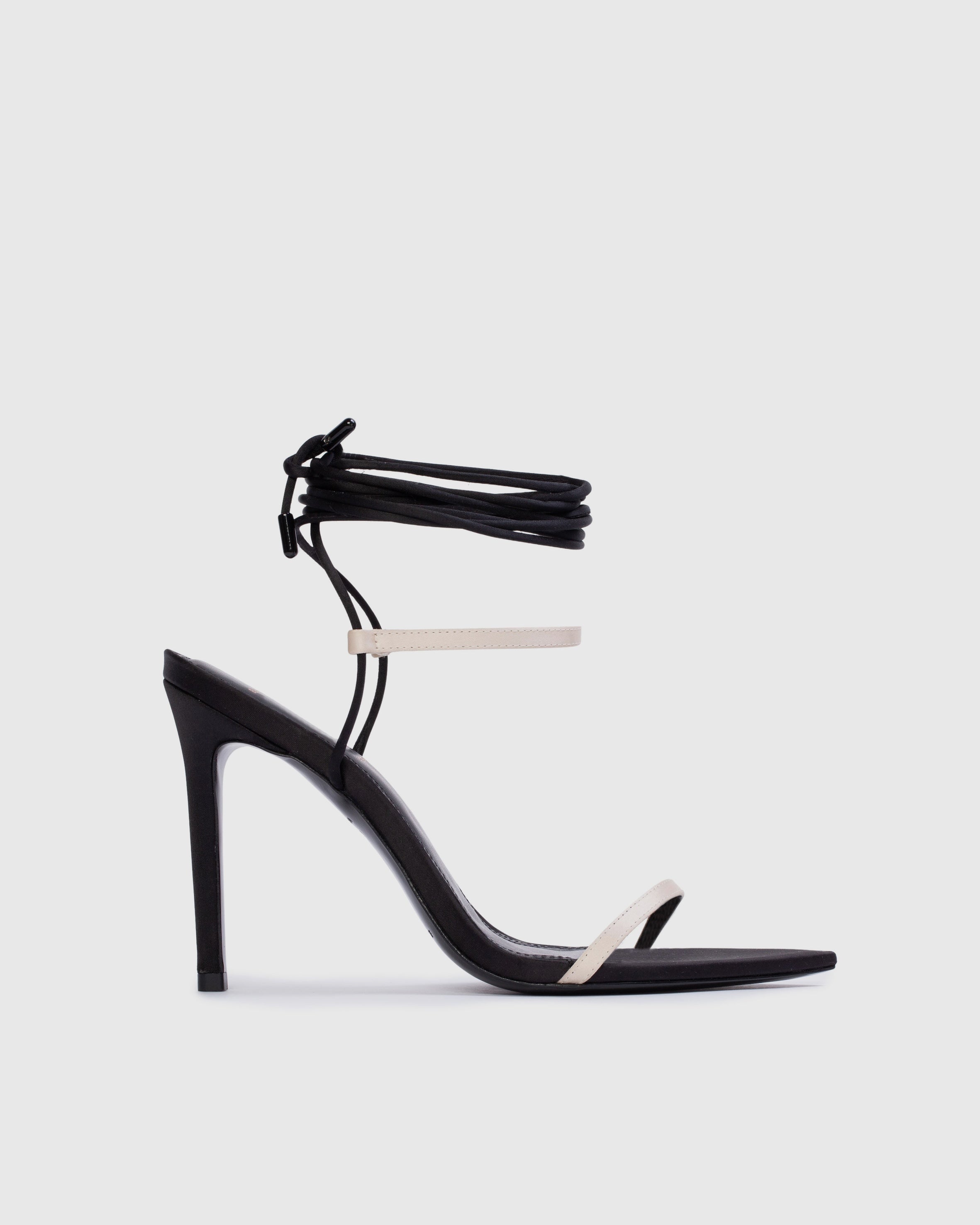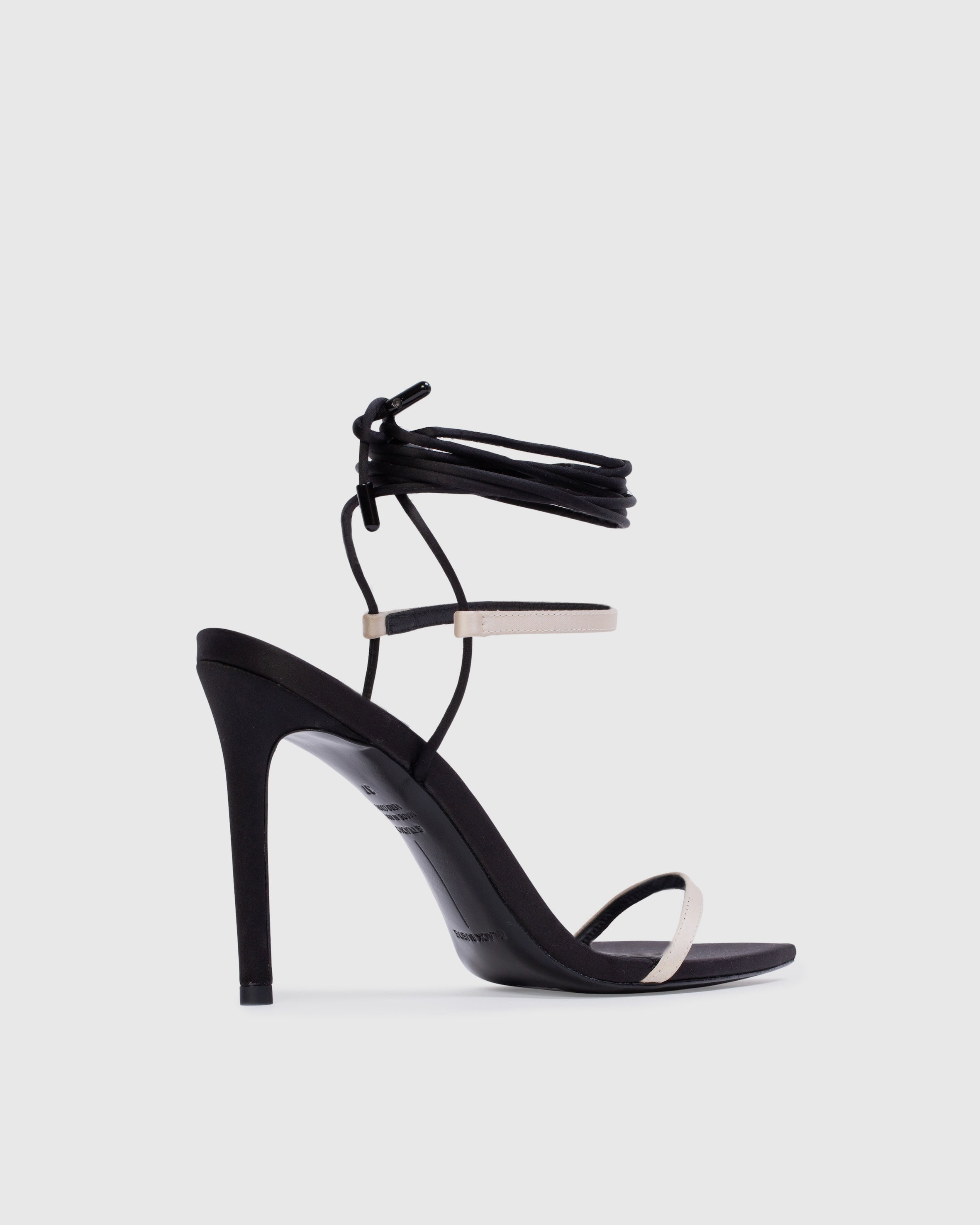 pointy toe wrap-up sandal, set on a straight stiletto heel. made with satin crepe.