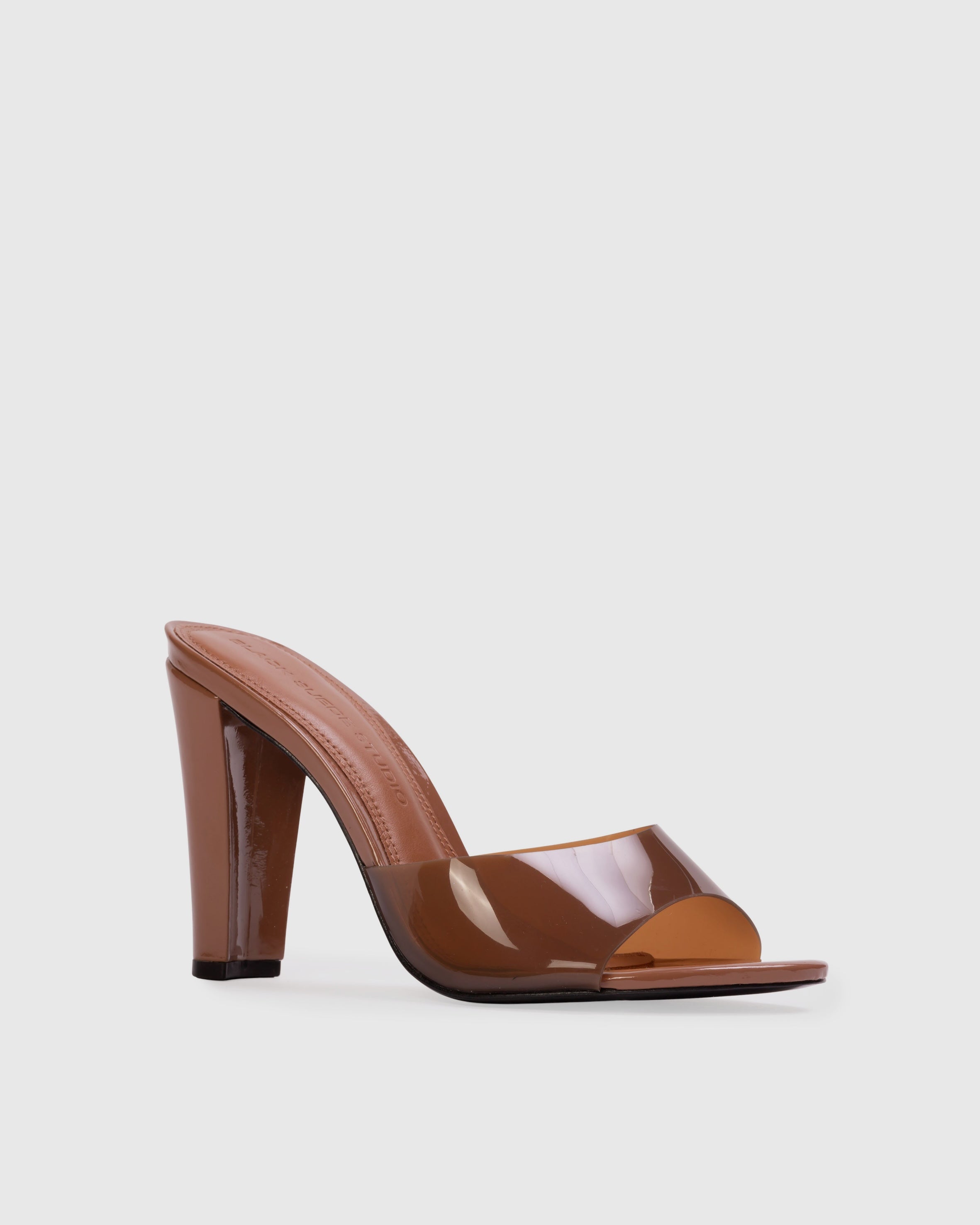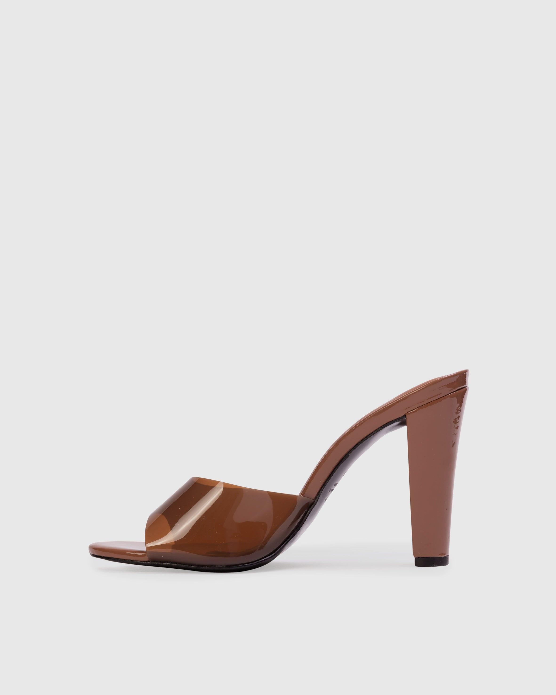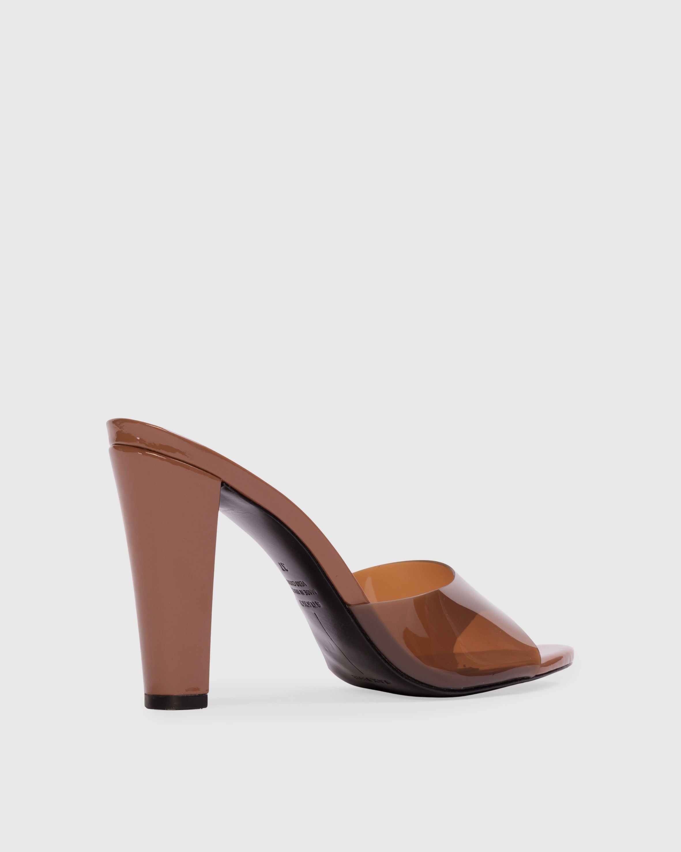 Round toe slip on mule with pvc upper, set on a sleek structured block heel. Made with smooth patent leather.