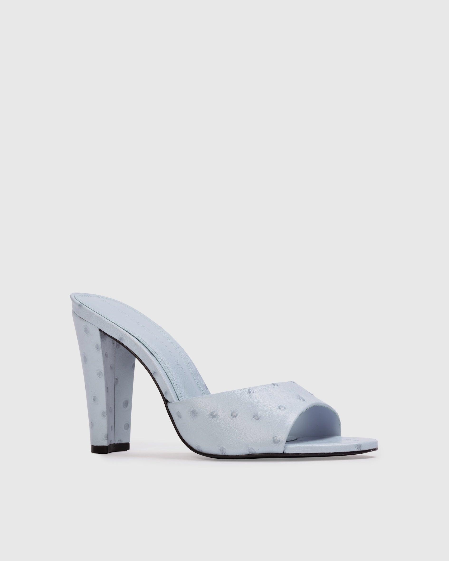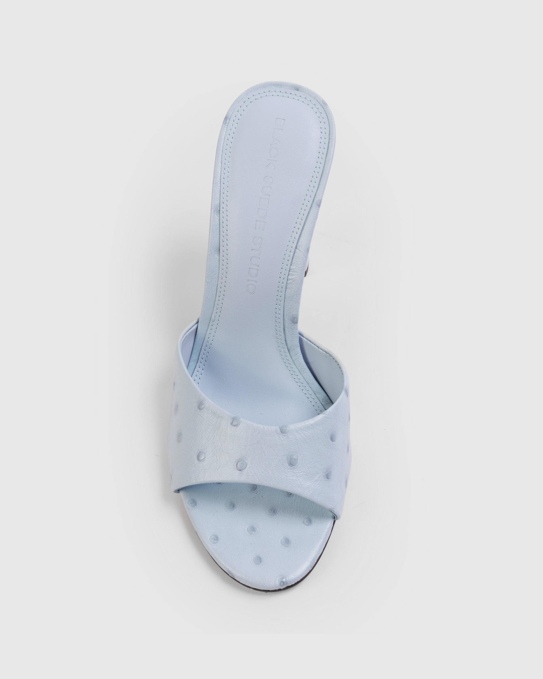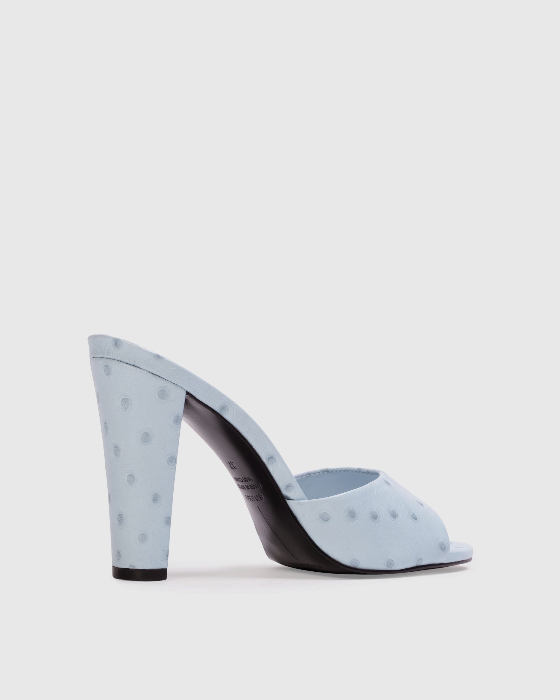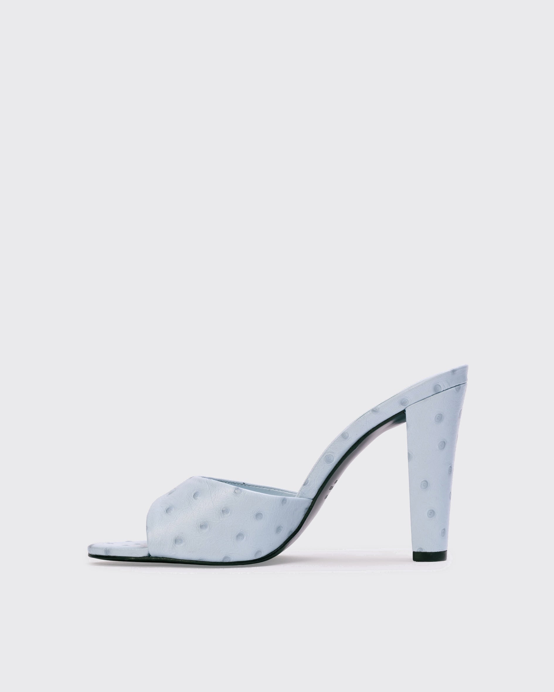 Round toe slip on mule, set on a sleek structured block heel. Made with ostrich print leather.