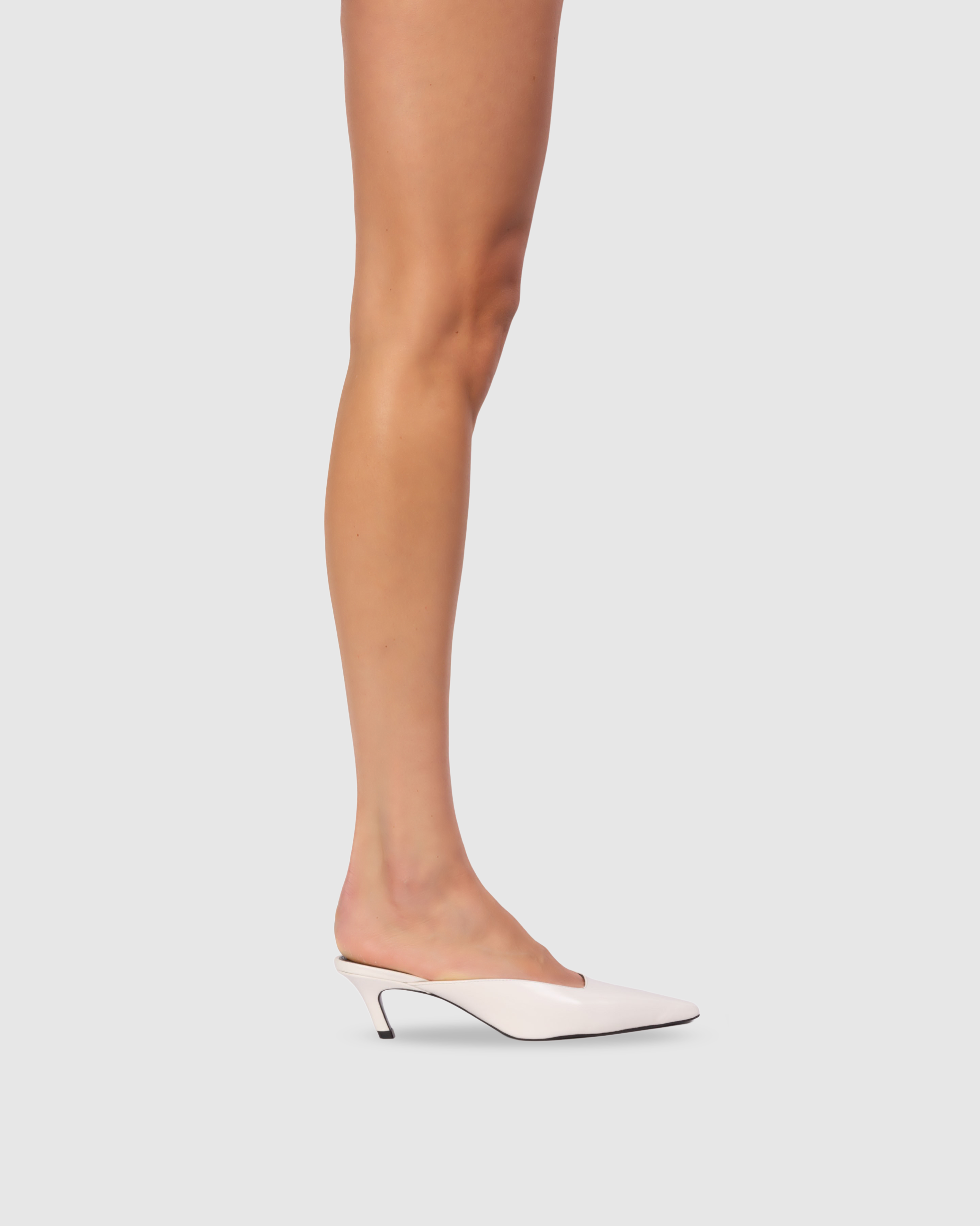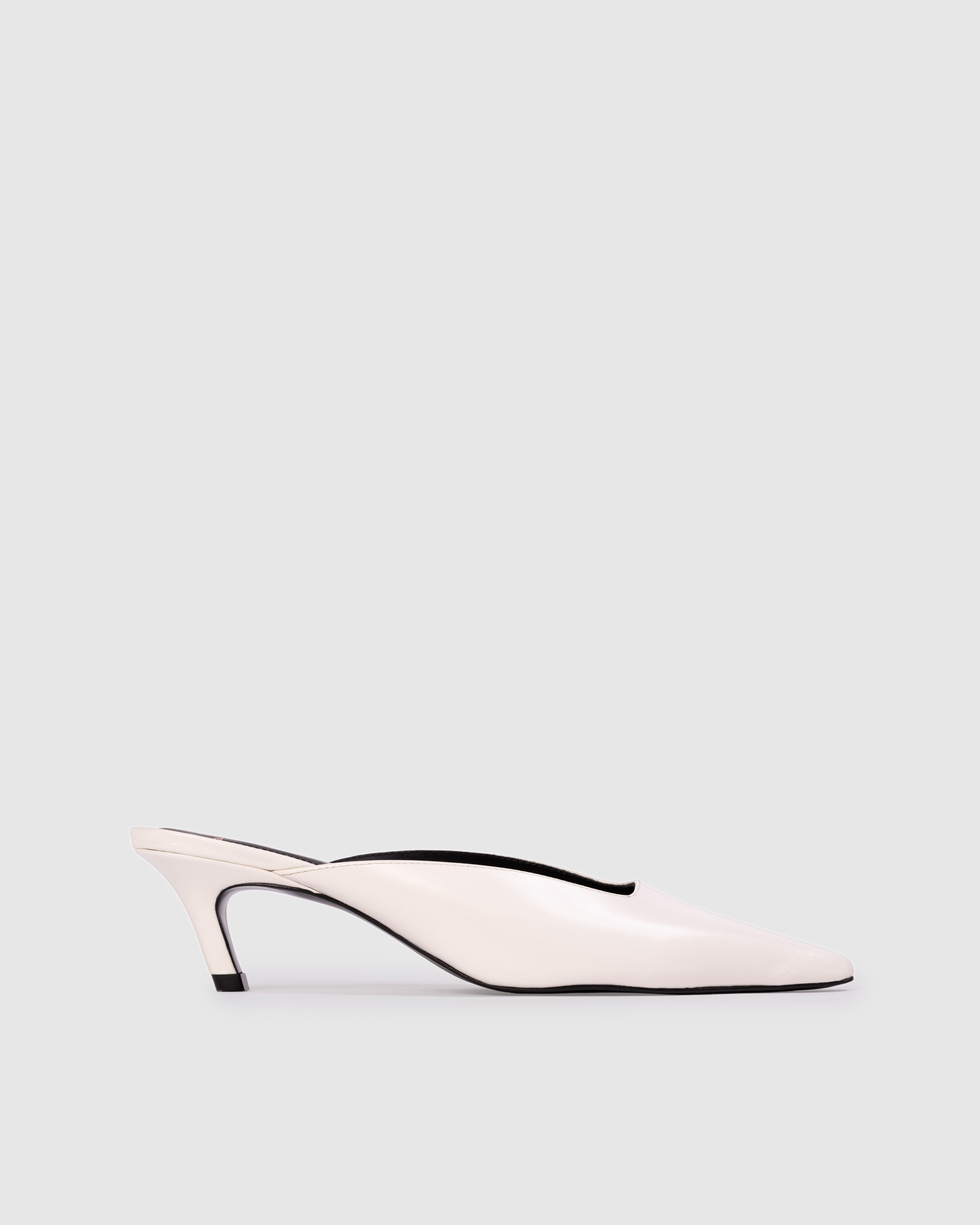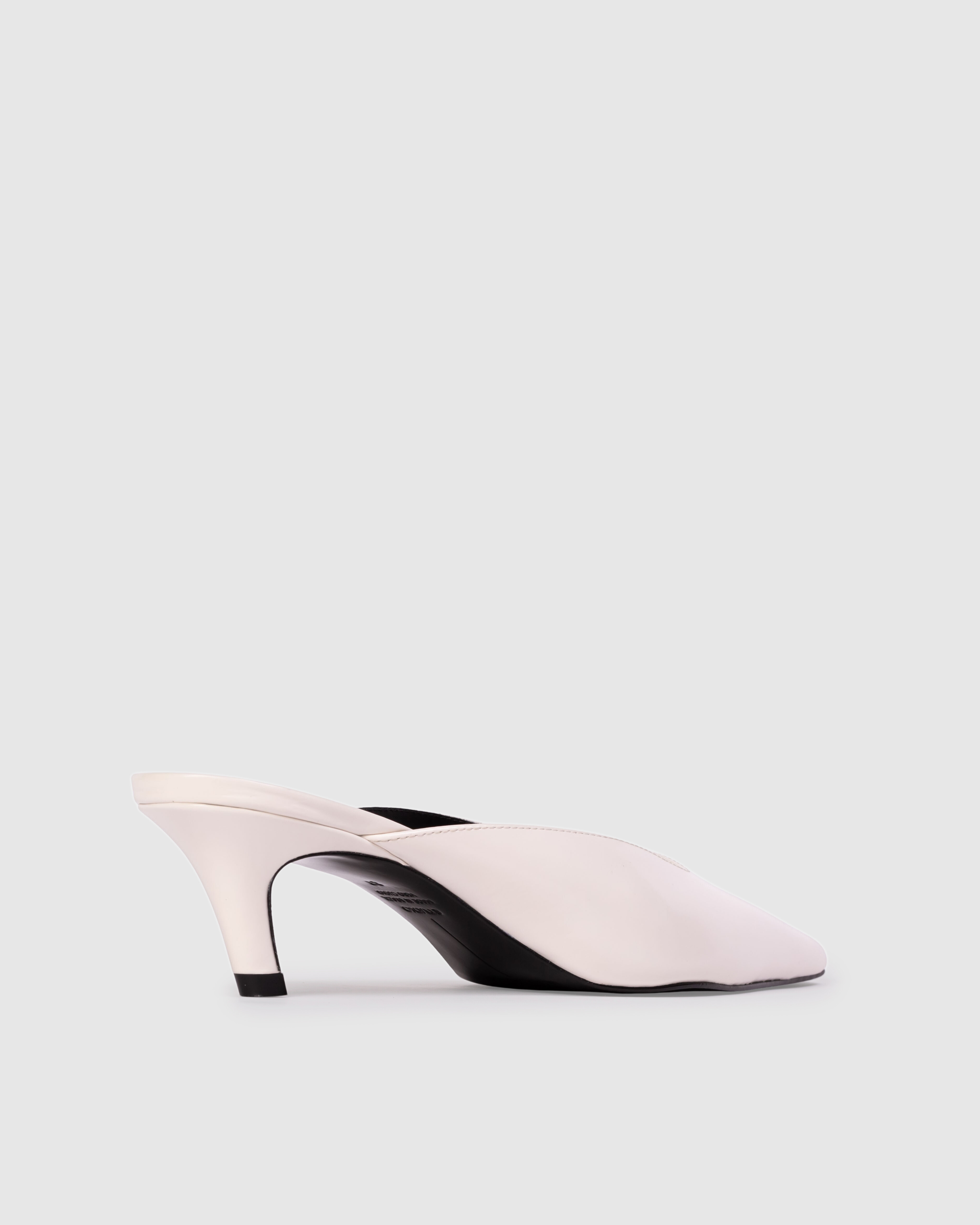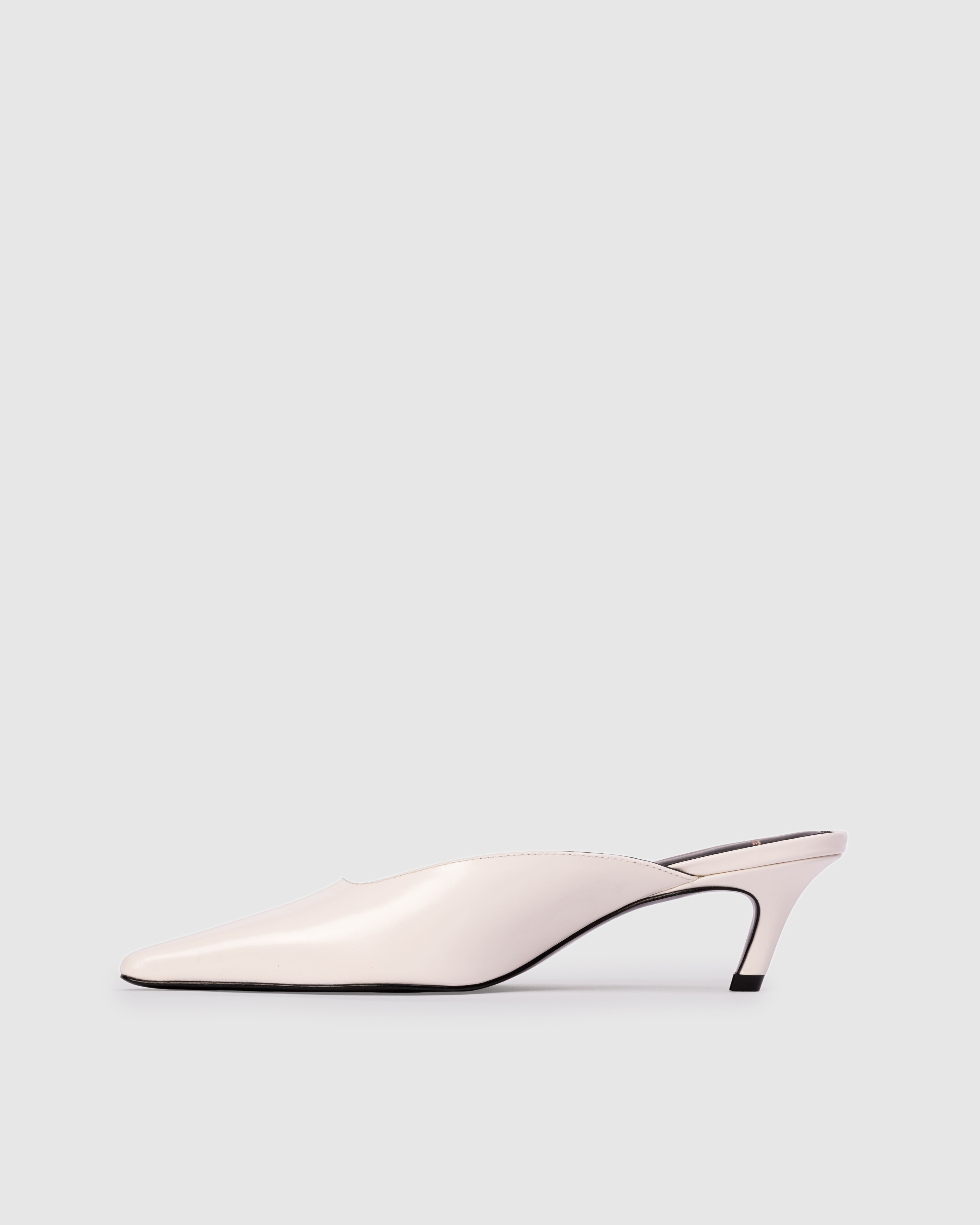 Snipped toe slip on mule, set on an angled low pin heel. Made with smooth buffed leather.