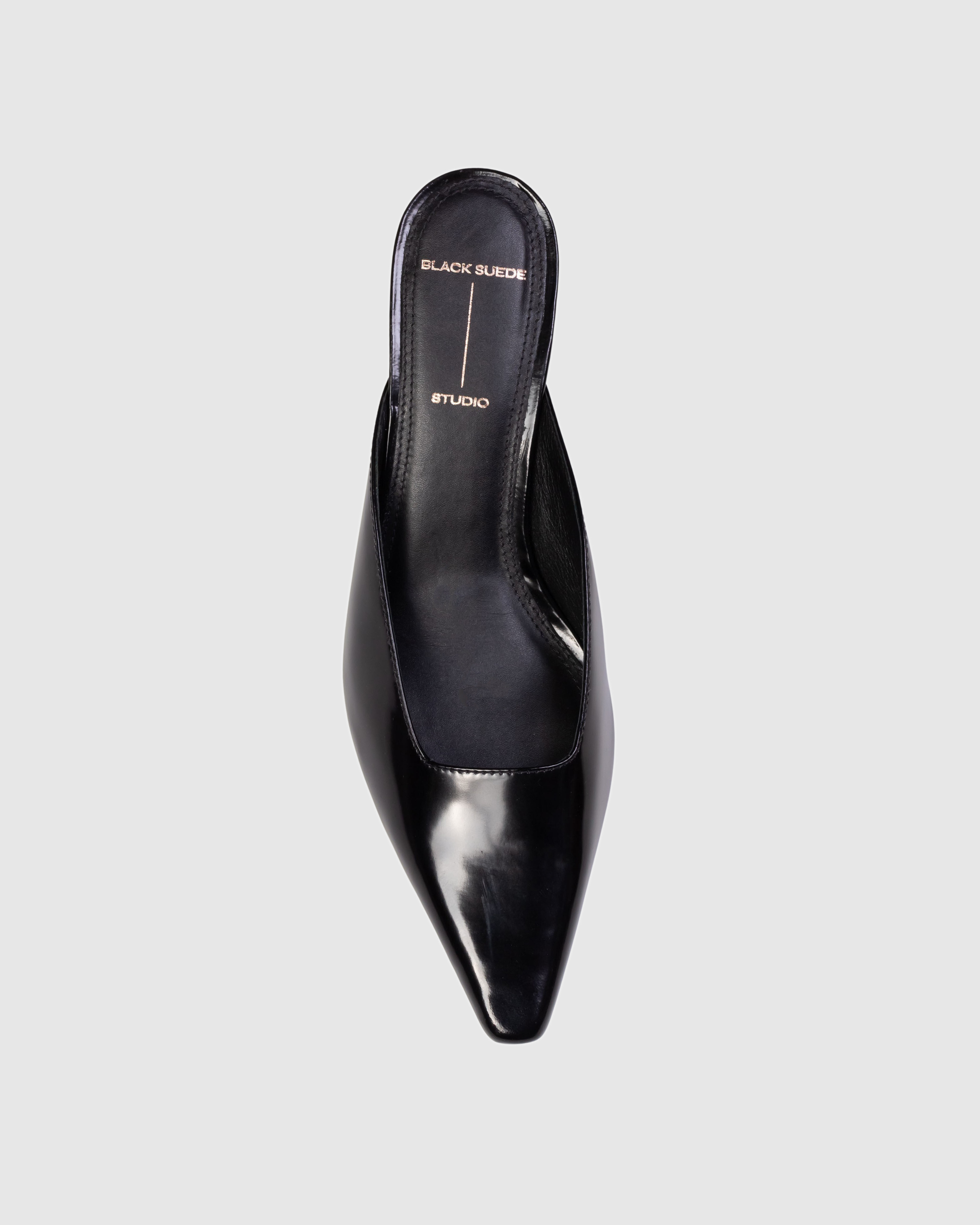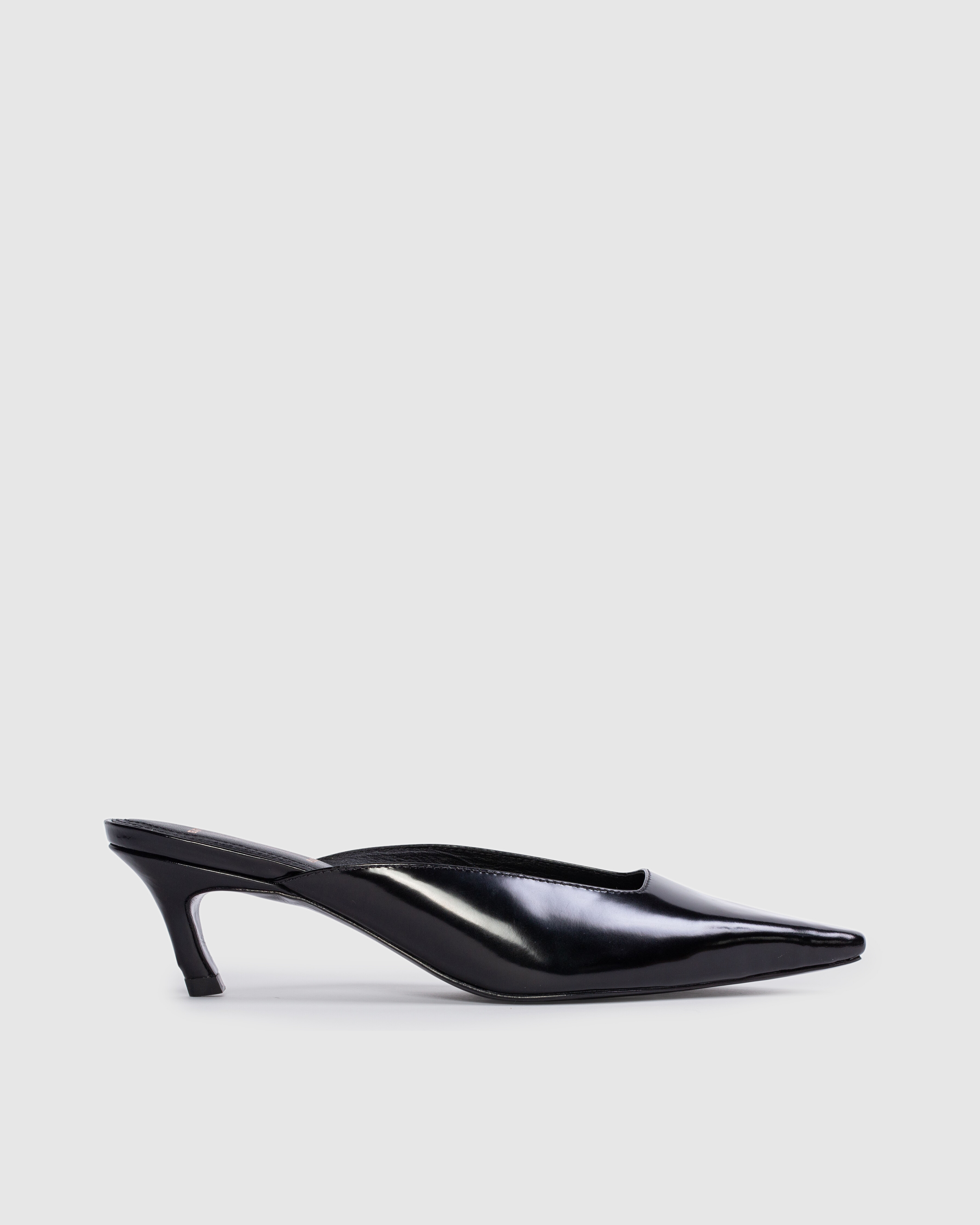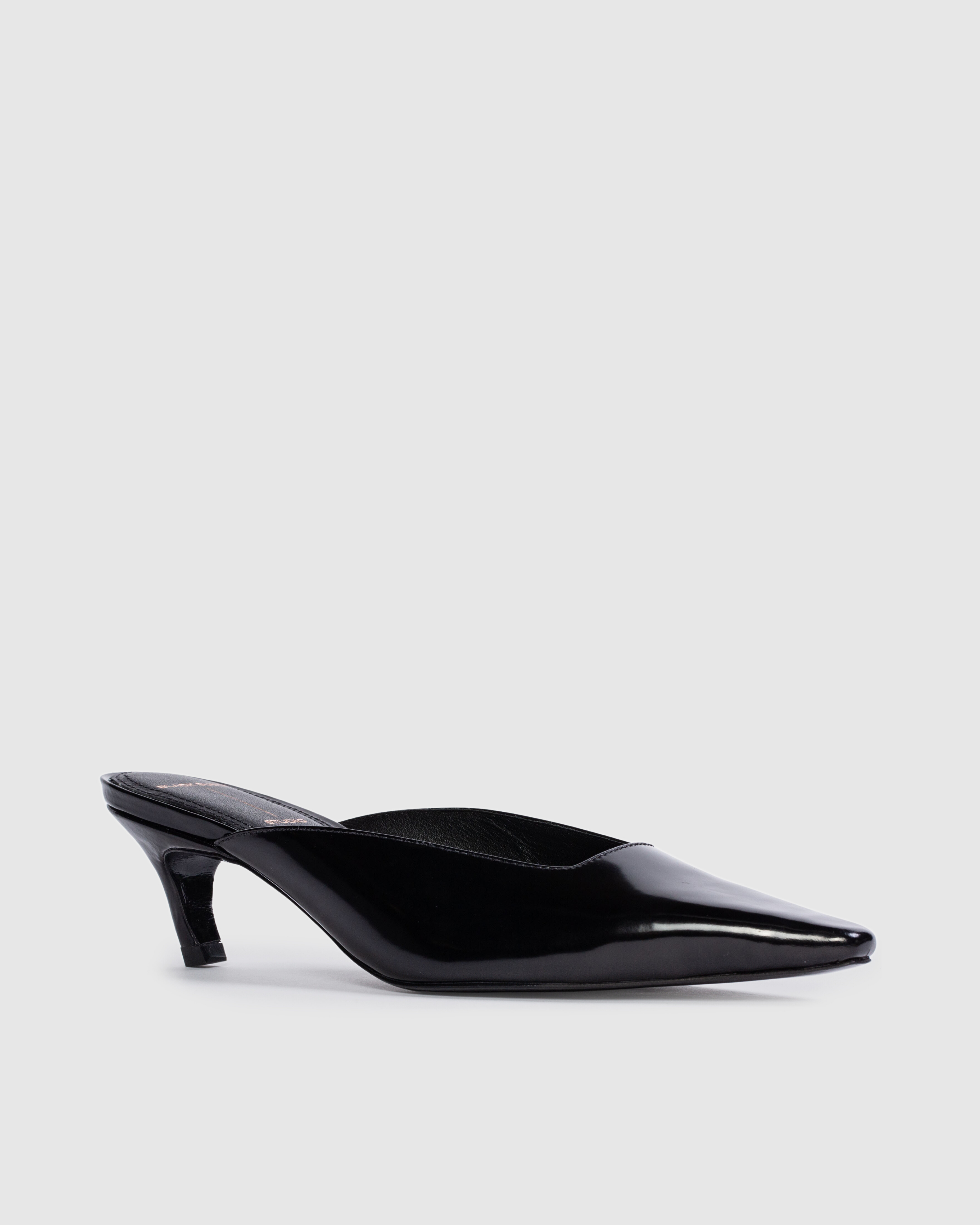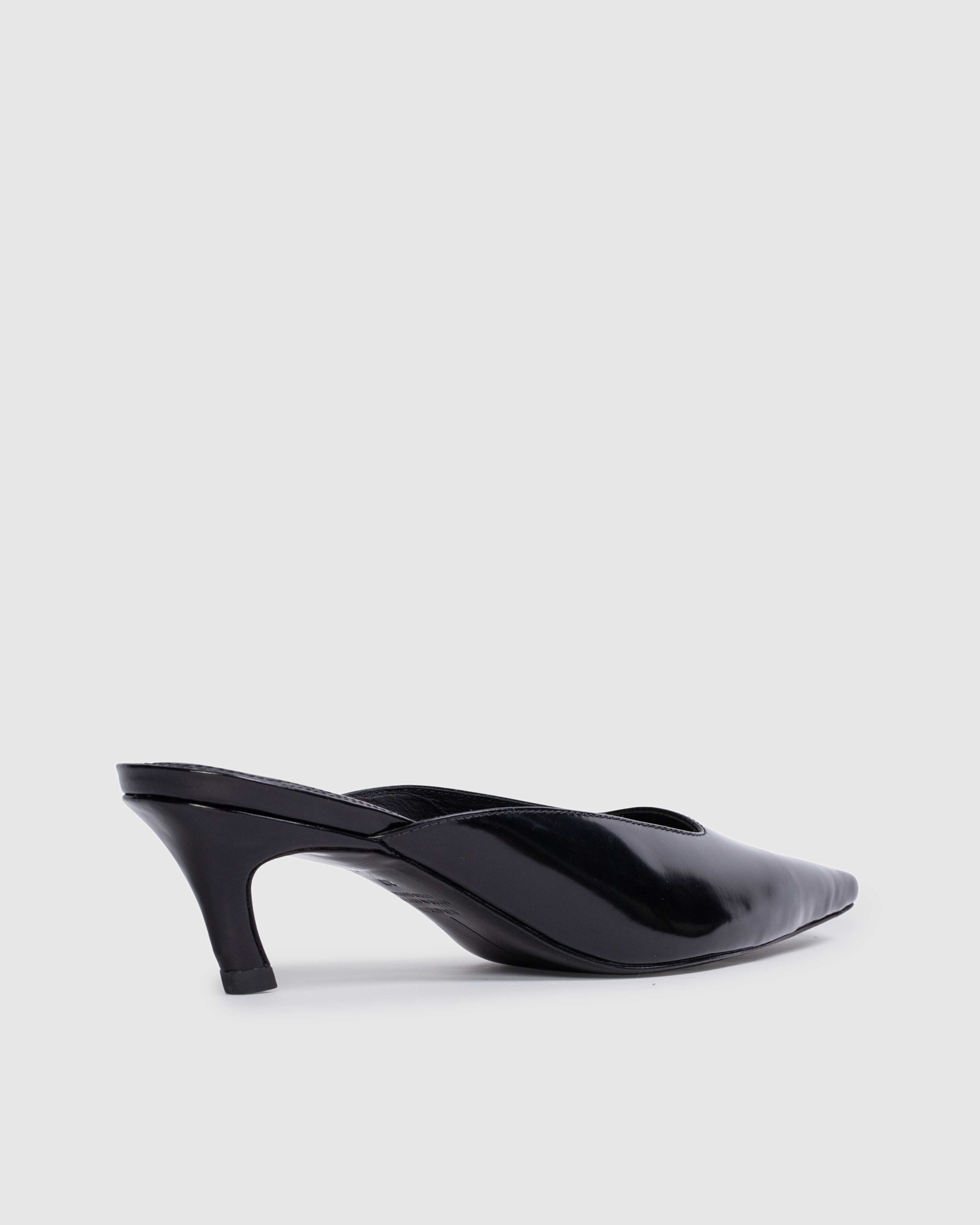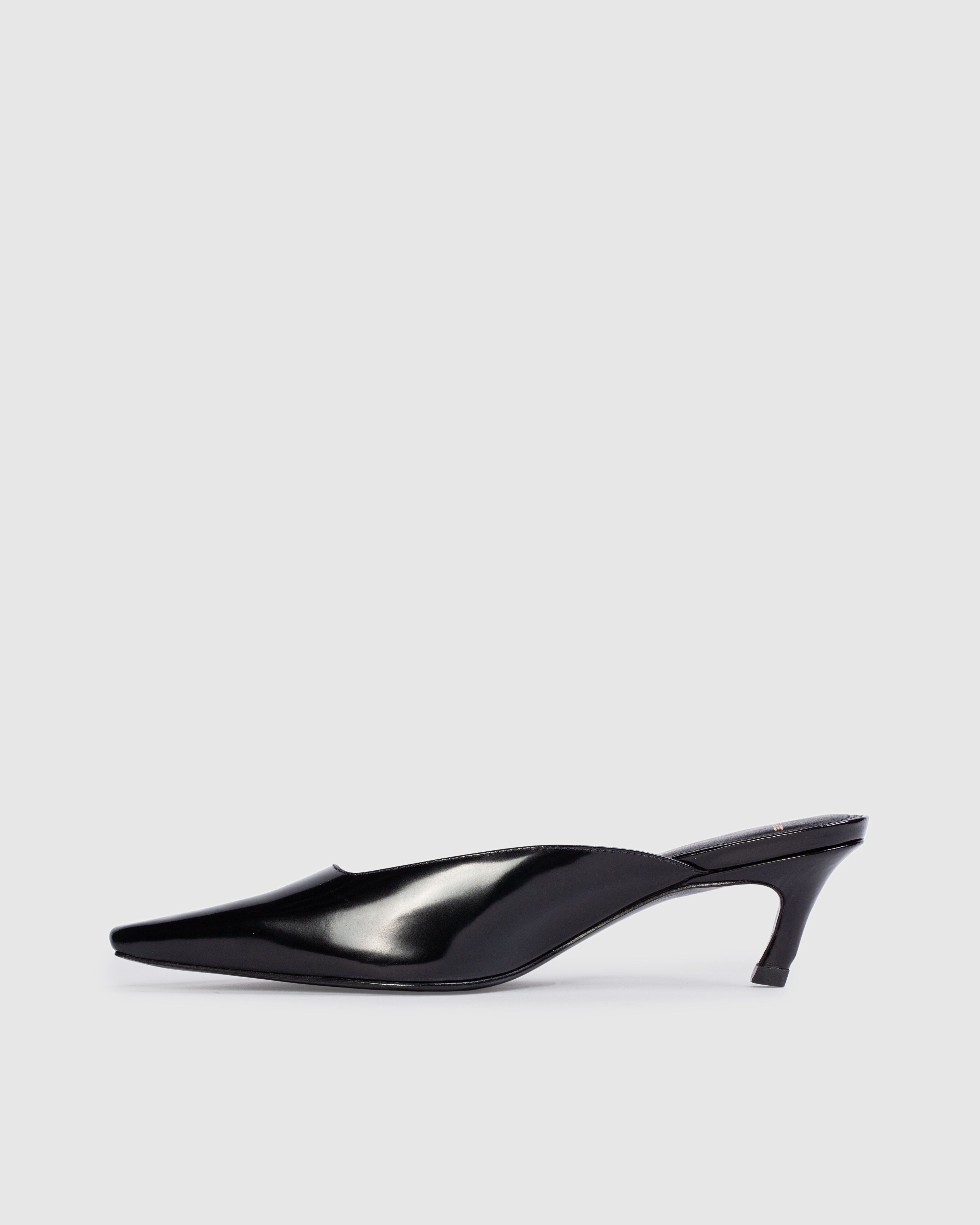 Snipped toe slipper mule on an angled low pin heel. Made with smooth box leather.