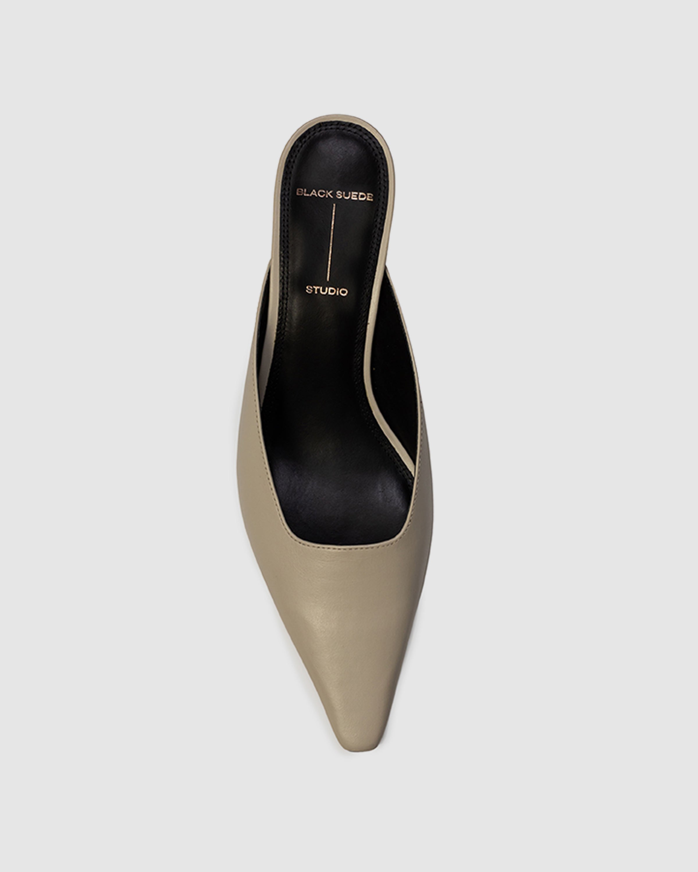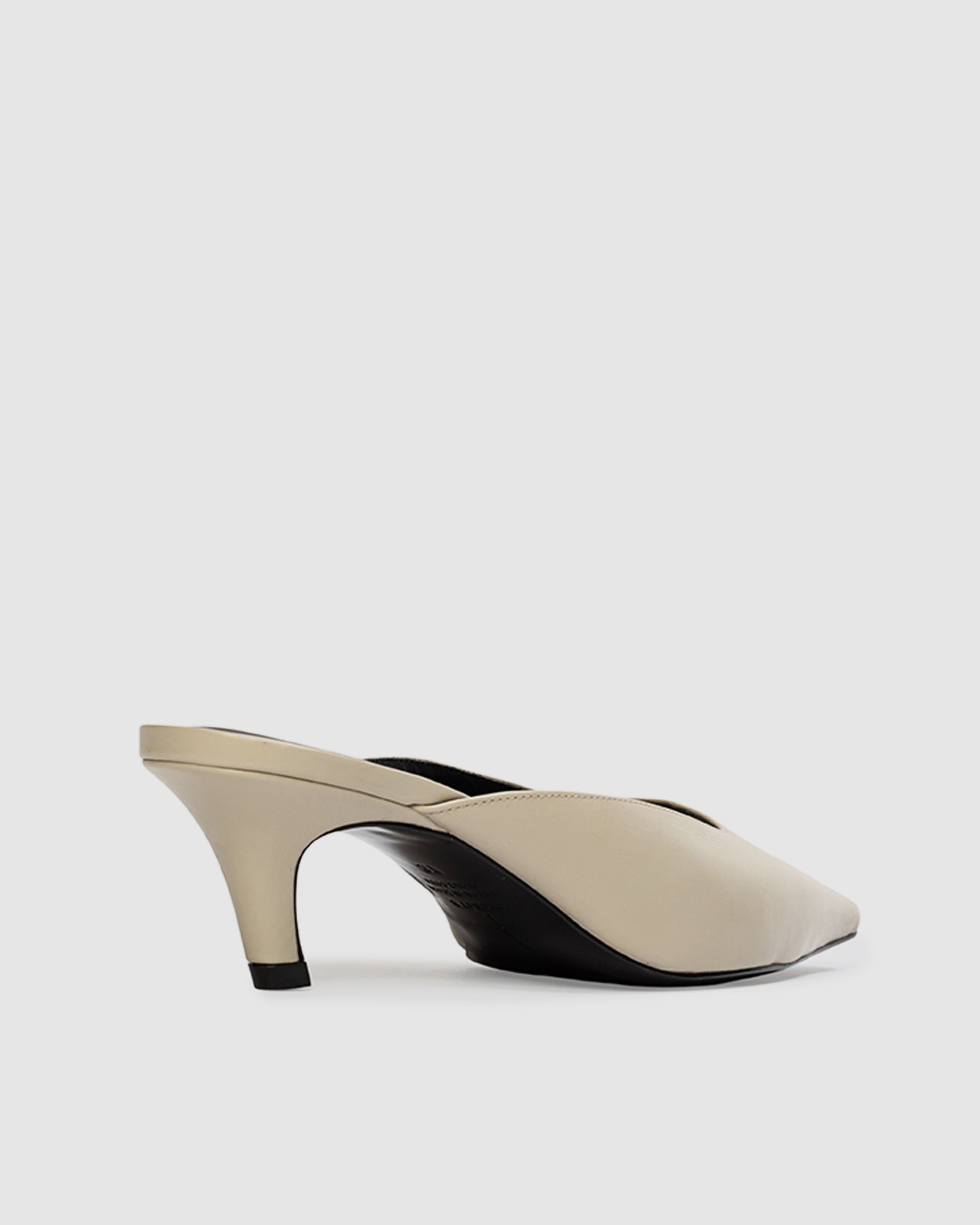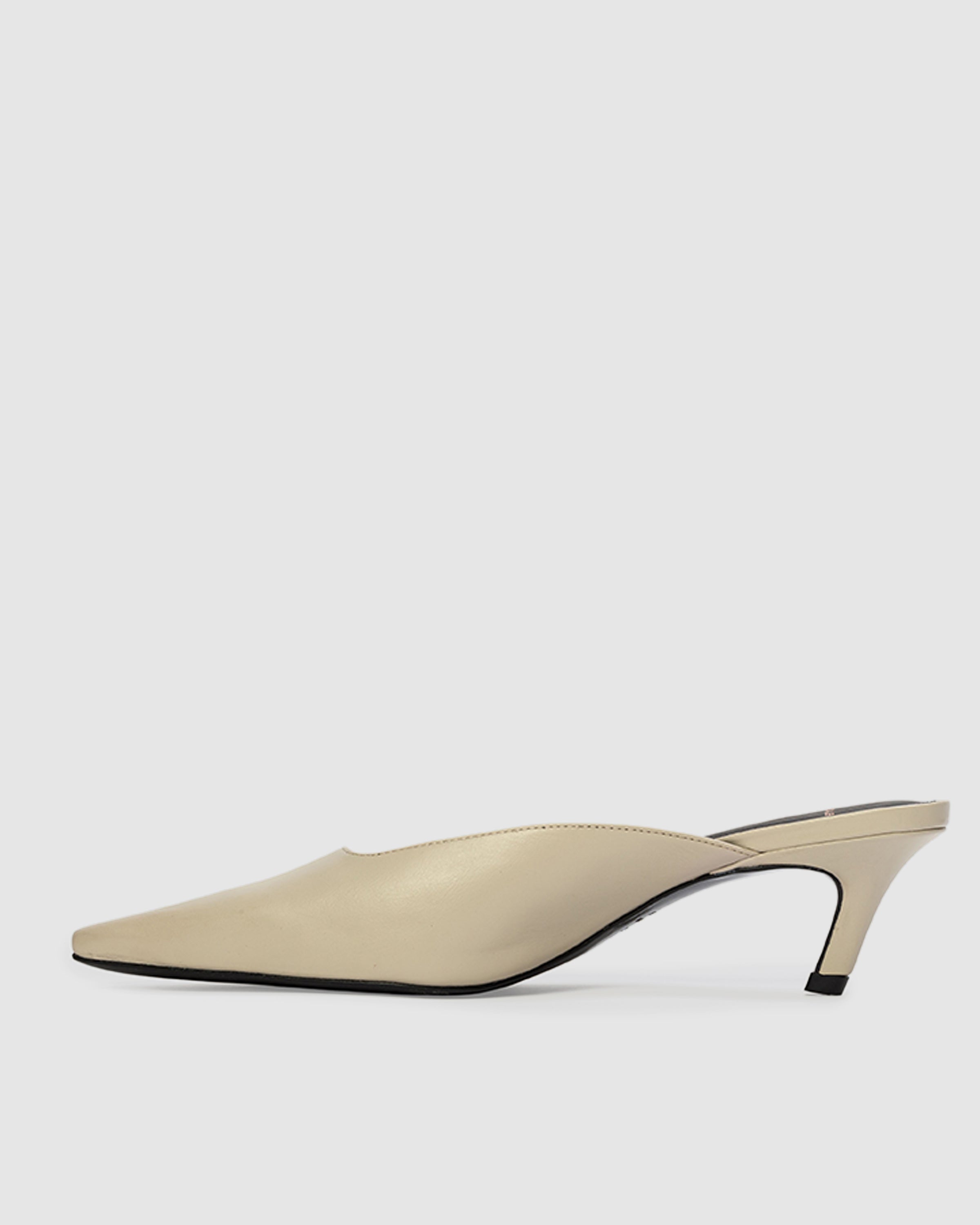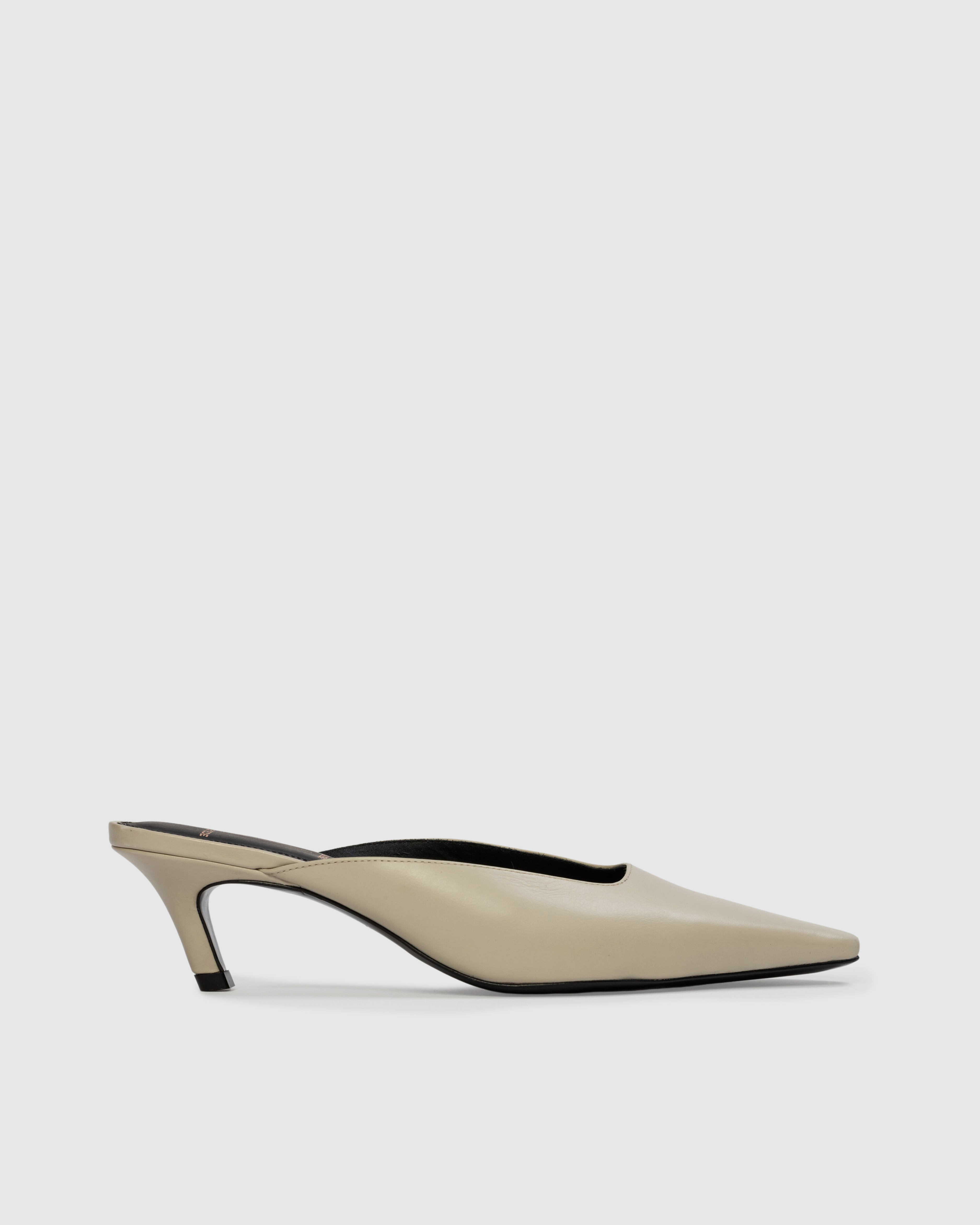 Snipped toe slip on mule, set on an angled kitten heel. Made with smooth buffed leather.