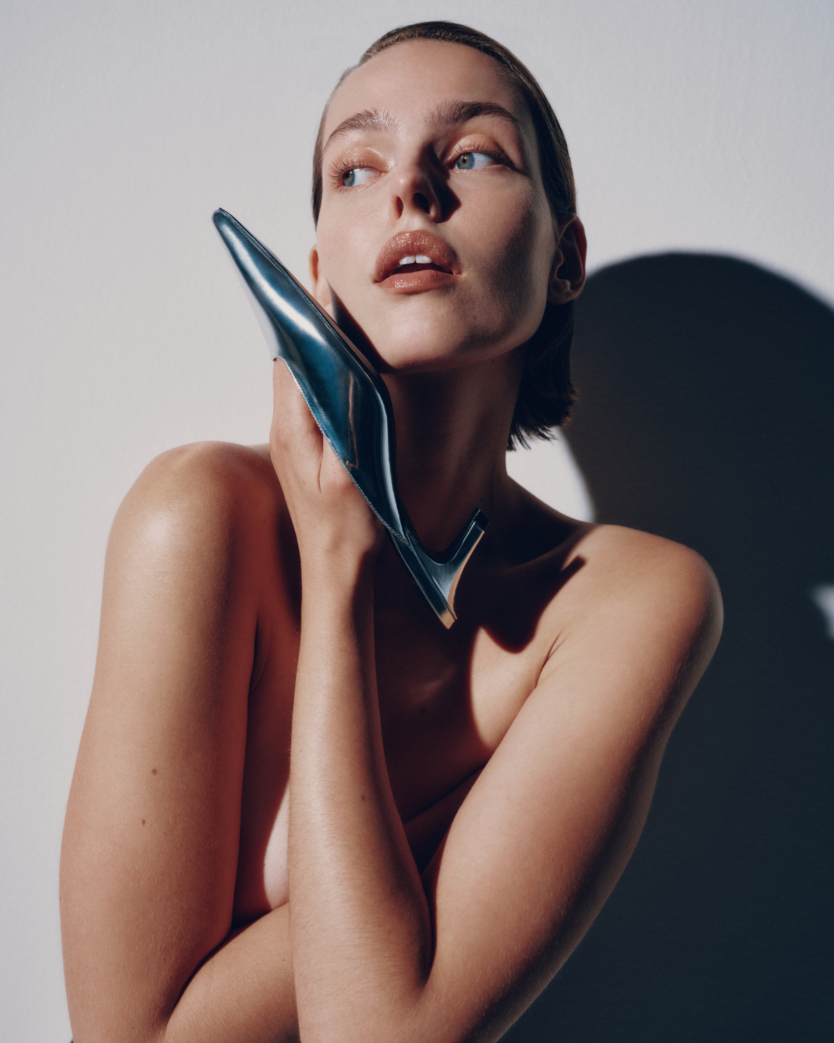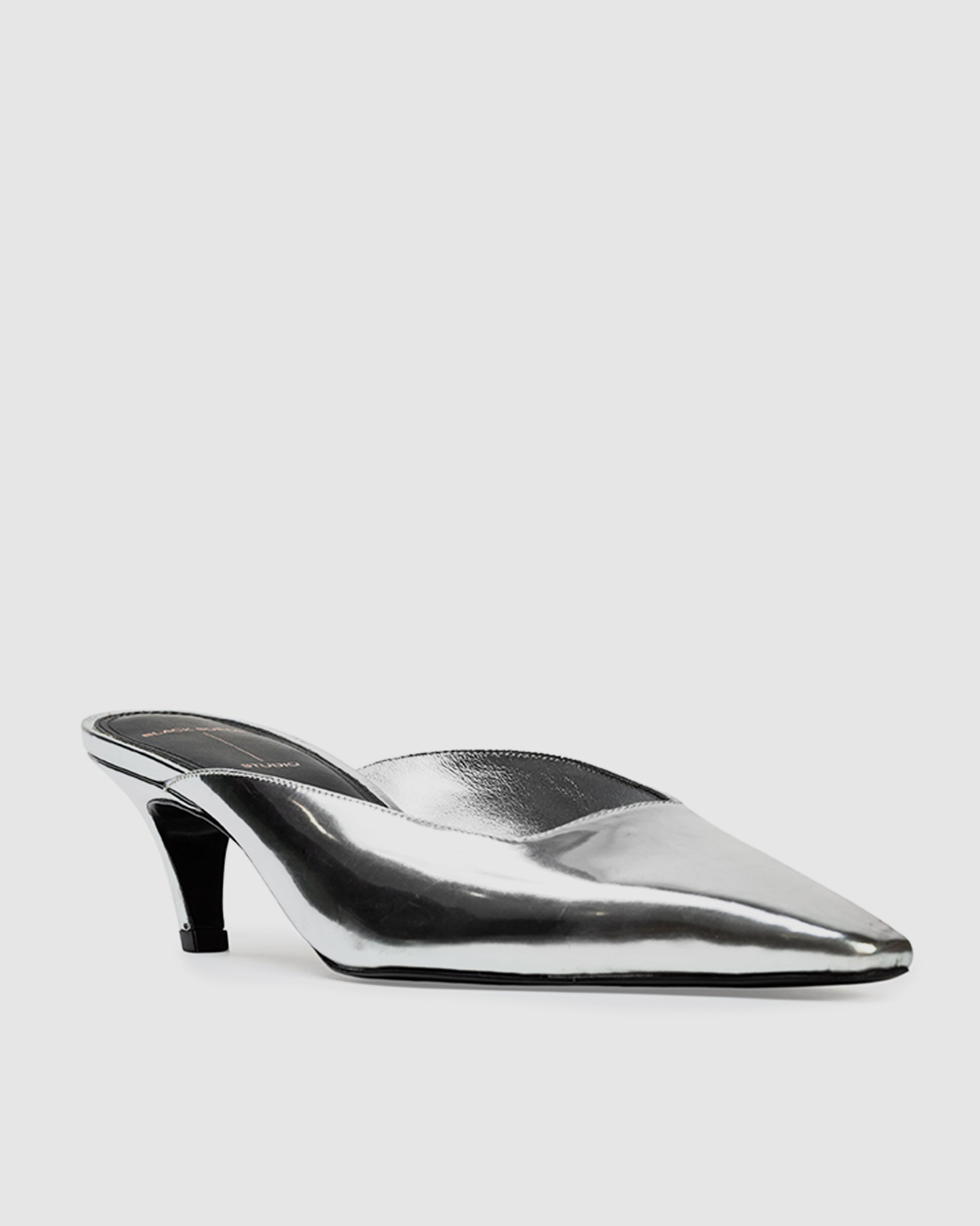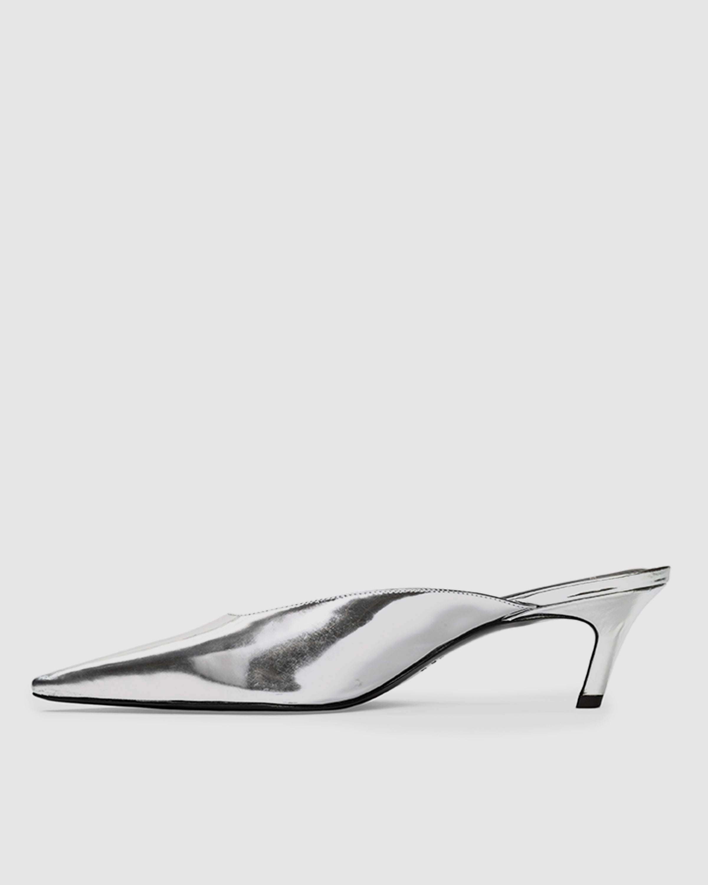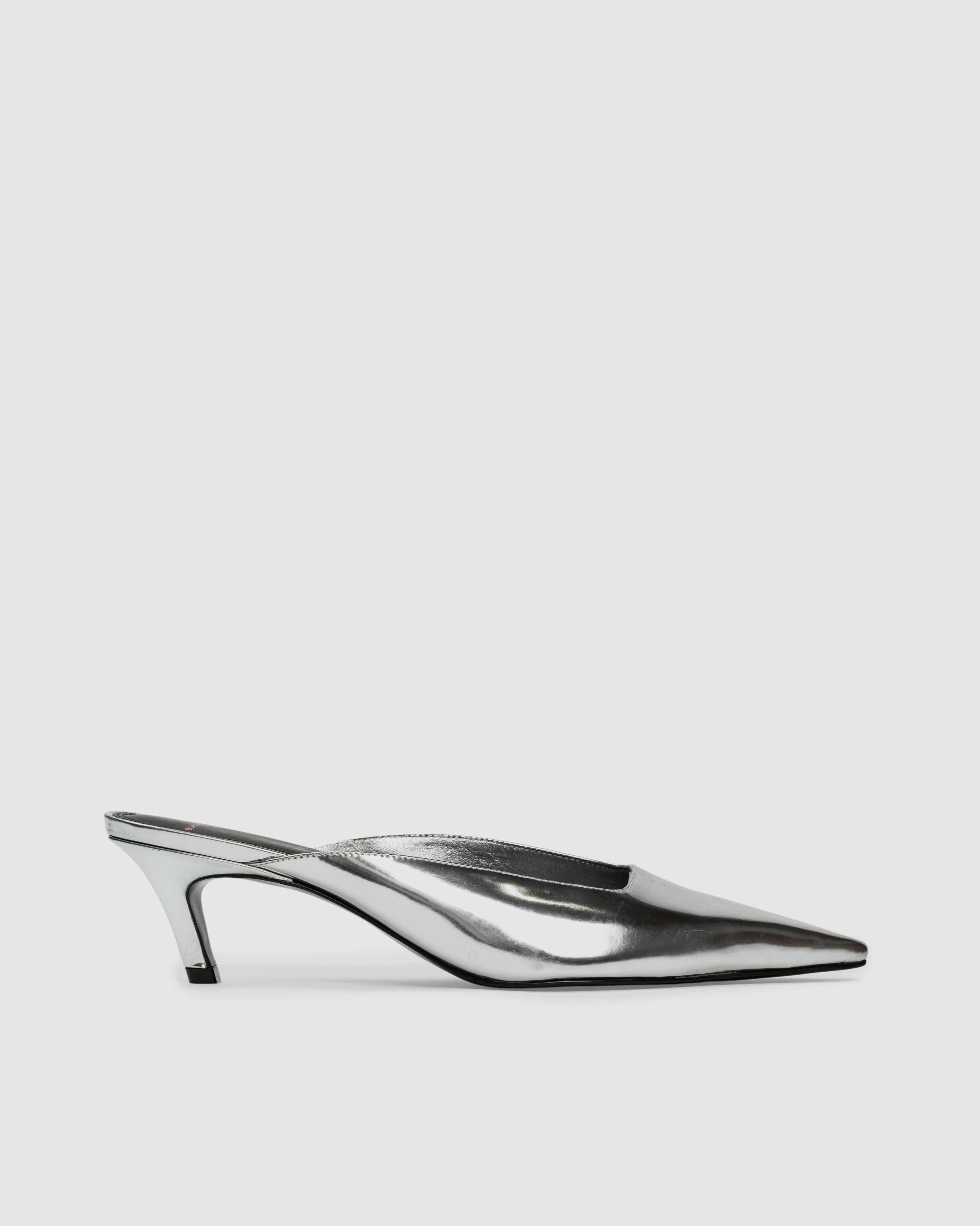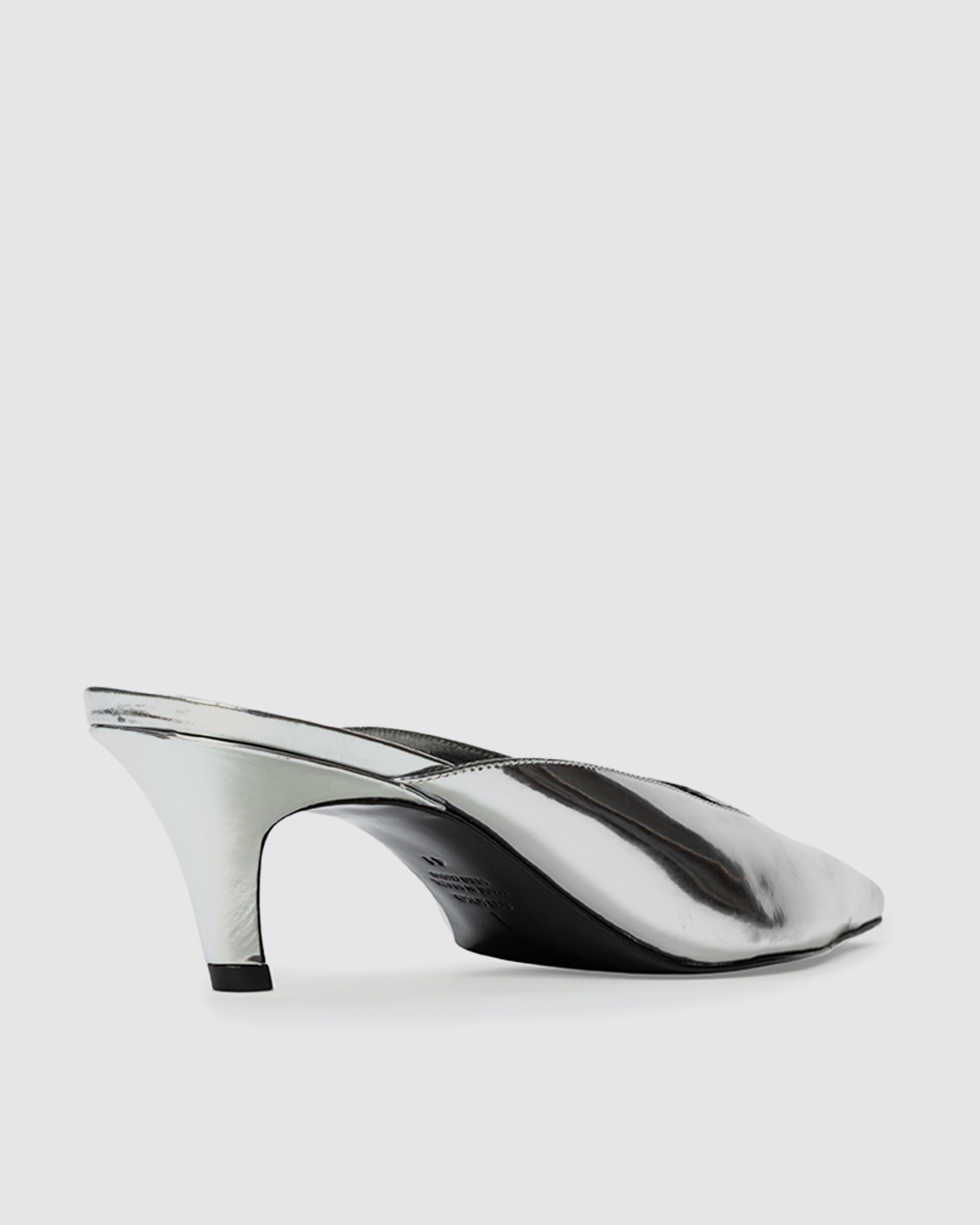 Snipped toe slip on mule, set on an angled low pin heel. Made with smooth mirror metallic leather.