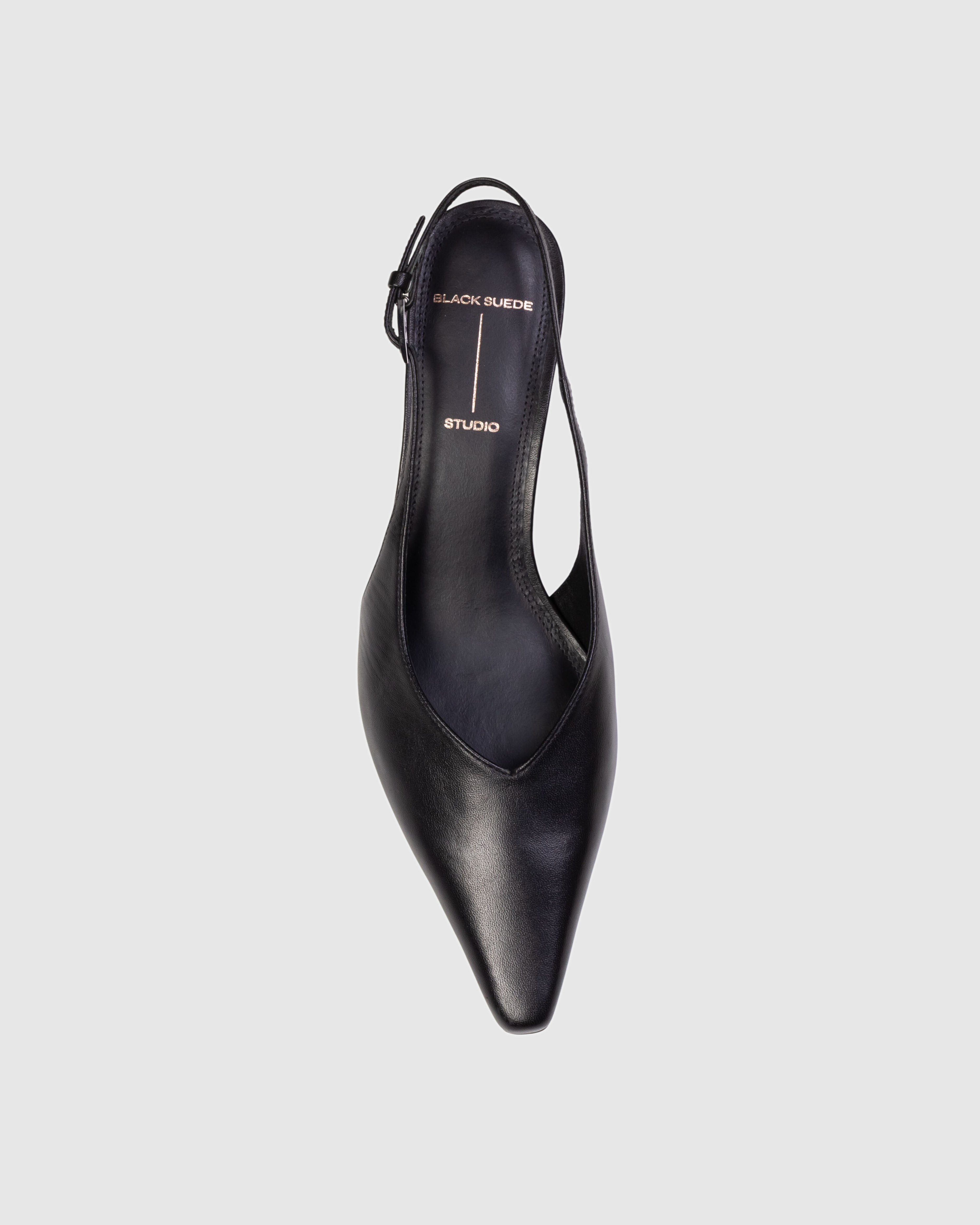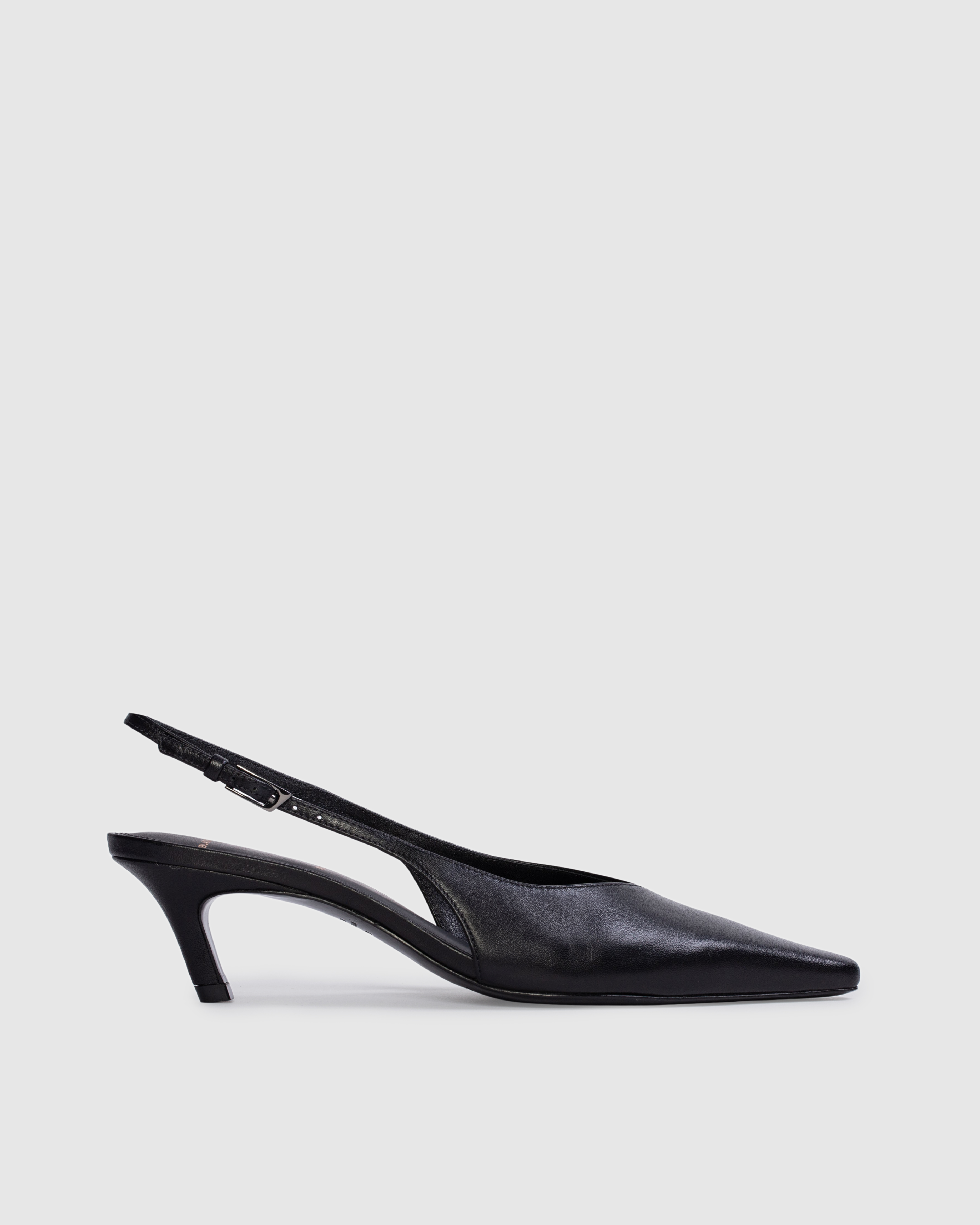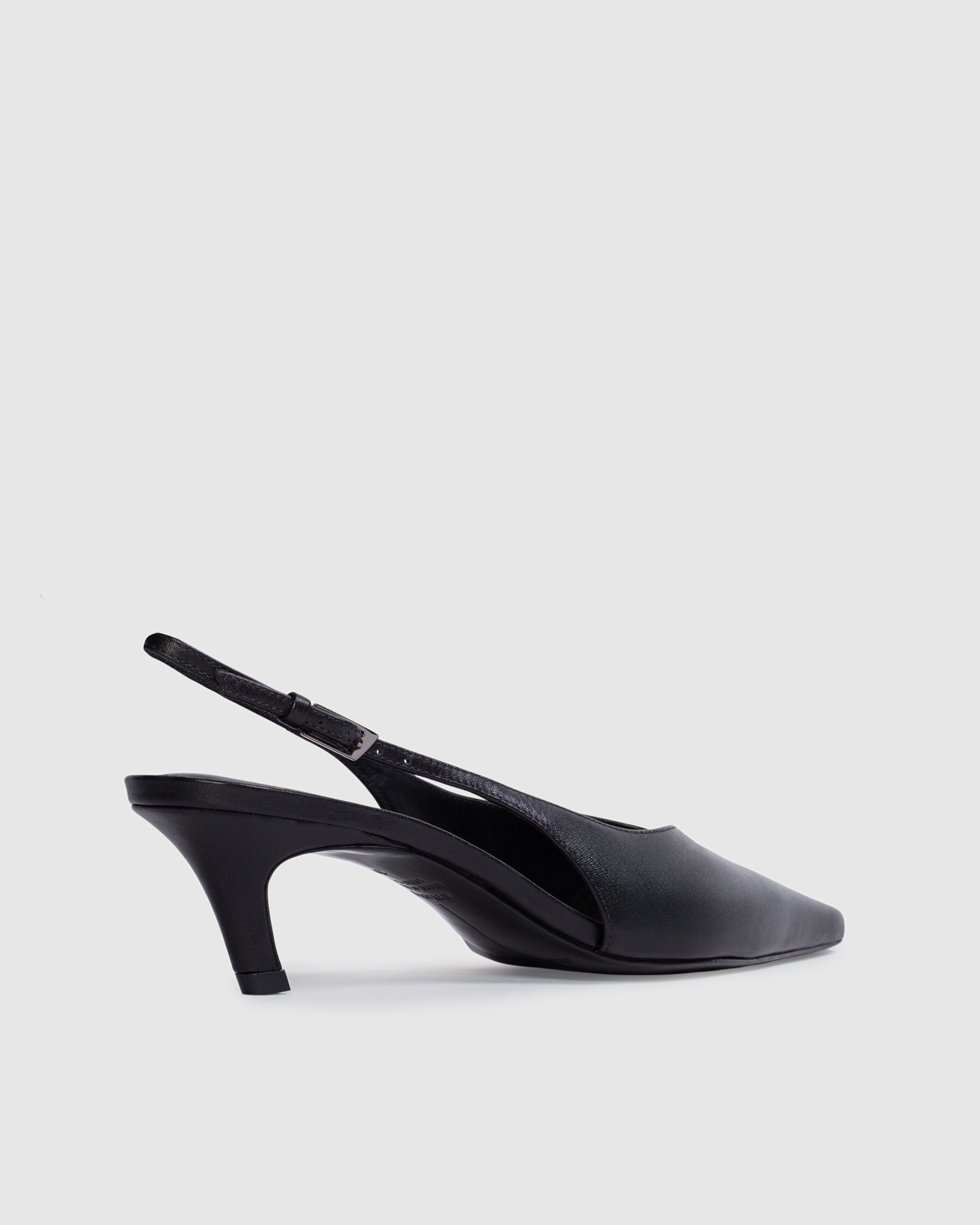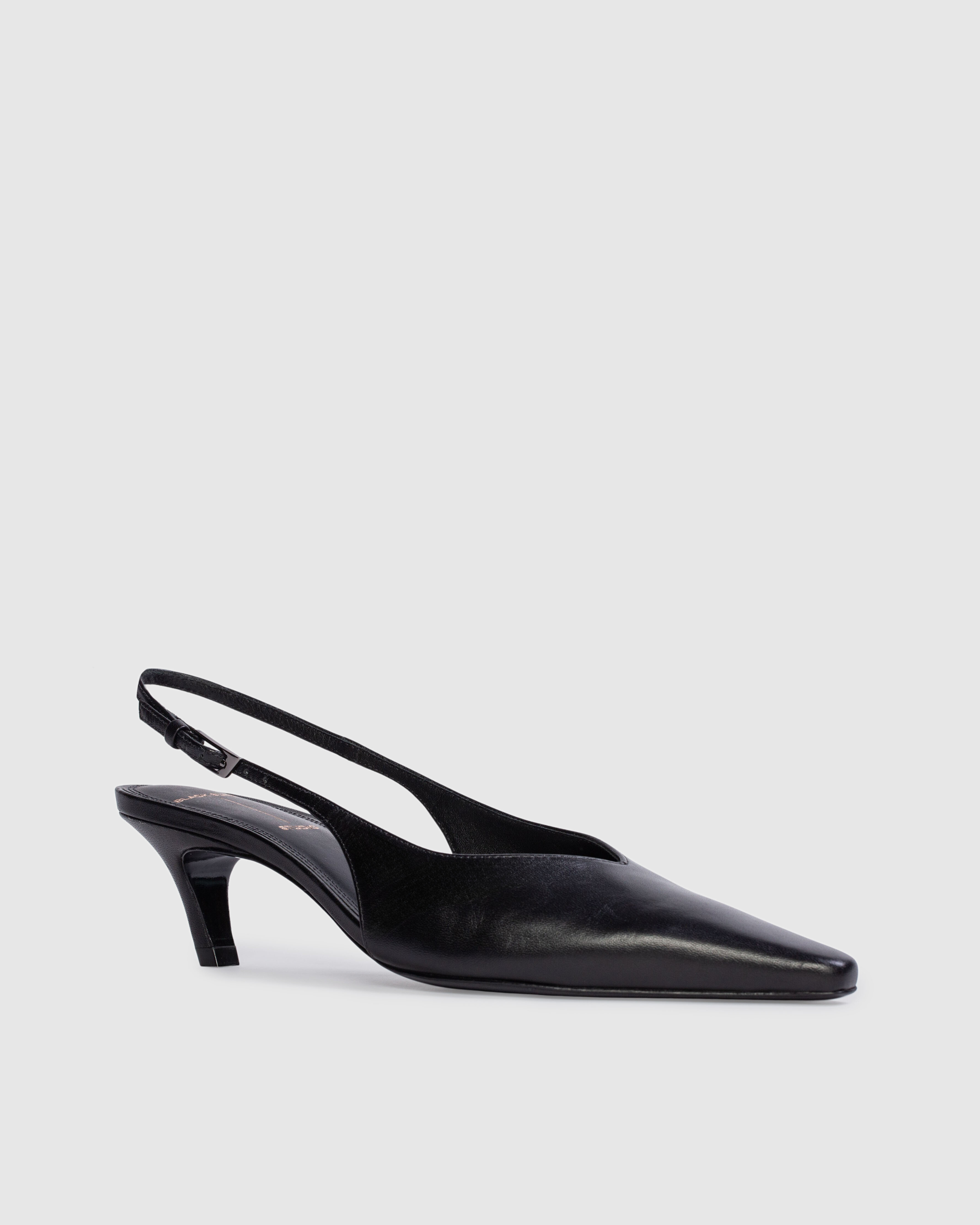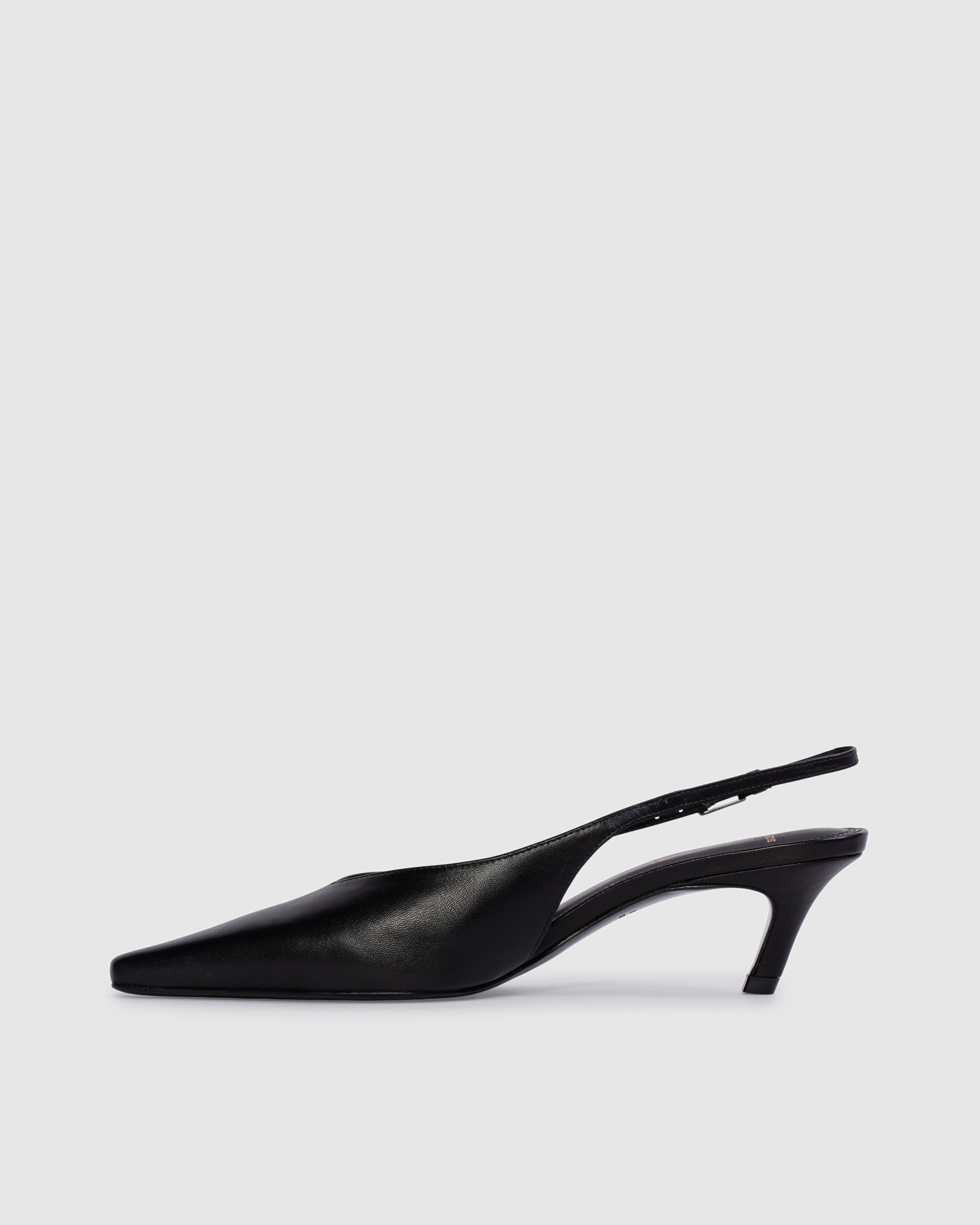 Snipped toe slingback pump, set on an angled kitten heel. Made with smooth buffed leather.
