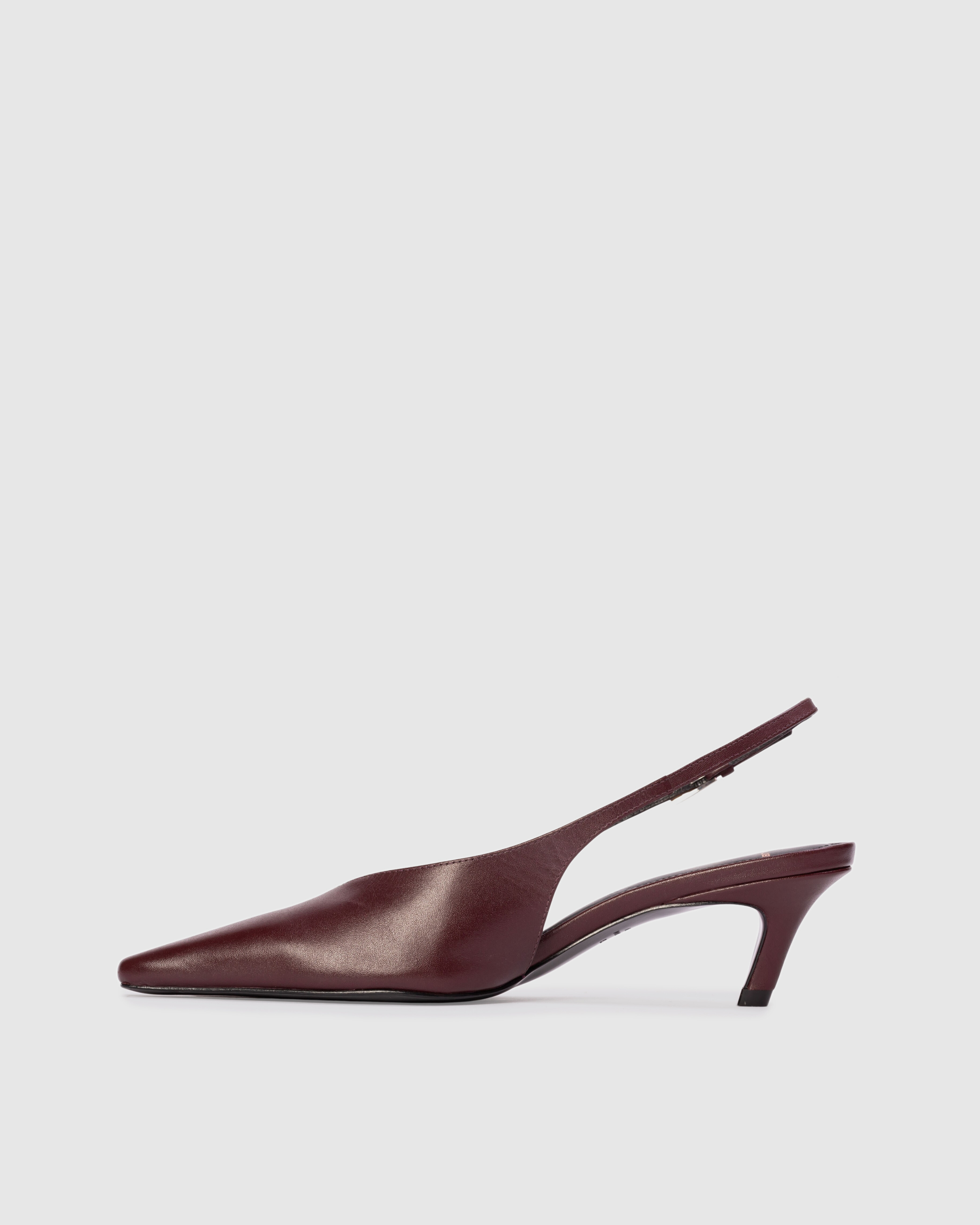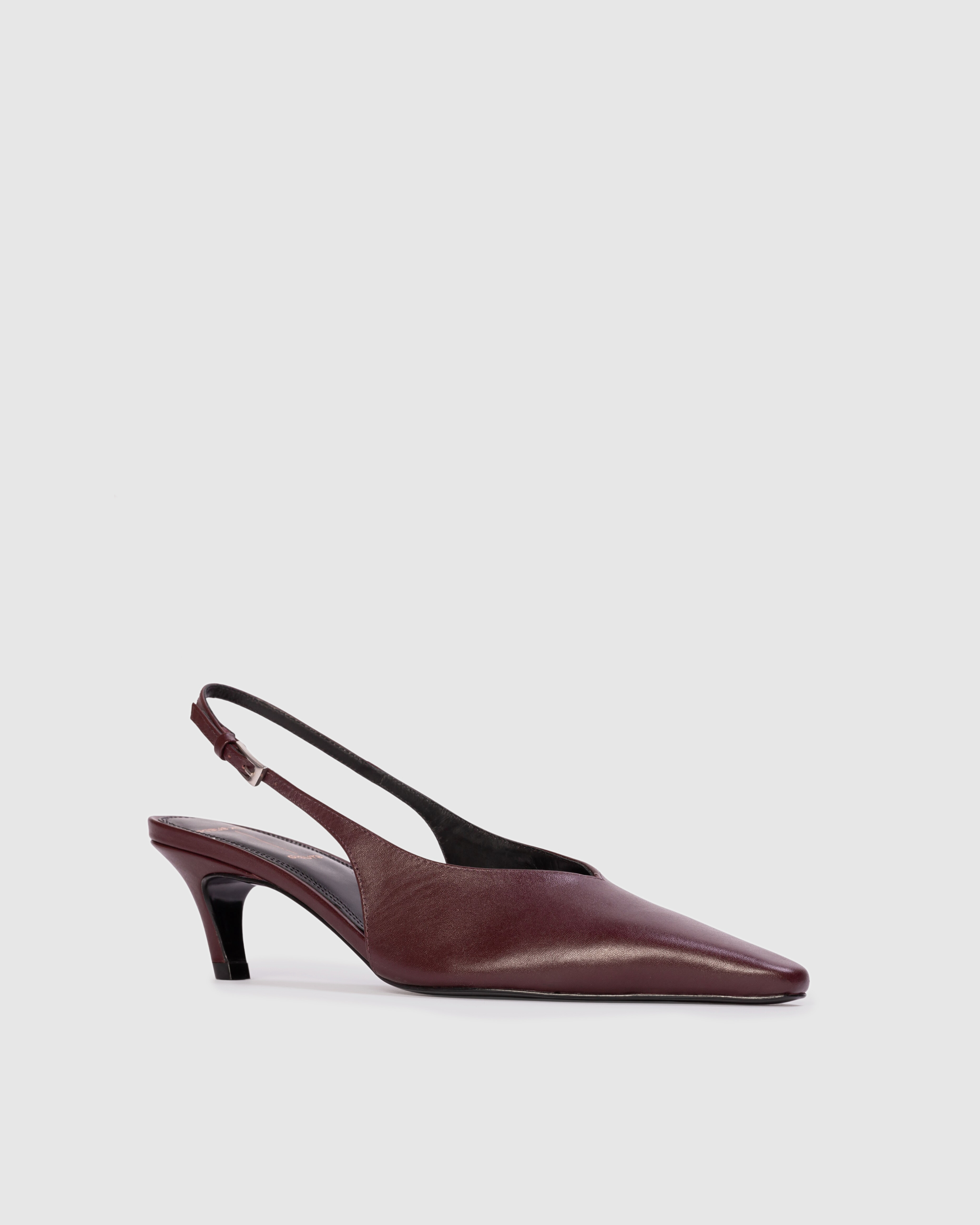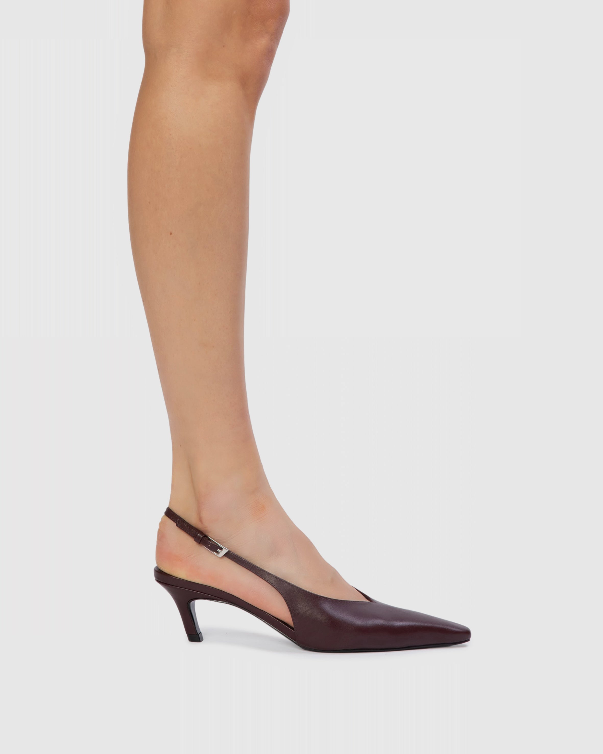 Snipped toe slingback pump, set on an angled kitten heel. Made with smooth buffed leather.